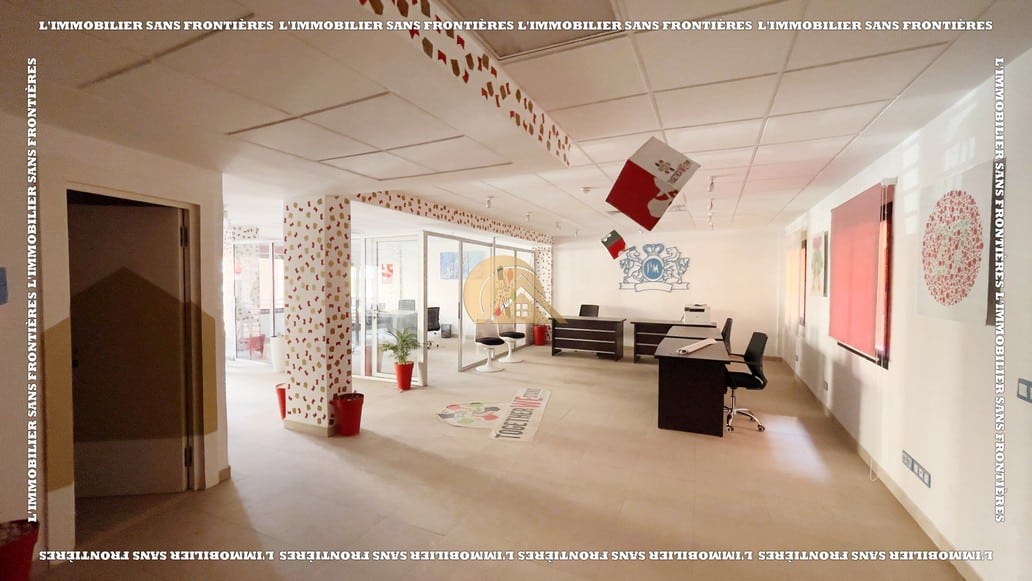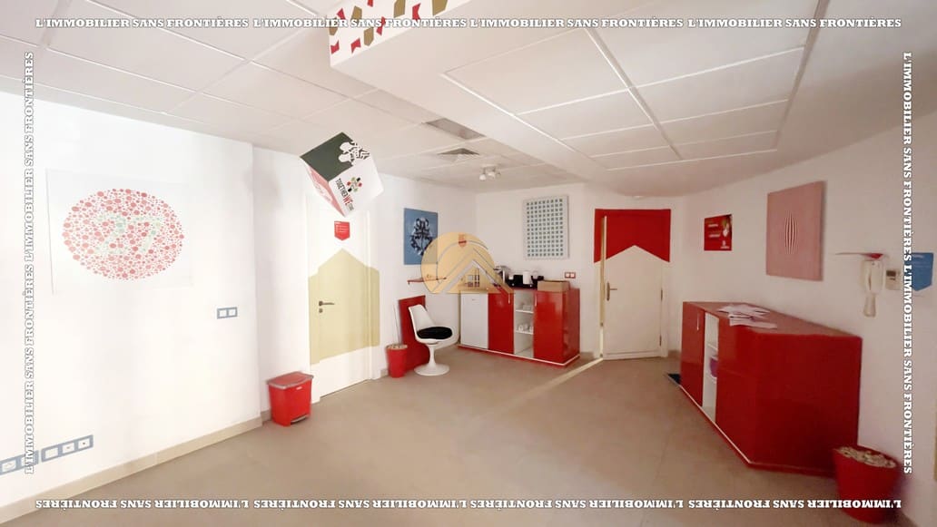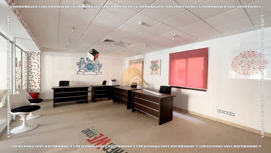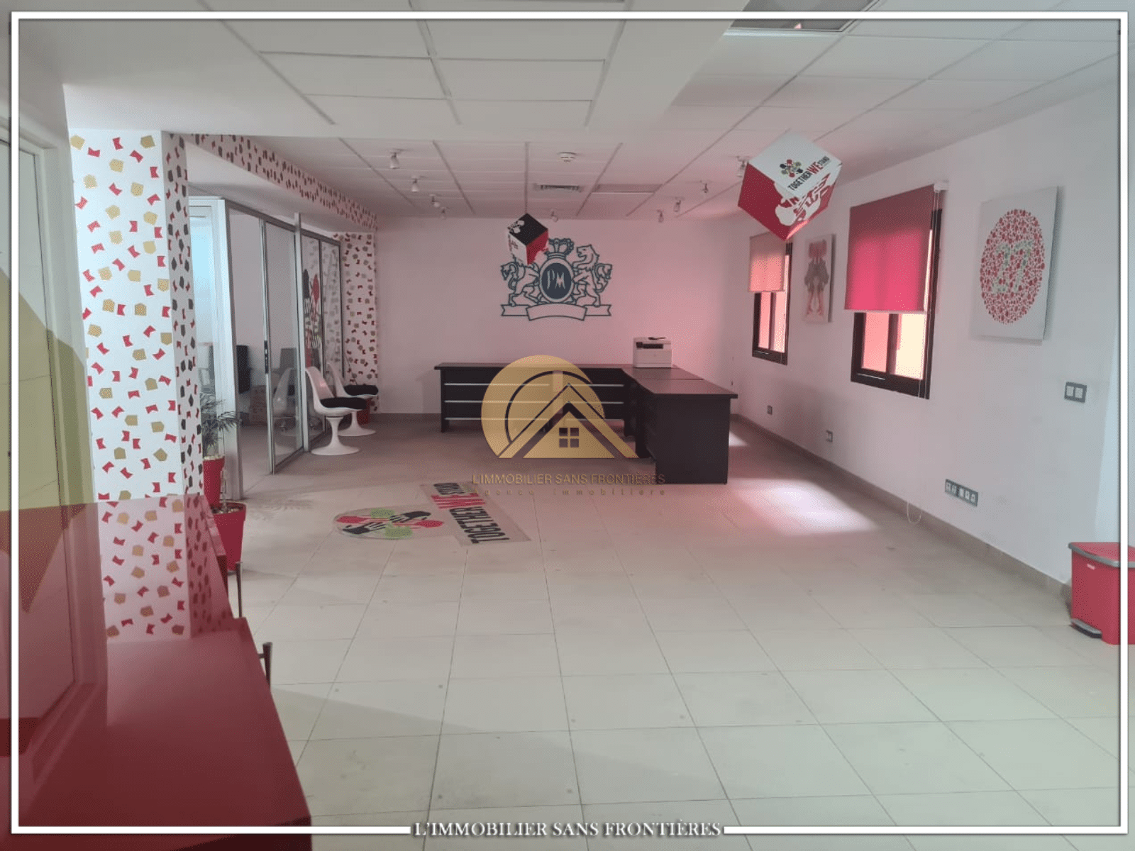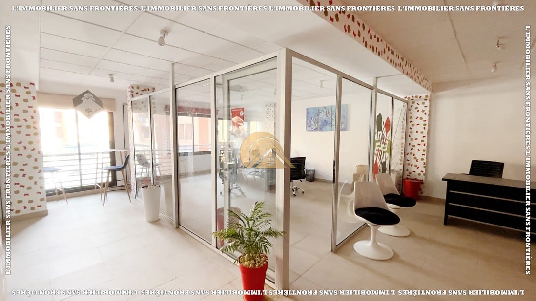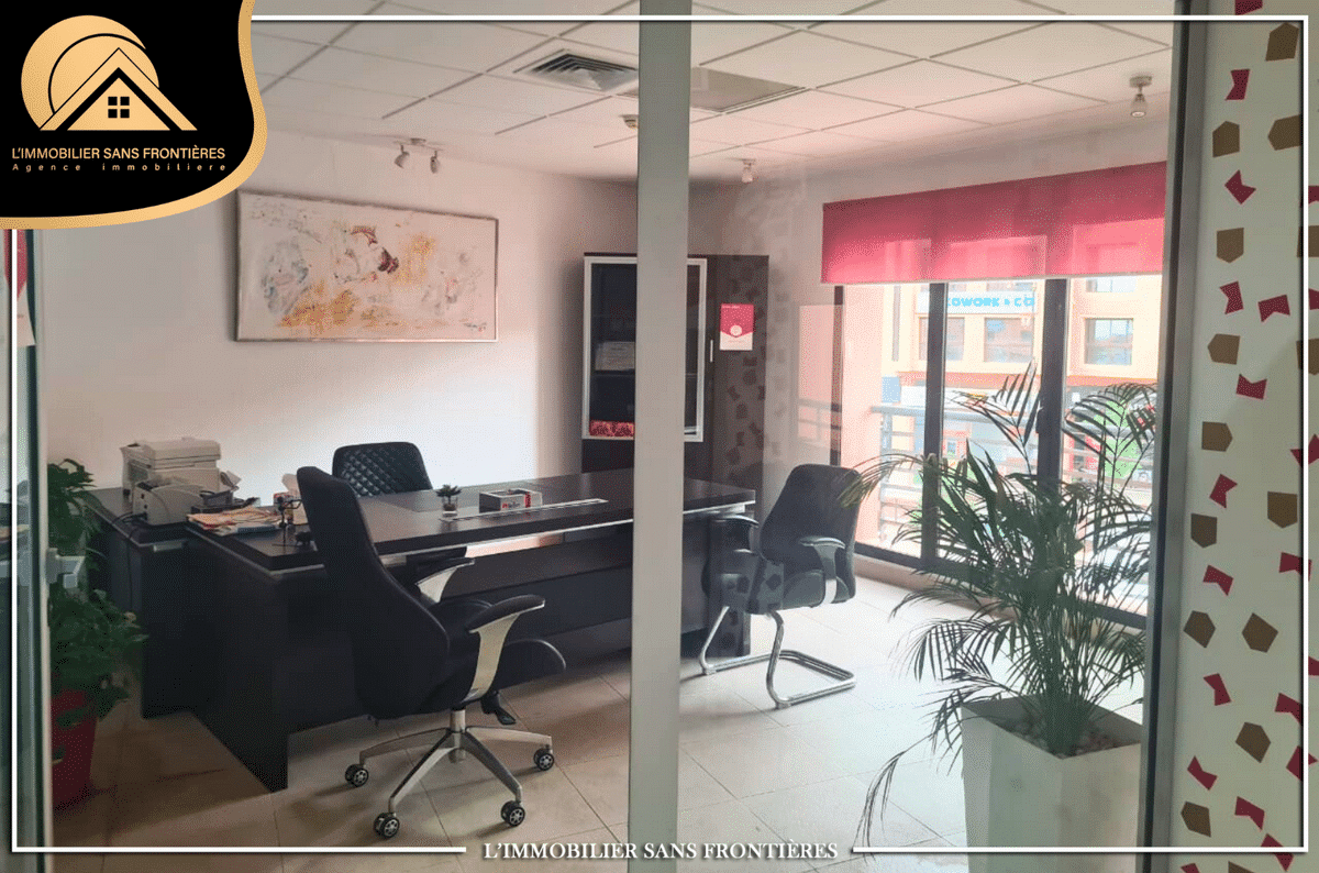 Real Estate Without Borders offers for rent this 128 m² office on the 1st floor on Bd Abdelkrim El khattabi in Marrakech. It includes work areas, a meeting room and 2 bathrooms. A furnished rental option is mentioned at 20,000 DHS.