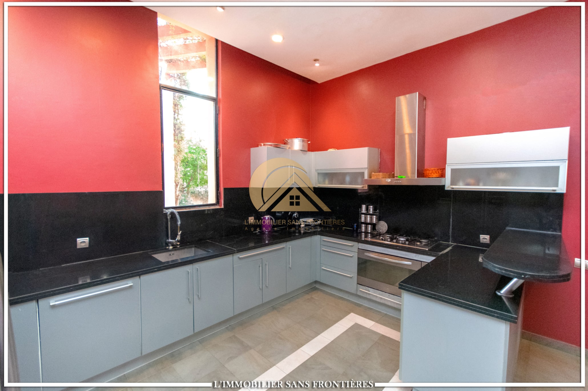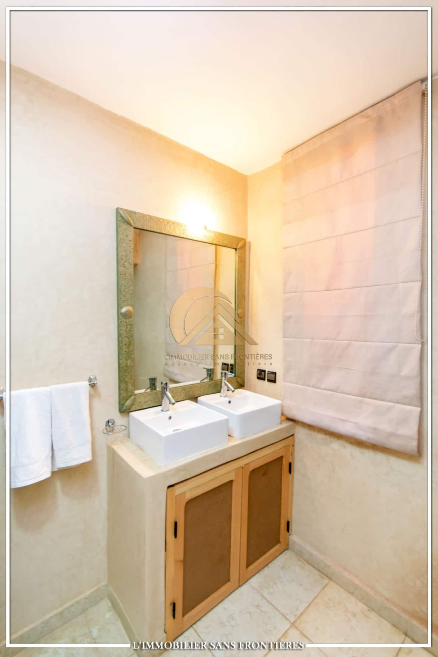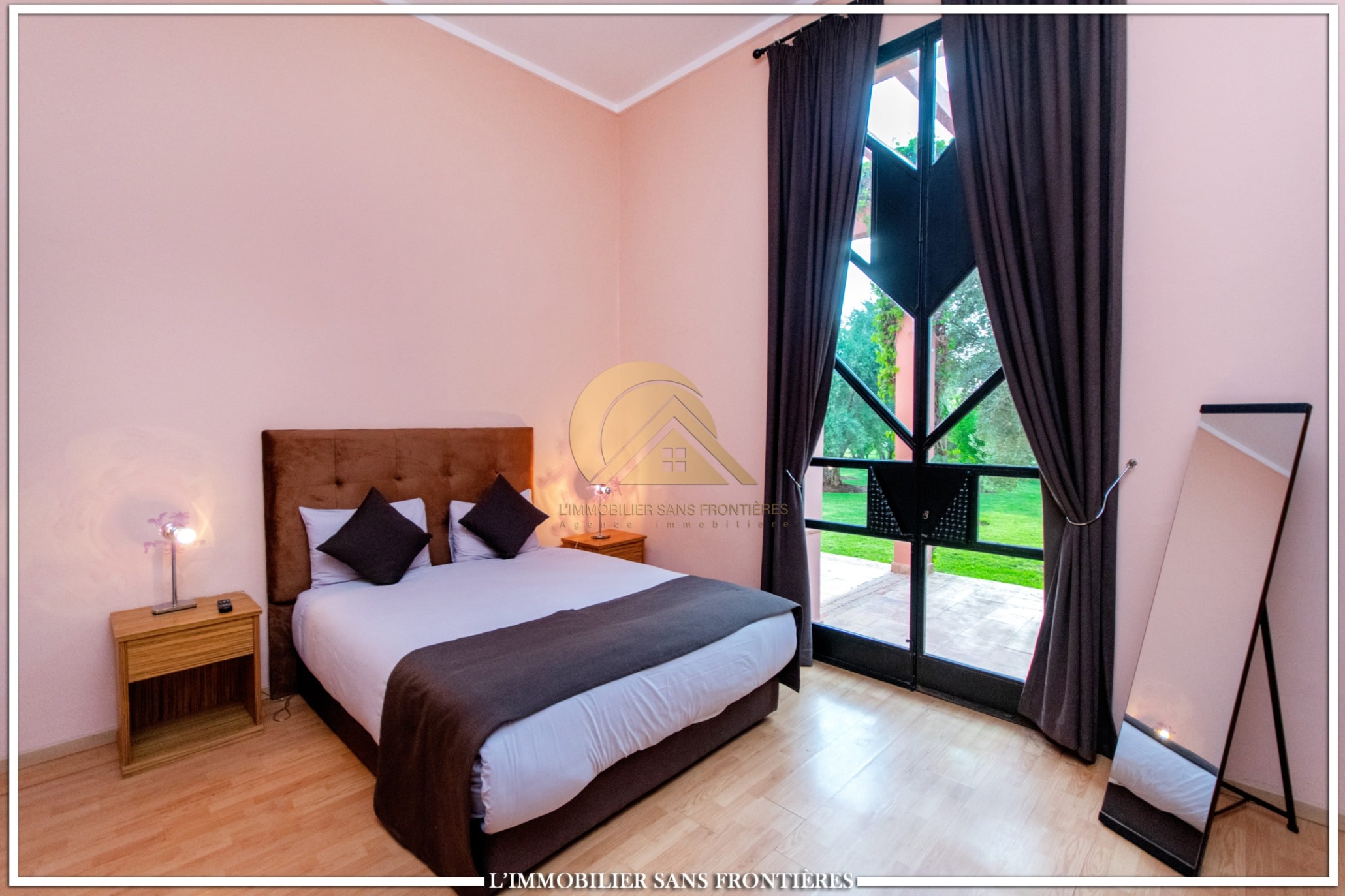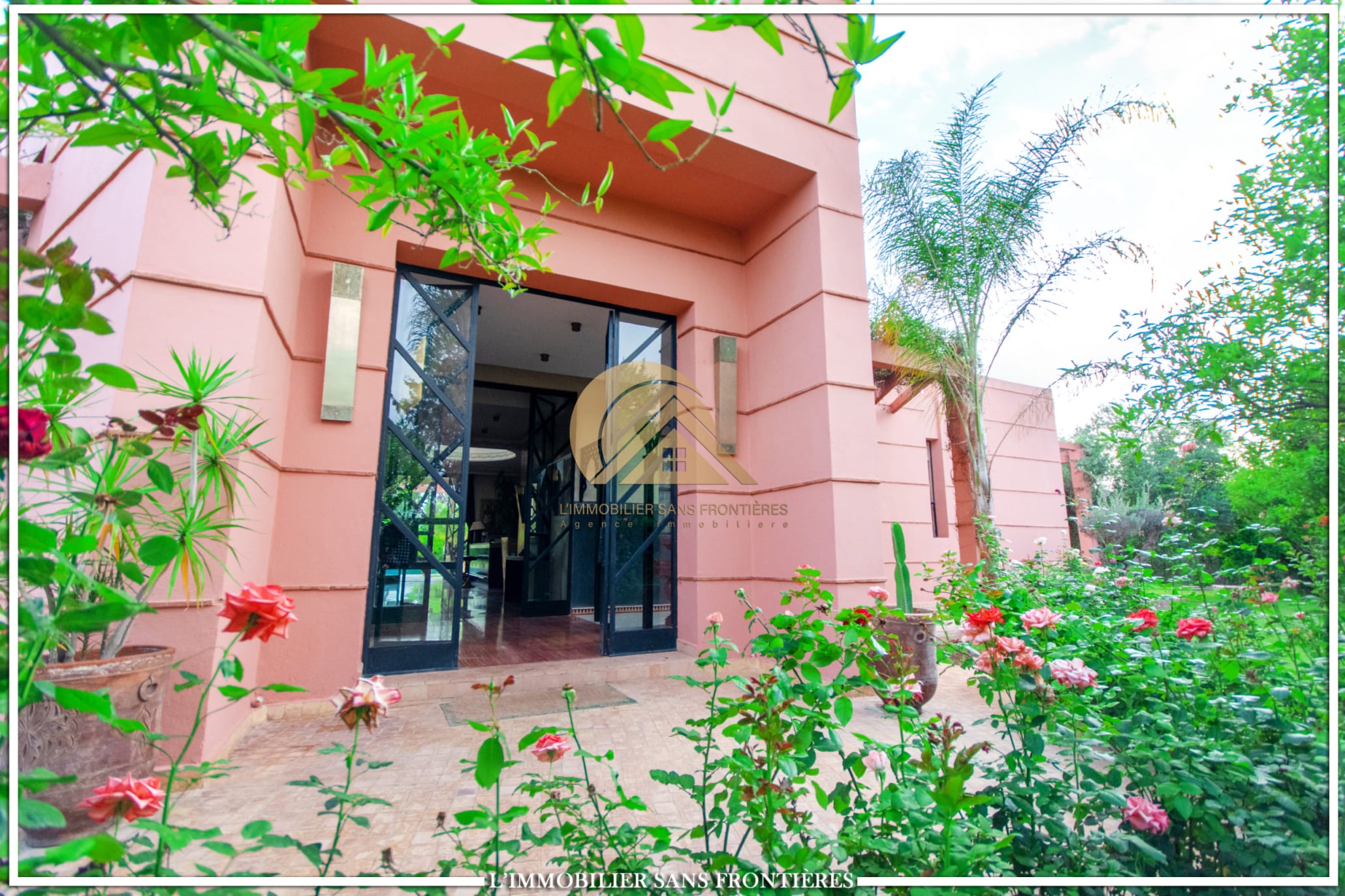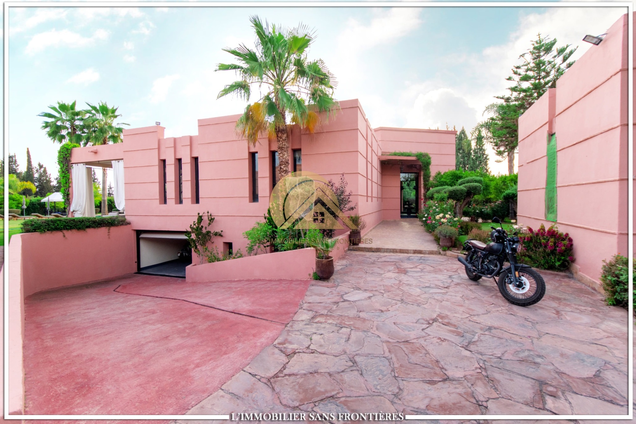 Real Estate Without Borders offers this modern single-storey villa for rent on Route de Sidi Abdellah Ghiyat in Marrakech, 4 km from Amelkis. It is arranged for stays, with a large pool, a wide garden, and carefully fitted interior spaces.