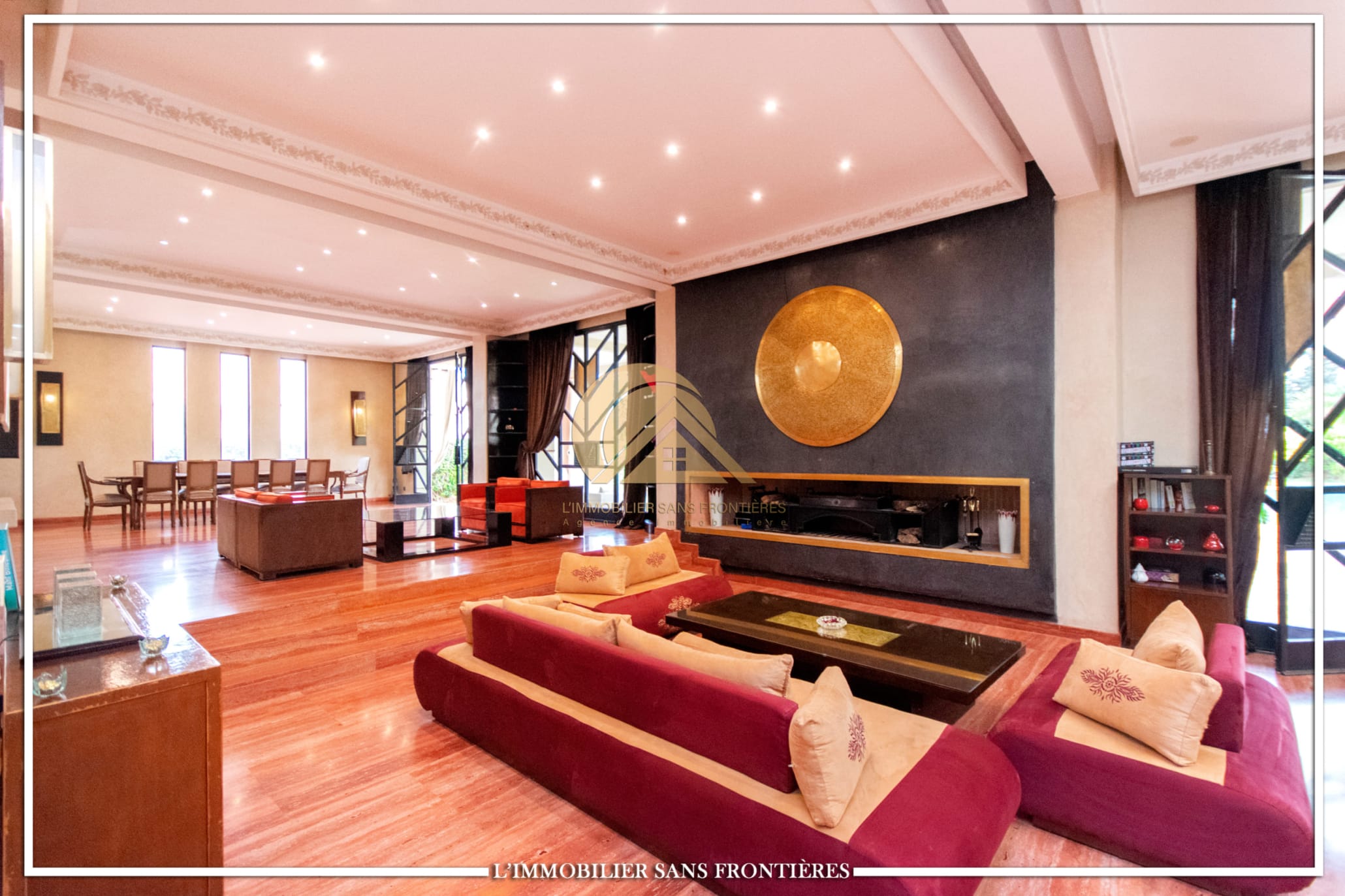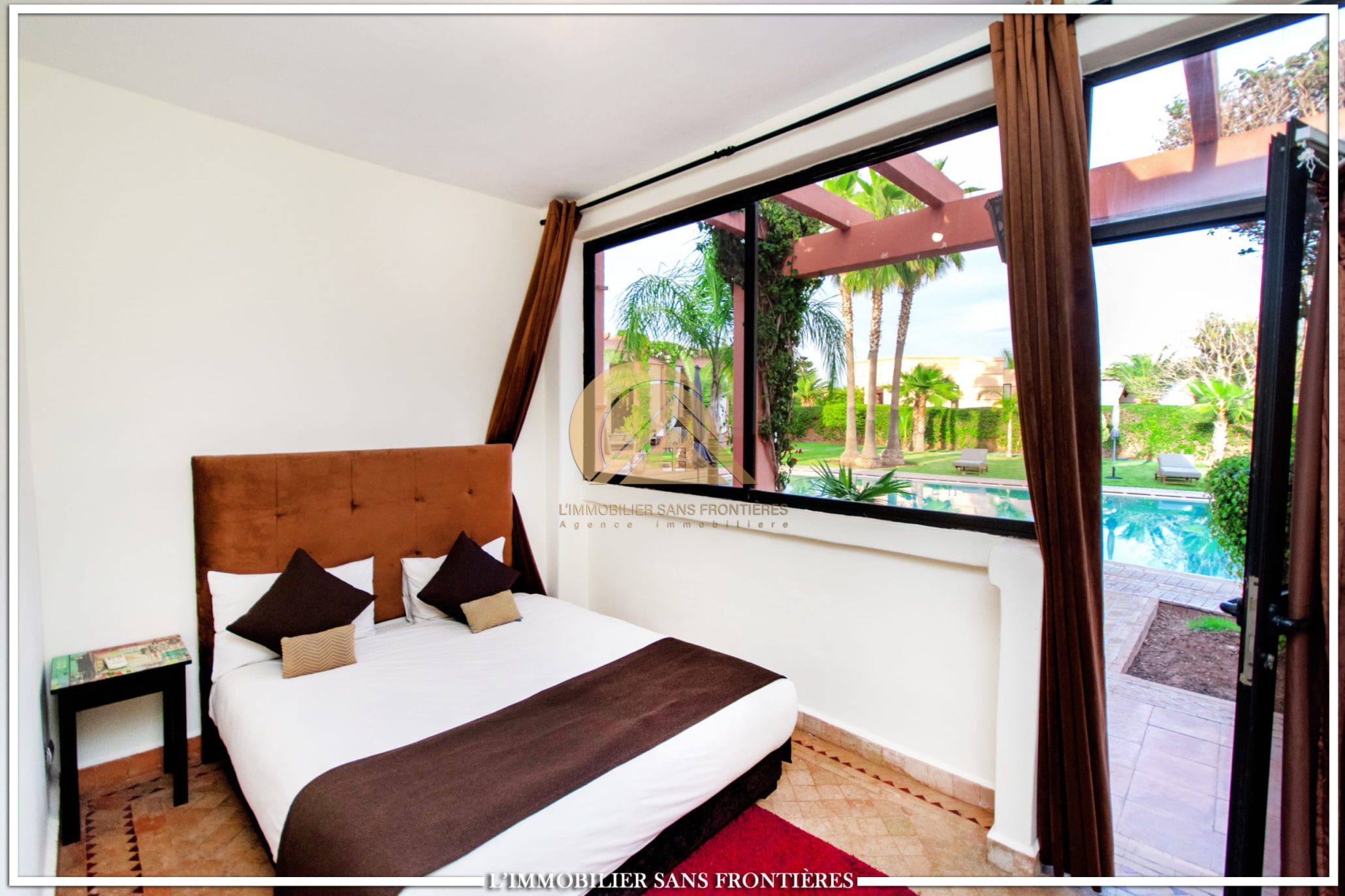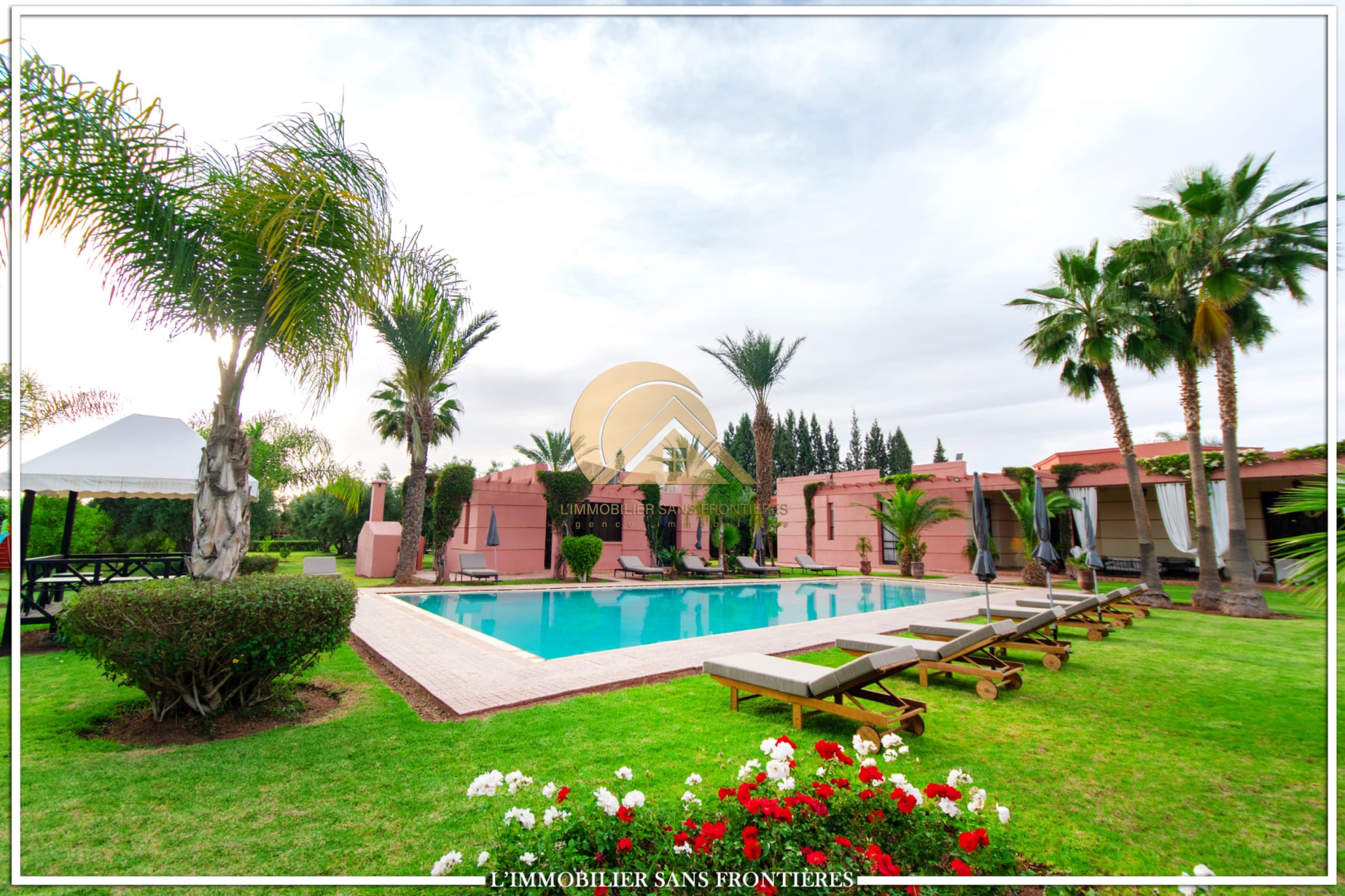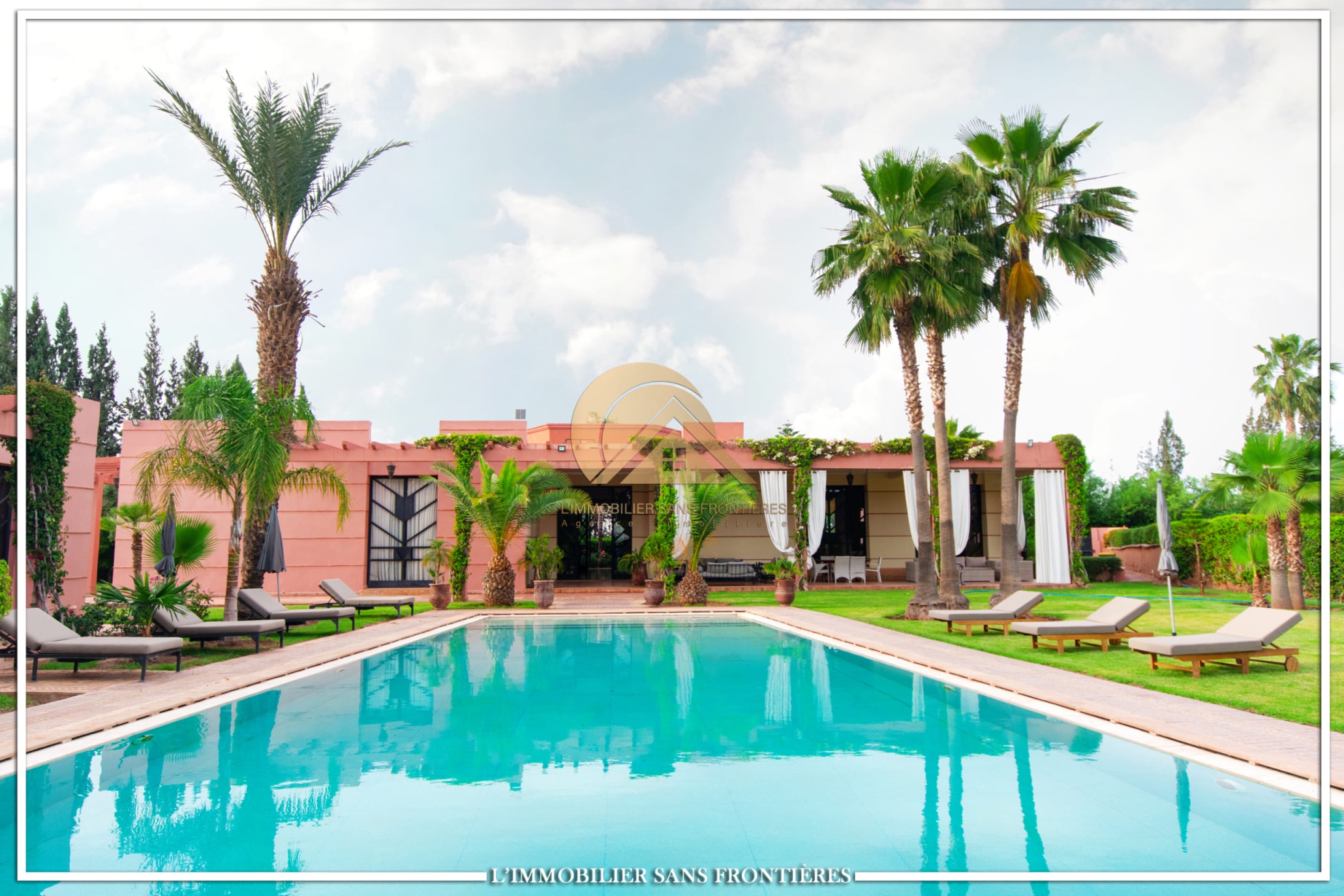 Moroccan lounge – Modern lounge – Living area – 5 suites with bathroom, closets, and air conditioning – 1 suite with dressing room – Fully equipped kitchen – Laundry room – Terrace – 2 additional suites by the pool with bathrooms and closets