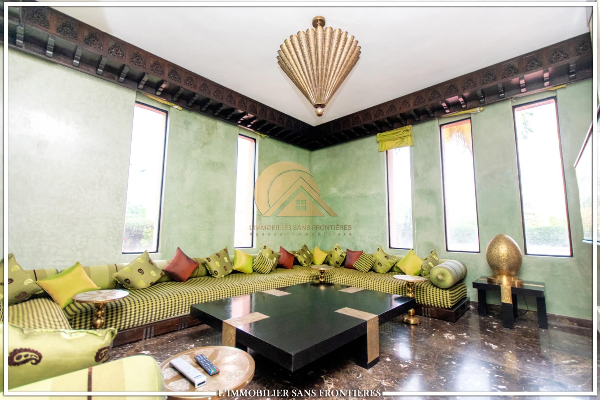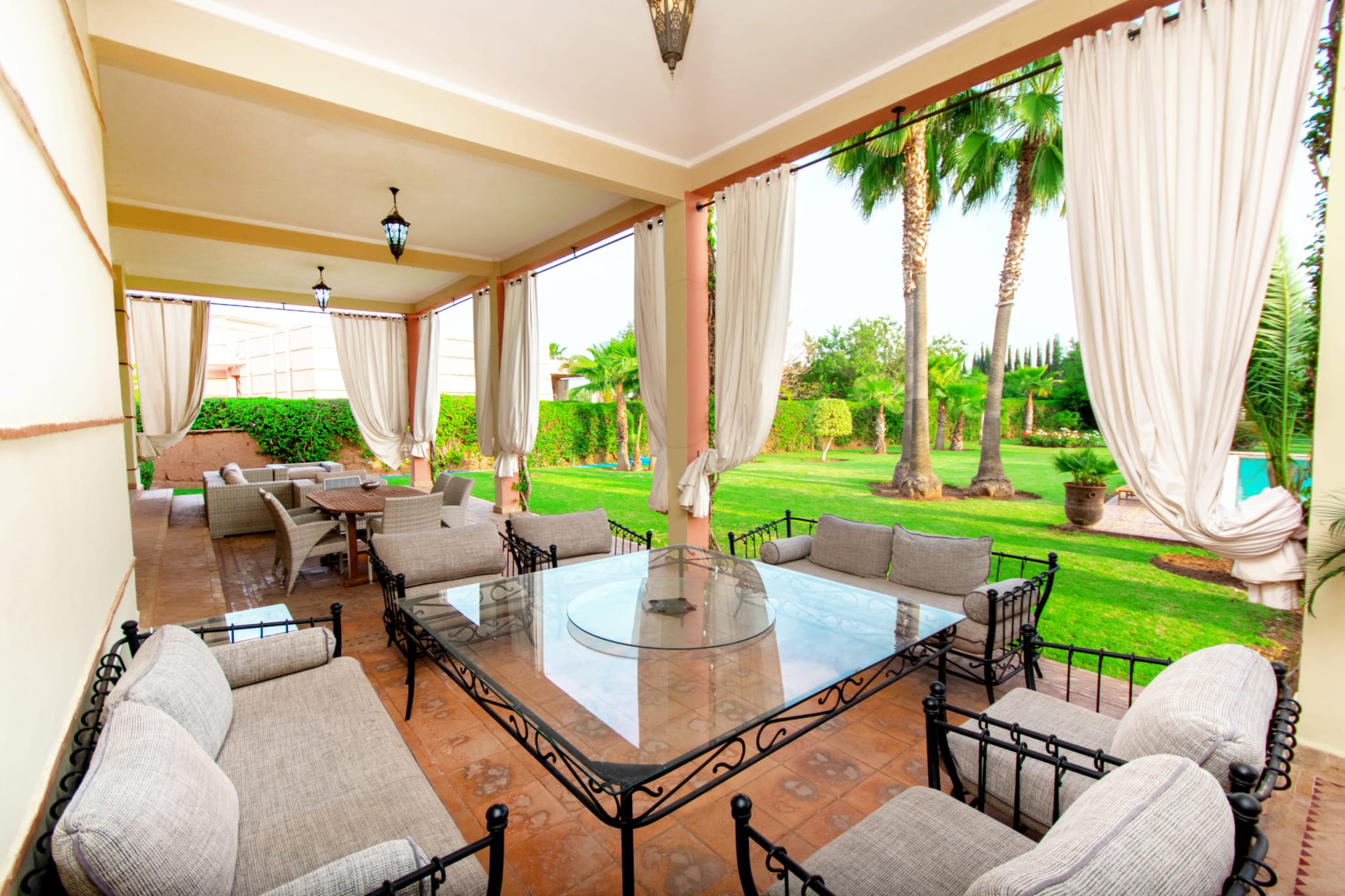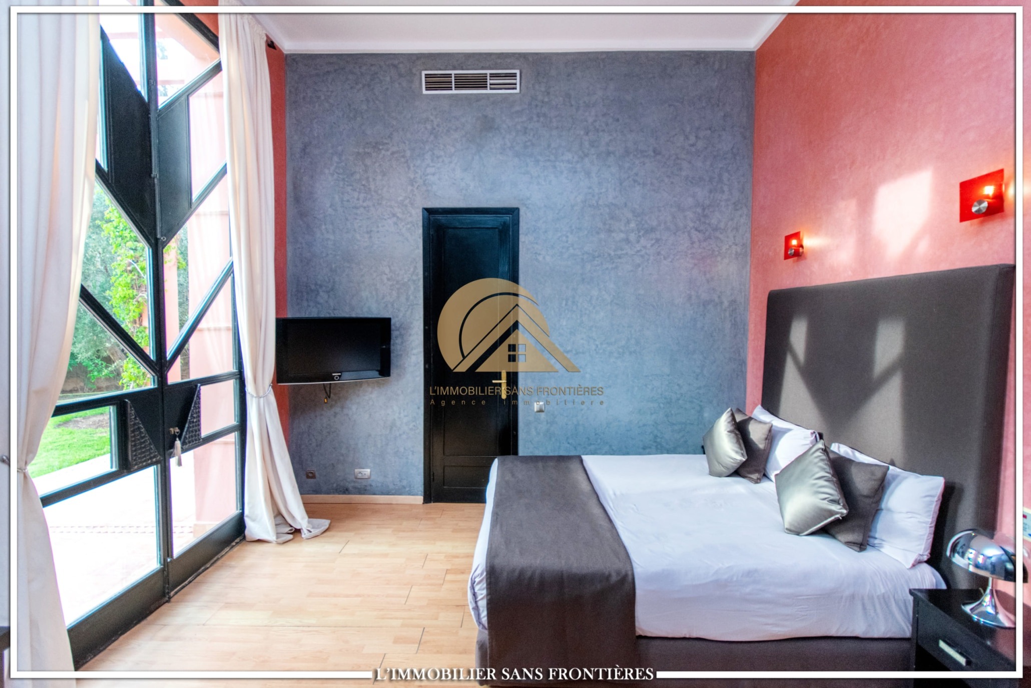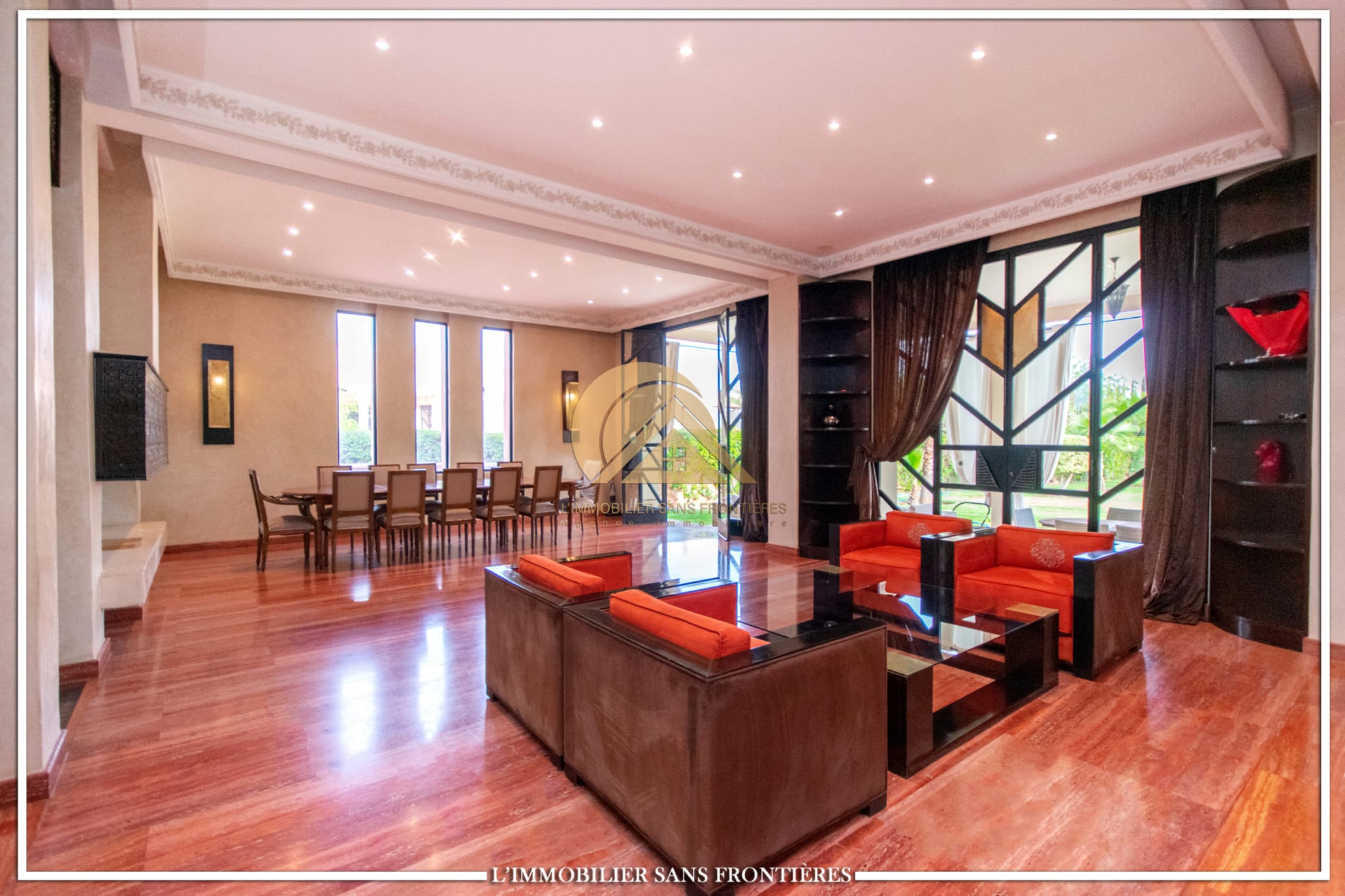 Moroccan lounge – Modern lounge – Living area – 5 suites with bathroom, closets, and air conditioning – 1 suite with dressing room – Fully equipped kitchen – Laundry room – Terrace – 2 additional suites by the pool with bathrooms and closets