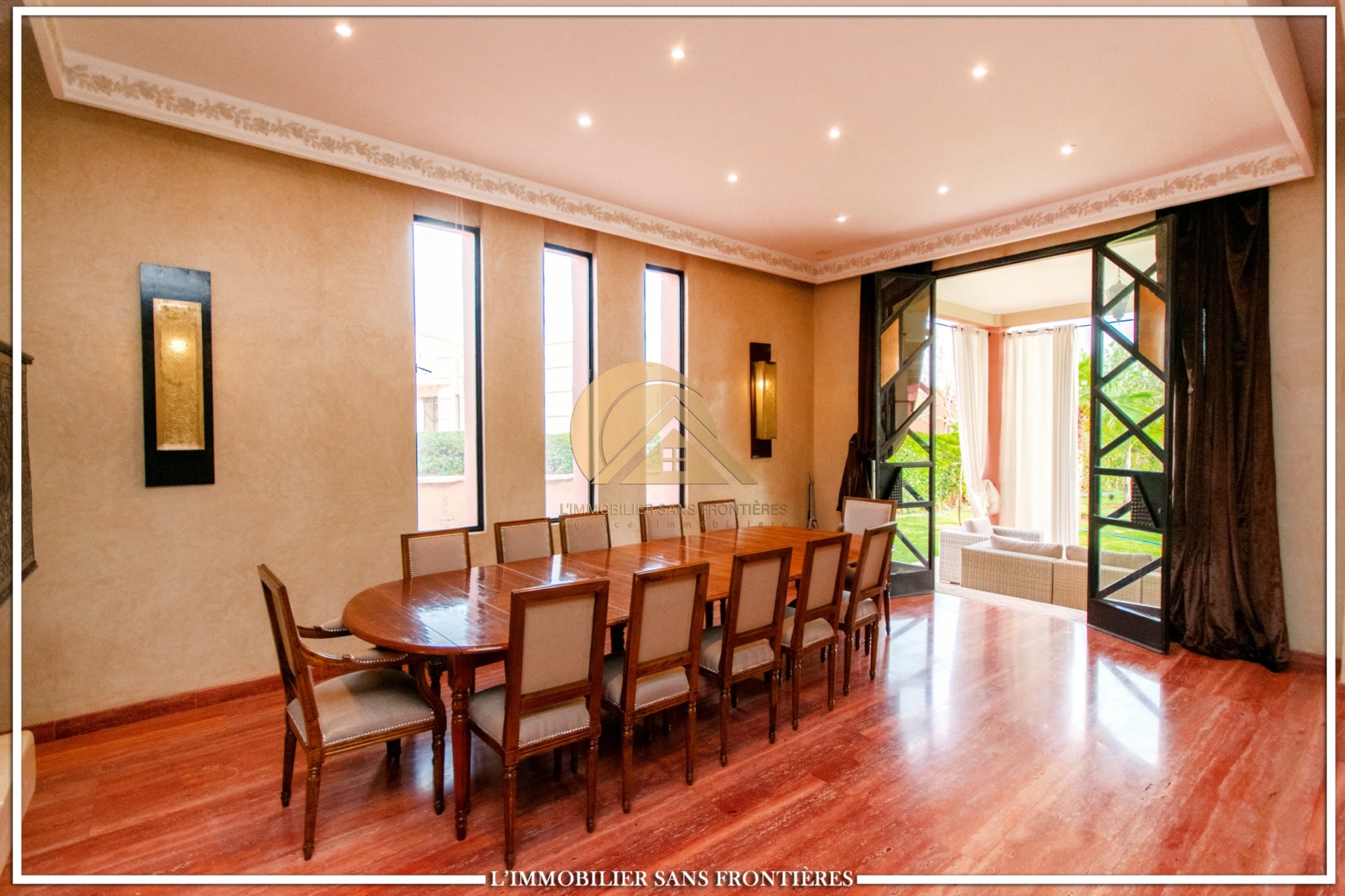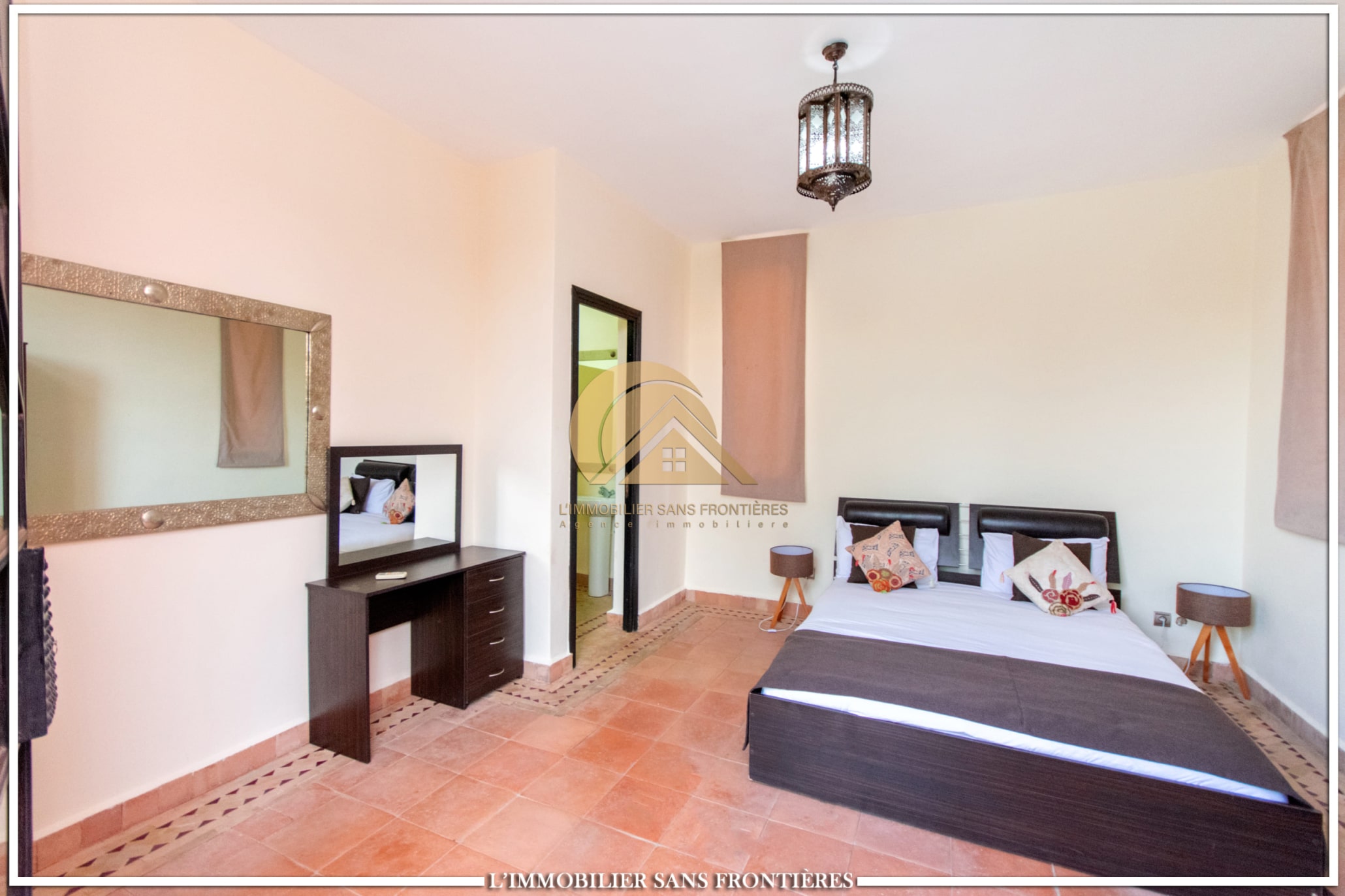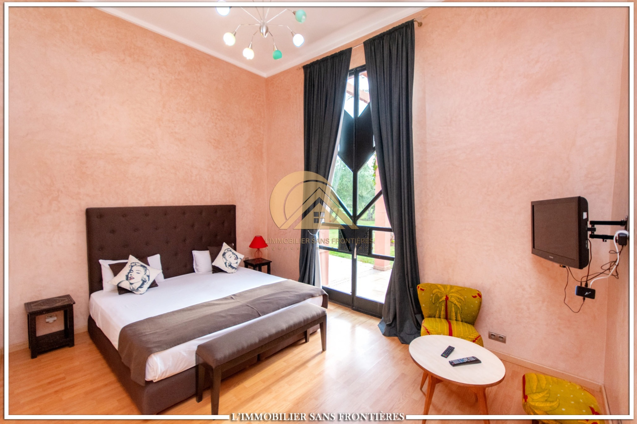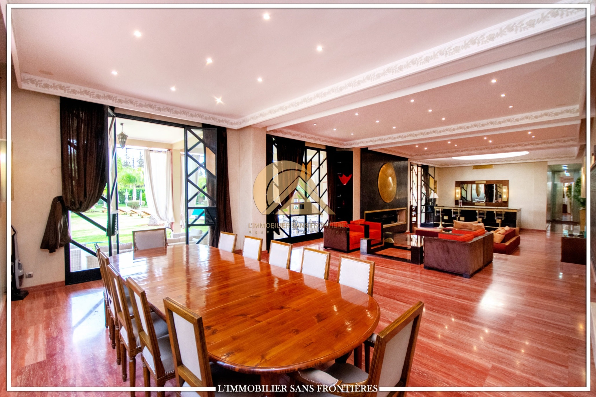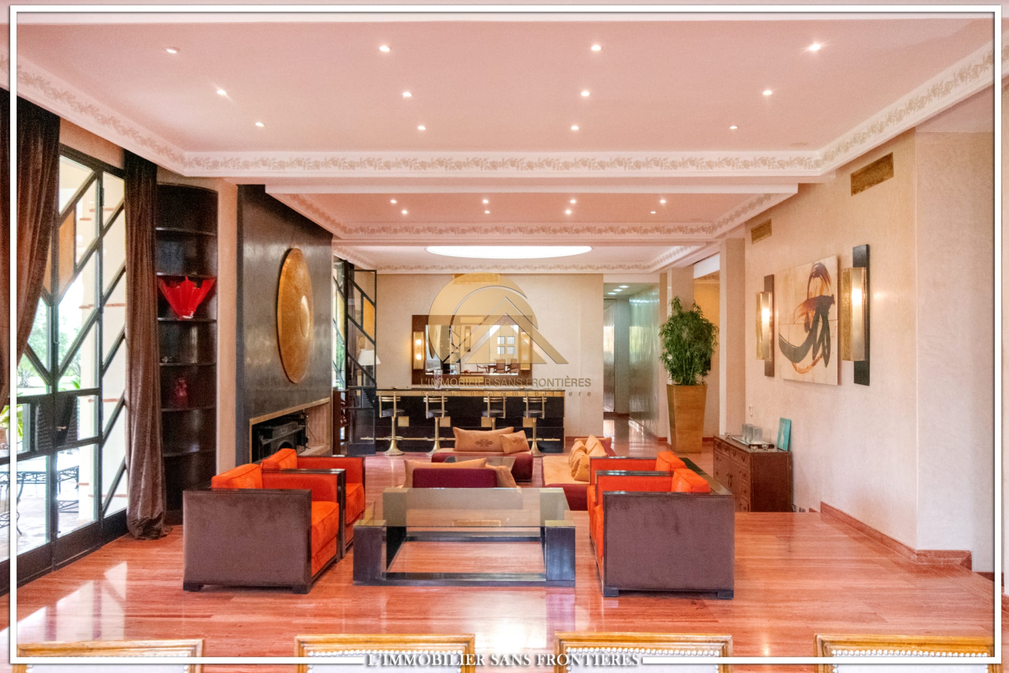 Moroccan lounge – Modern lounge – Living area – 5 suites with bathroom, closets, and air conditioning – 1 suite with dressing room – Fully equipped kitchen – Laundry room – Terrace – 2 additional suites by the pool with bathrooms and closets
