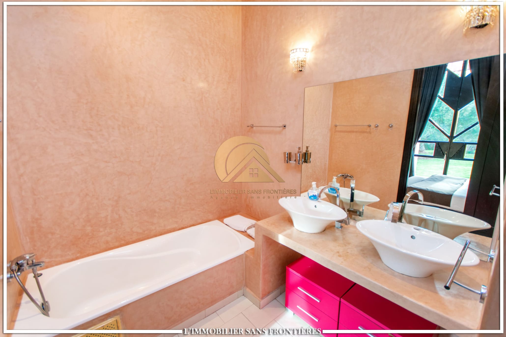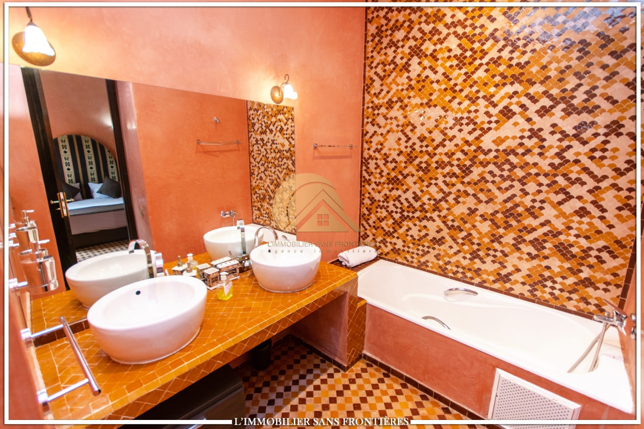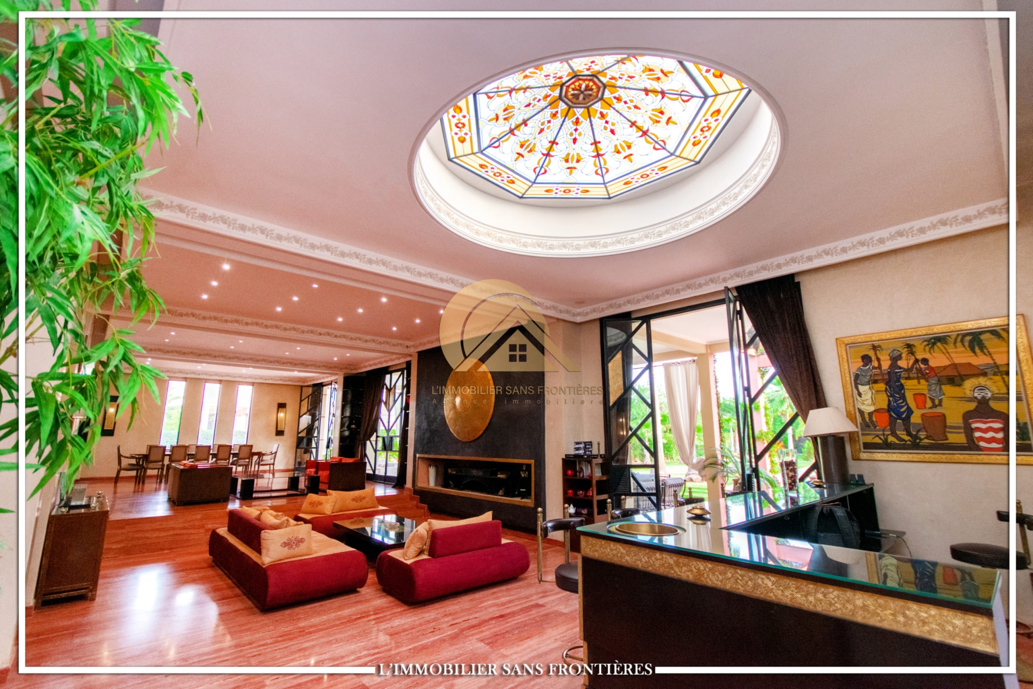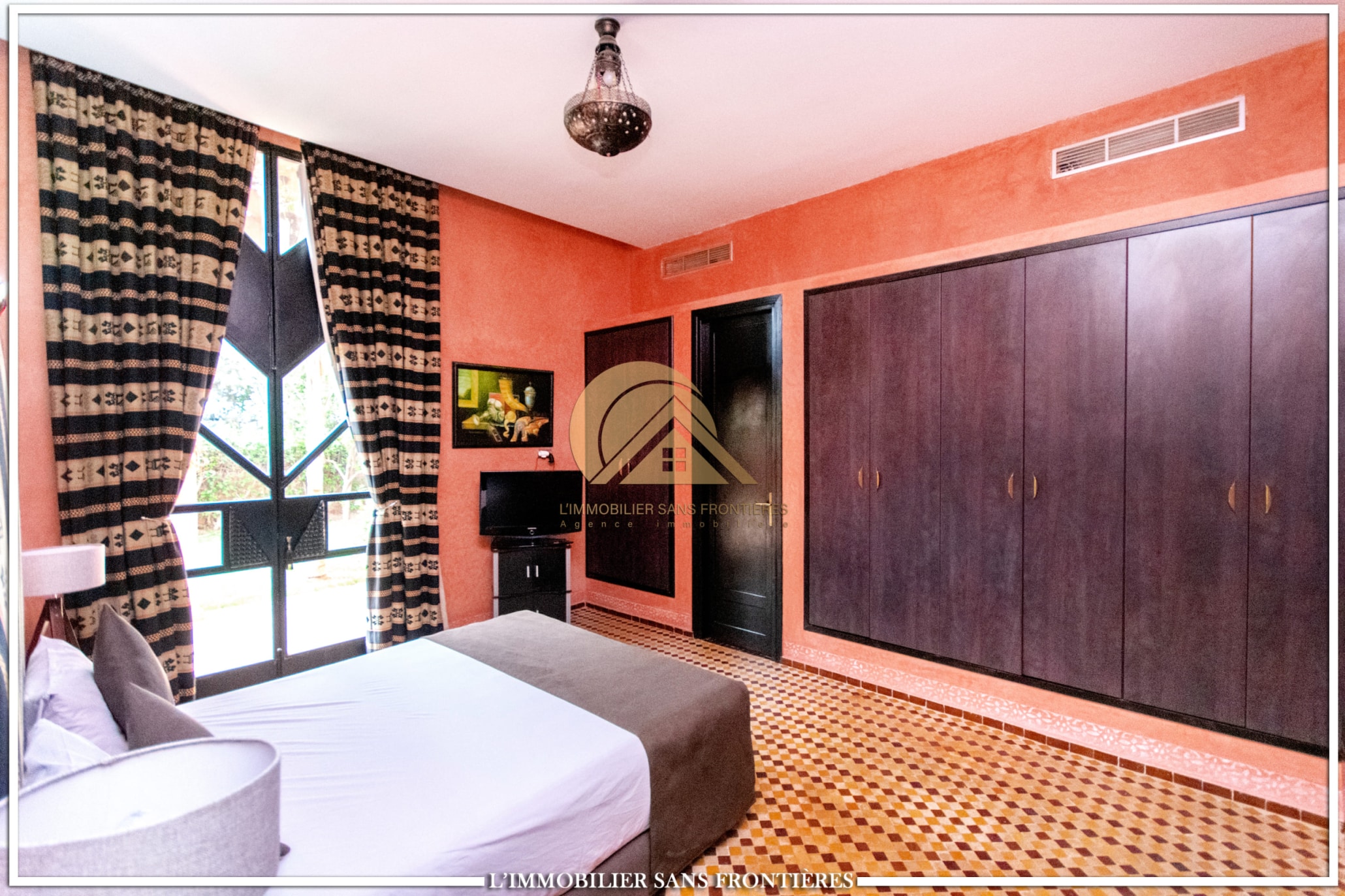 Moroccan lounge – Modern lounge – Living area – 5 suites with bathroom, closets, and air conditioning – 1 suite with dressing room – Fully equipped kitchen – Laundry room – Terrace – 2 additional suites by the pool with bathrooms and closets