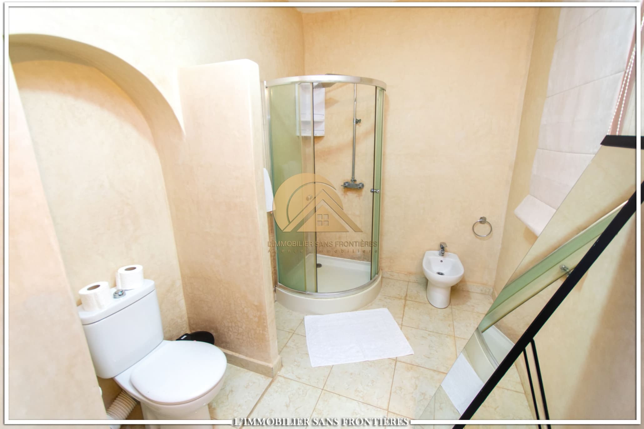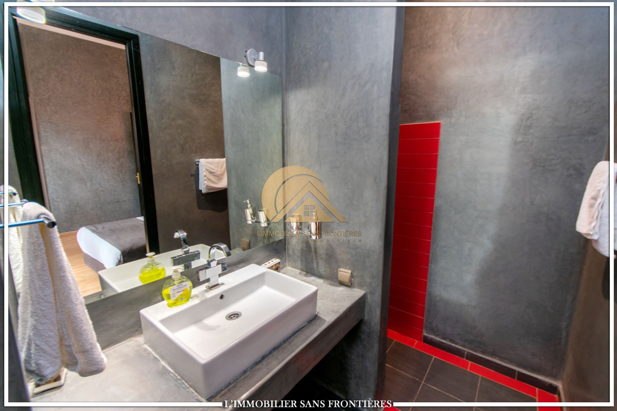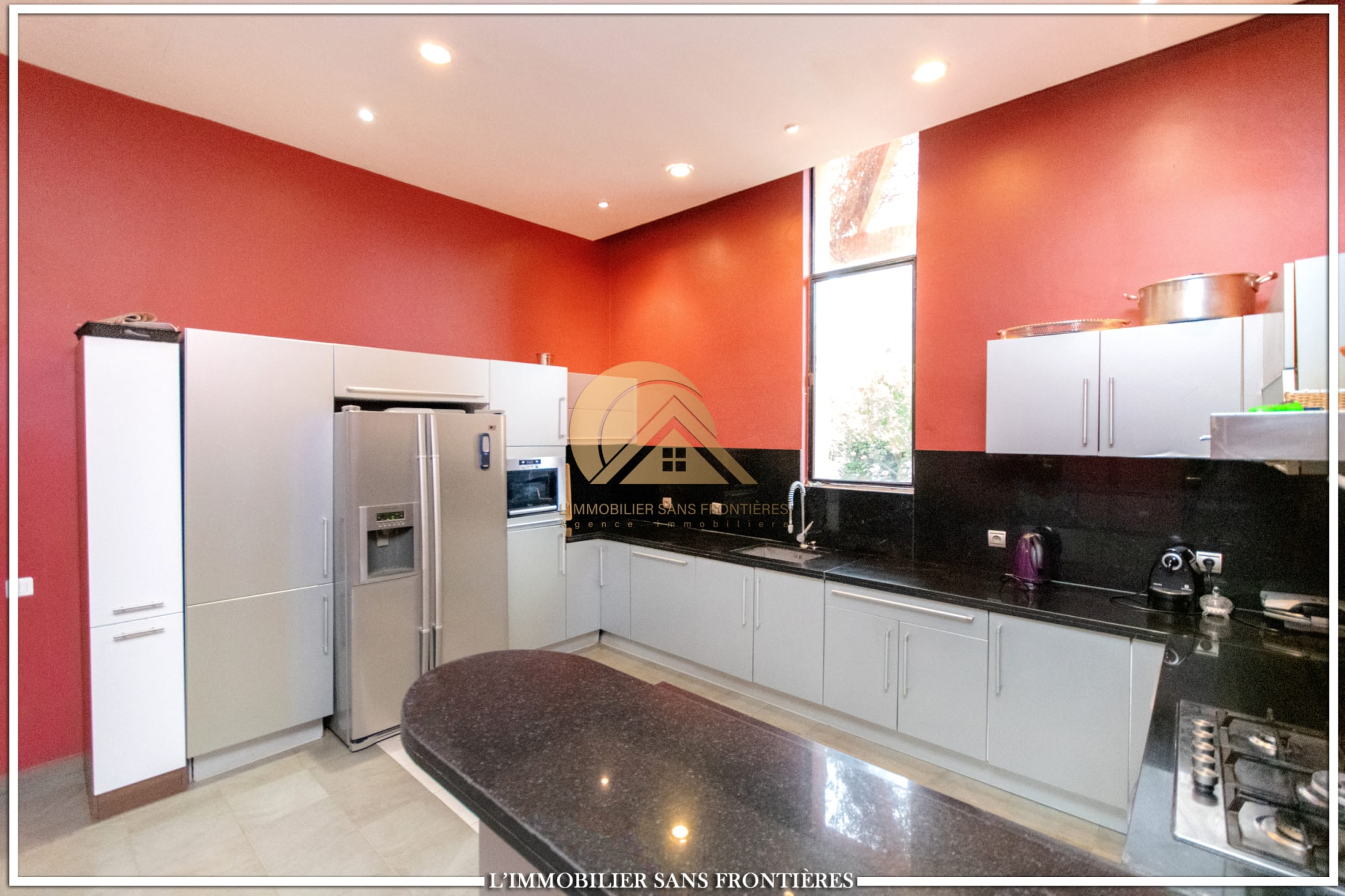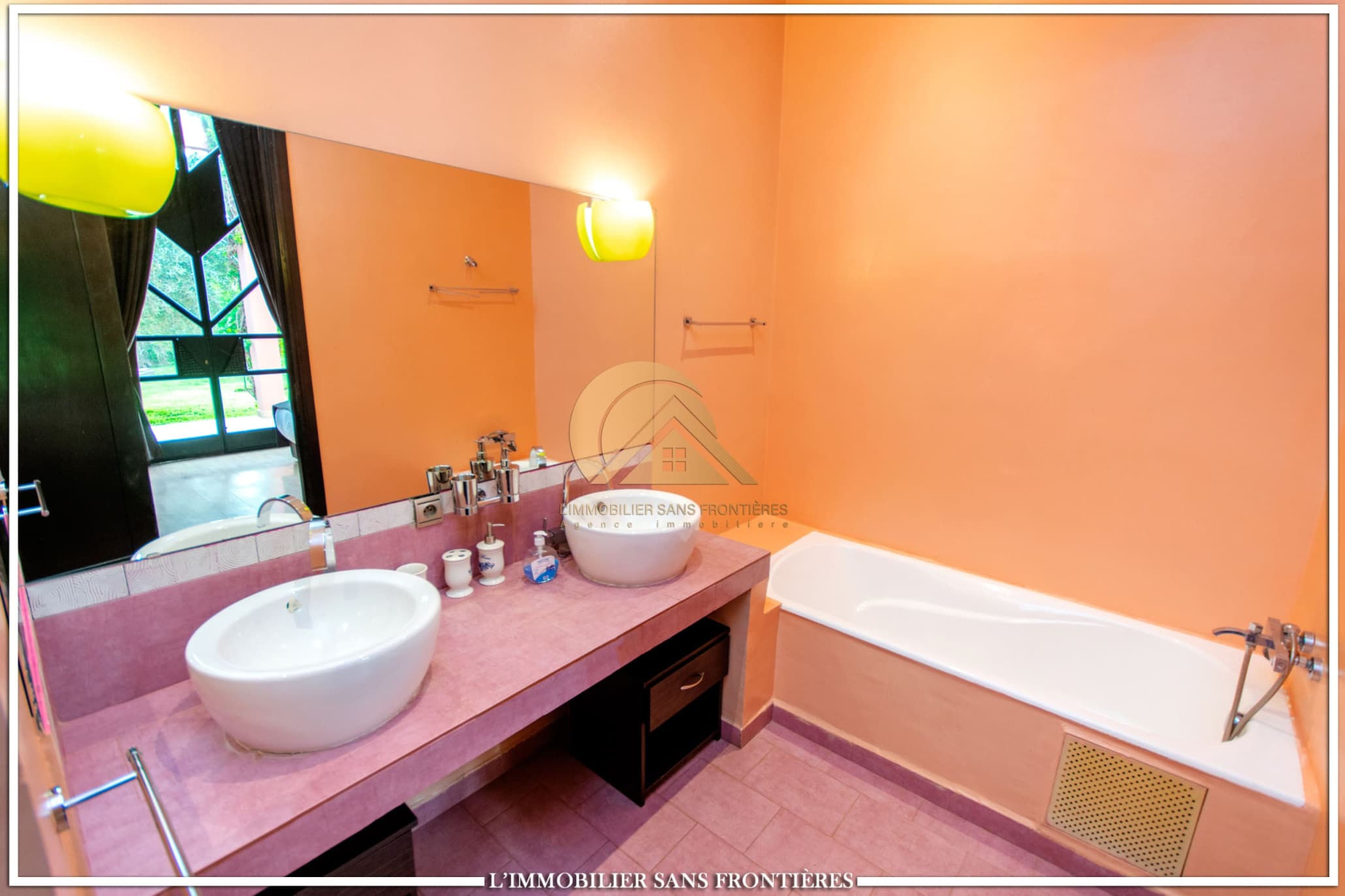 Moroccan lounge – Modern lounge – Living area – 5 suites with bathroom, closets, and air conditioning – 1 suite with dressing room – Fully equipped kitchen – Laundry room – Terrace – 2 additional suites by the pool with bathrooms and closets
