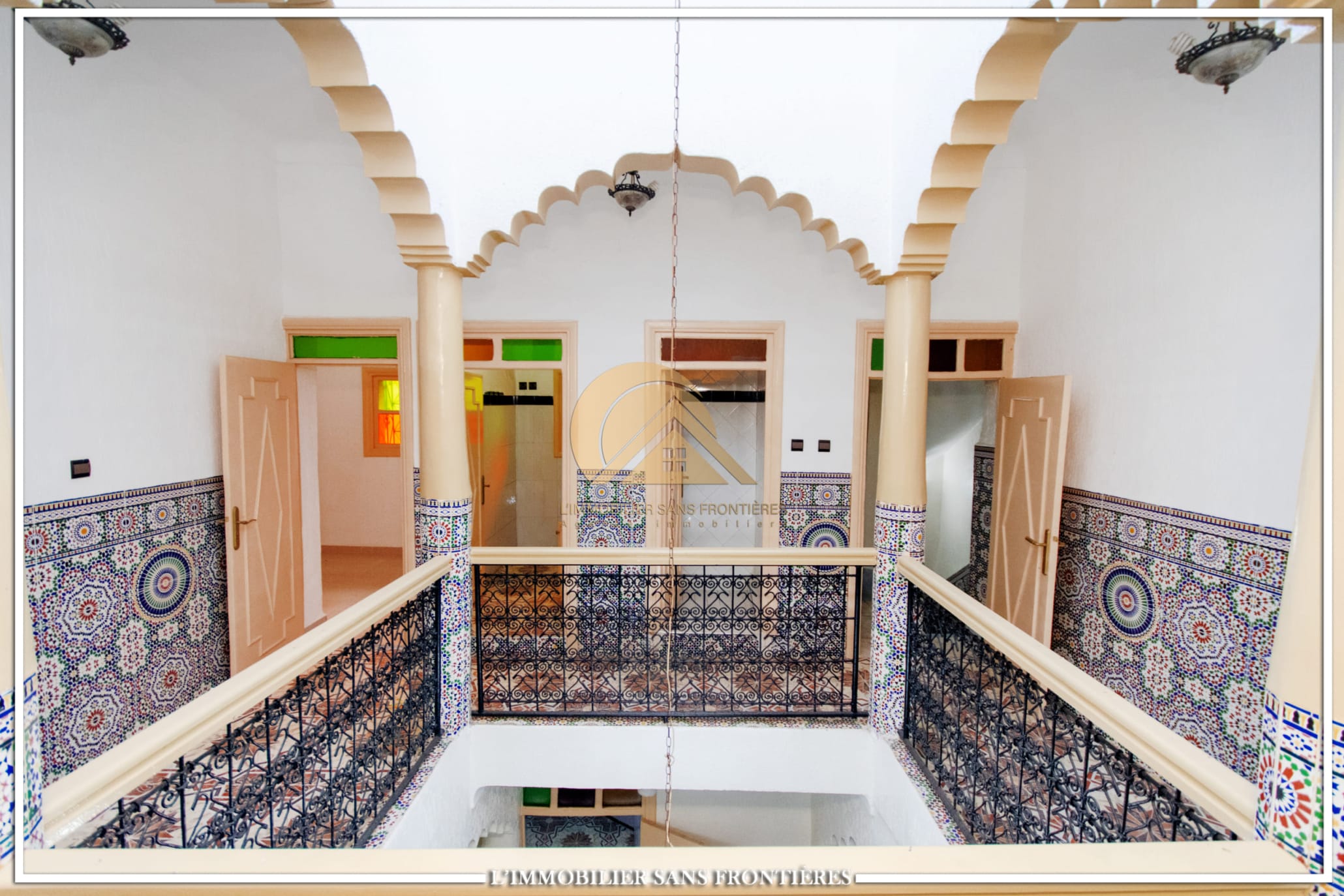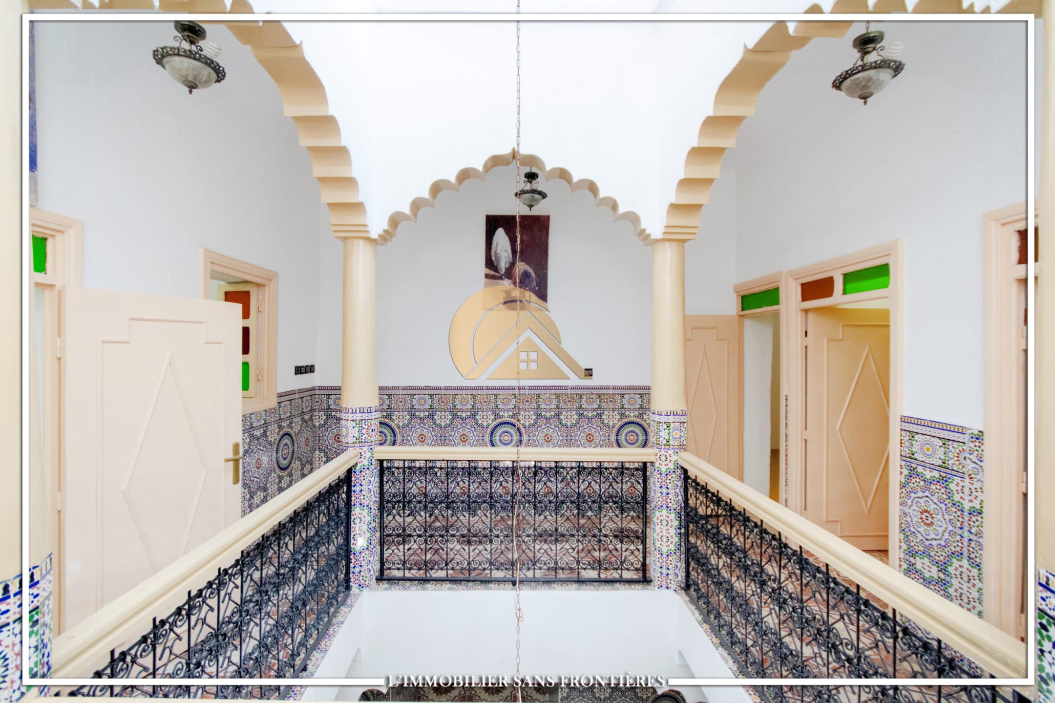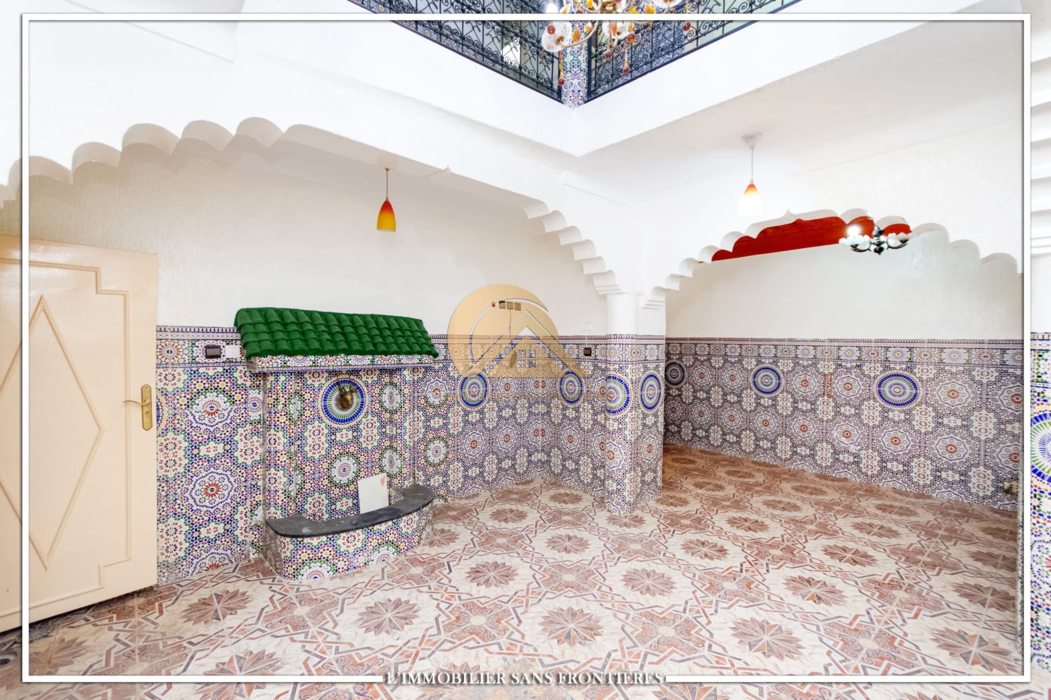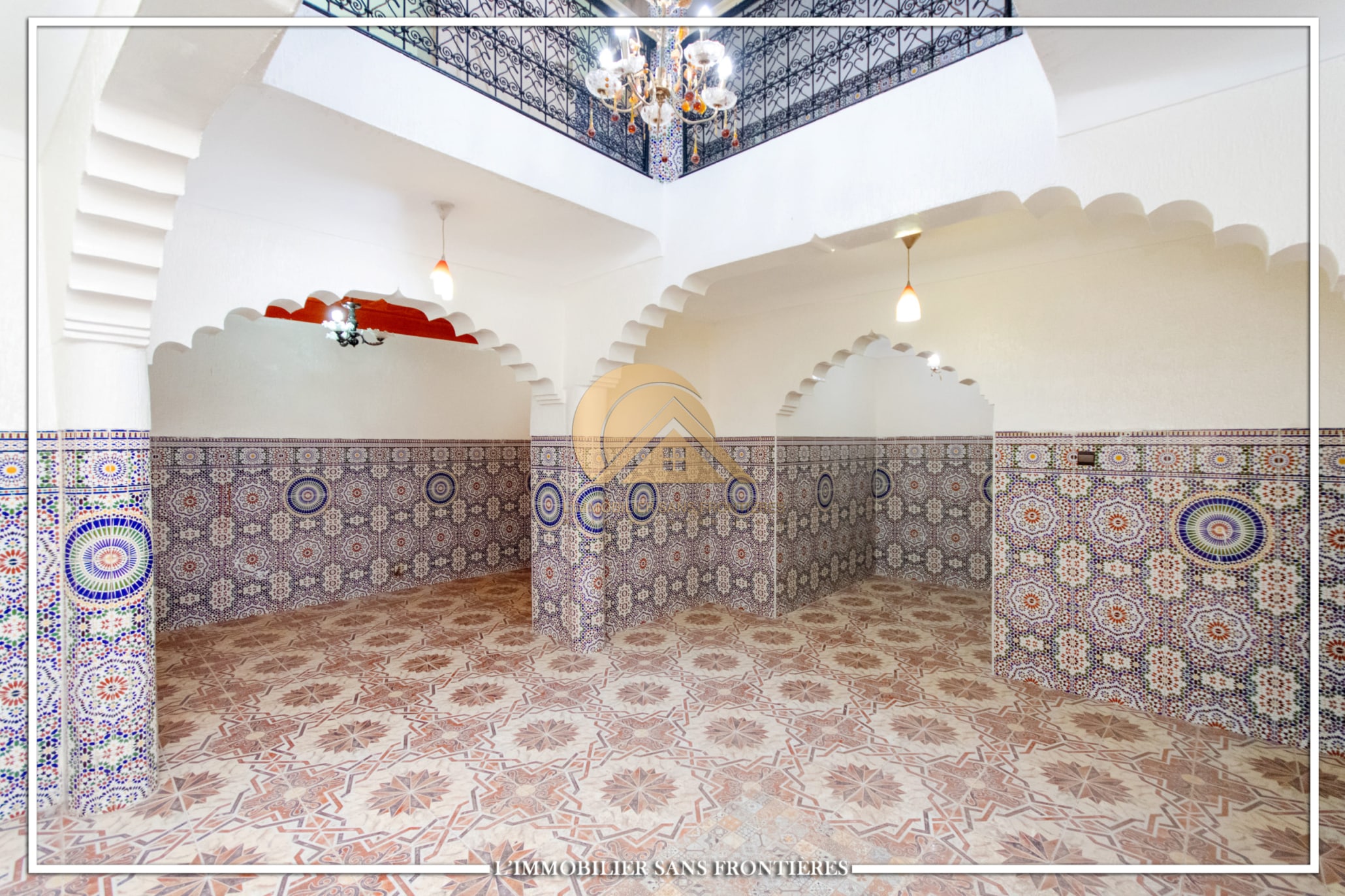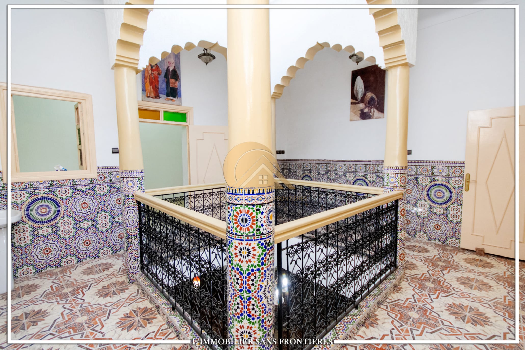 Real Estate Without Borders offers this R2 riad for sale in the heart of Marrakech’s medina. The text describes a friendly and calm atmosphere. Area: 240 m².