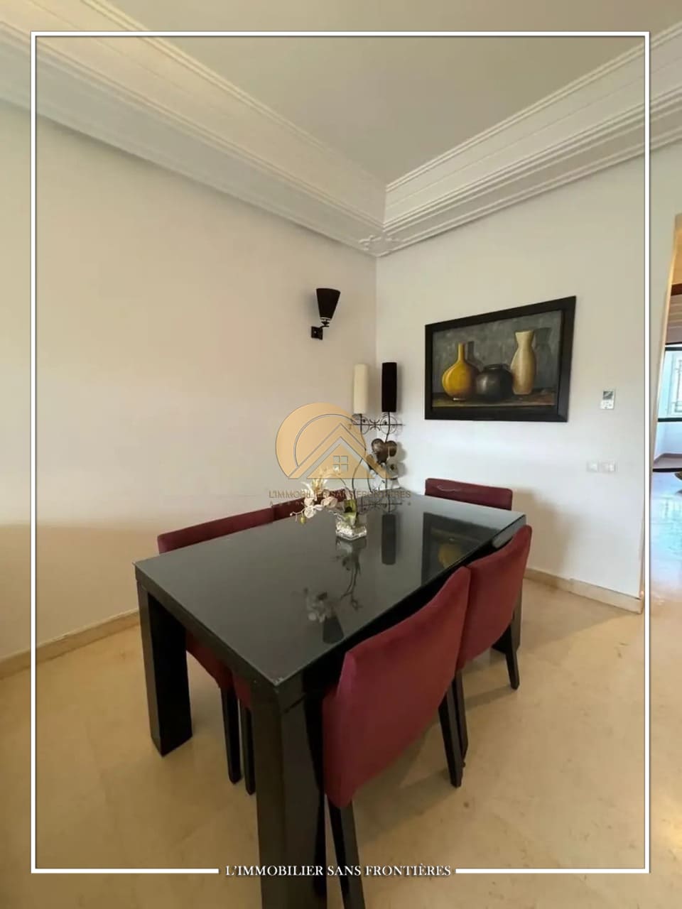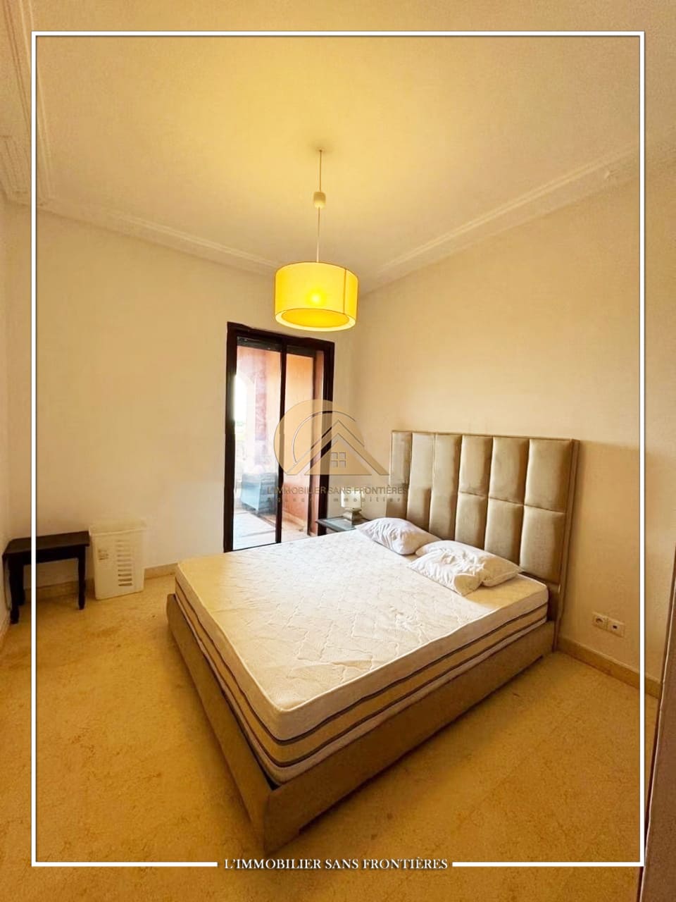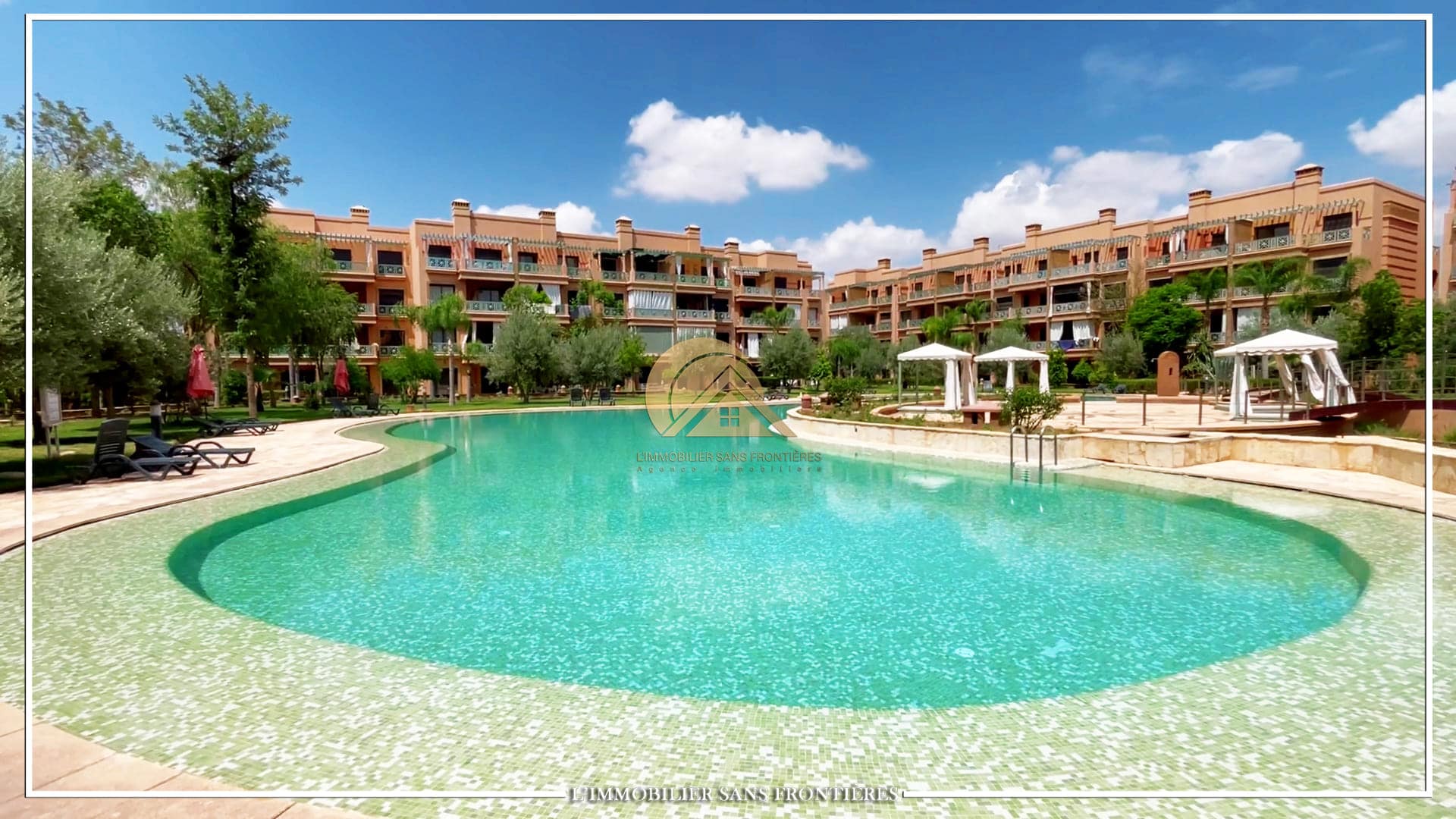 Real Estate Without Borders offers this unfurnished apartment for sale in Agdal, Marrakech, on the 1st floor, in a secured residence. The residence provides access to a pool, shared garden and a gym, and the listing indicates a basement parking space.