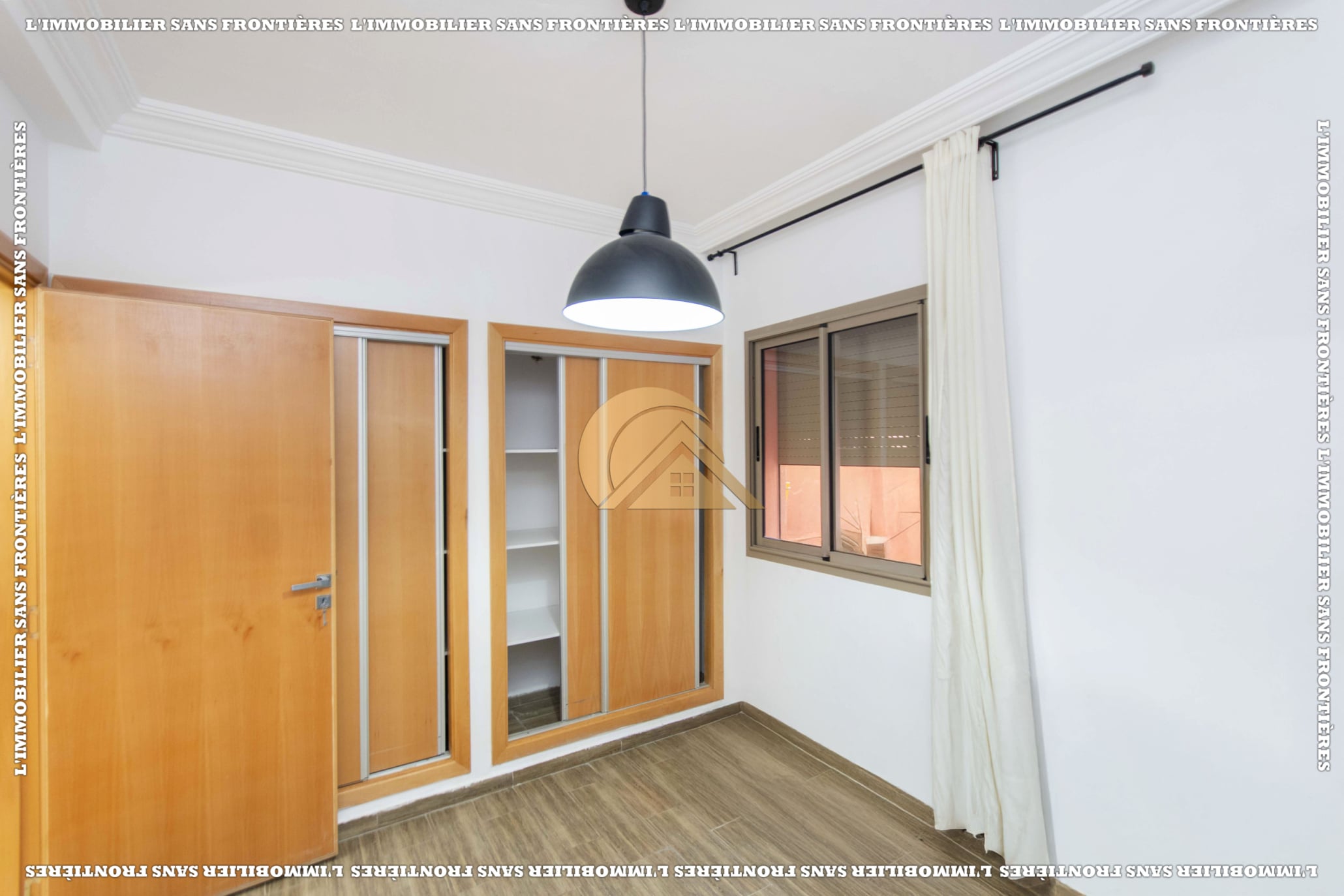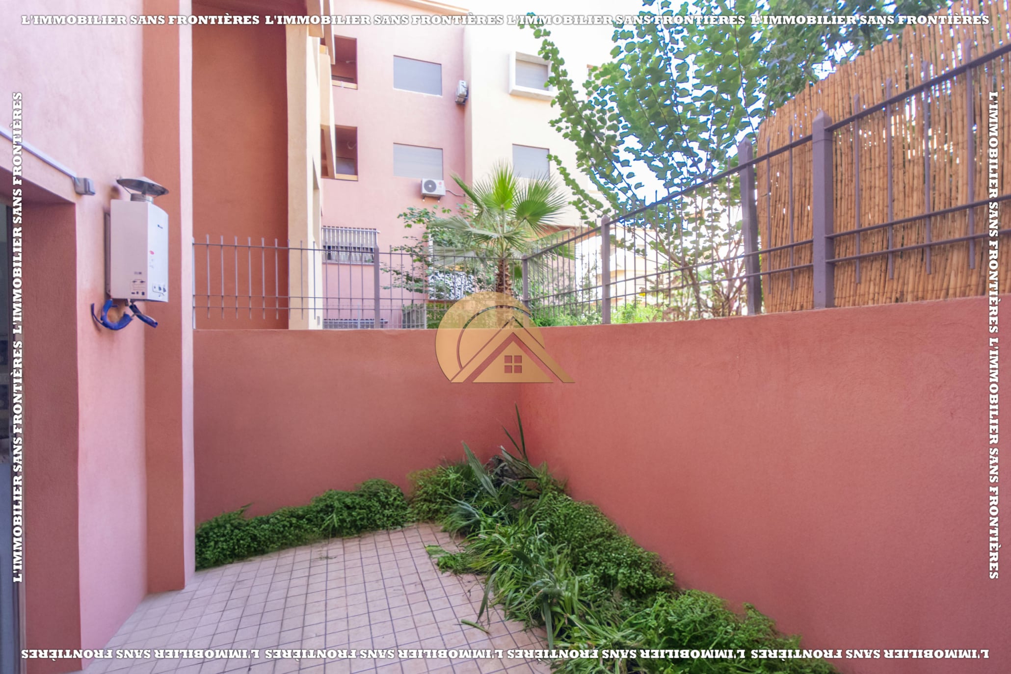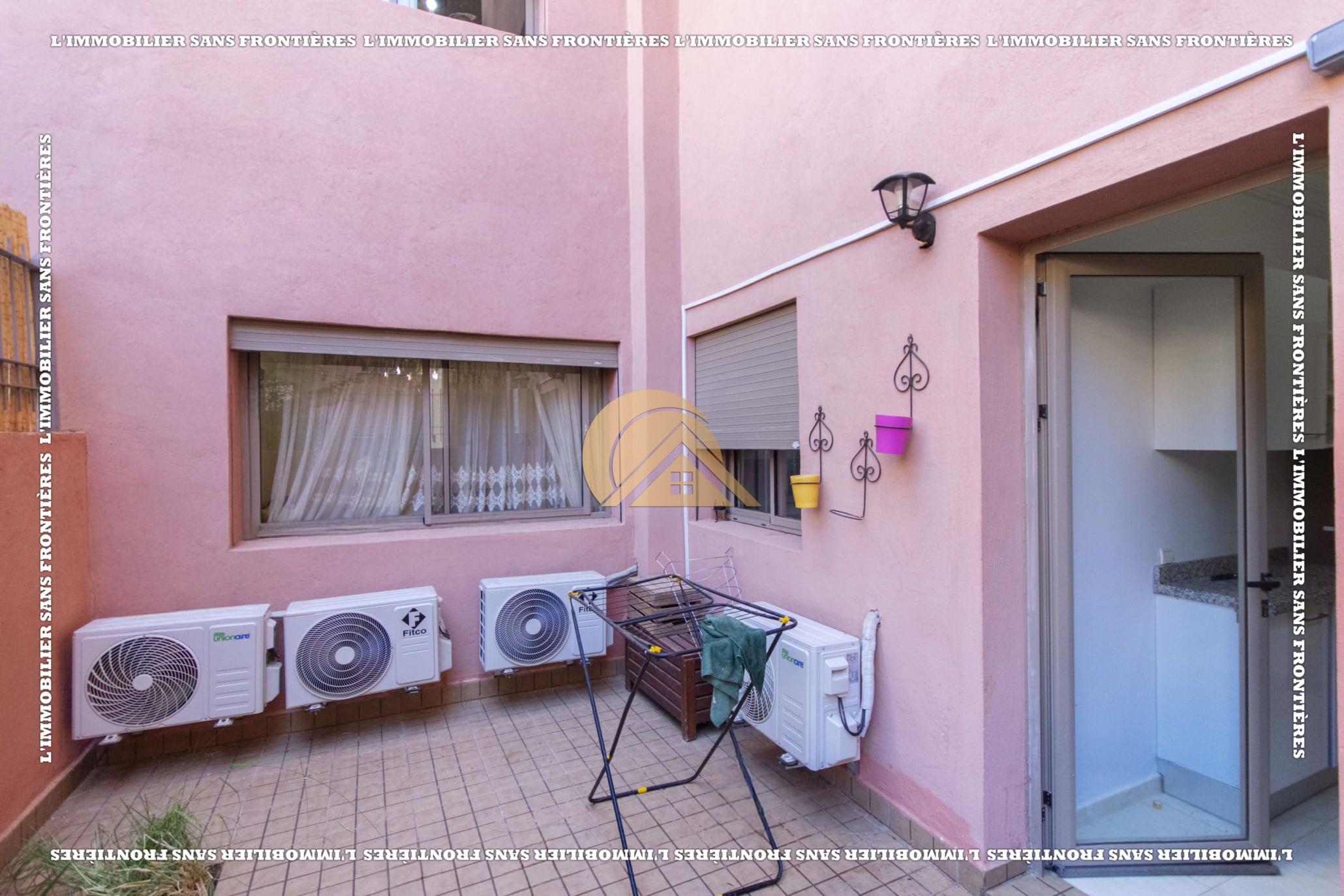 Real Estate Without Borders offers this unfurnished duplex for sale in Targa, Marrakech, on the ground floor of a calm and secured residence. The text indicates proximity to shops and amenities.