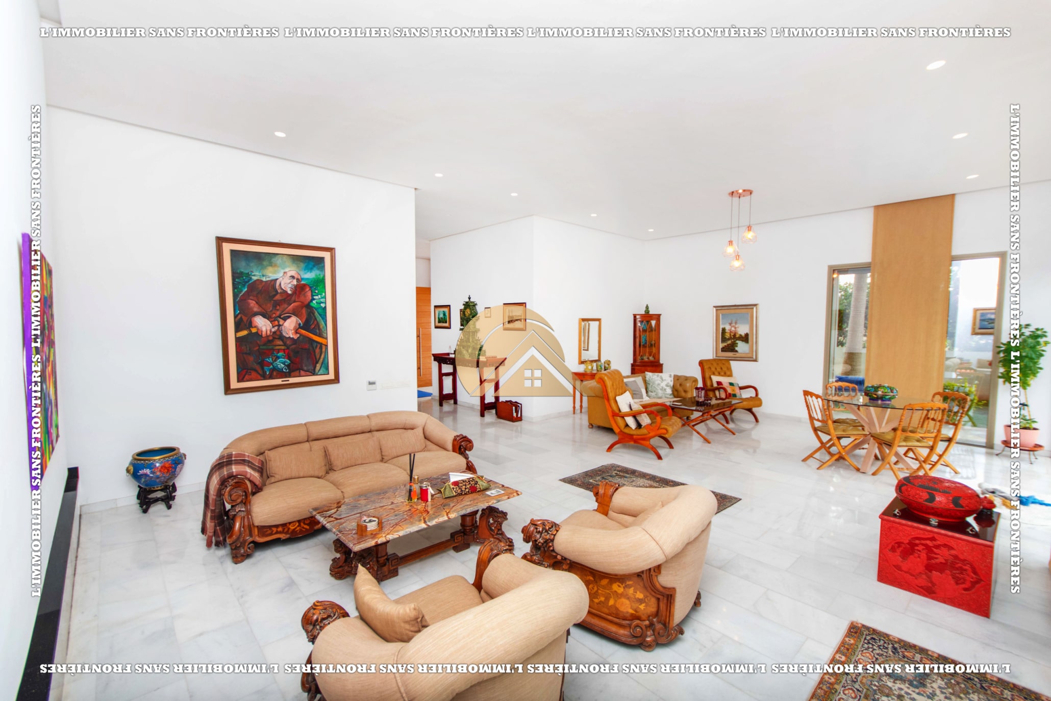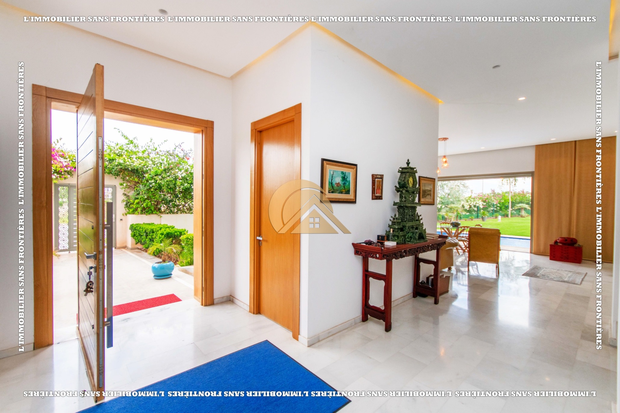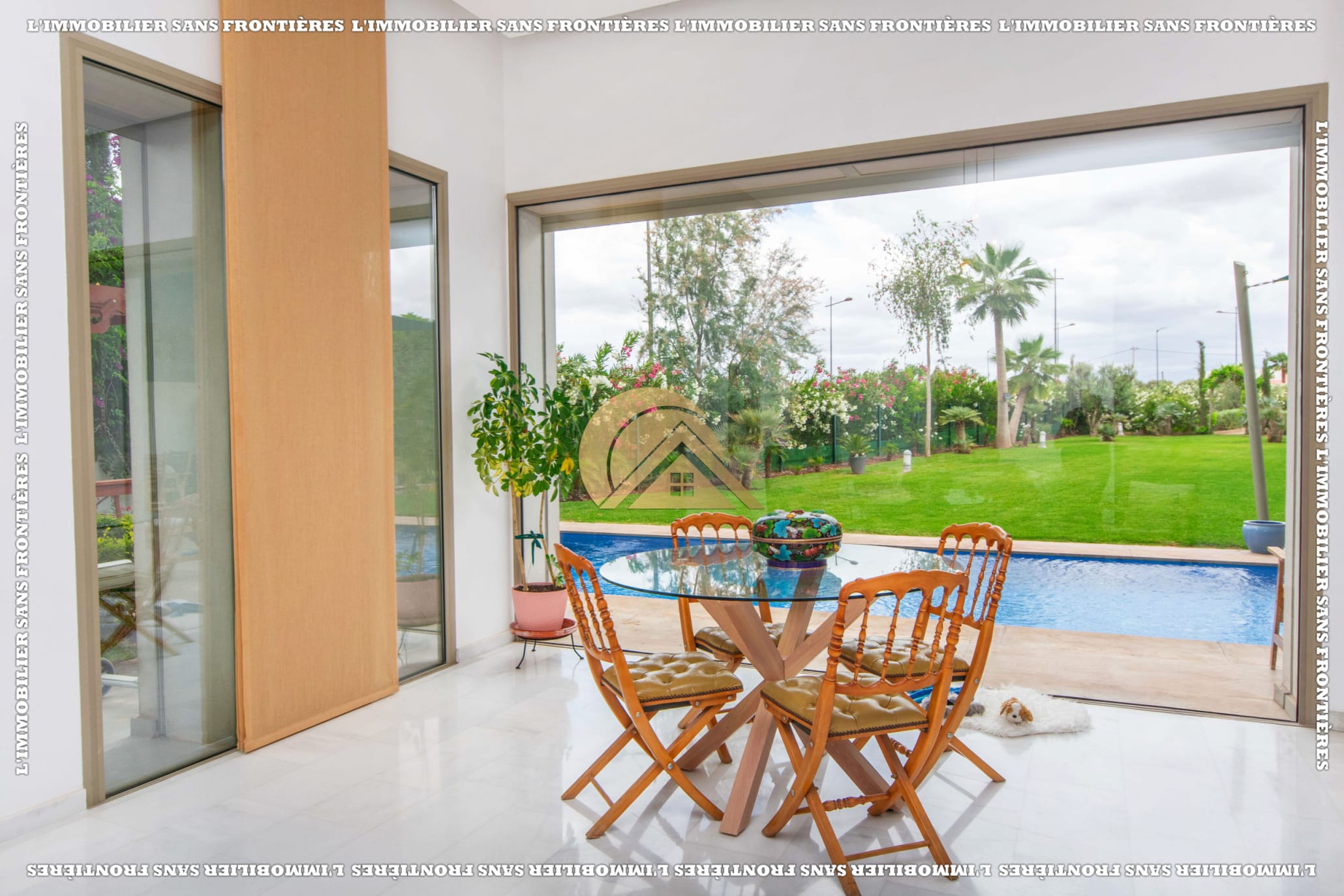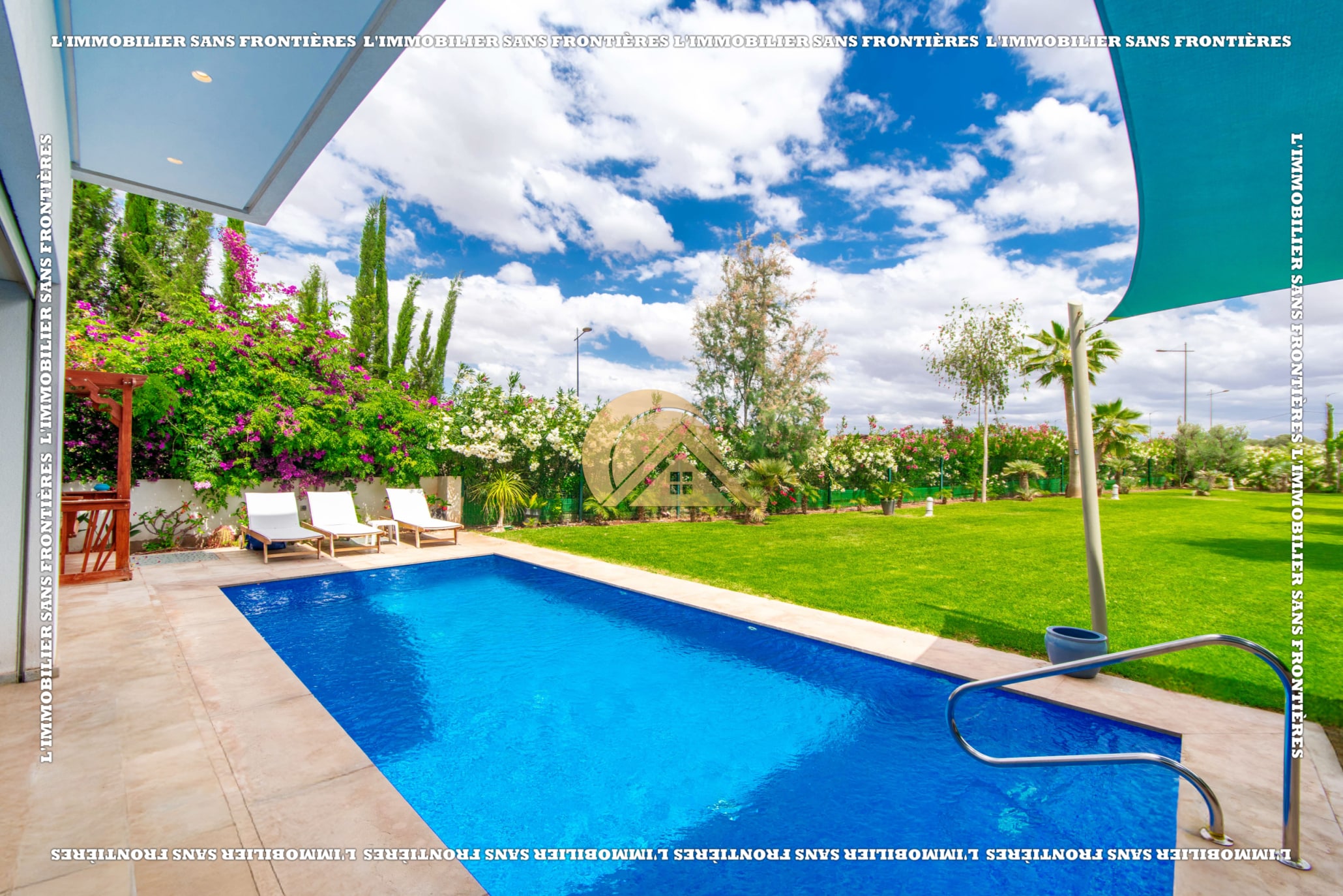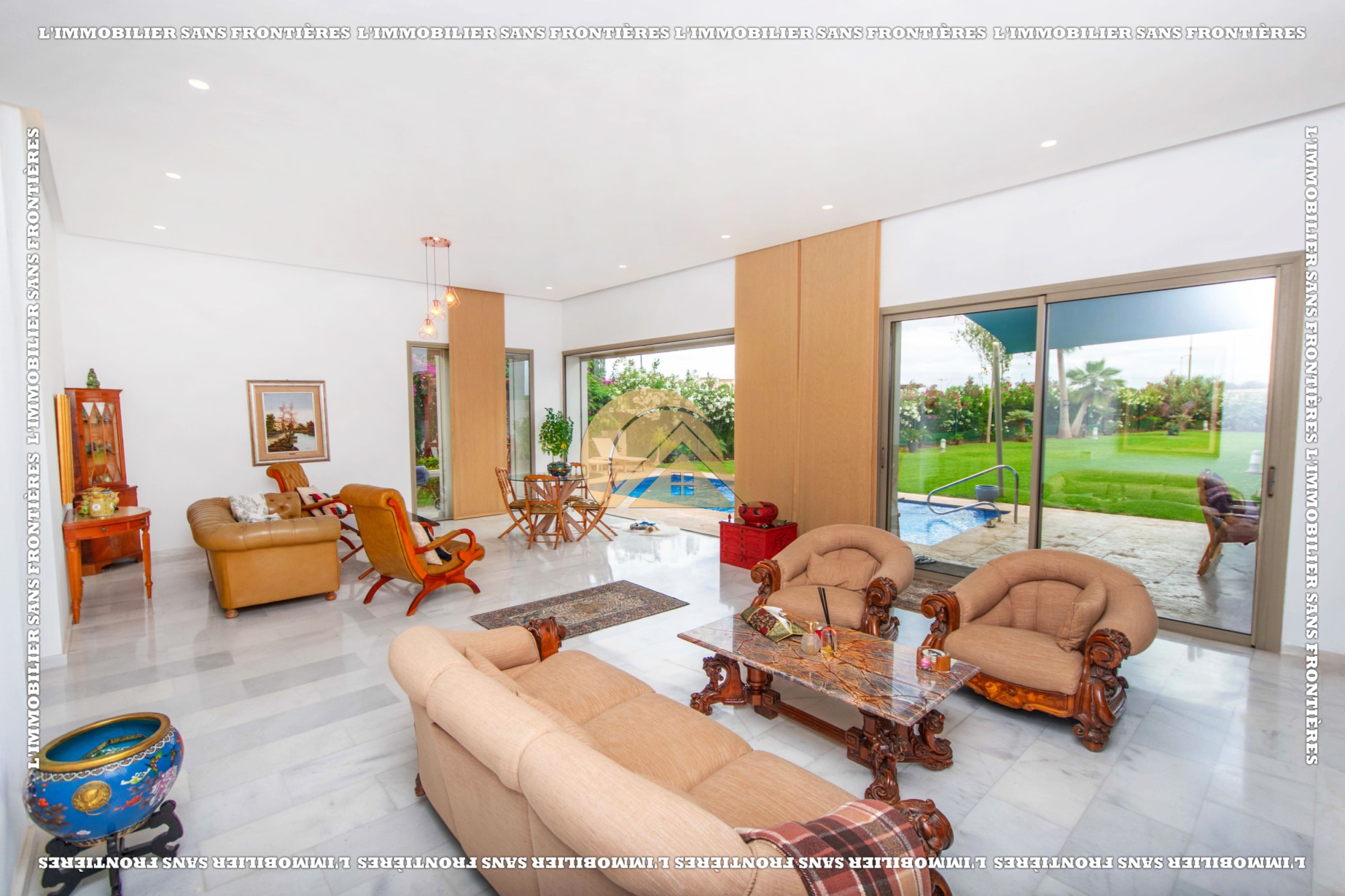 Real Estate Without Borders offers this unfurnished villa for sale in Golf Argan, on Route de Tahanaout in Marrakech. The provided details mention a 3‑facade villa, a maintained private garden with pool and waterfall, and a multi-level layout.