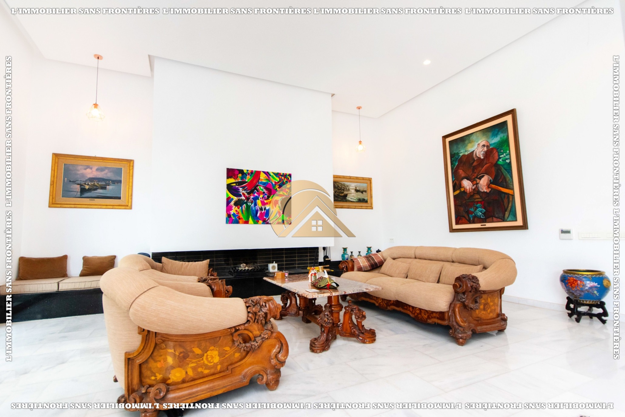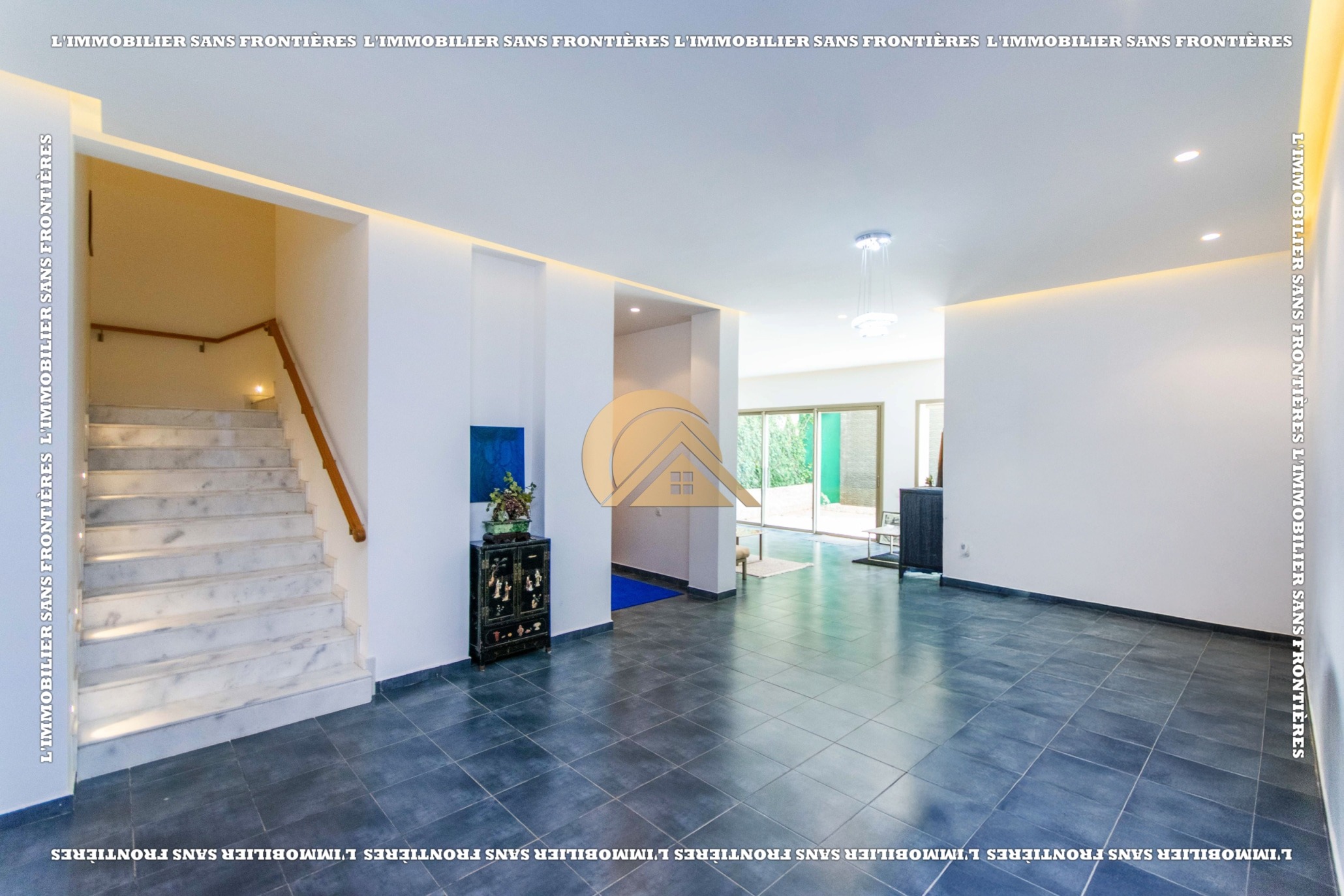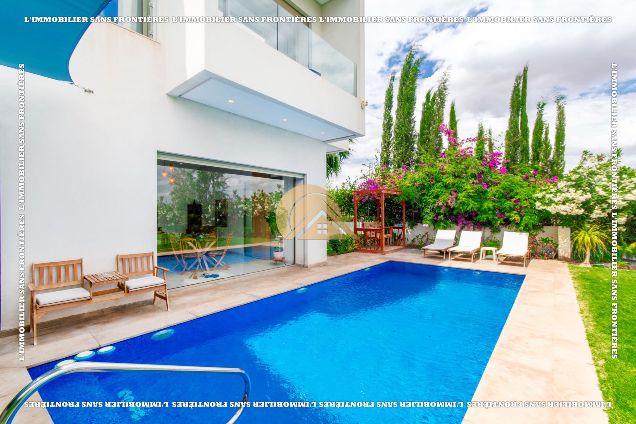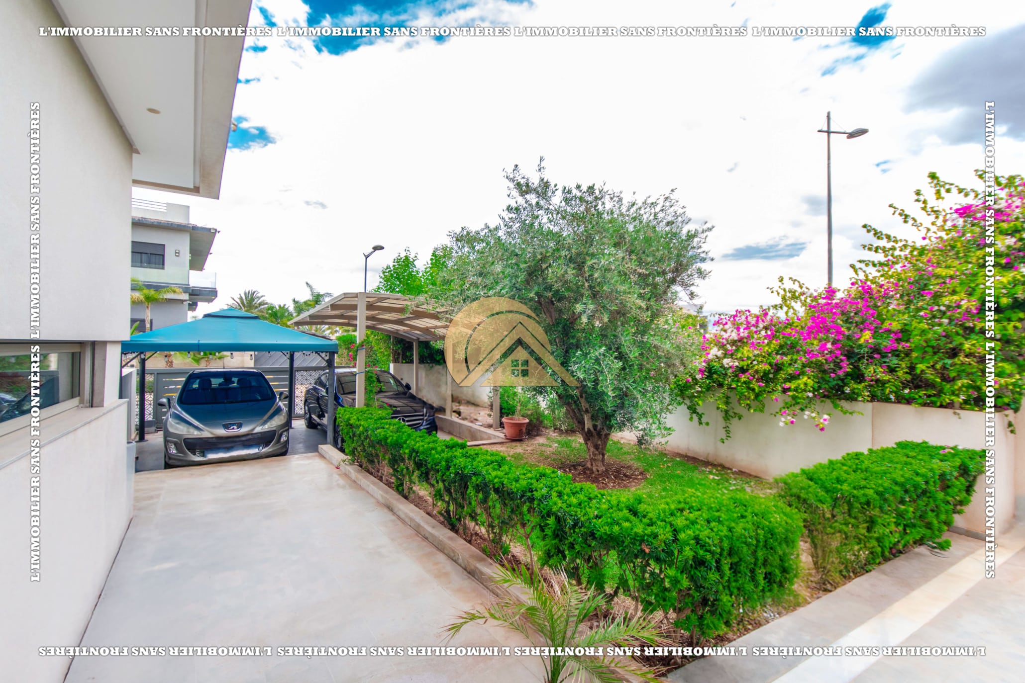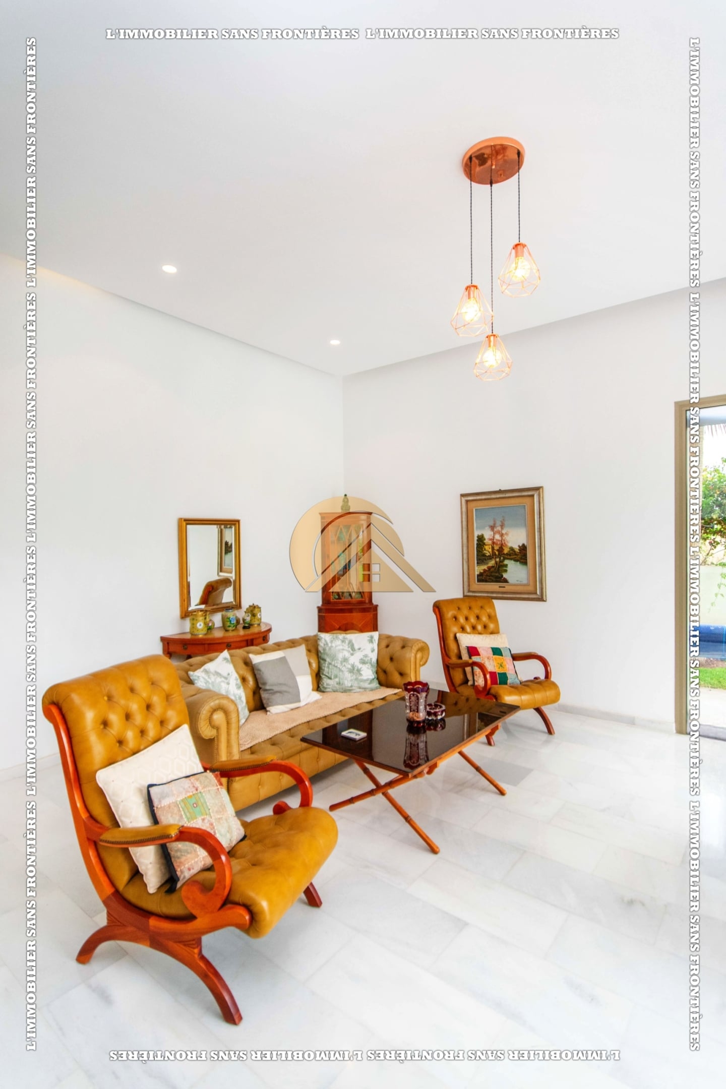 Real Estate Without Borders offers this unfurnished villa for sale in Golf Argan, on Route de Tahanaout in Marrakech. The provided details mention a 3‑facade villa, a maintained private garden with pool and waterfall, and a multi-level layout.