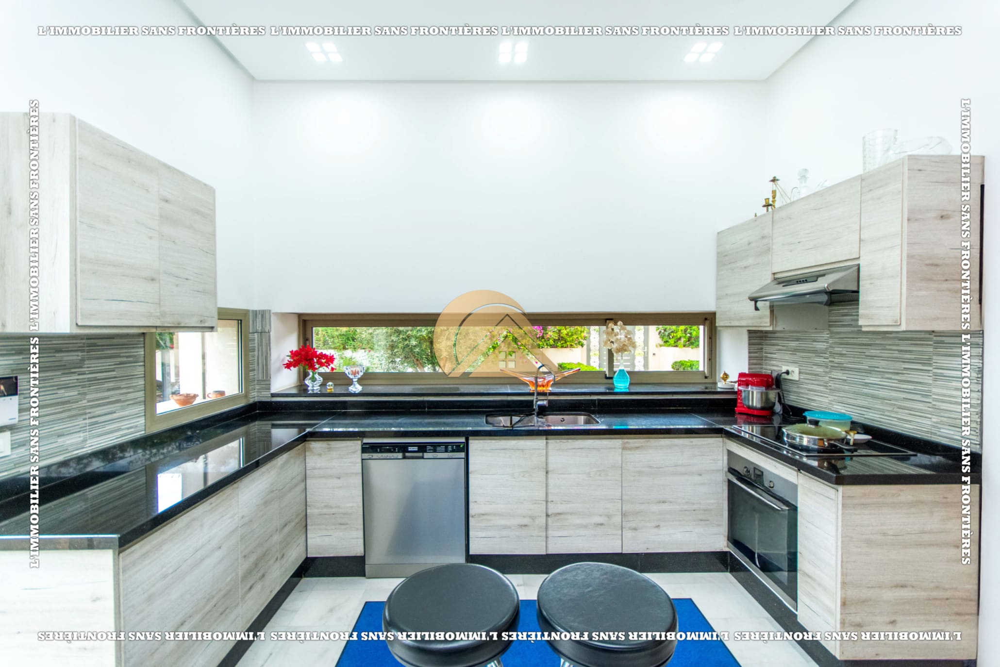 Ground floor: 2 bright European living rooms – Wood fireplace – Large bay window with access to terrace and garden – 1 Moroccan living room – Fully equipped kitchen – Guest toilets – Terrace – central air conditioning