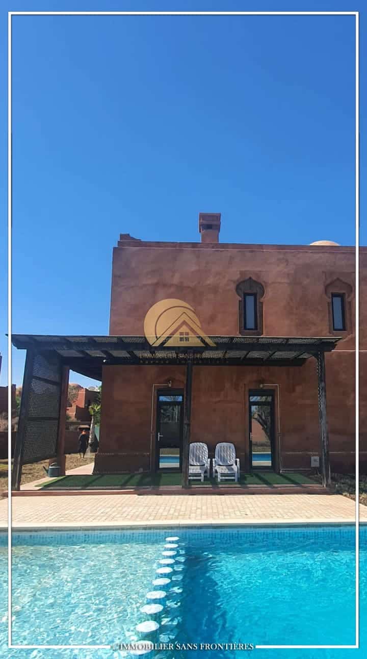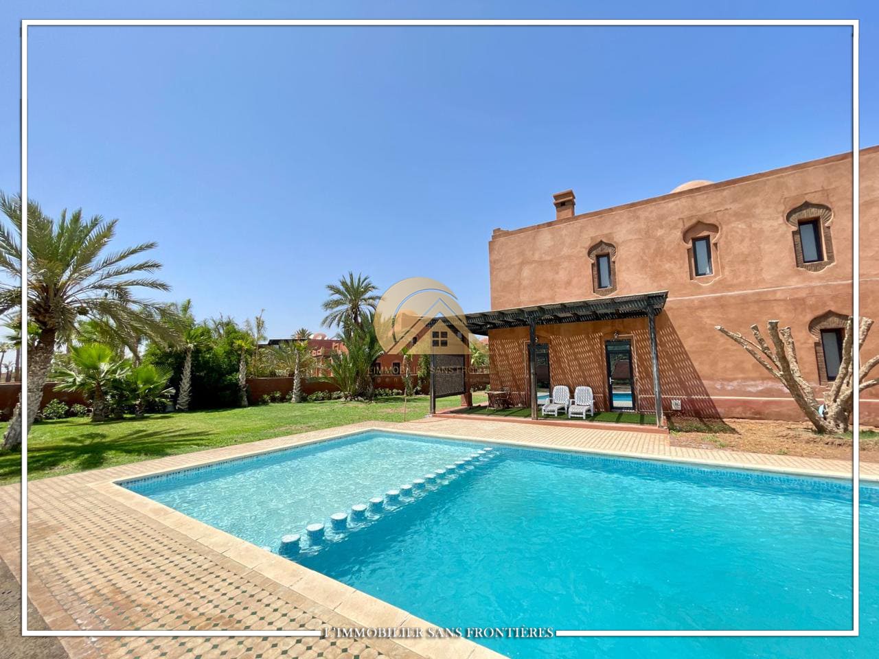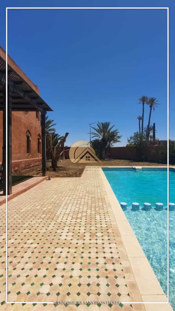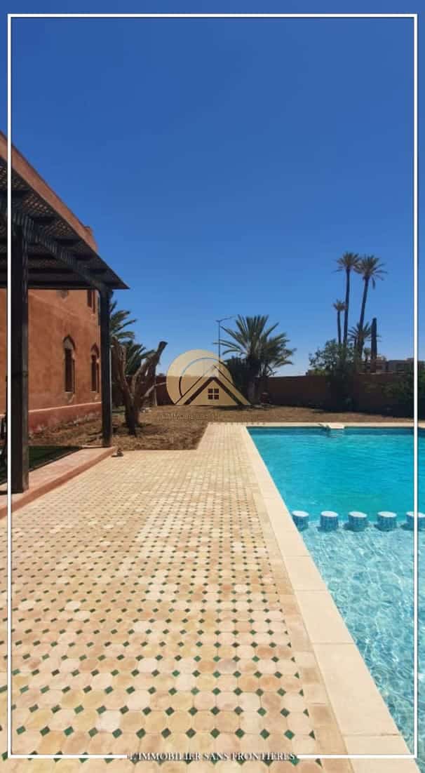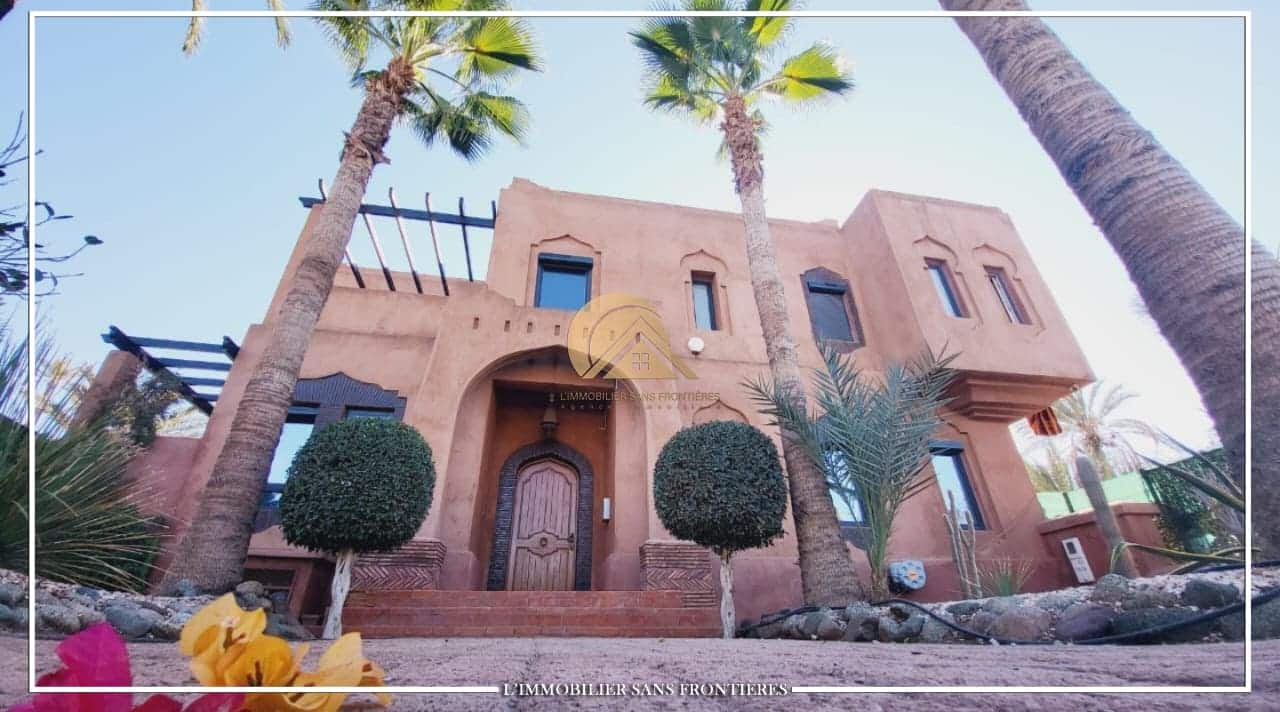 Real Estate Without Borders offers this unfurnished villa for sale on Route de Casablanca, Marrakech, stated as 10 minutes from the city center and 15 minutes from Jemaa el-Fna square. It is within a complex with on-site facilities (sports courts, mini-golf, mini-karting track, five lagoons), plus a restaurant, a convenience store and a hotel residence with a pool.