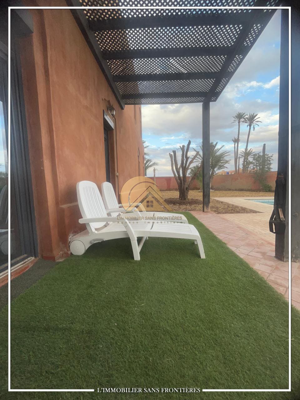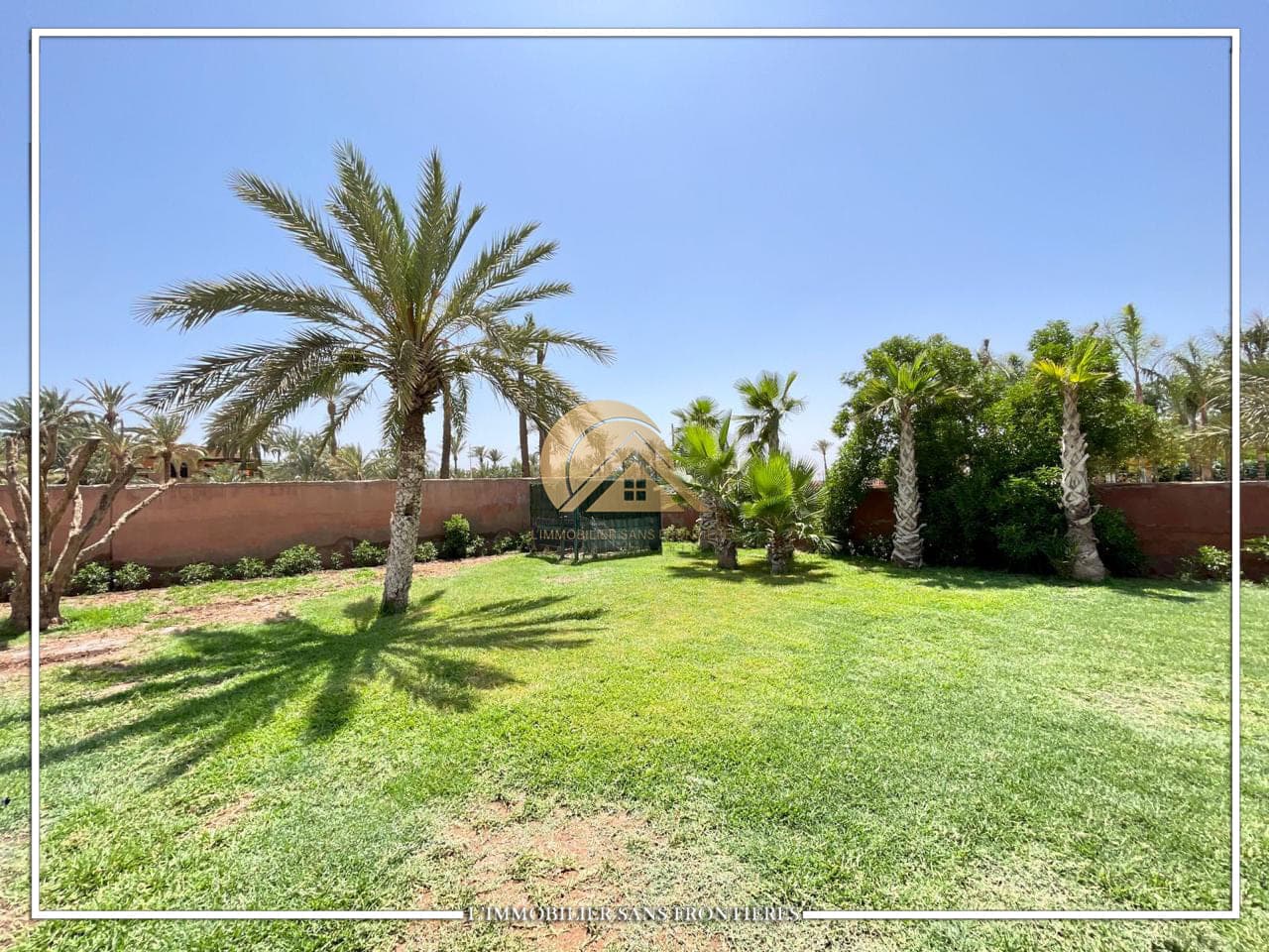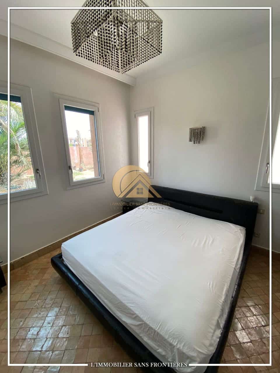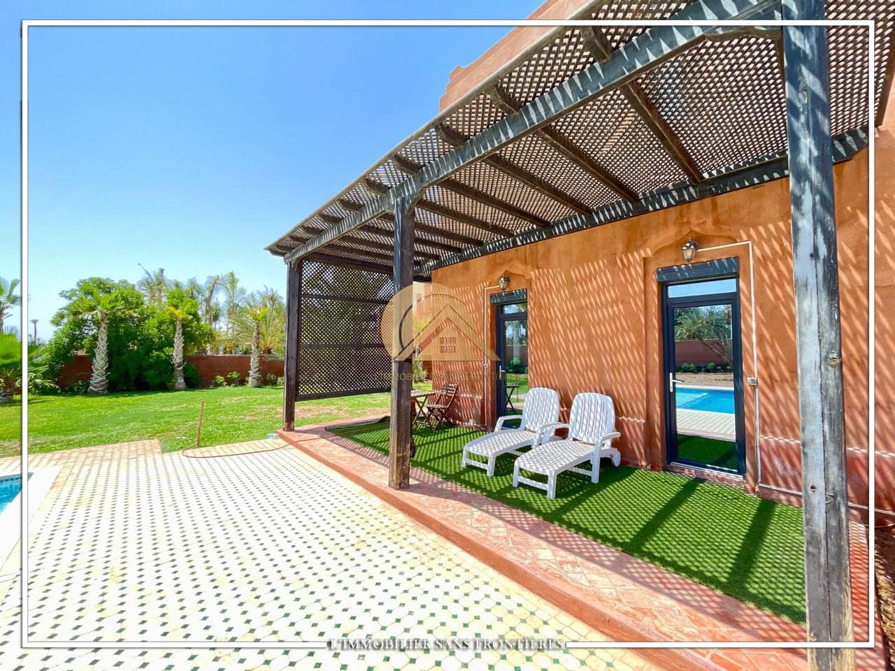Real Estate Without Borders offers this unfurnished villa for sale on Route de Casablanca, Marrakech, stated as 10 minutes from the city center and 15 minutes from Jemaa el-Fna square. It is within a complex with on-site facilities (sports courts, mini-golf, mini-karting track, five lagoons), plus a restaurant, a convenience store and a hotel residence with a pool.