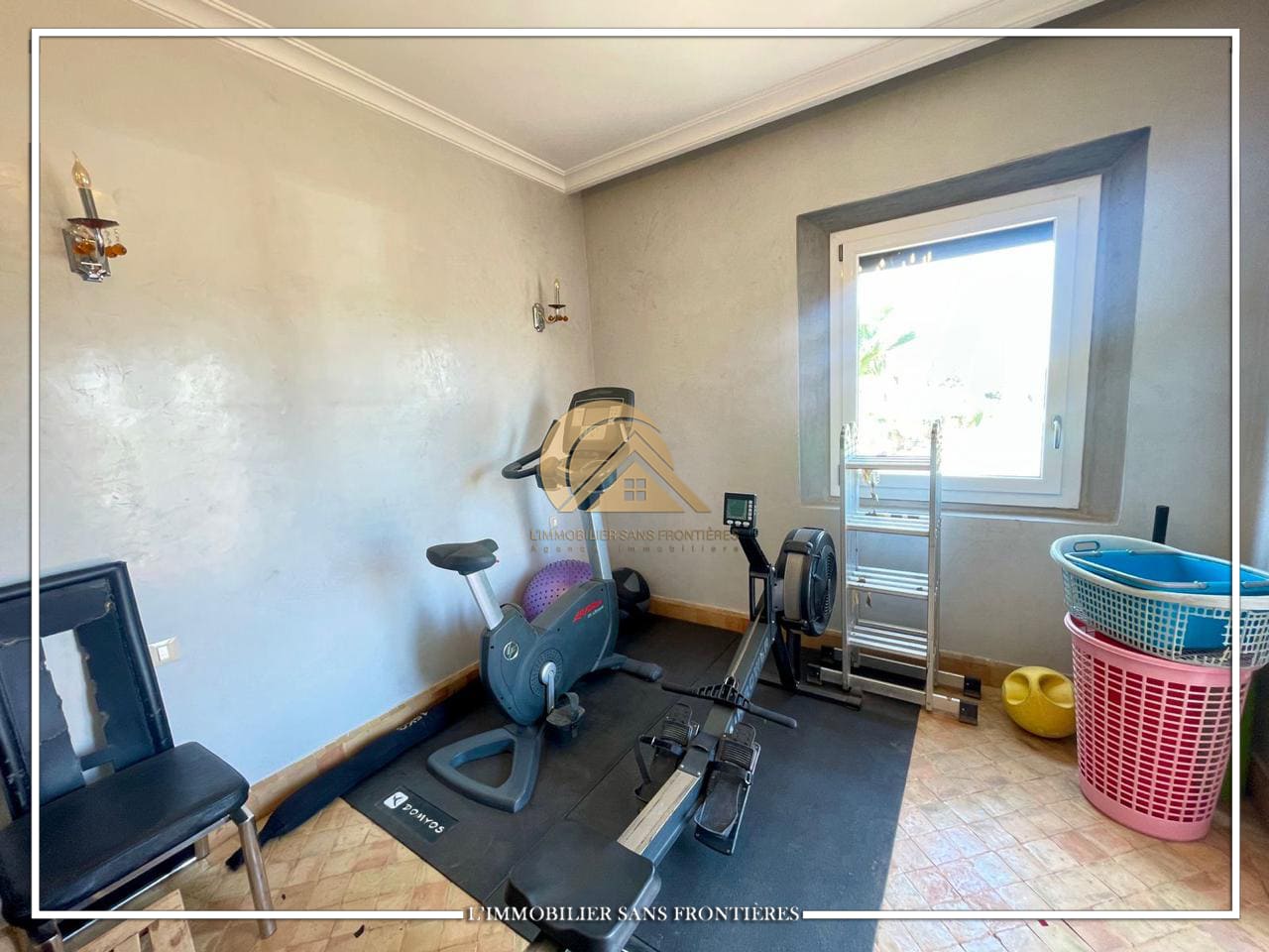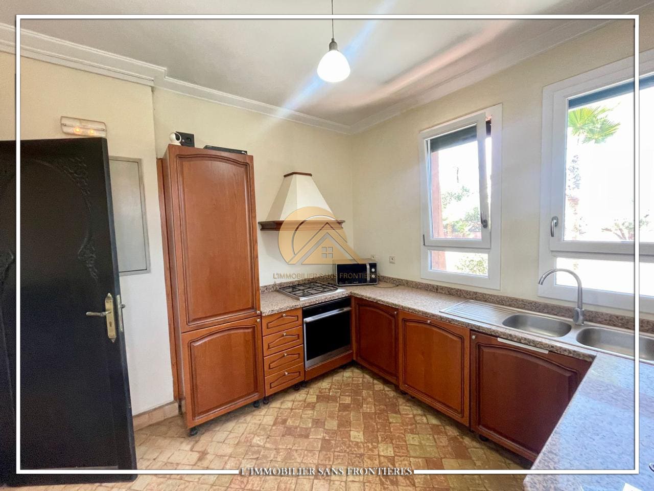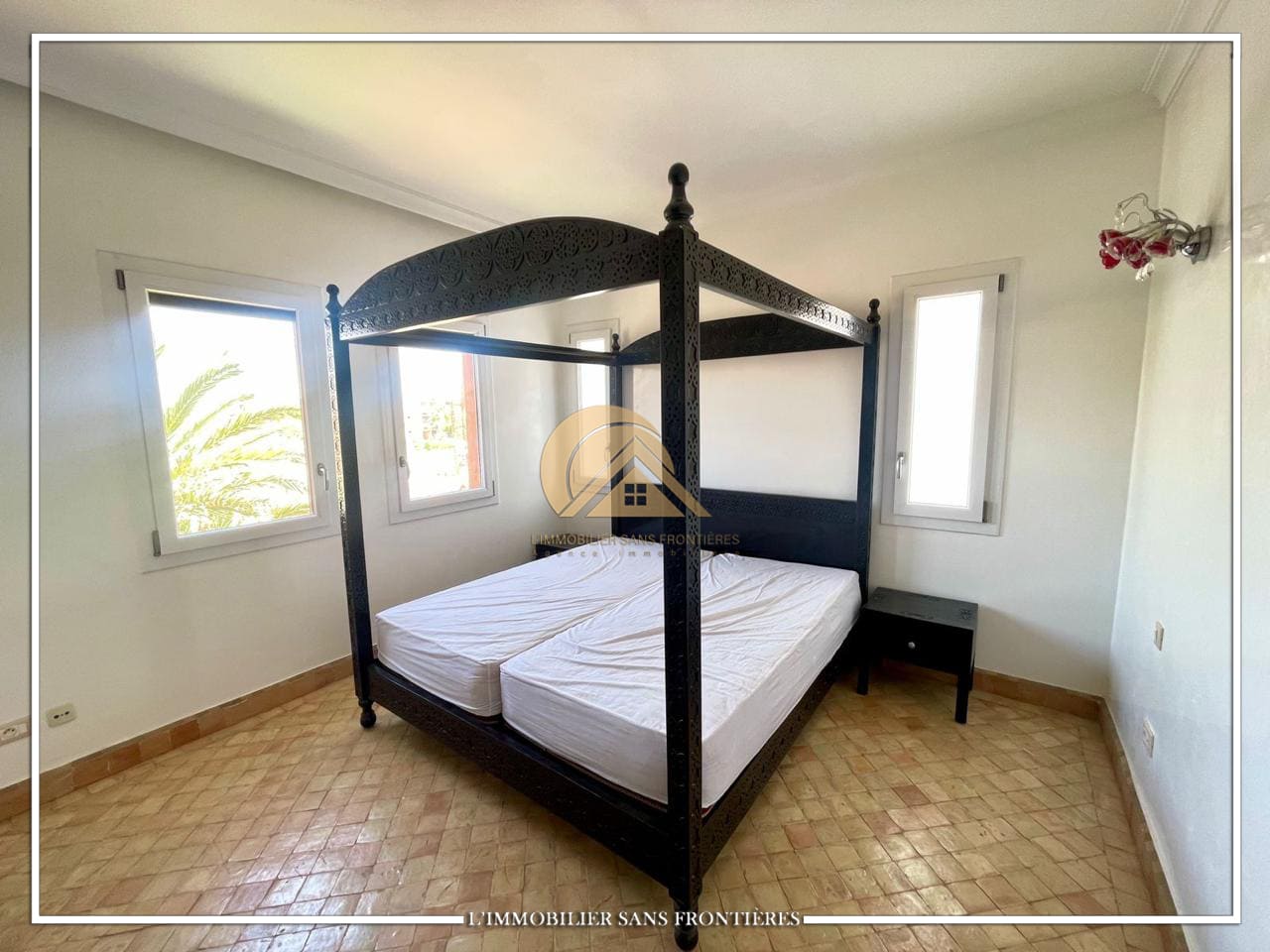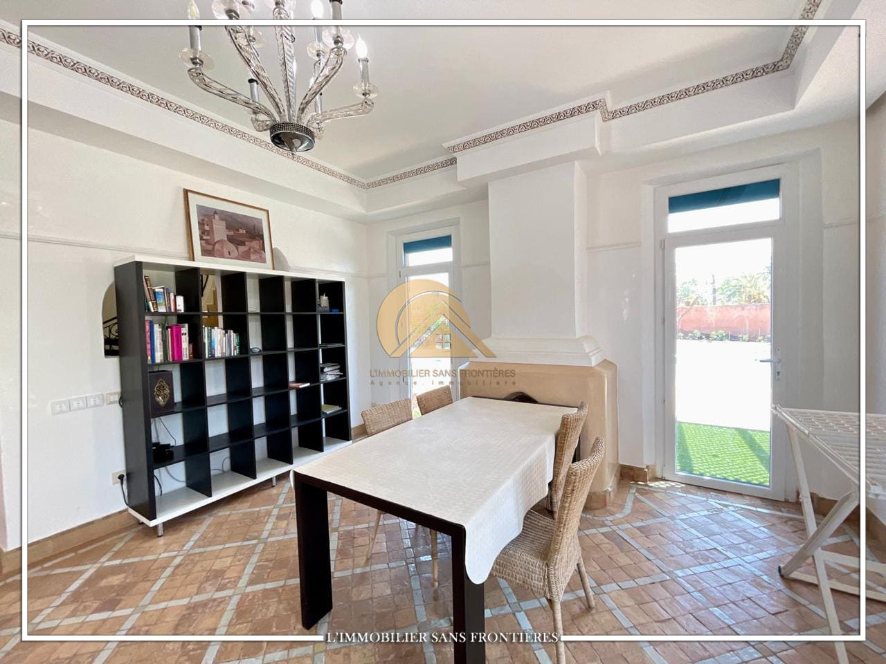 Real Estate Without Borders offers this unfurnished villa for sale on Route de Casablanca, Marrakech, stated as 10 minutes from the city center and 15 minutes from Jemaa el-Fna square. It is within a complex with on-site facilities (sports courts, mini-golf, mini-karting track, five lagoons), plus a restaurant, a convenience store and a hotel residence with a pool.