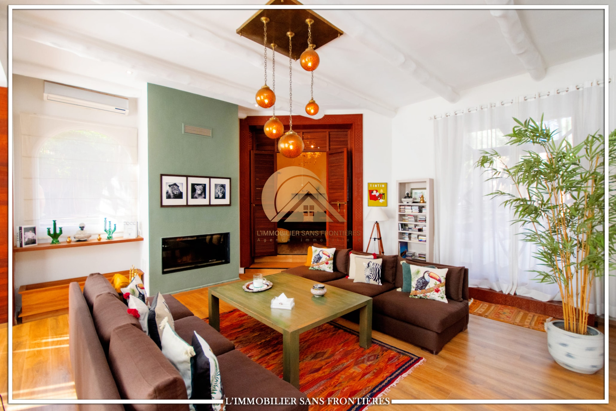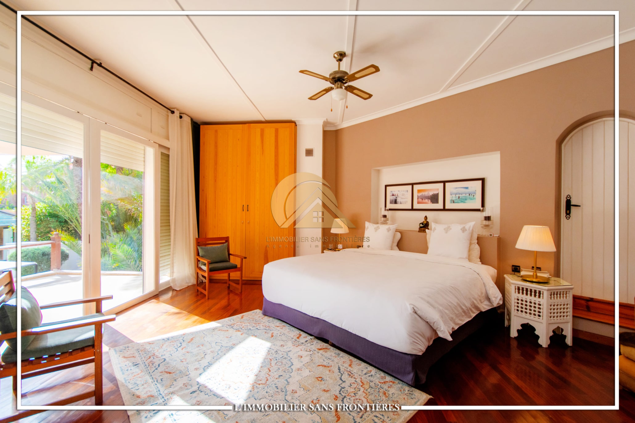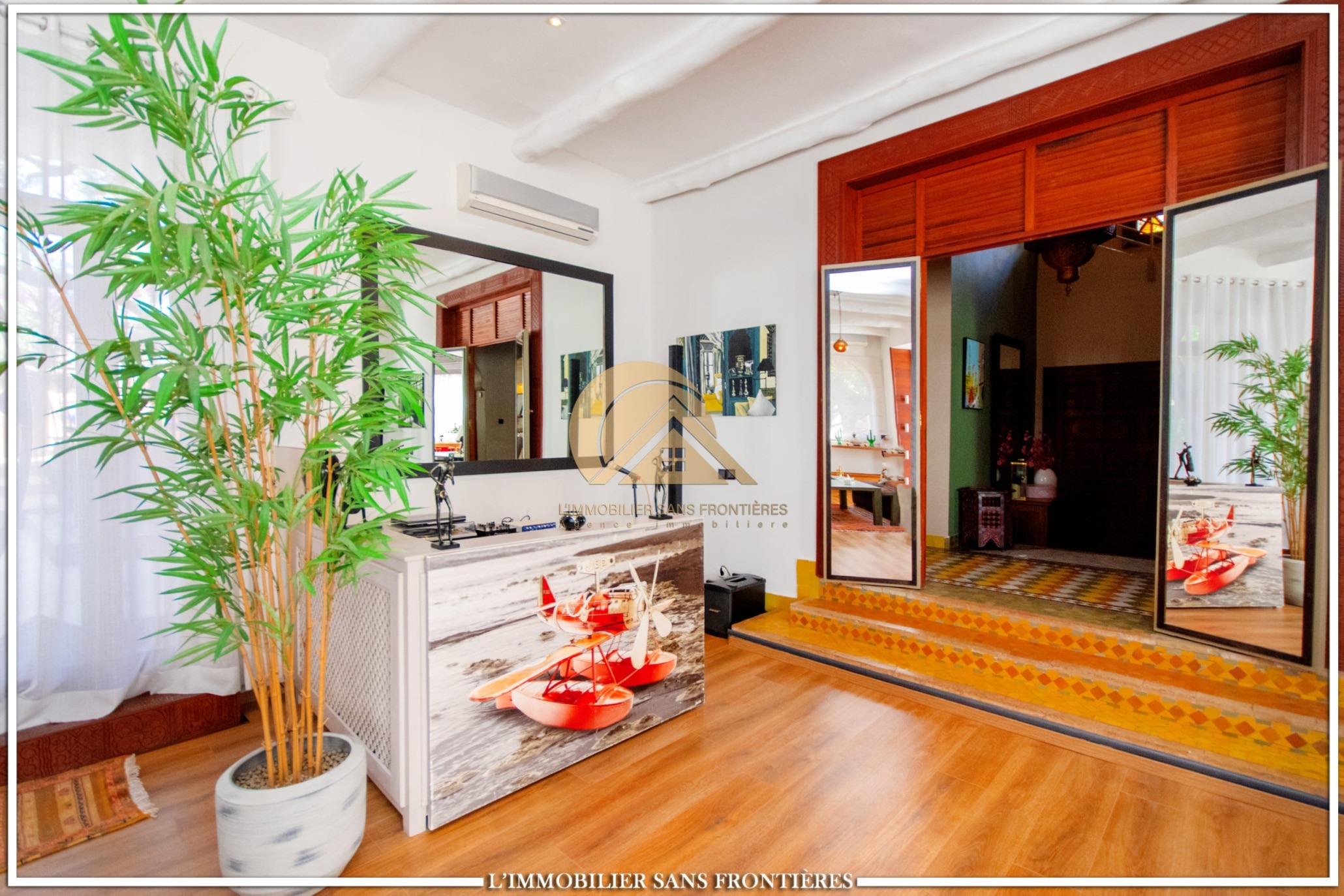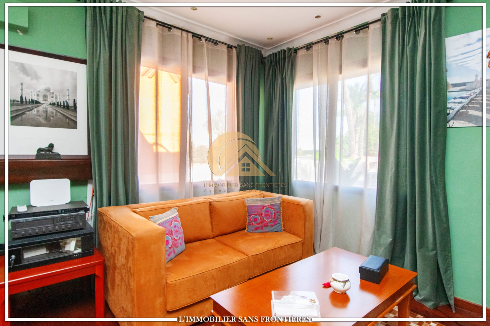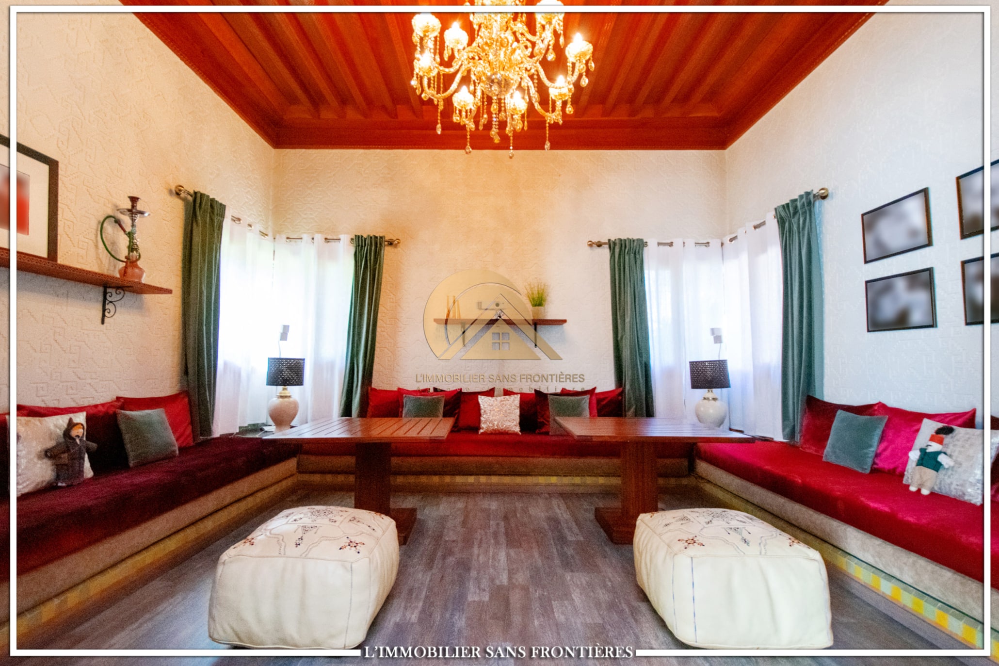 Real Estate Without Borders offers this unfurnished villa for sale in Targa, Marrakech, on a 2300 m² plot. The text mentions a private garden with a SPA (jacuzzi), gym and 3 pergolas, as well as a pool.