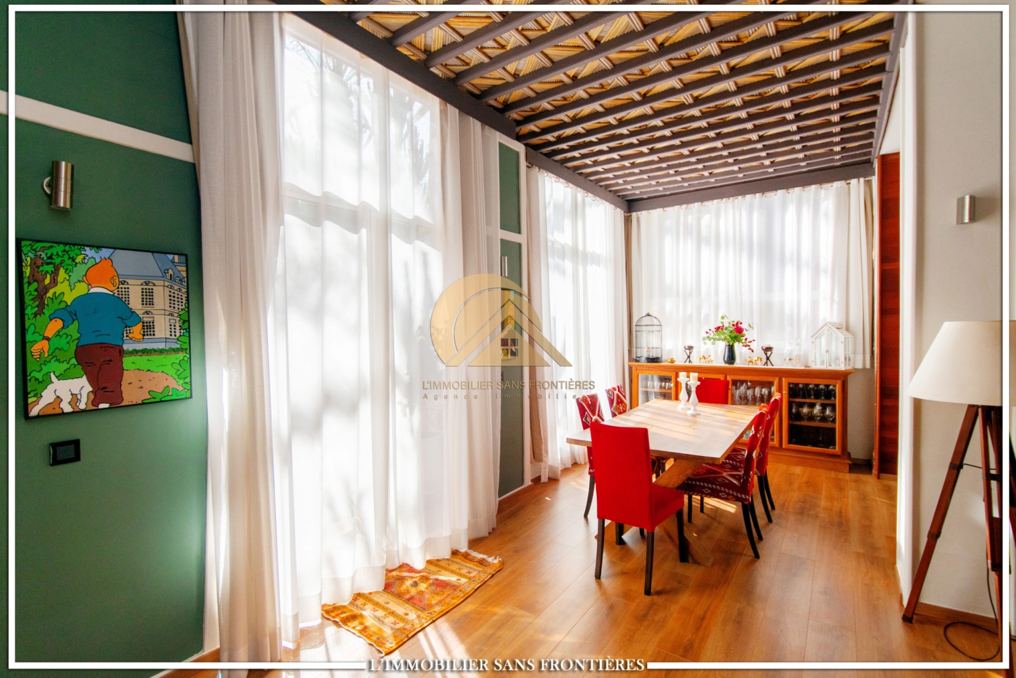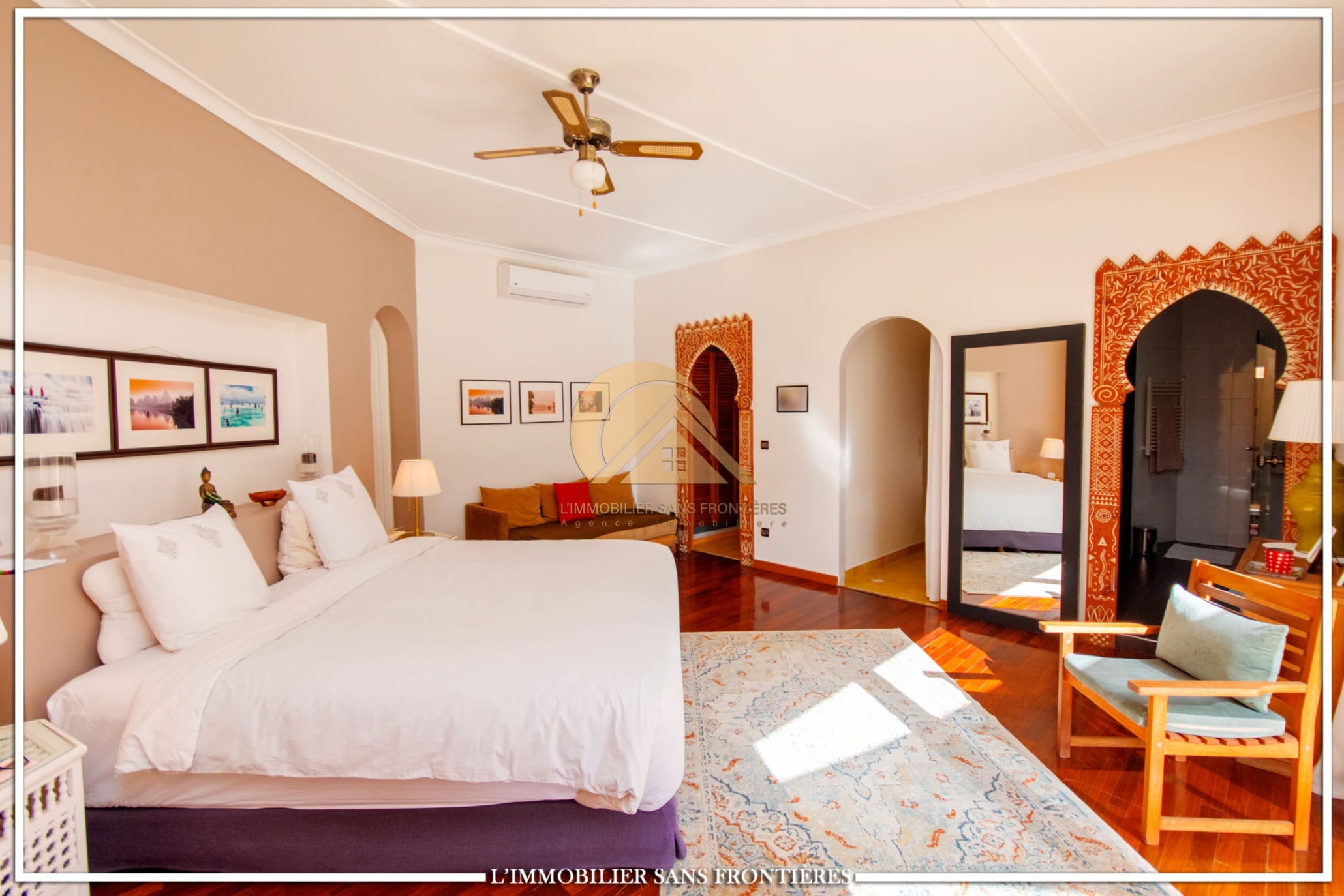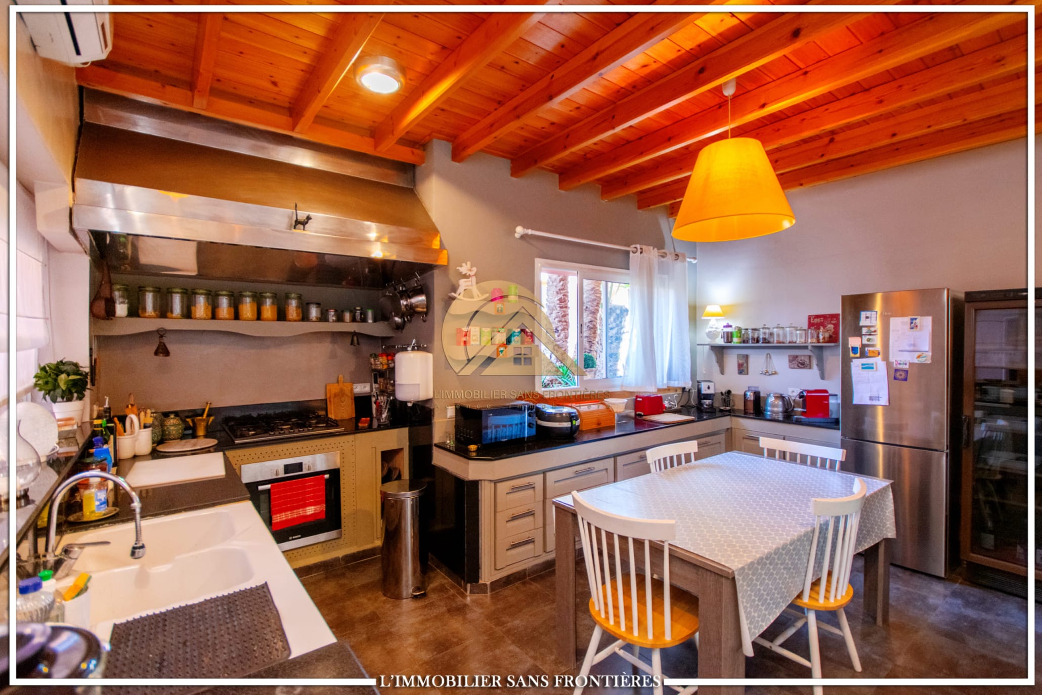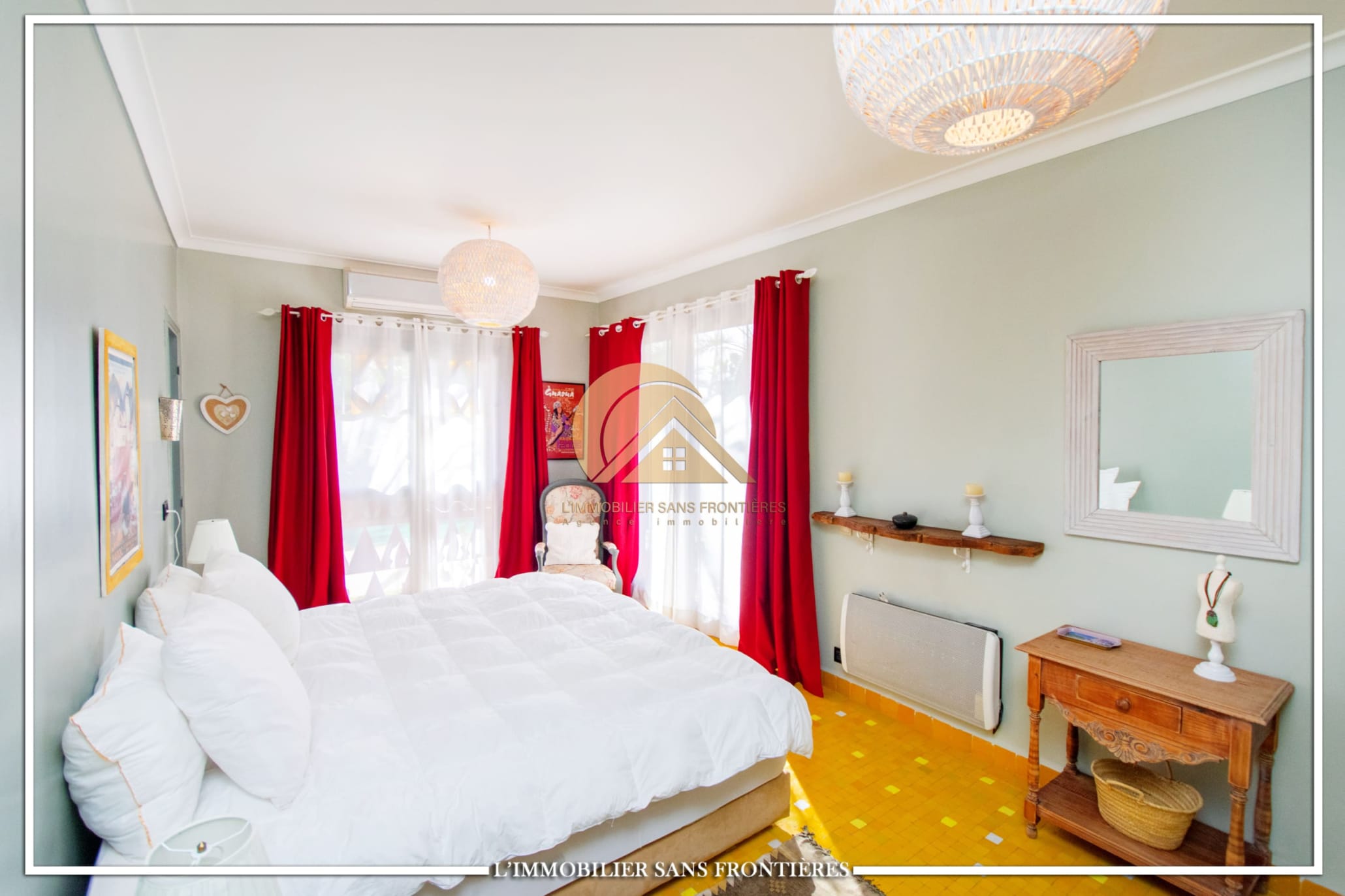 Real Estate Without Borders offers this unfurnished villa for sale in Targa, Marrakech, on a 2300 m² plot. The text mentions a private garden with a SPA (jacuzzi), gym and 3 pergolas, as well as a pool.