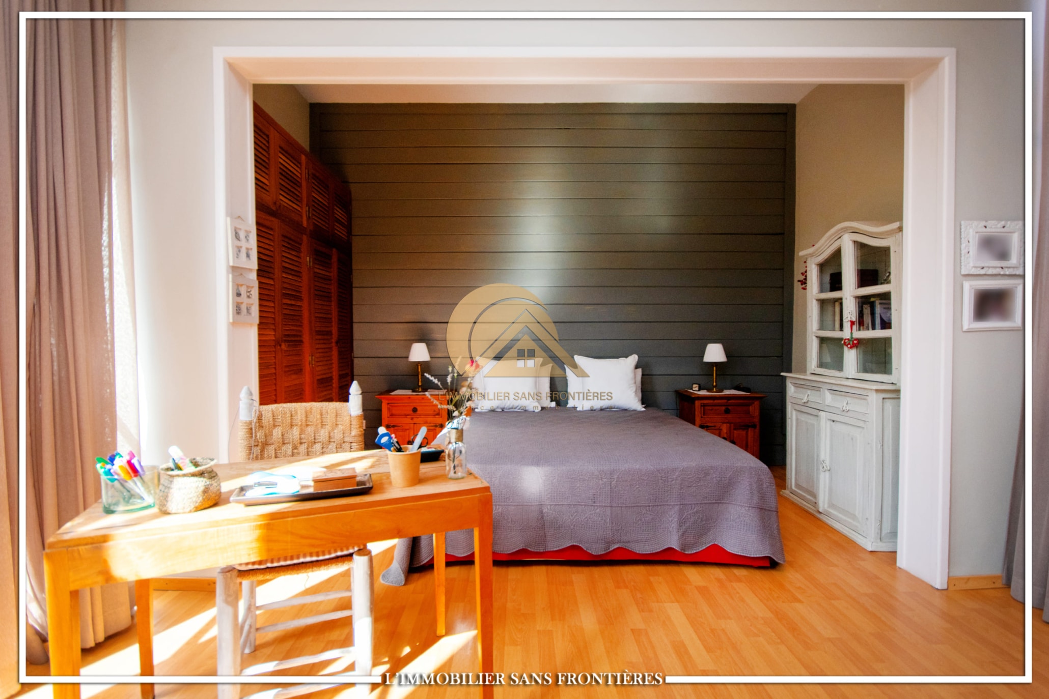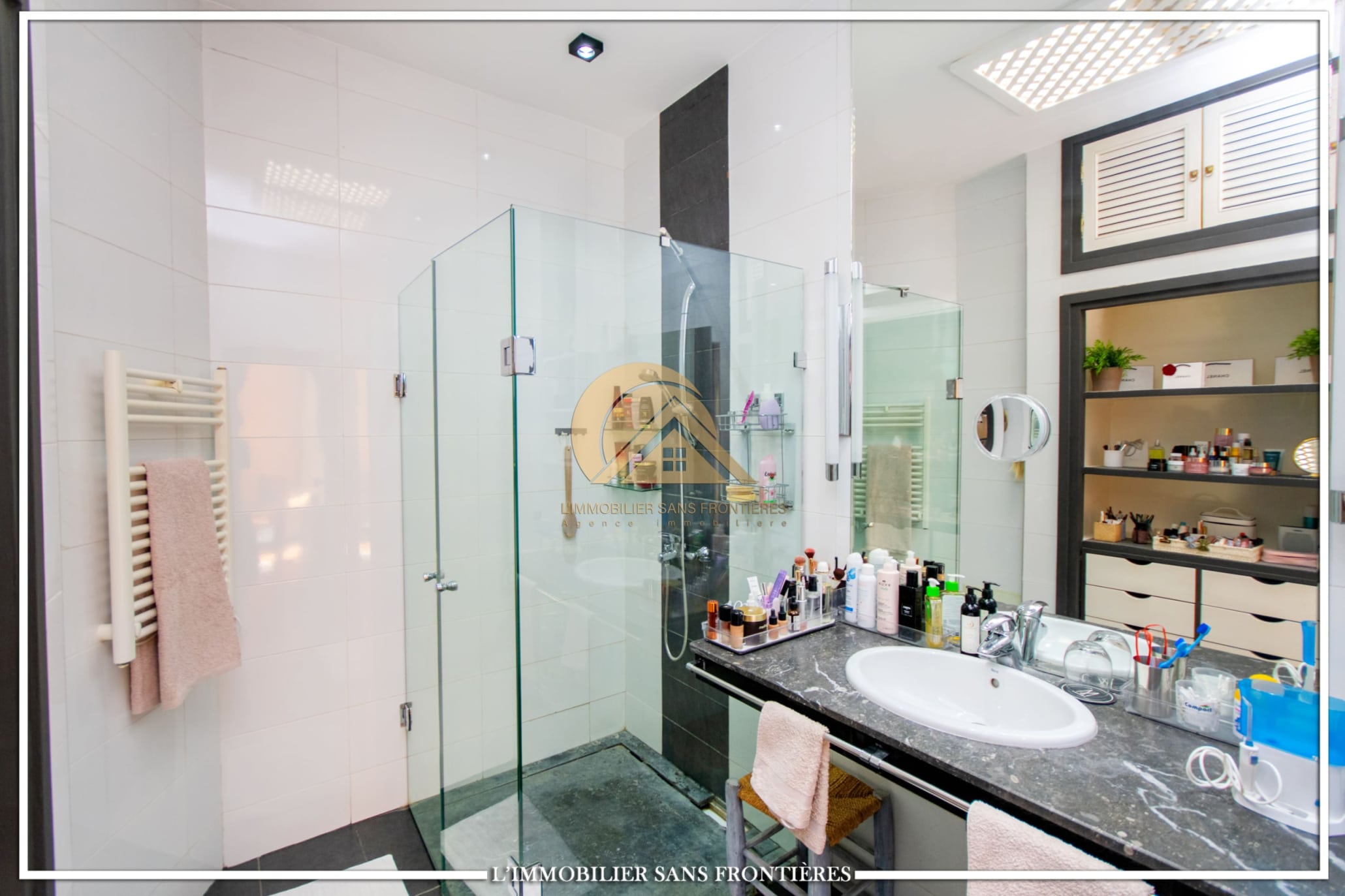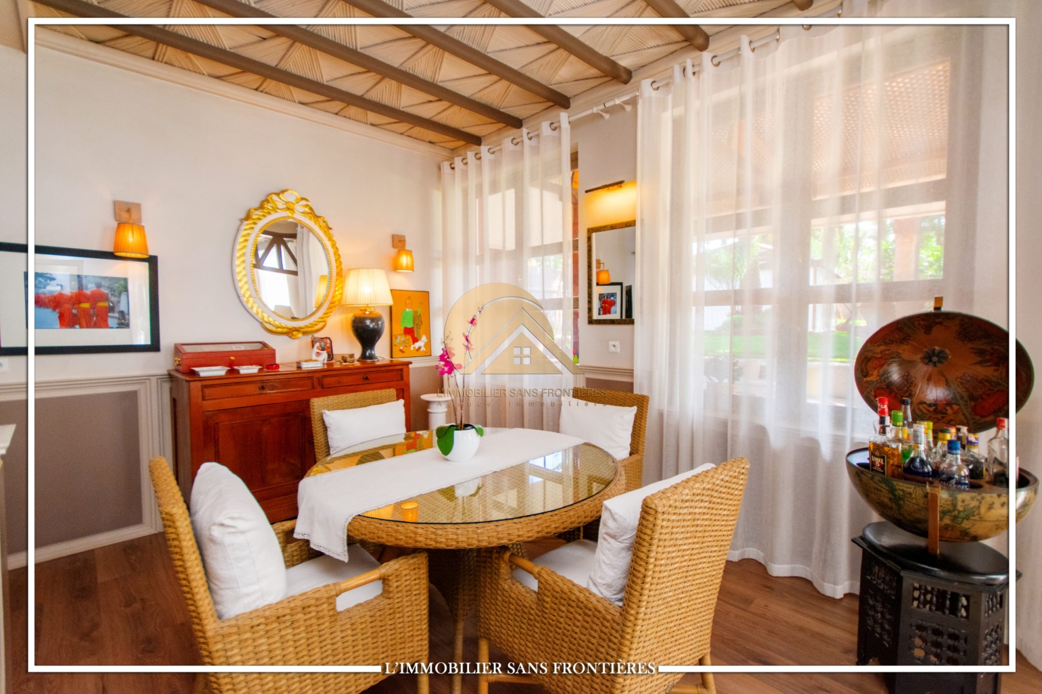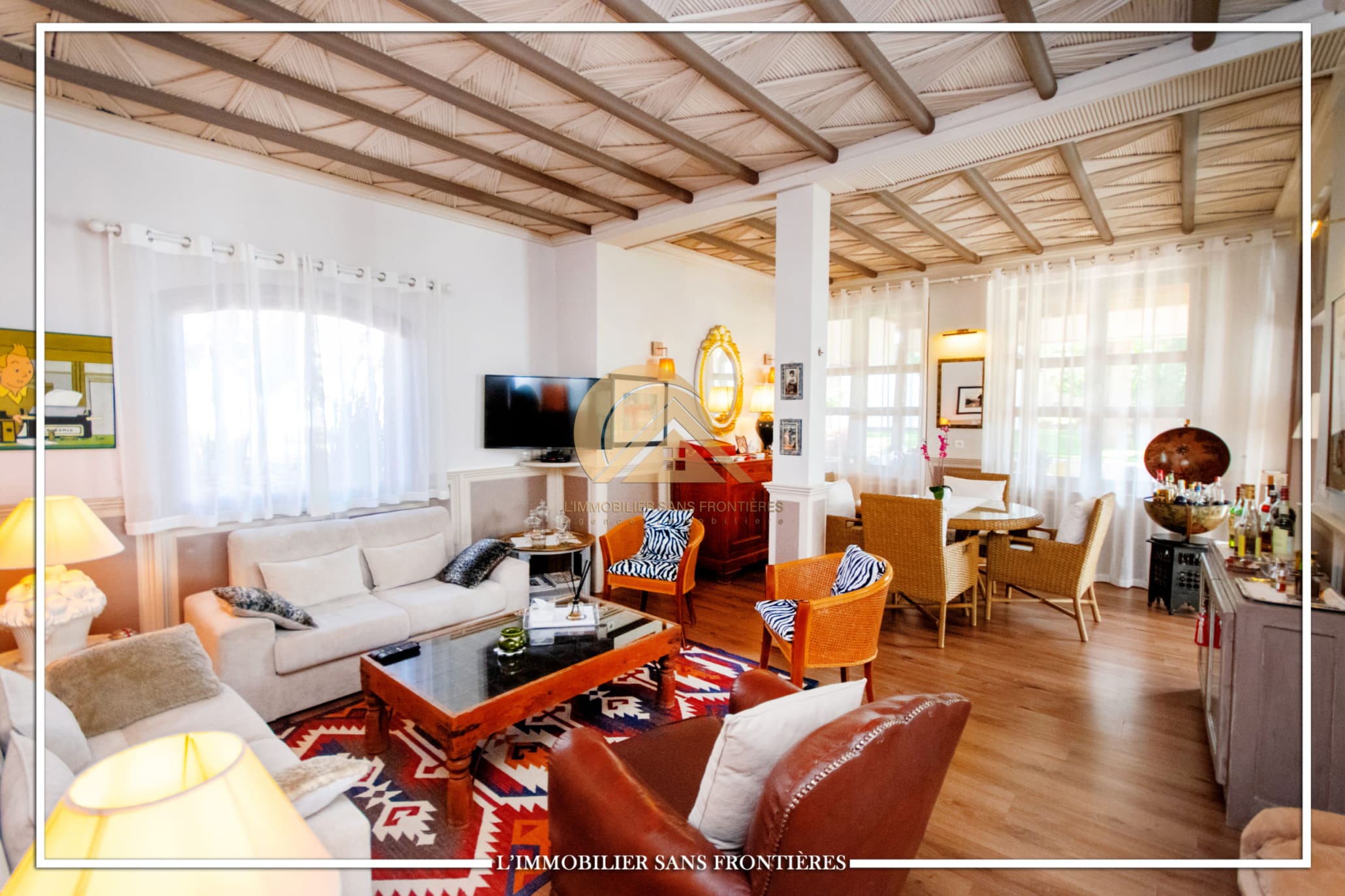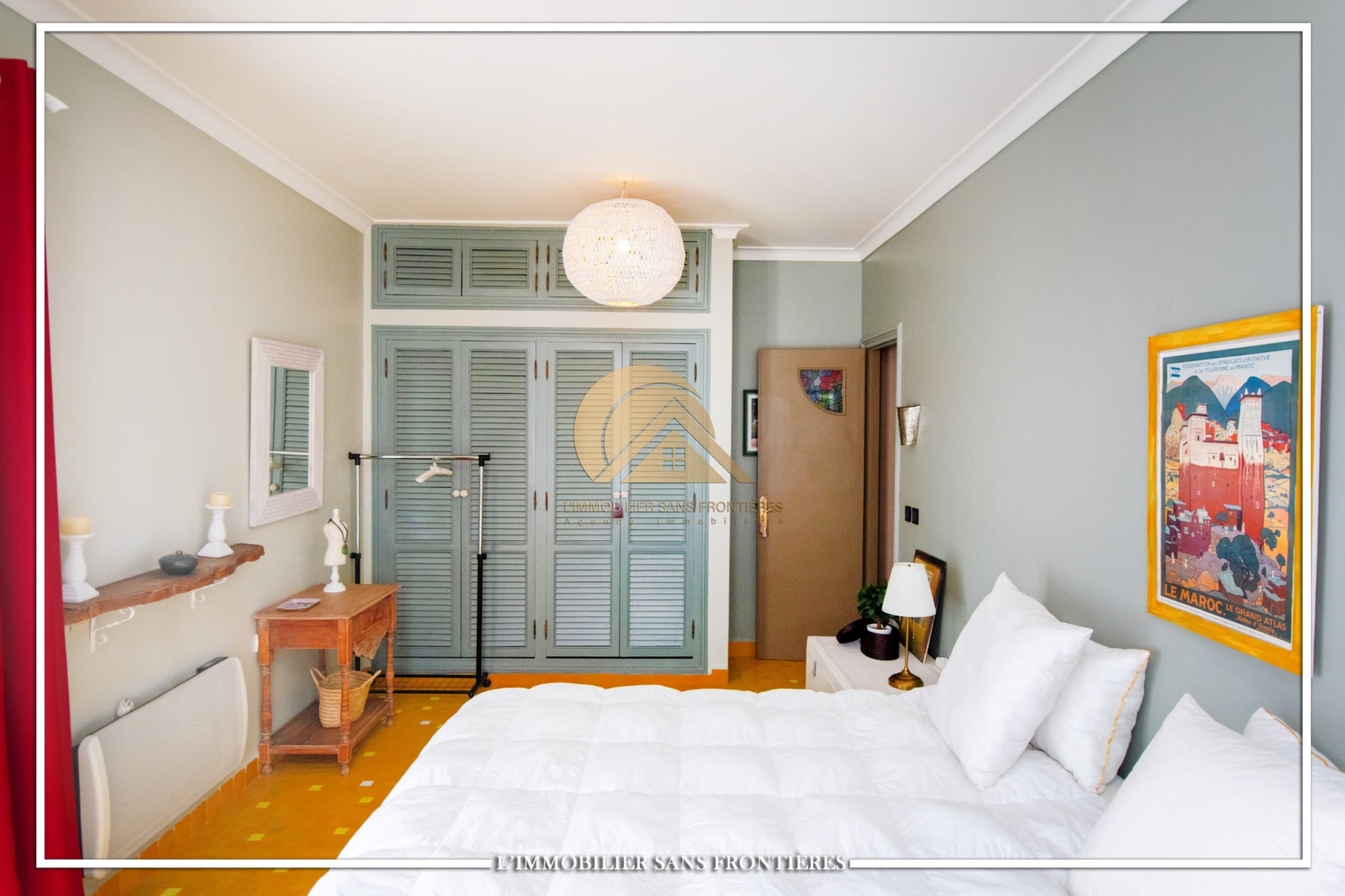 Real Estate Without Borders offers this unfurnished villa for sale in Targa, Marrakech, on a 2300 m² plot. The text mentions a private garden with a SPA (jacuzzi), gym and 3 pergolas, as well as a pool.