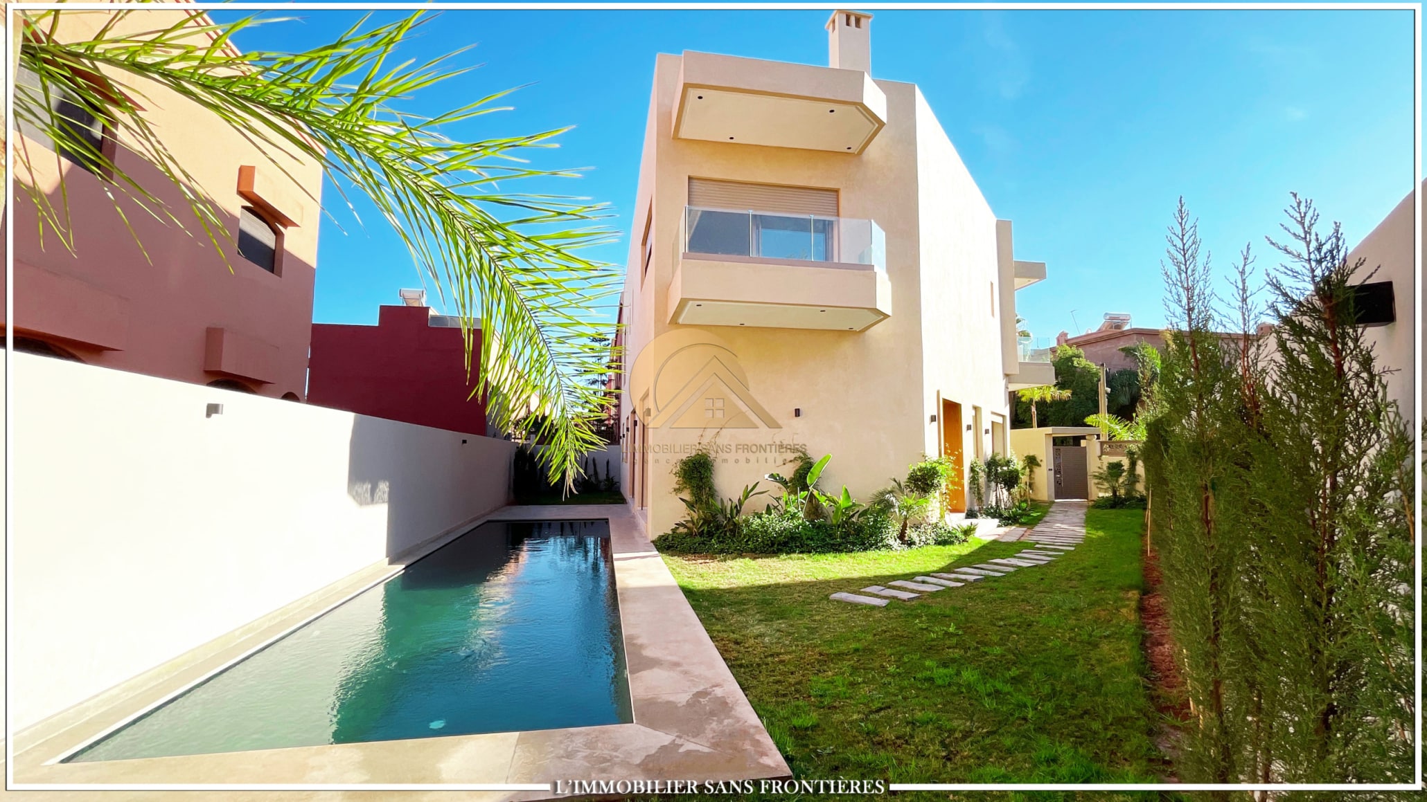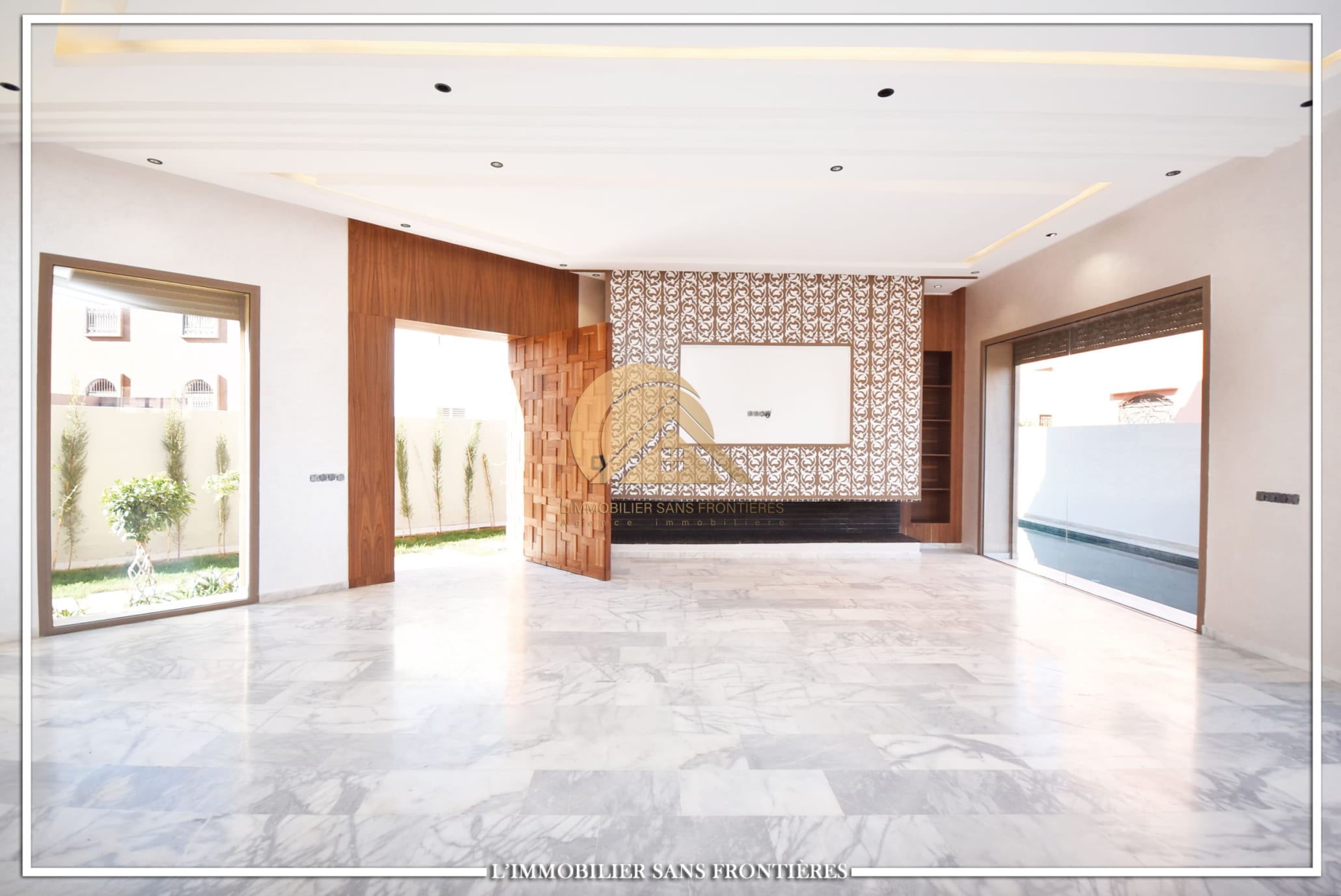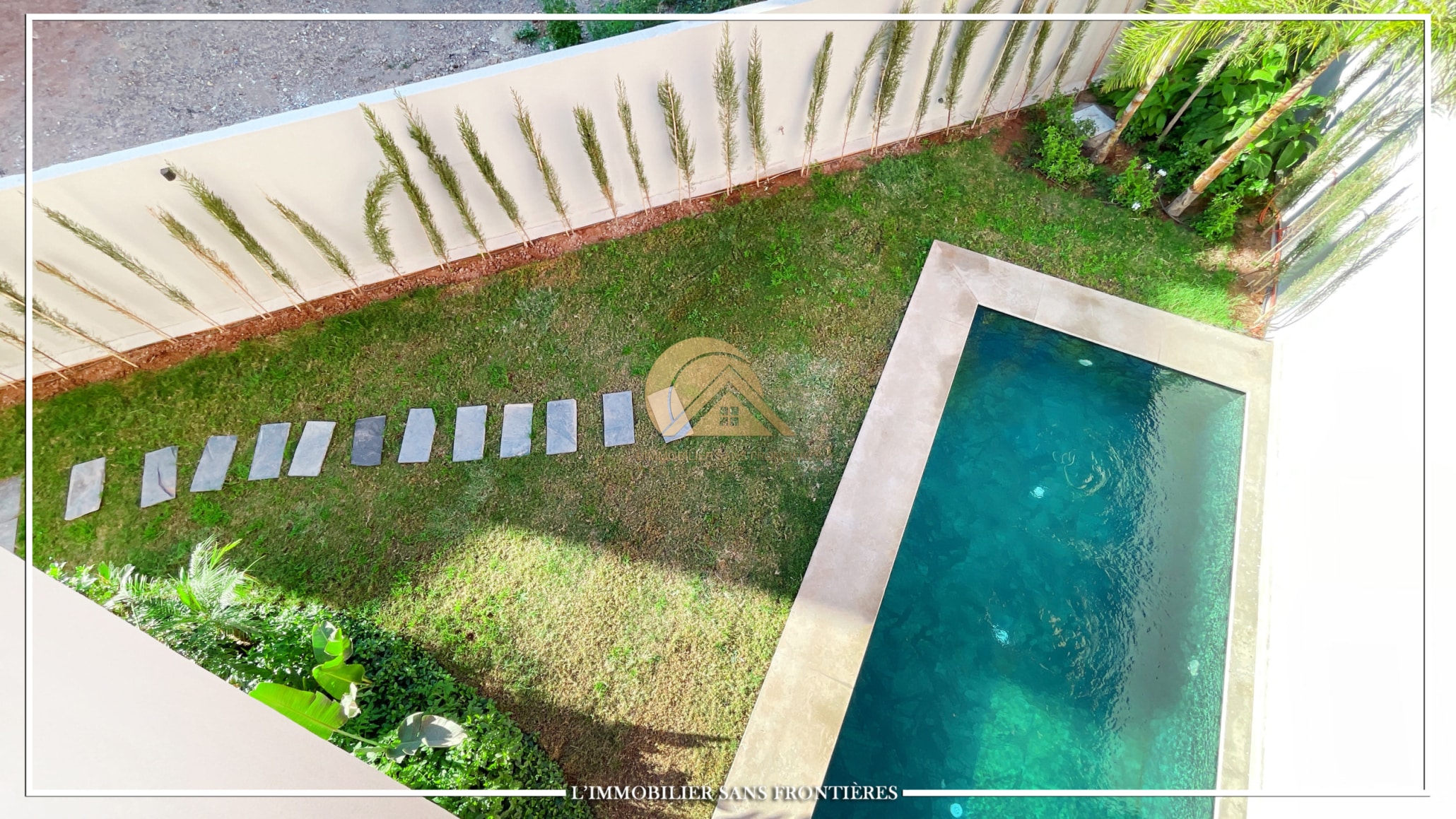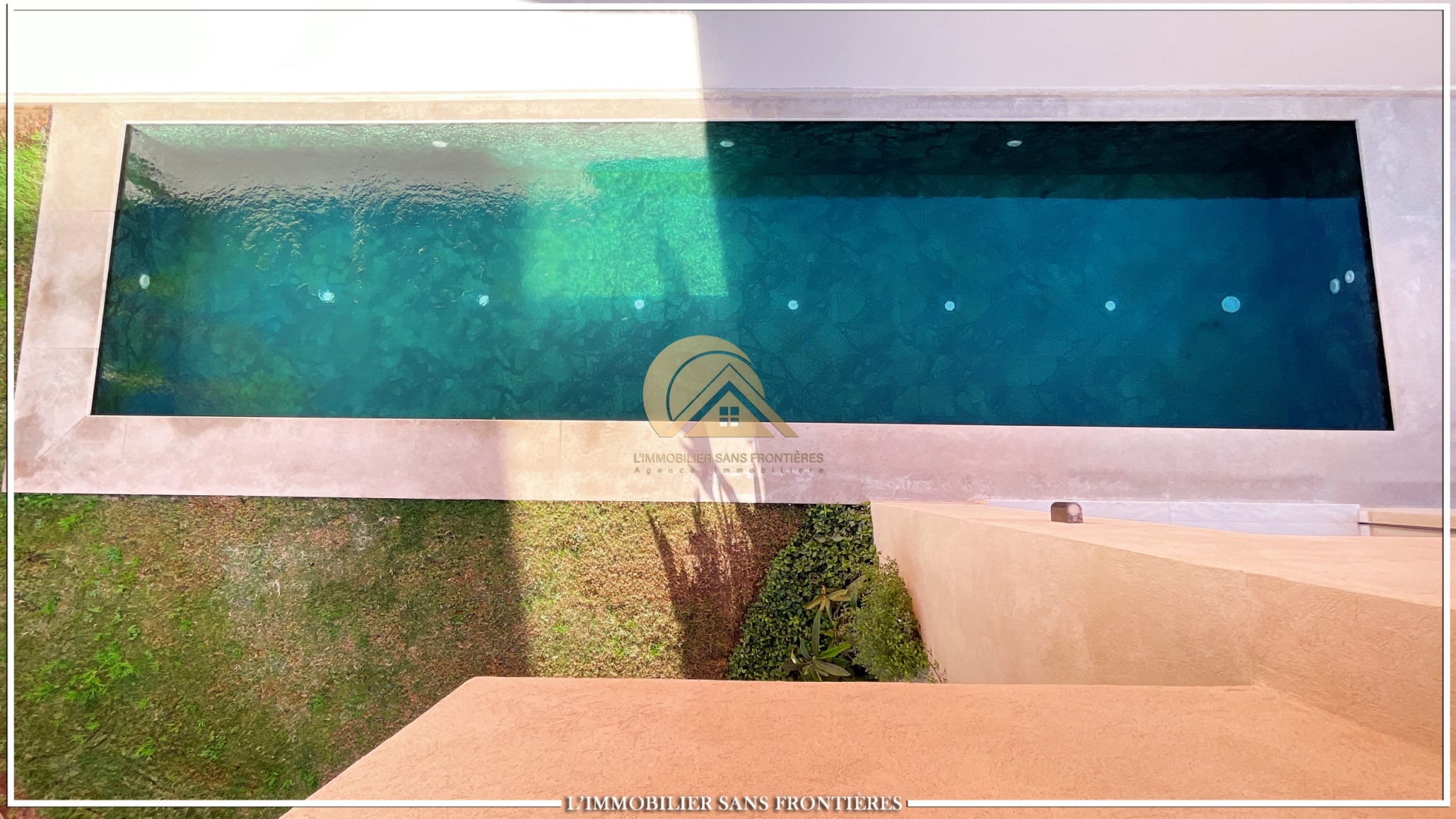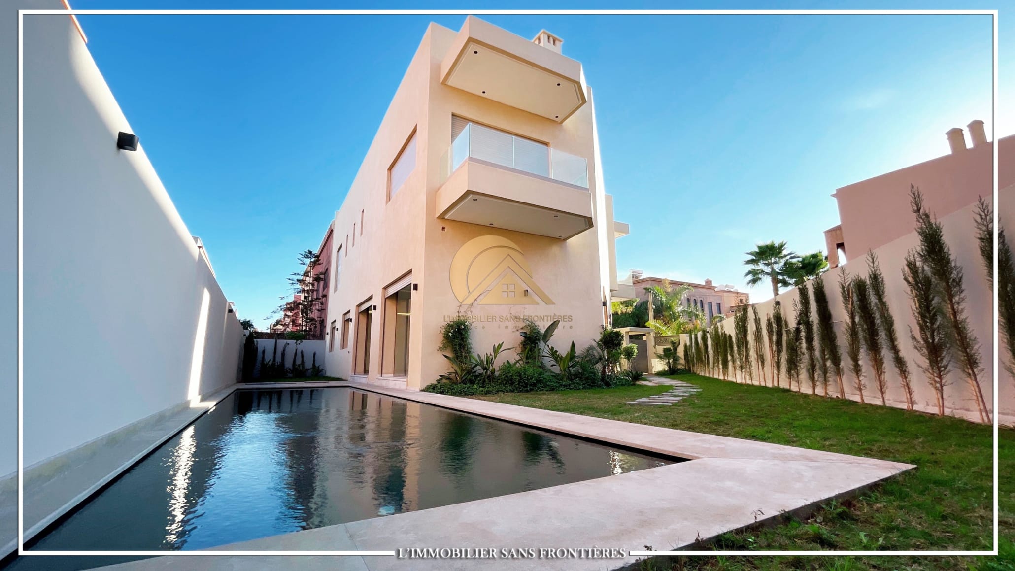 Real Estate Without Borders offers this unfurnished villa for sale in Targa, Marrakech. The text mentions a contemporary villa with three facades, garden and pool, and interiors stated as bright with a bay window. Stated area: 433m².