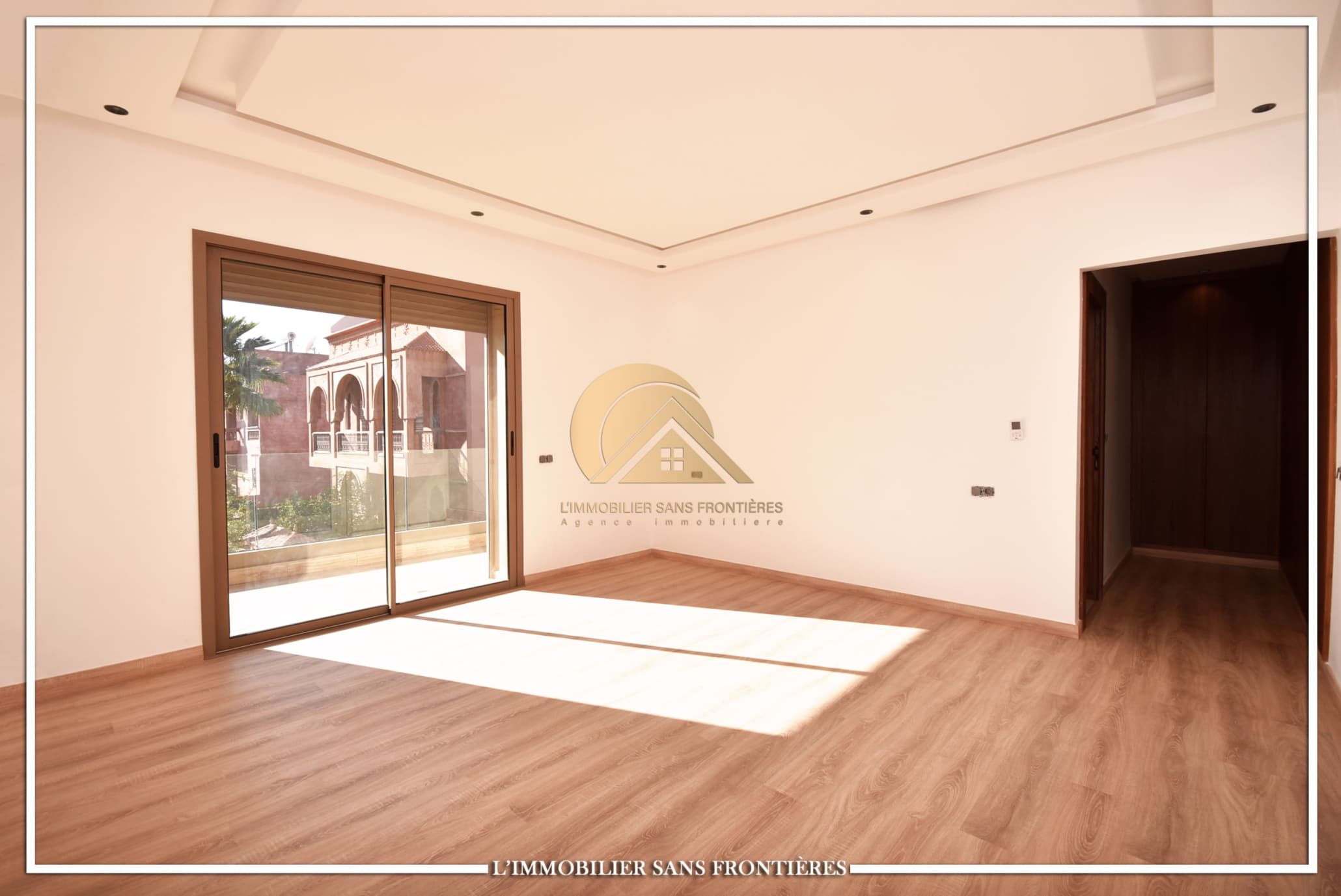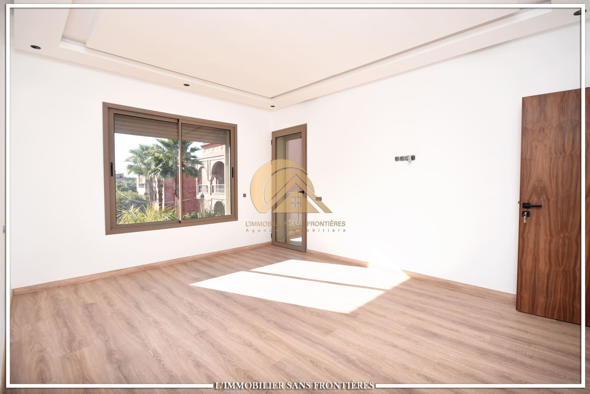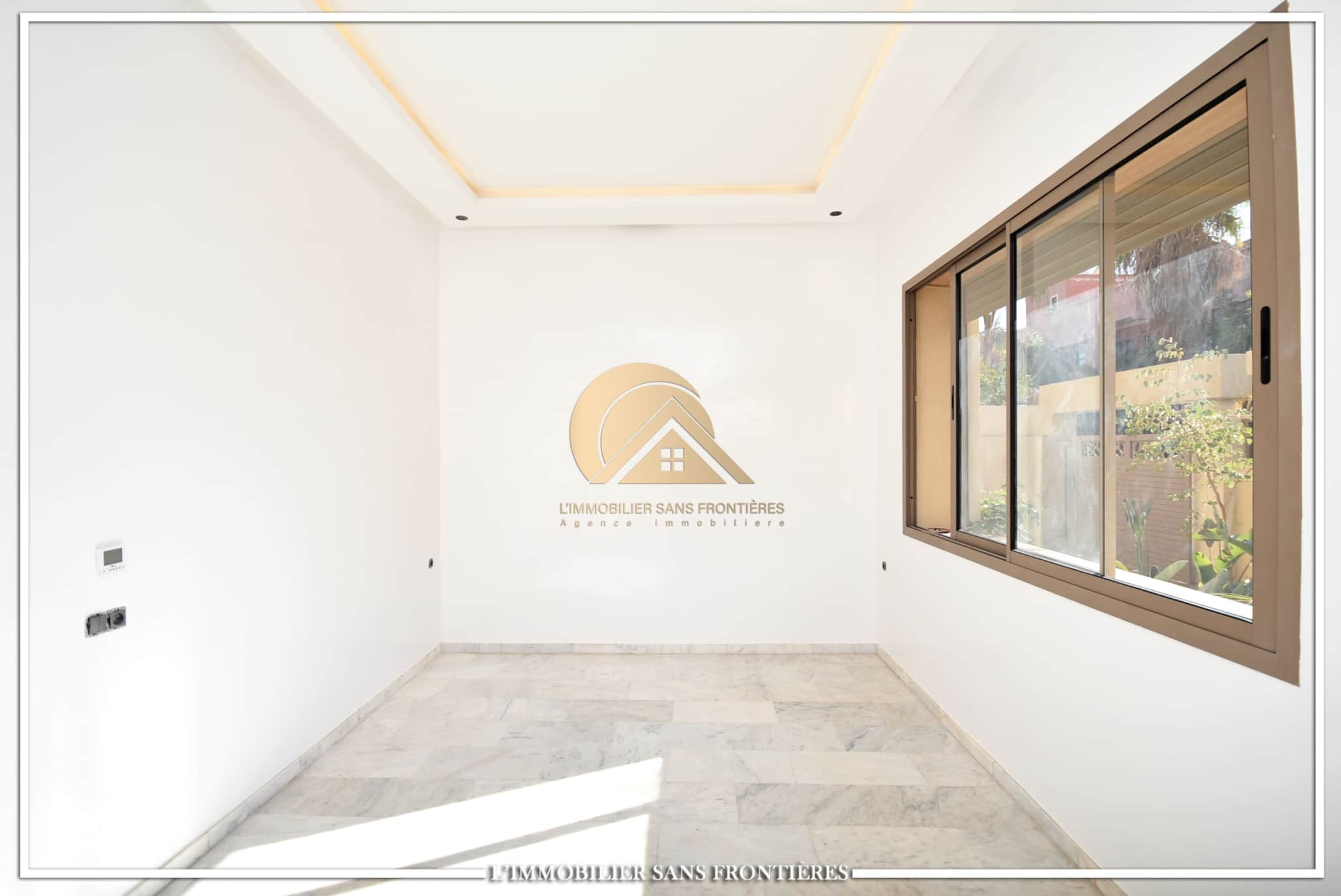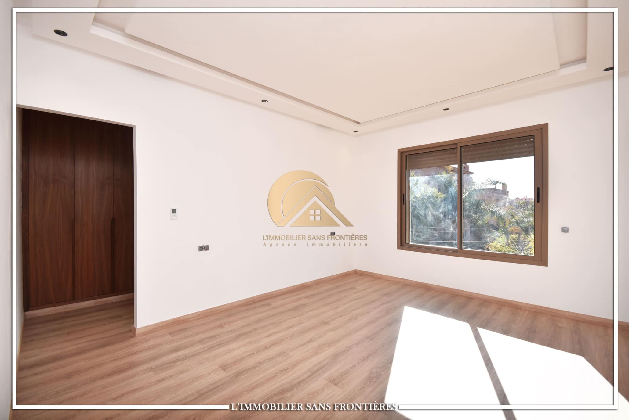 Real Estate Without Borders offers this unfurnished villa for sale in Targa, Marrakech. The text mentions a contemporary villa with three facades, garden and pool, and interiors stated as bright with a bay window. Stated area: 433m².