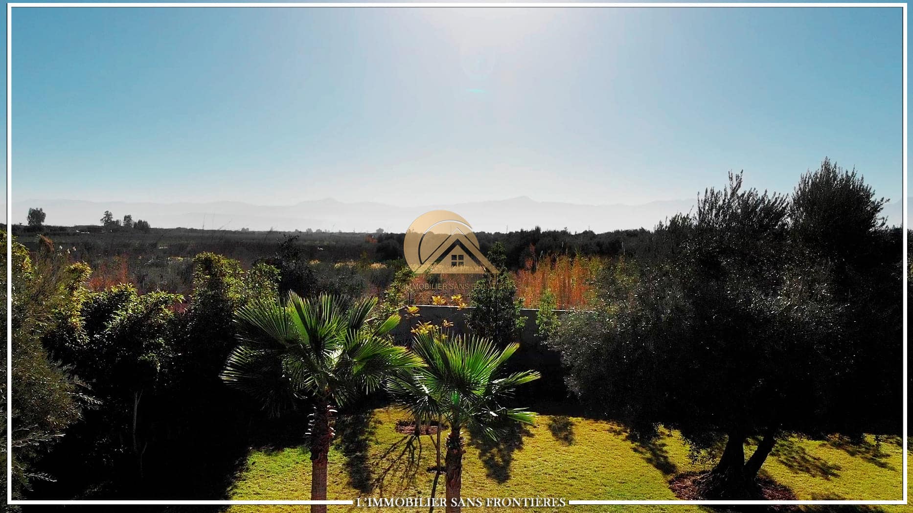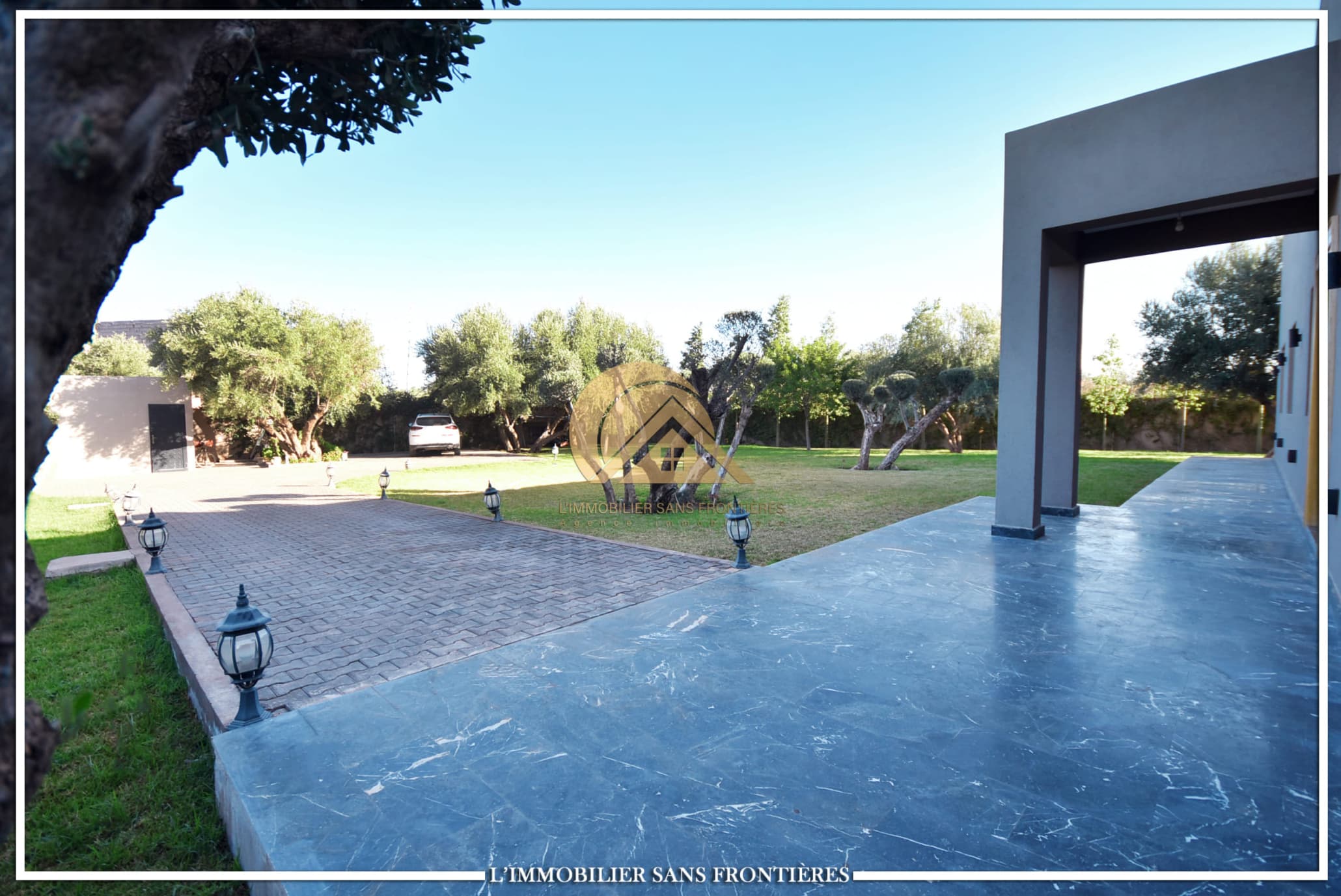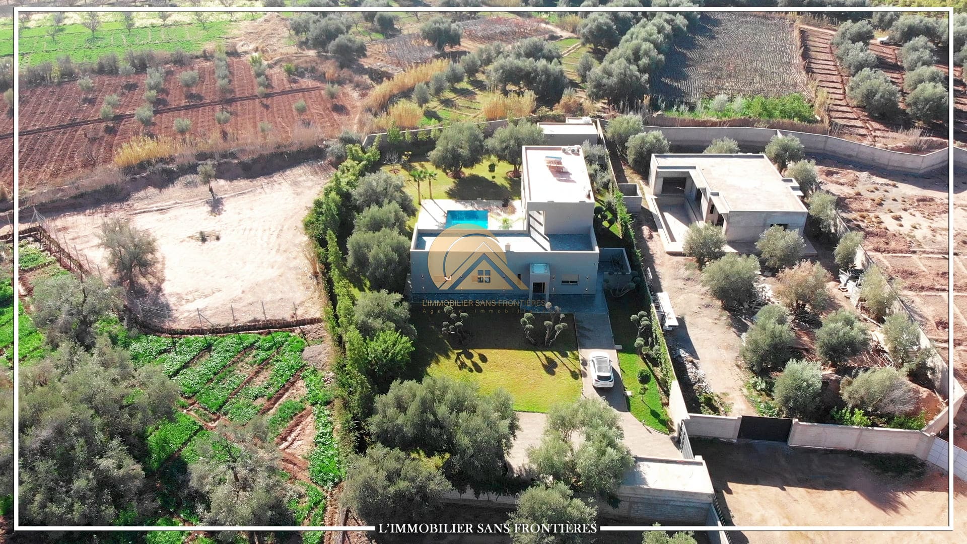 Real Estate Without Borders offers this unfurnished villa for sale 14 km on Route de Fès, Marrakech. The text mentions access via 3.4 km paved road then 400 m track, as well as a pool and a garden.