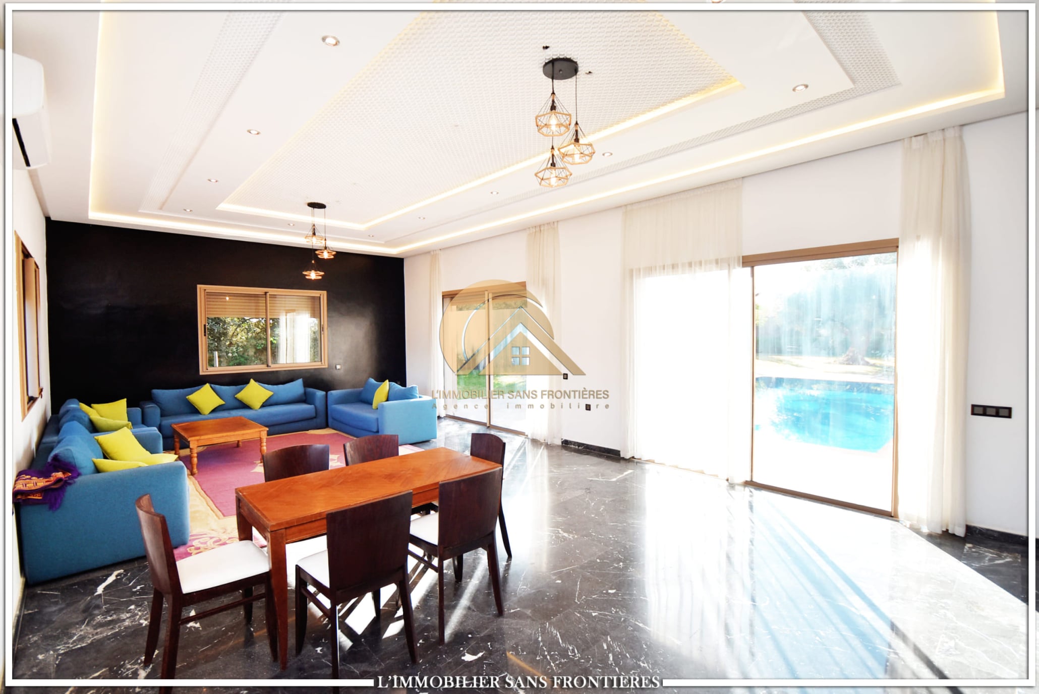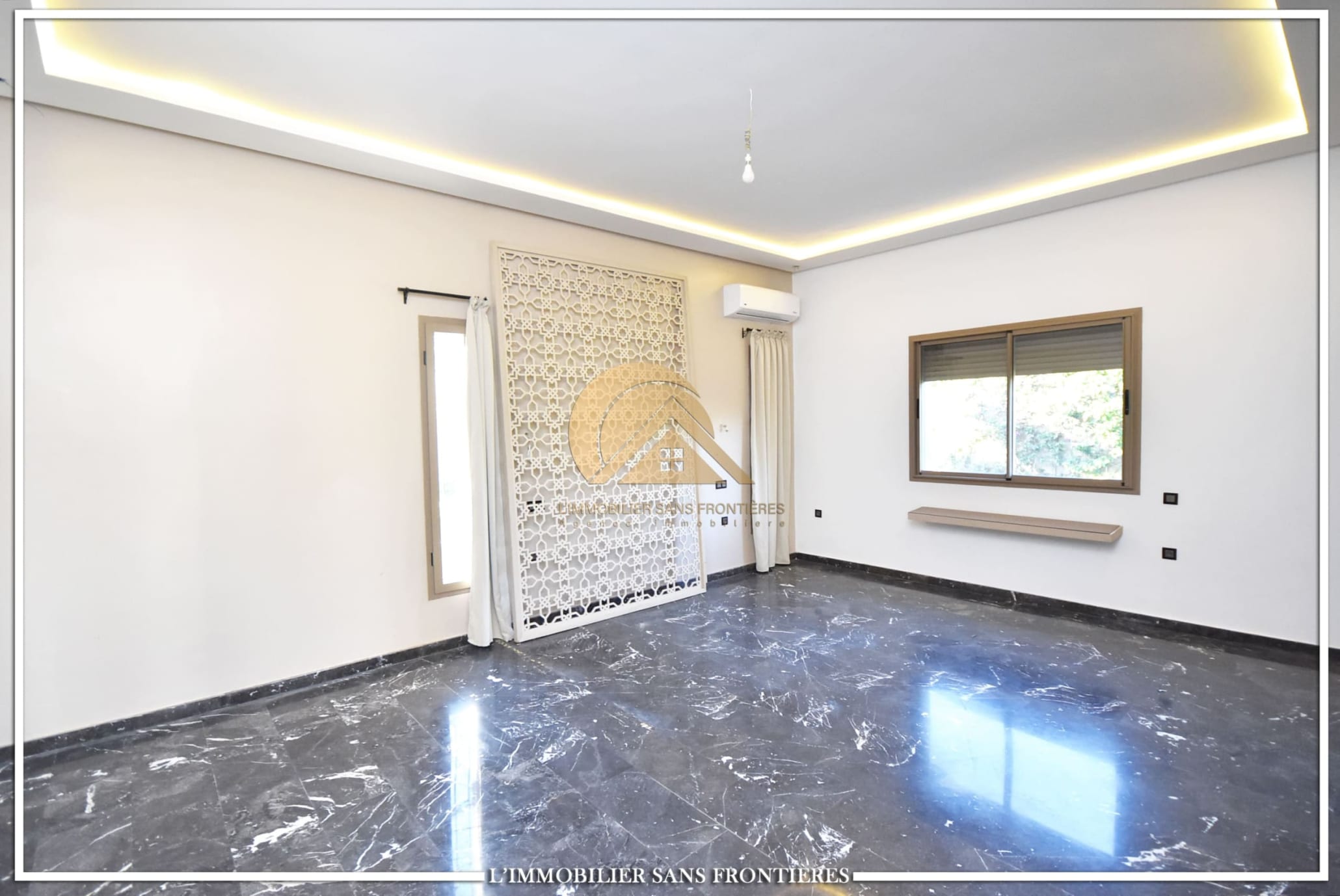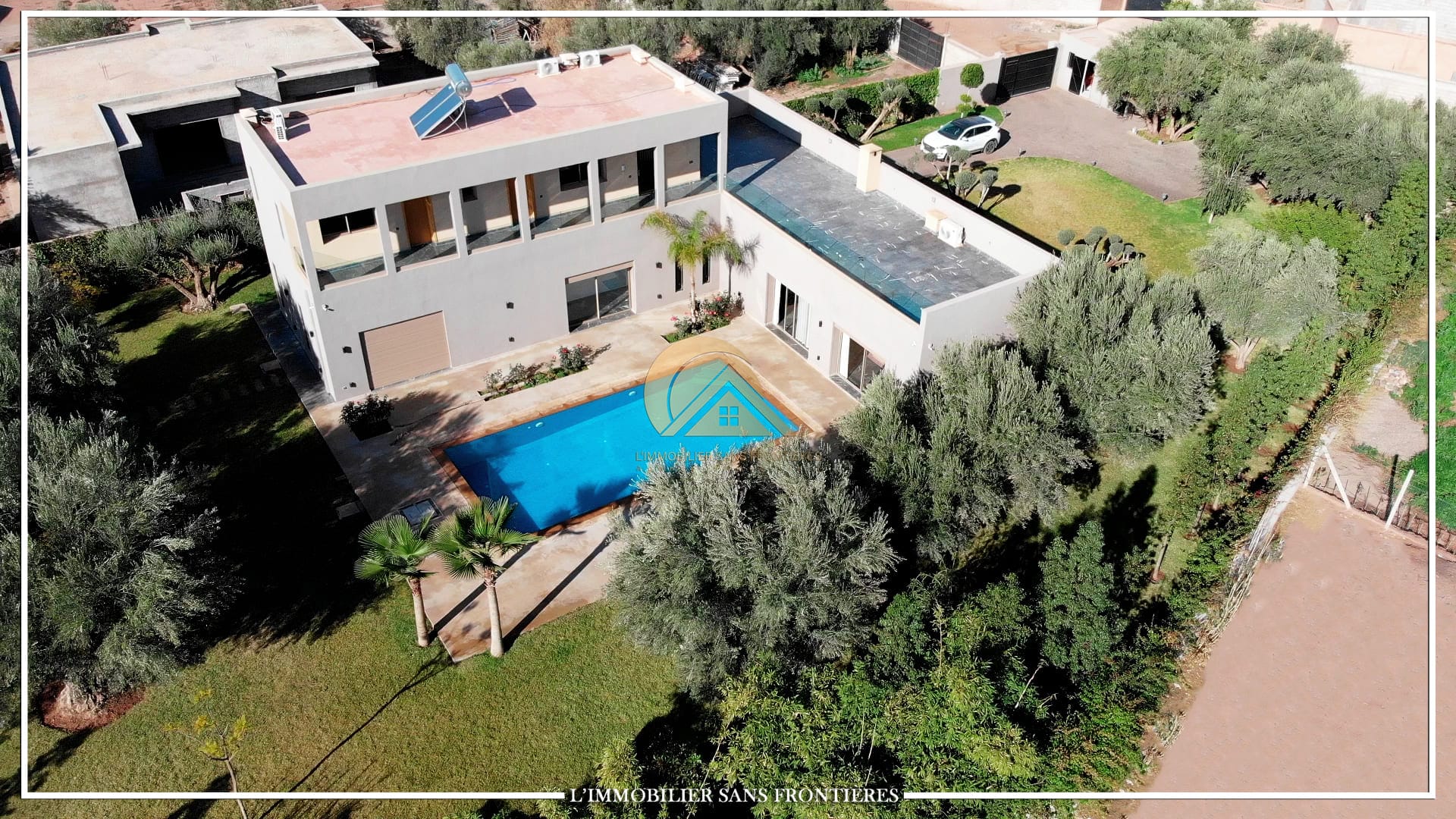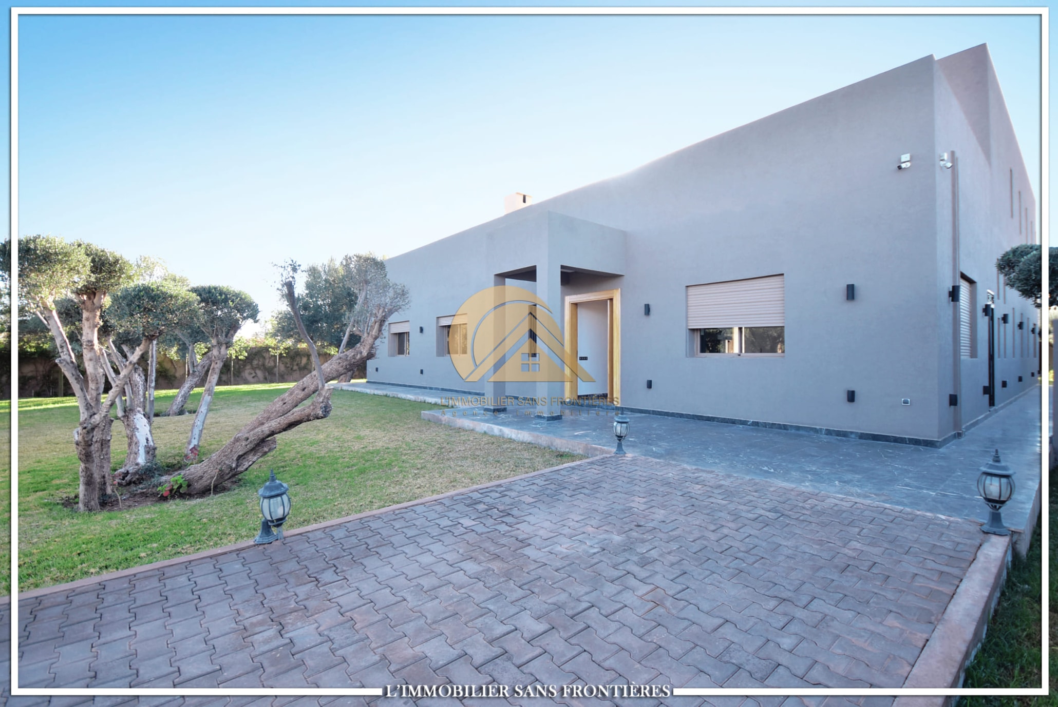 Real Estate Without Borders offers this unfurnished villa for sale 14 km on Route de Fès, Marrakech. The text mentions access via 3.4 km paved road then 400 m track, as well as a pool and a garden.