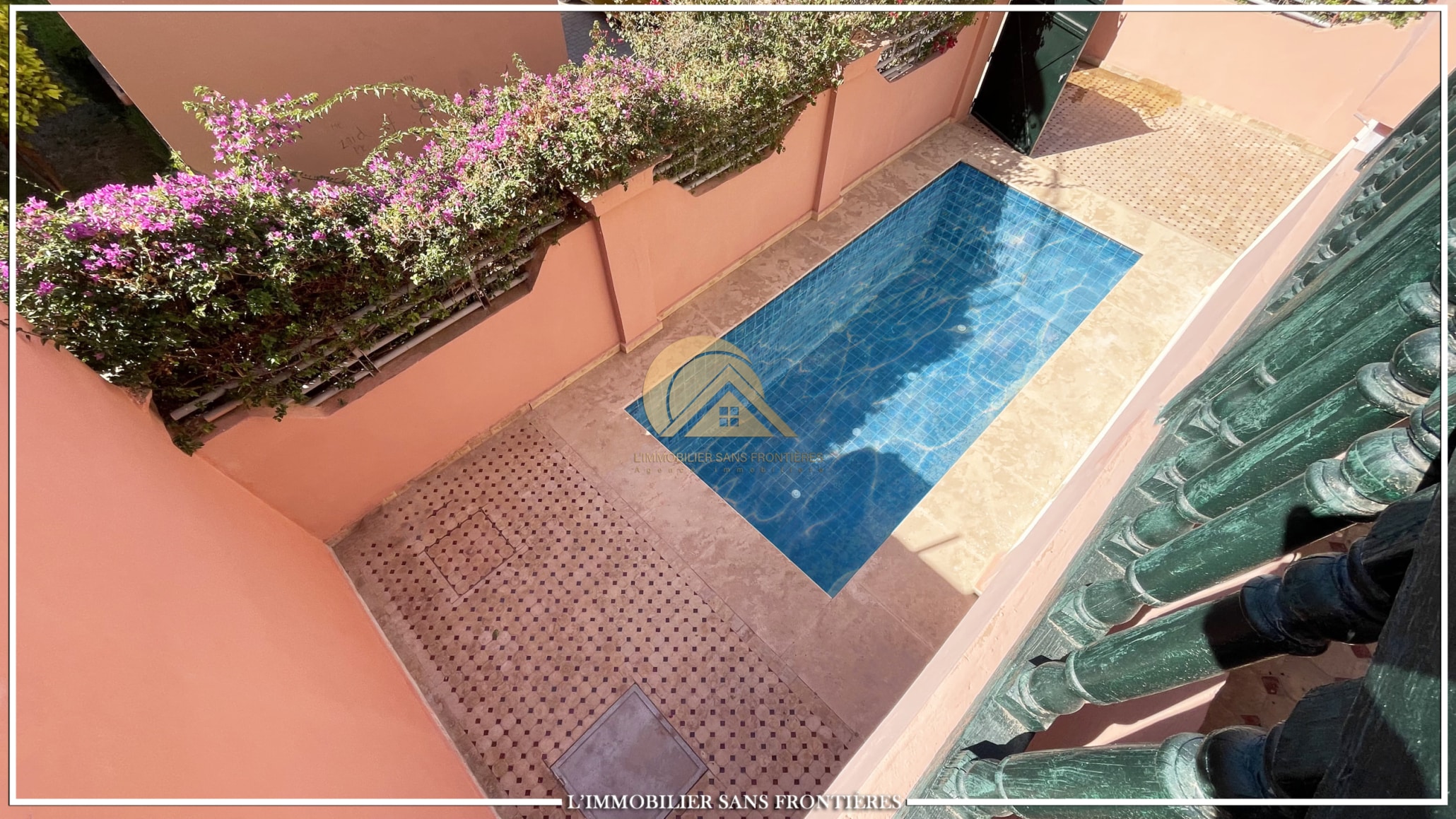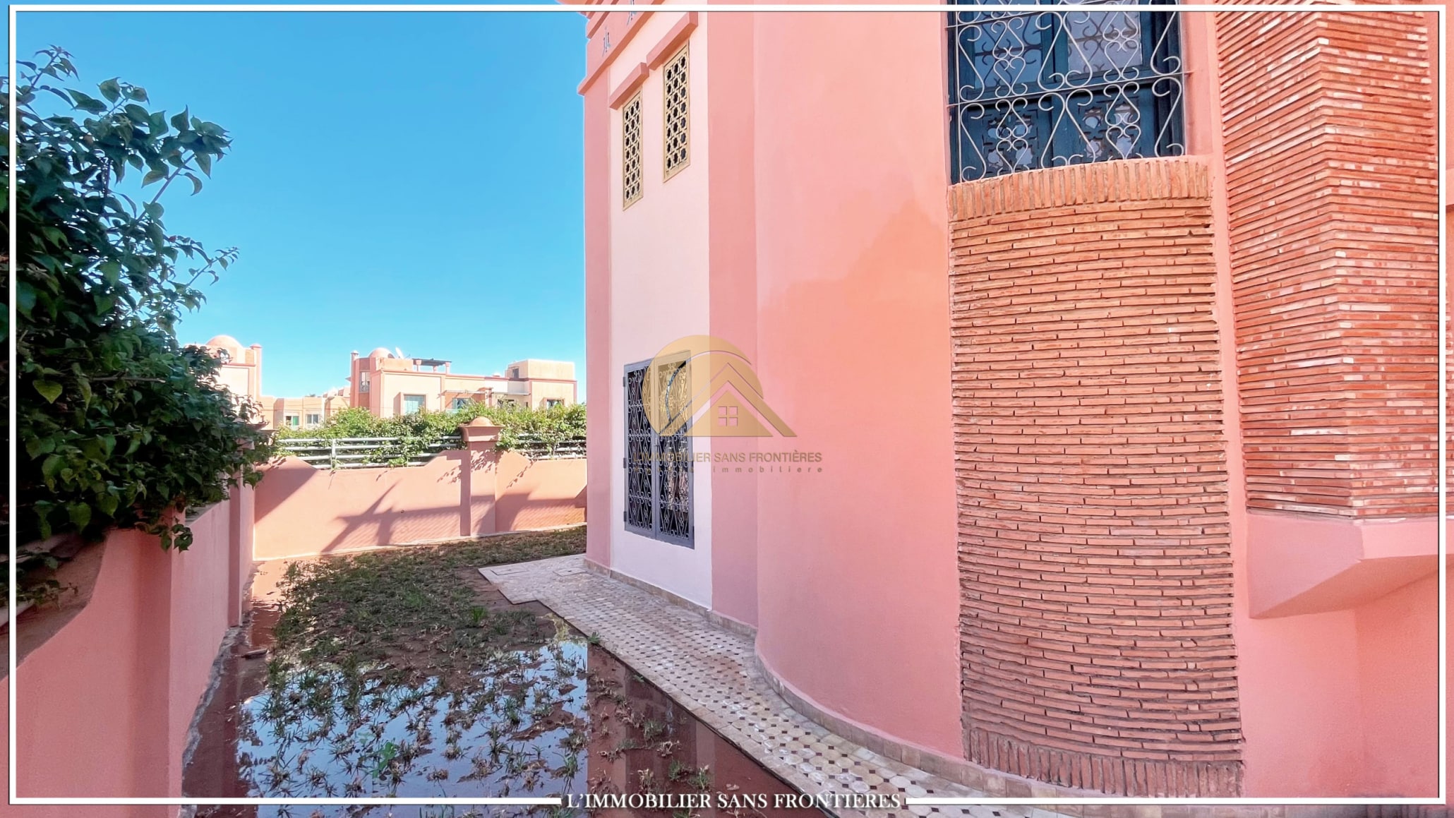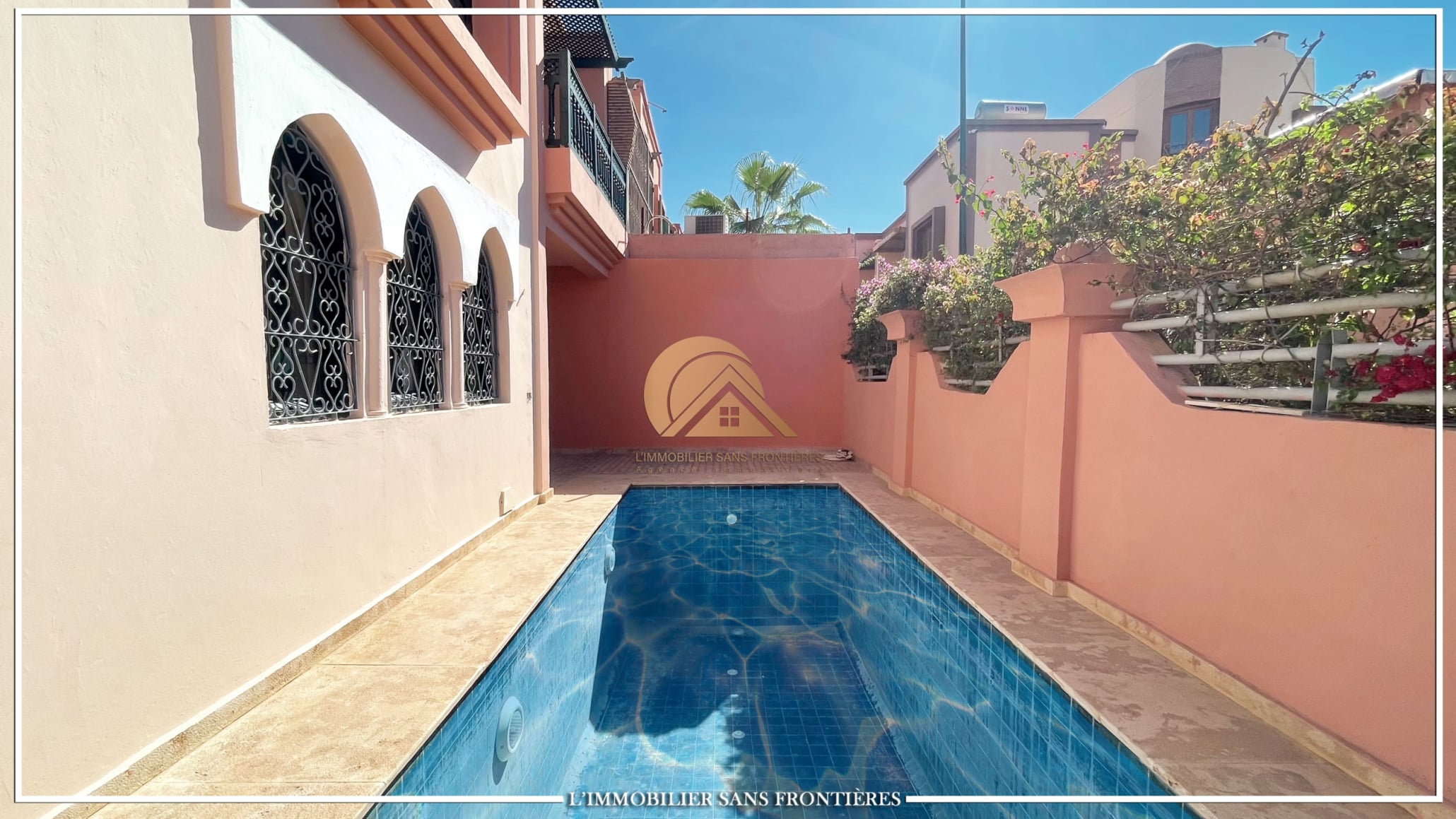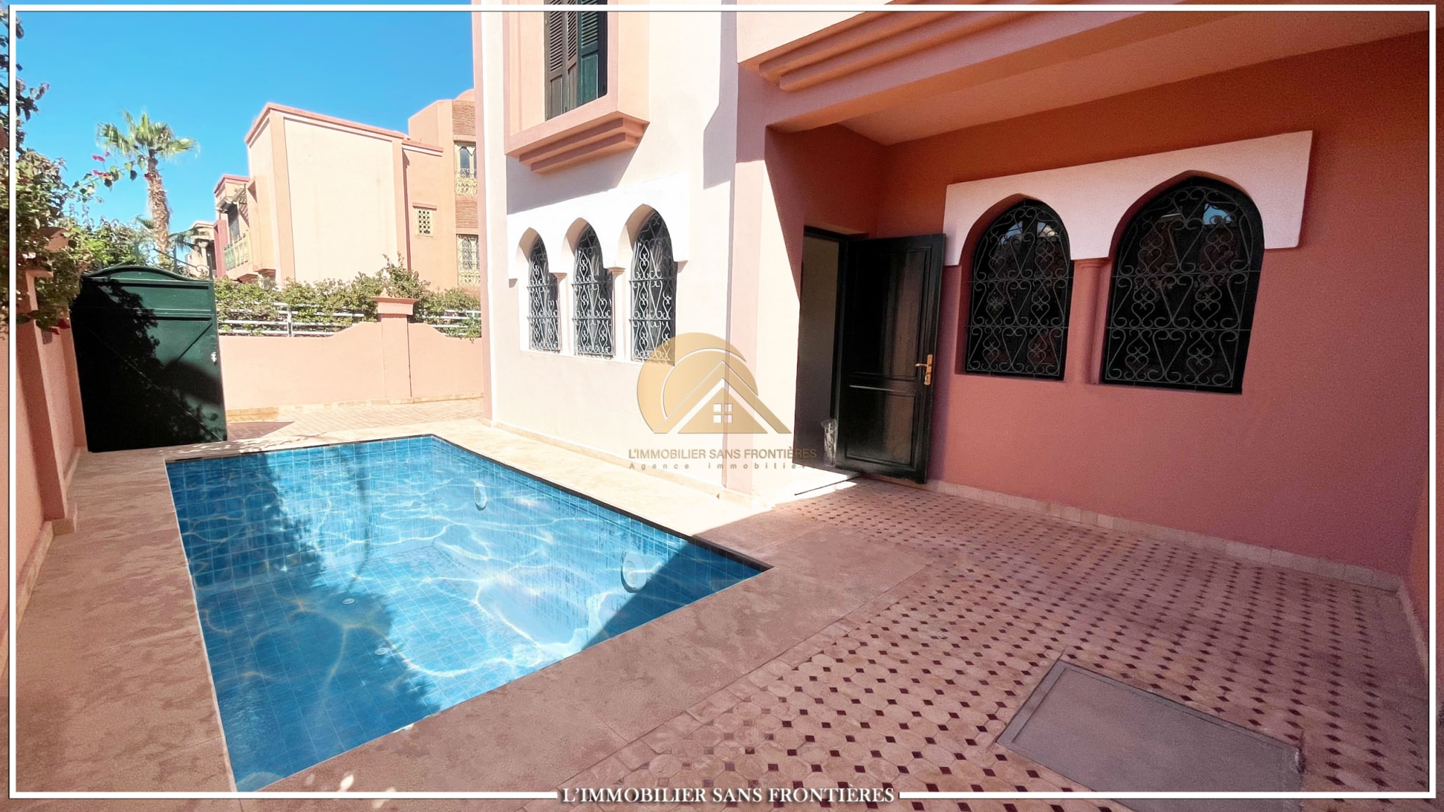 Real Estate Without Borders offers this unfurnished villa for sale in Bab Ighli, Marrakech. The text mentions a well-maintained private garden, a private pool and bright living areas with stated marble flooring.