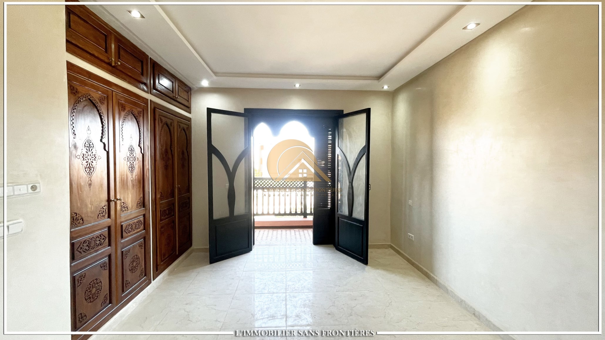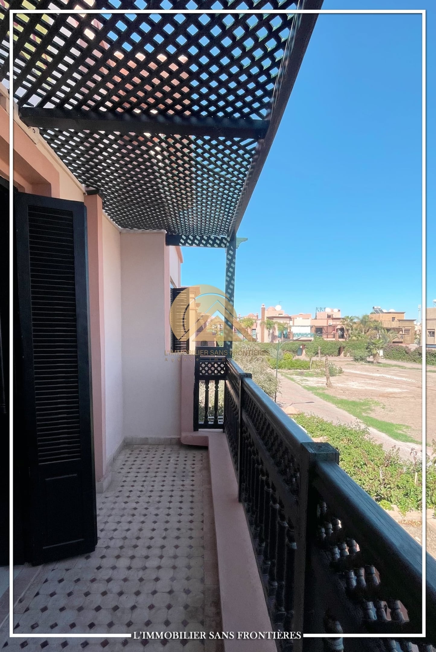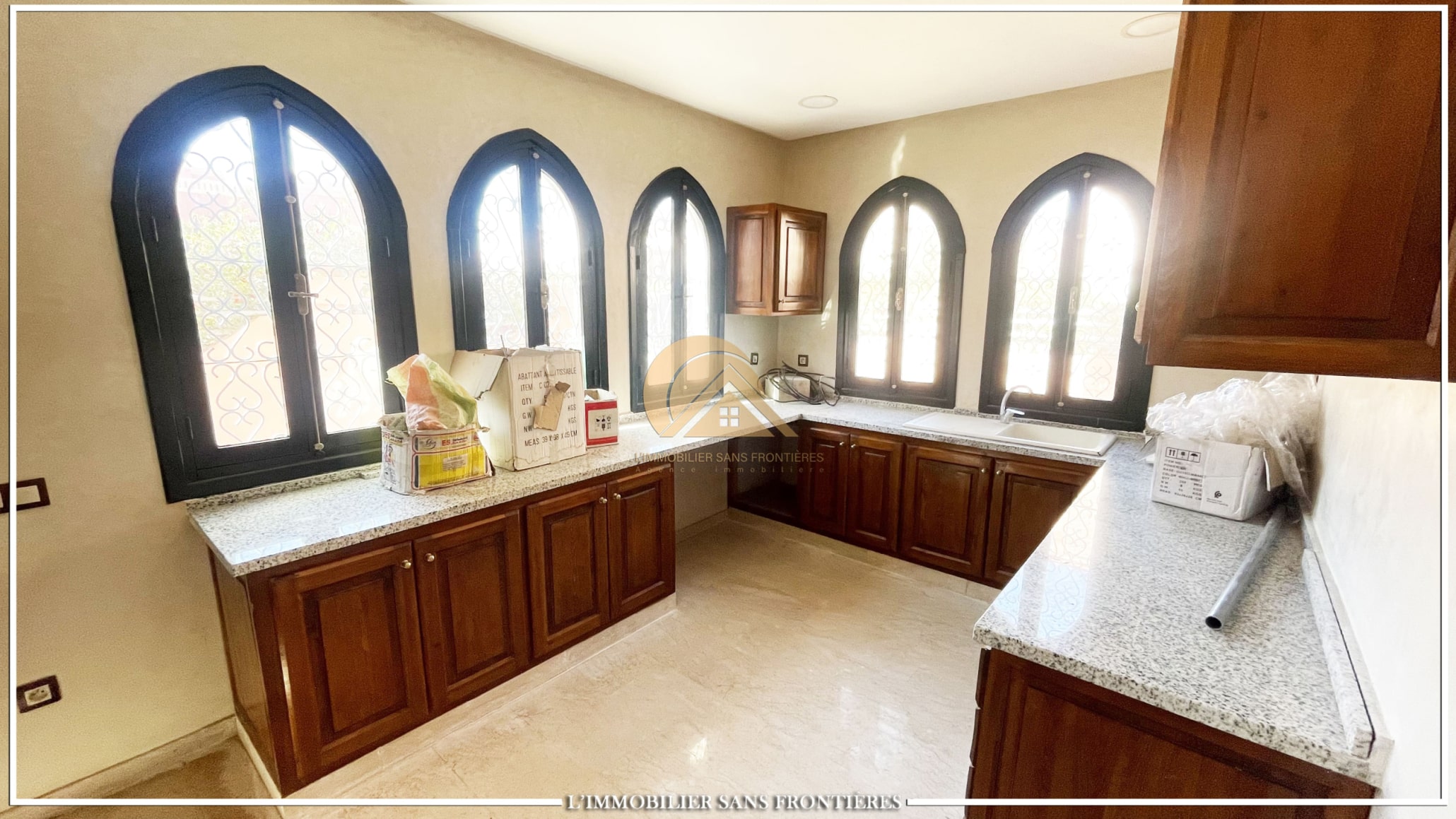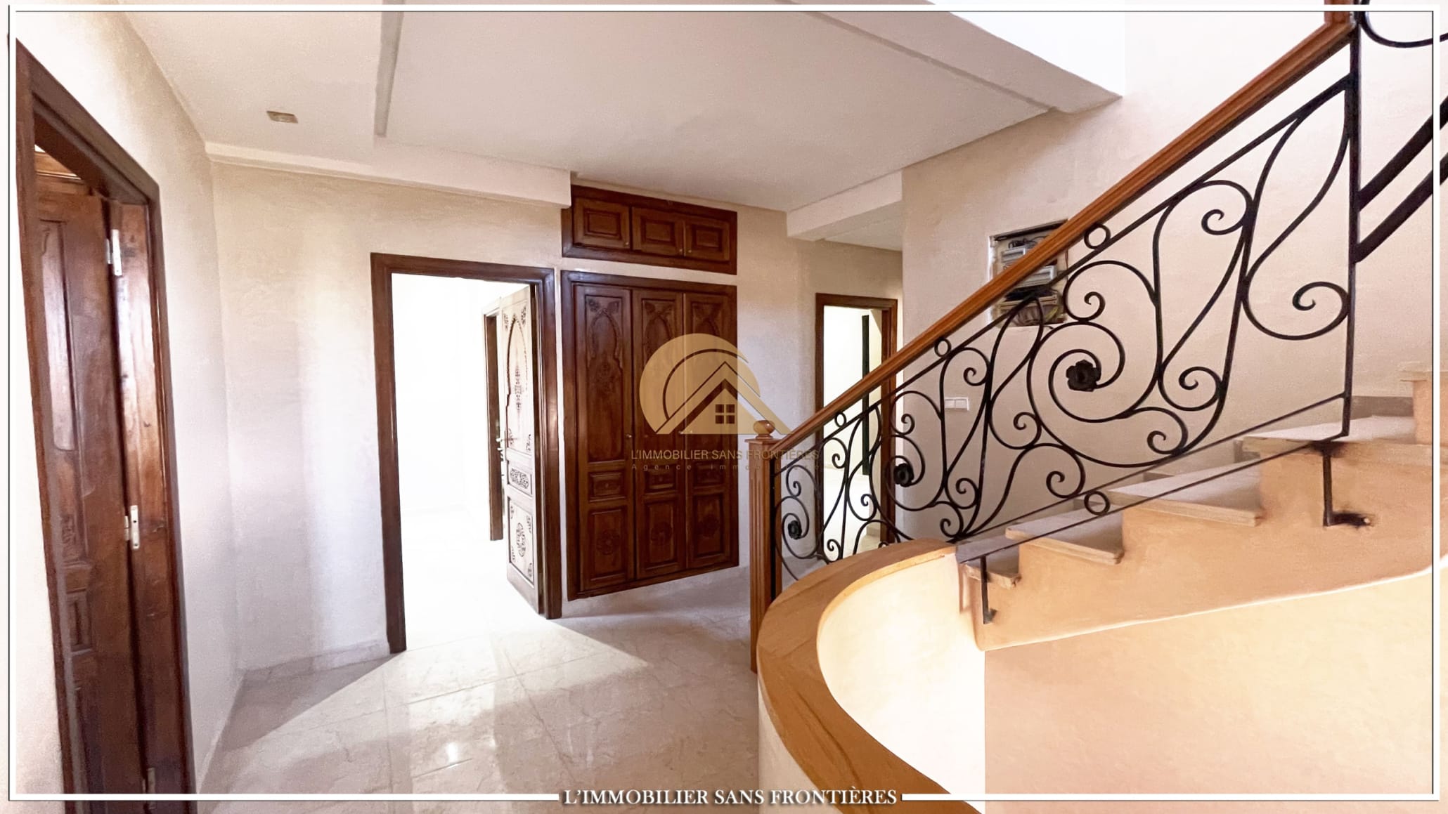 Real Estate Without Borders offers this unfurnished villa for sale in Bab Ighli, Marrakech. The text mentions a well-maintained private garden, a private pool and bright living areas with stated marble flooring.