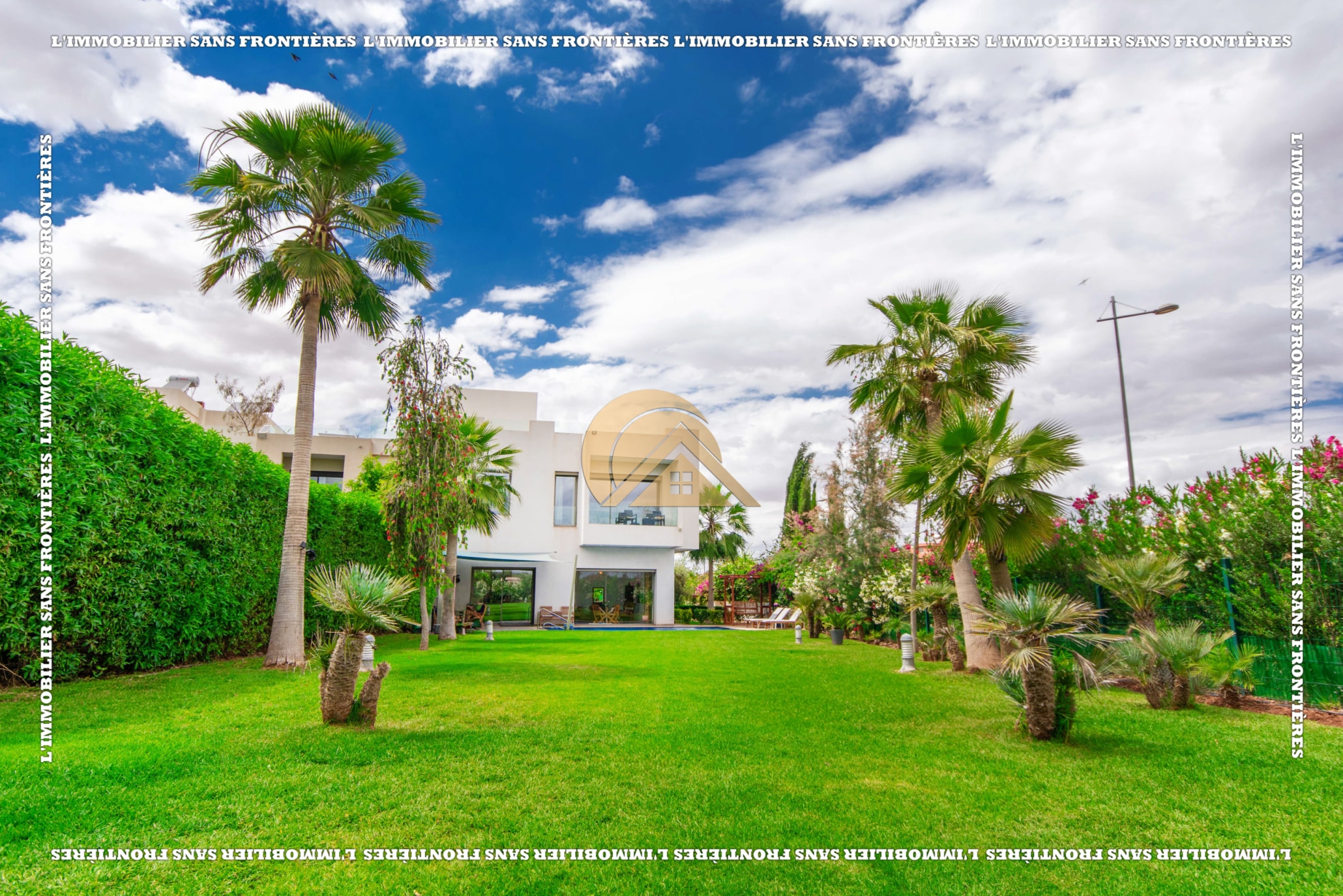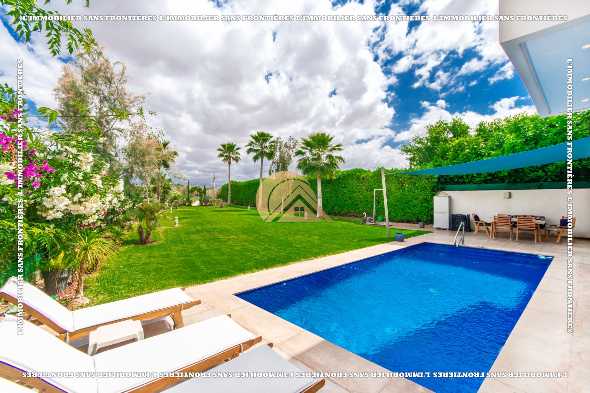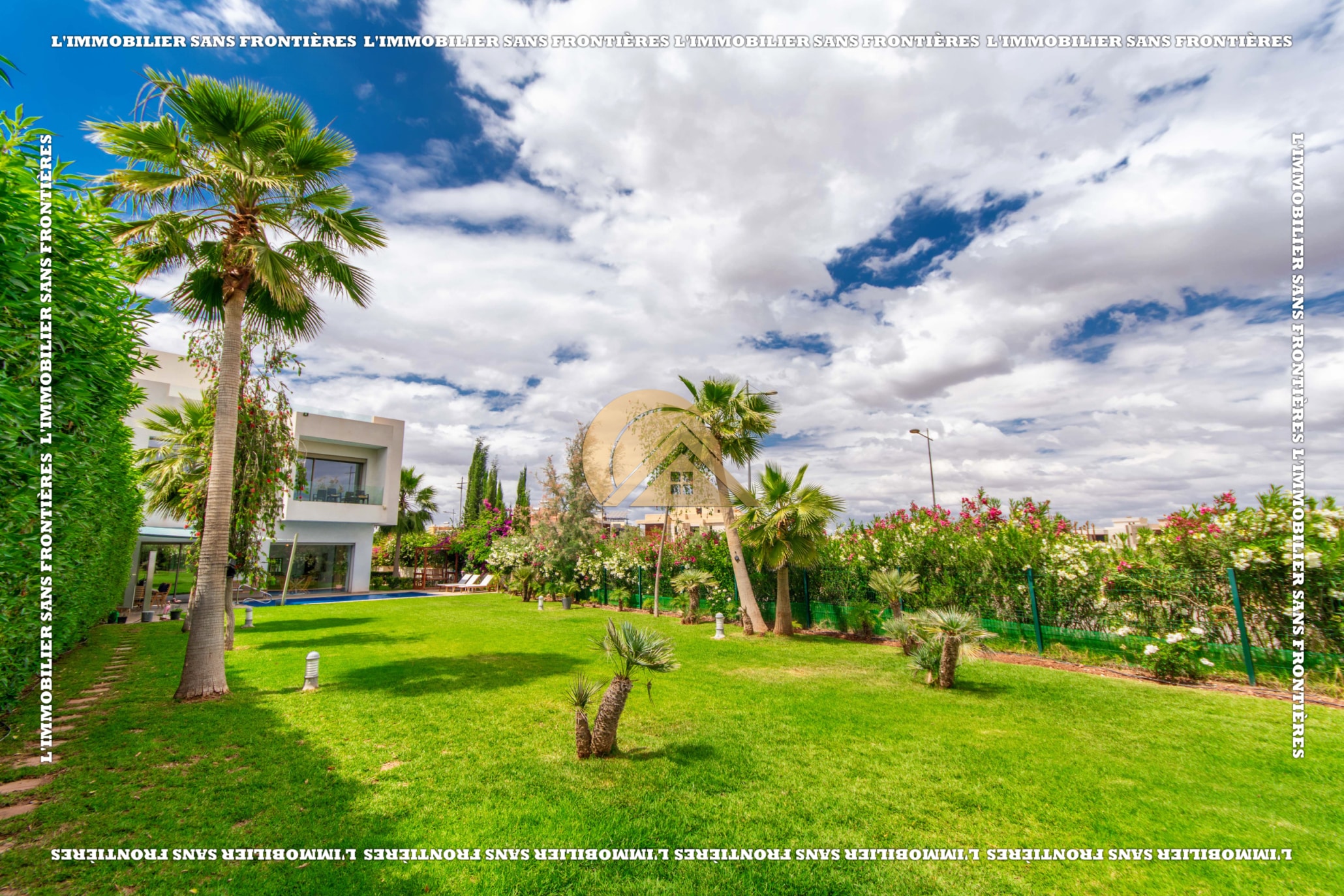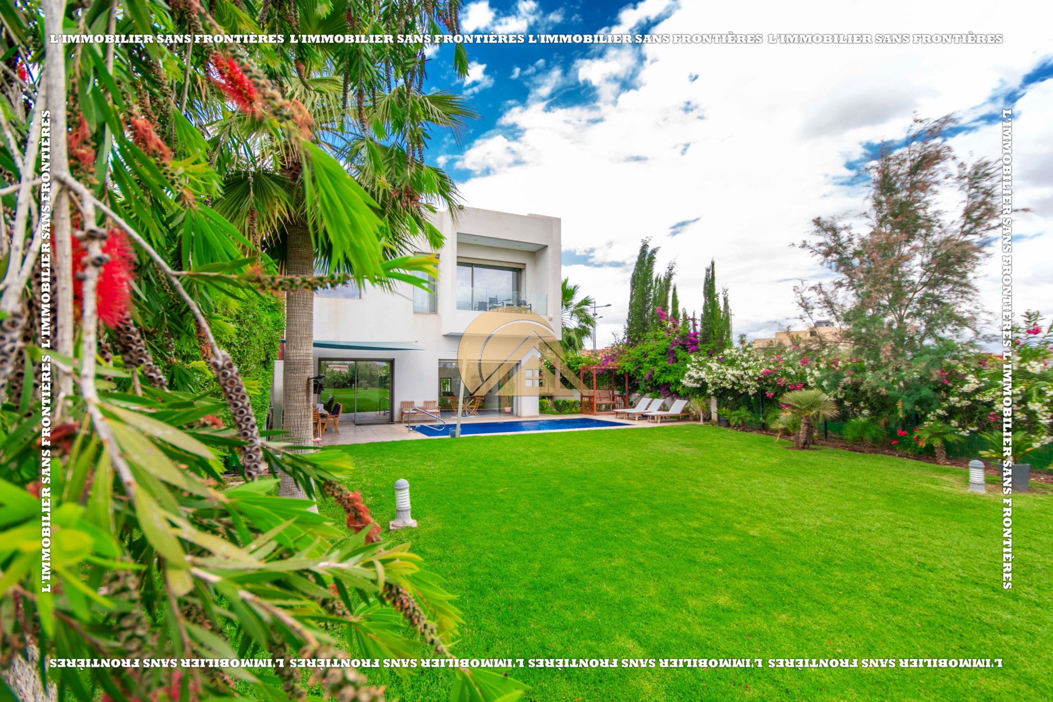 Real Estate Without Borders offers this unfurnished villa for rent in Golf Argan, on Route de Tahanaout in Marrakech. The villa is described in a peaceful setting, with landscaped garden, private pool and a cascade. Stated sizes: land 450 m² and 800 m² living area.