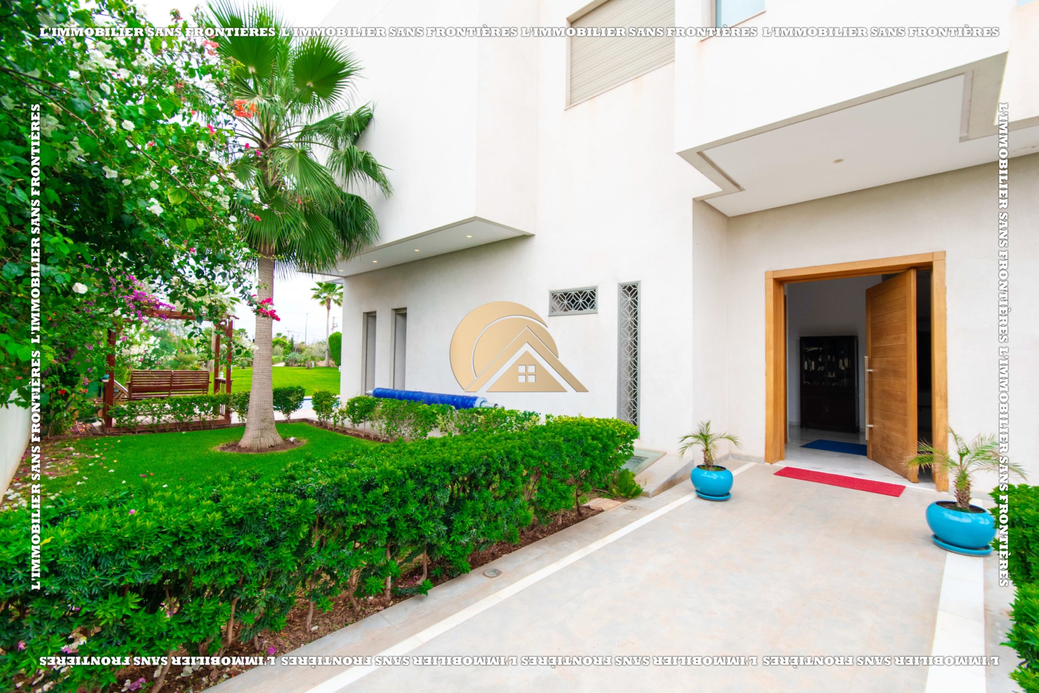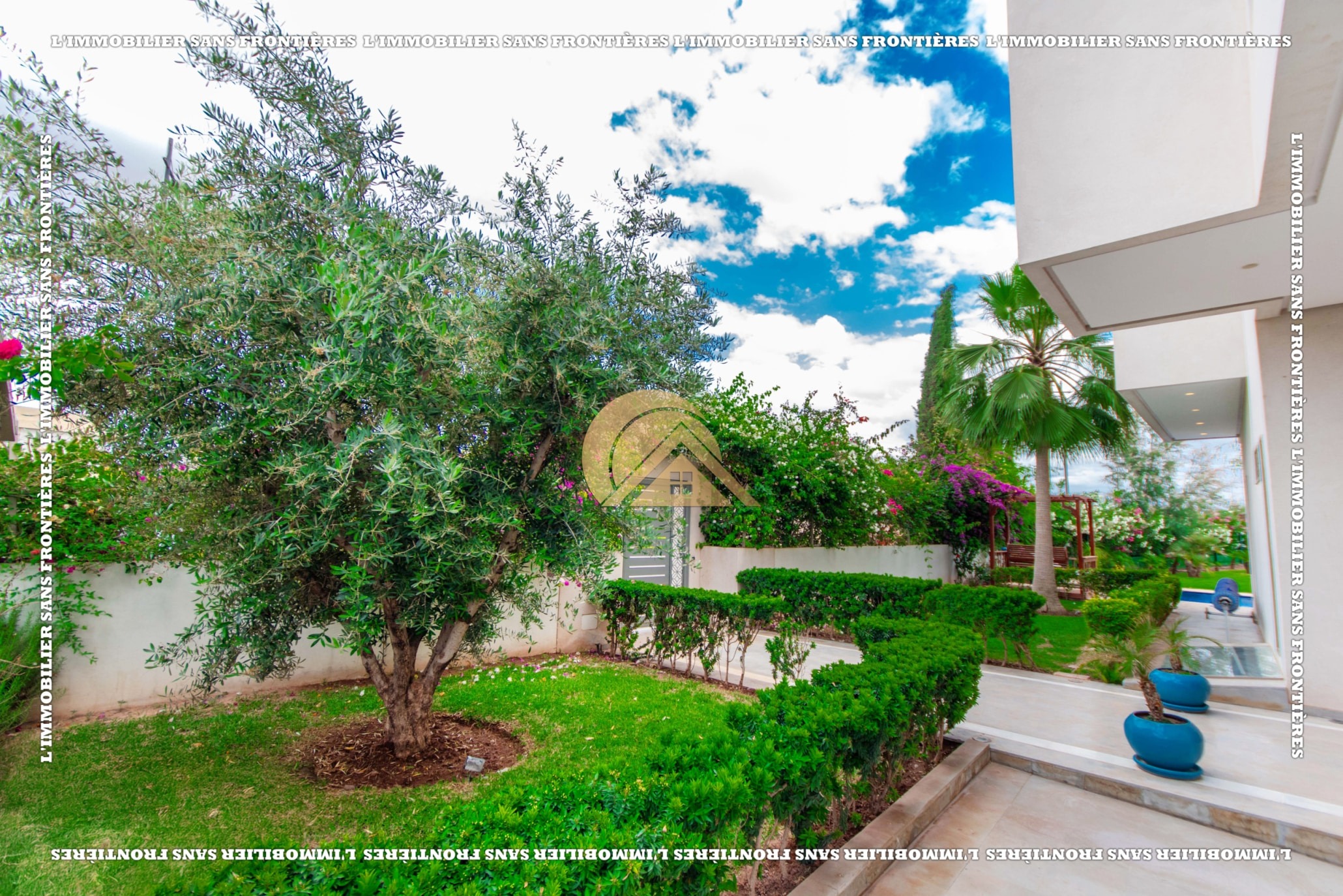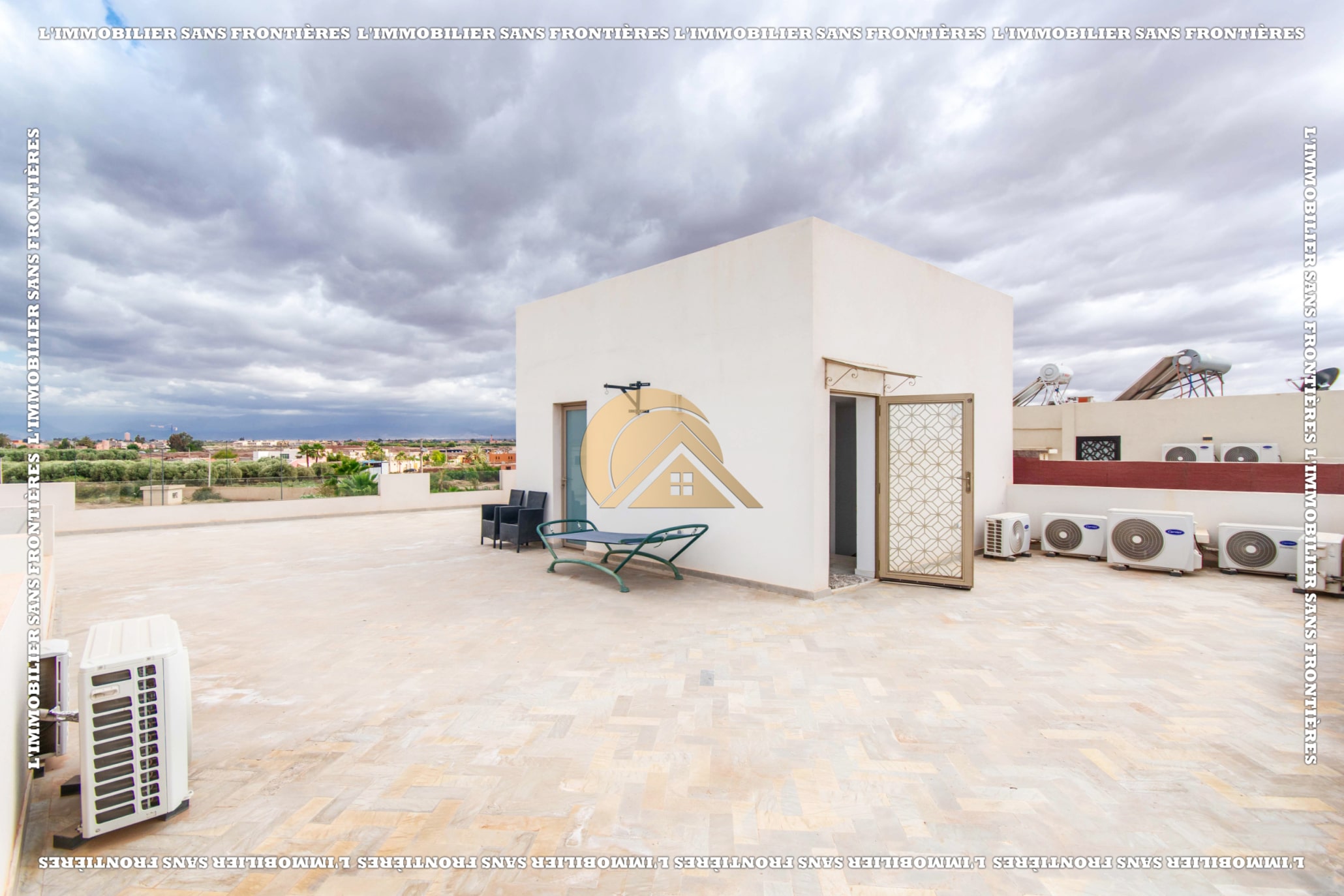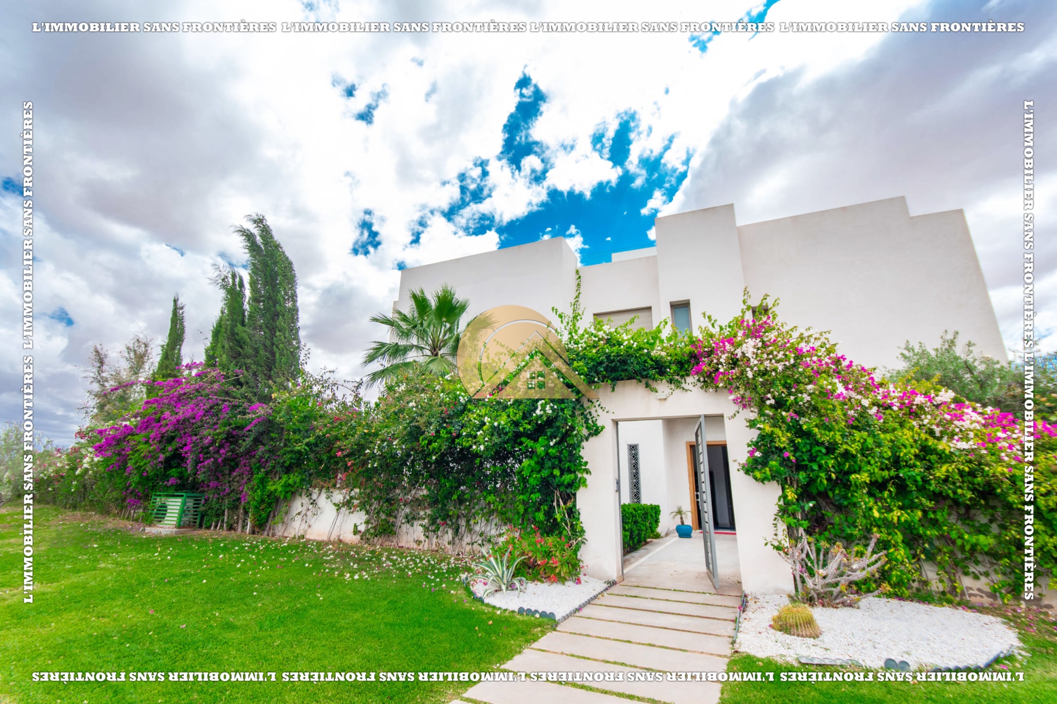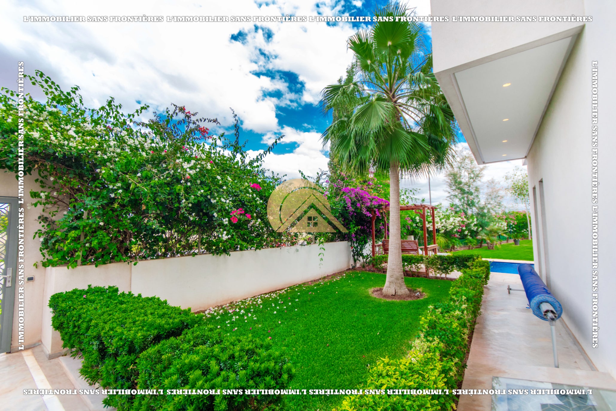 Real Estate Without Borders offers this unfurnished villa for rent in Golf Argan, on Route de Tahanaout in Marrakech. The villa is described in a peaceful setting, with landscaped garden, private pool and a cascade. Stated sizes: land 450 m² and 800 m² living area.