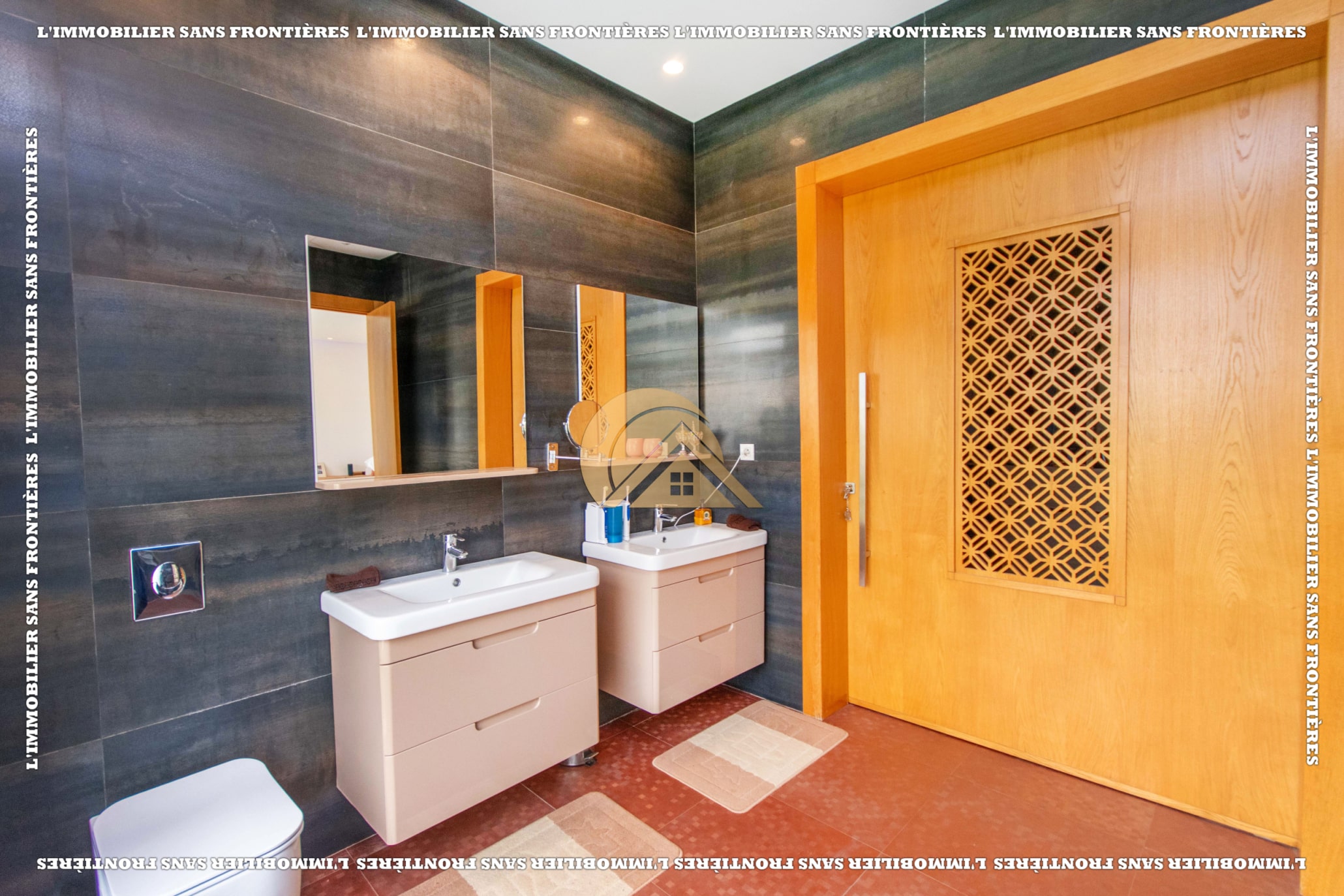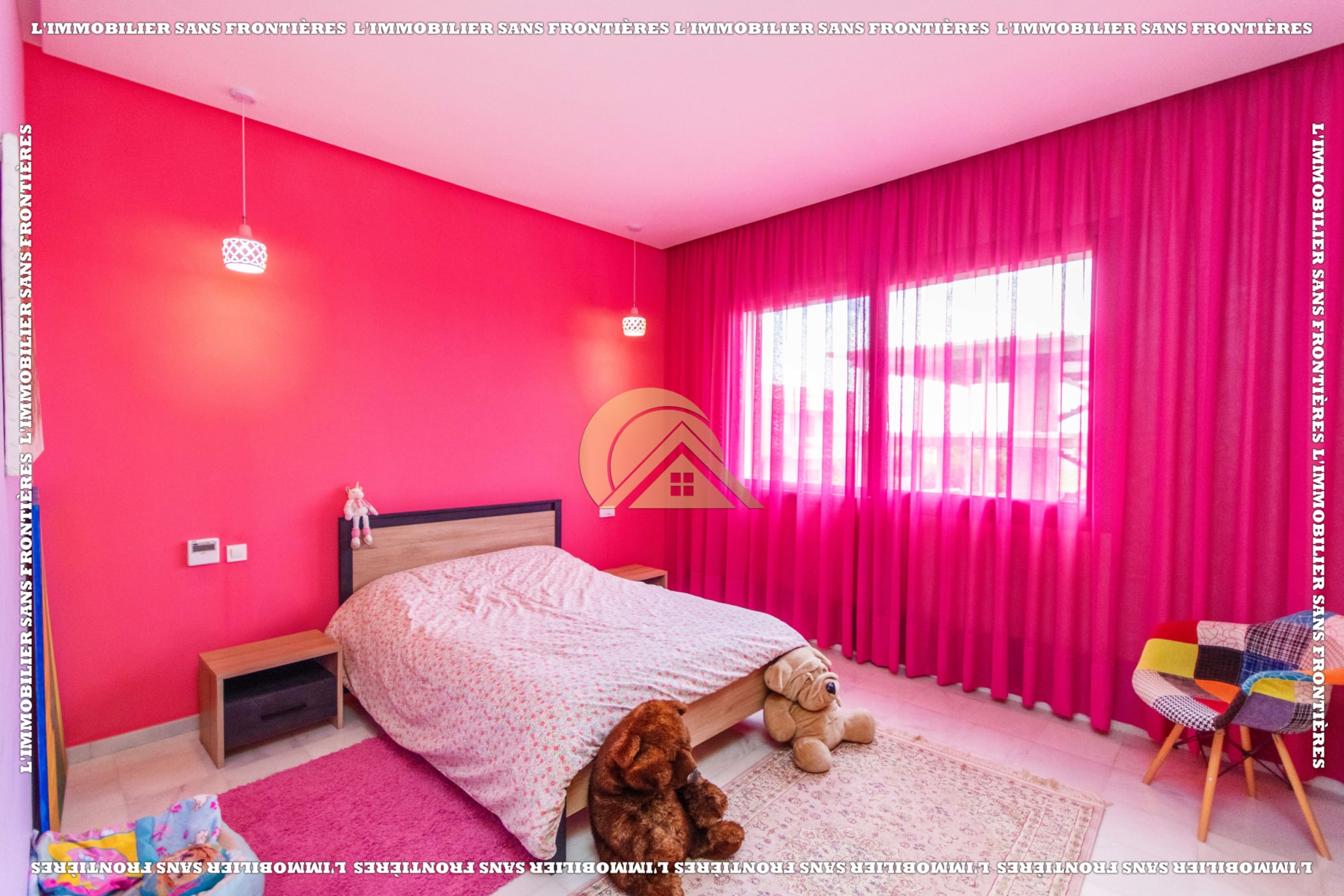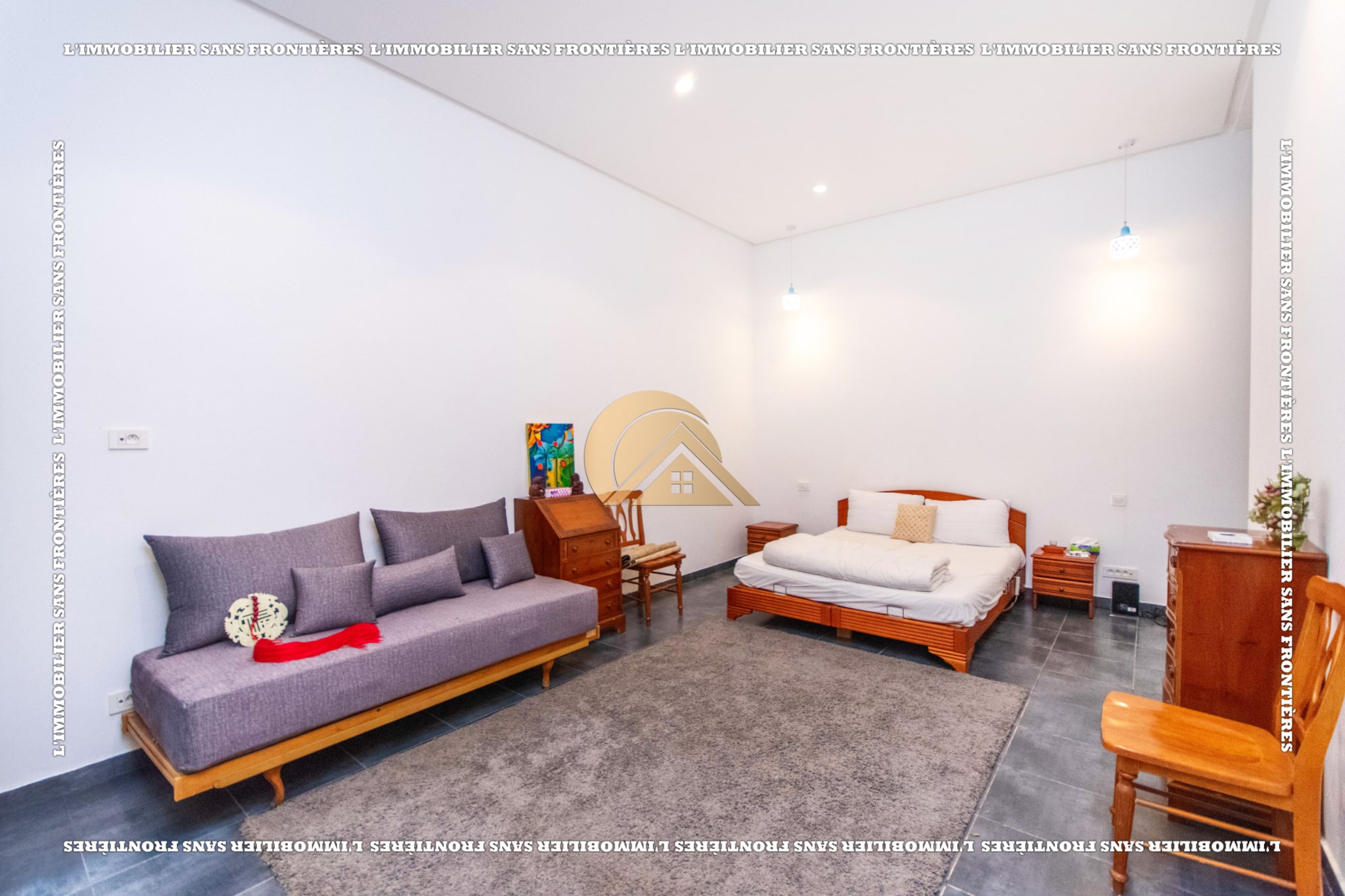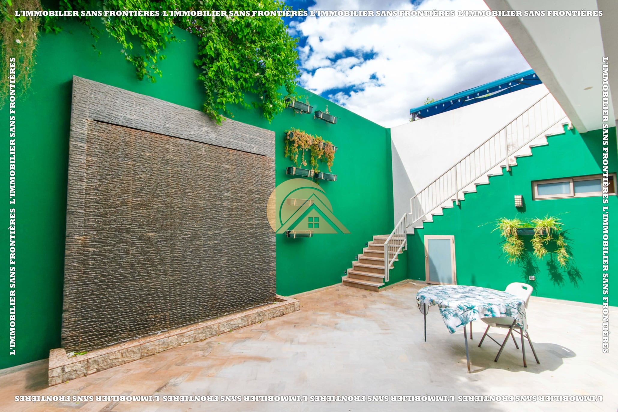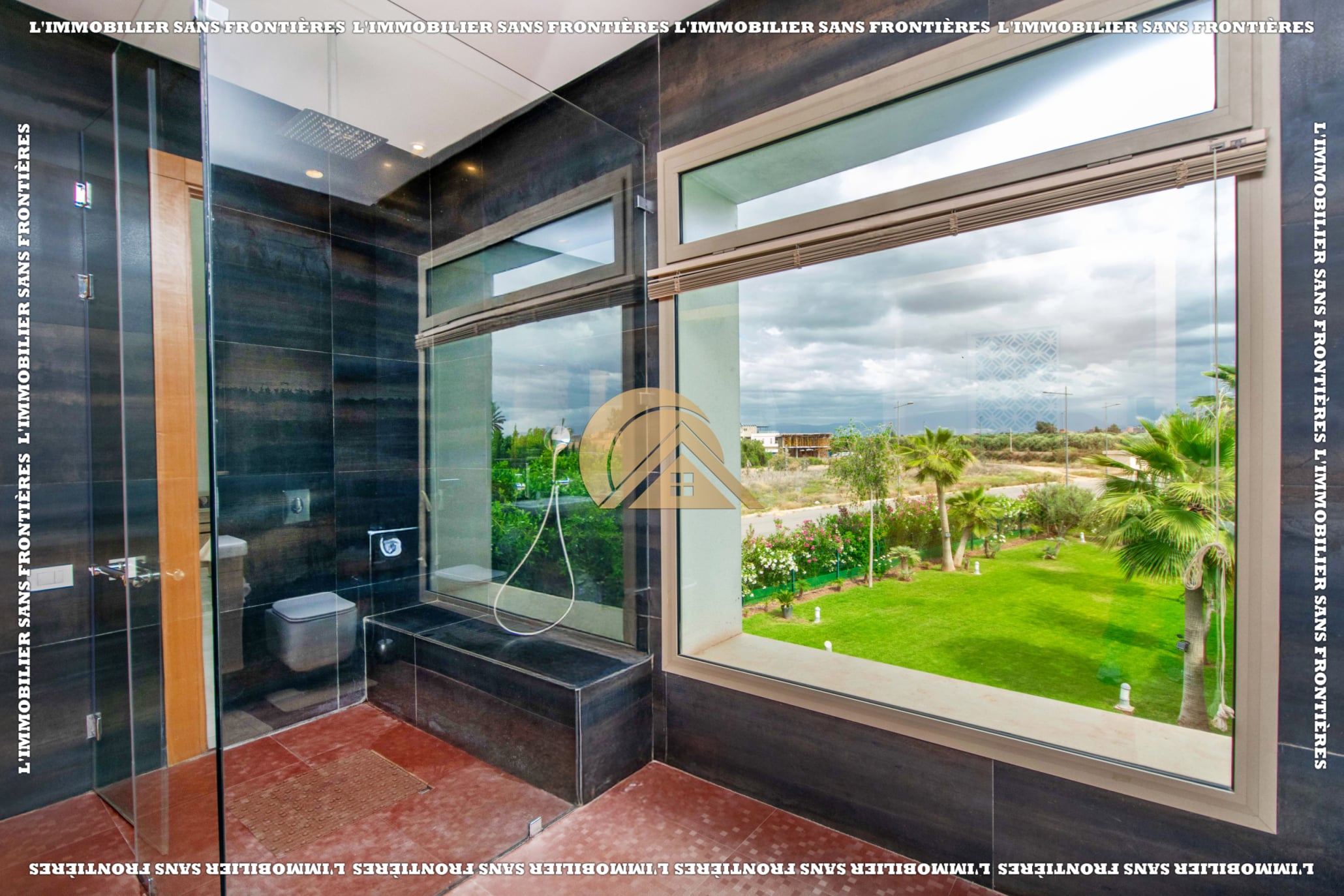 Real Estate Without Borders offers this unfurnished villa for rent in Golf Argan, on Route de Tahanaout in Marrakech. The villa is described in a peaceful setting, with landscaped garden, private pool and a cascade. Stated sizes: land 450 m² and 800 m² living area.