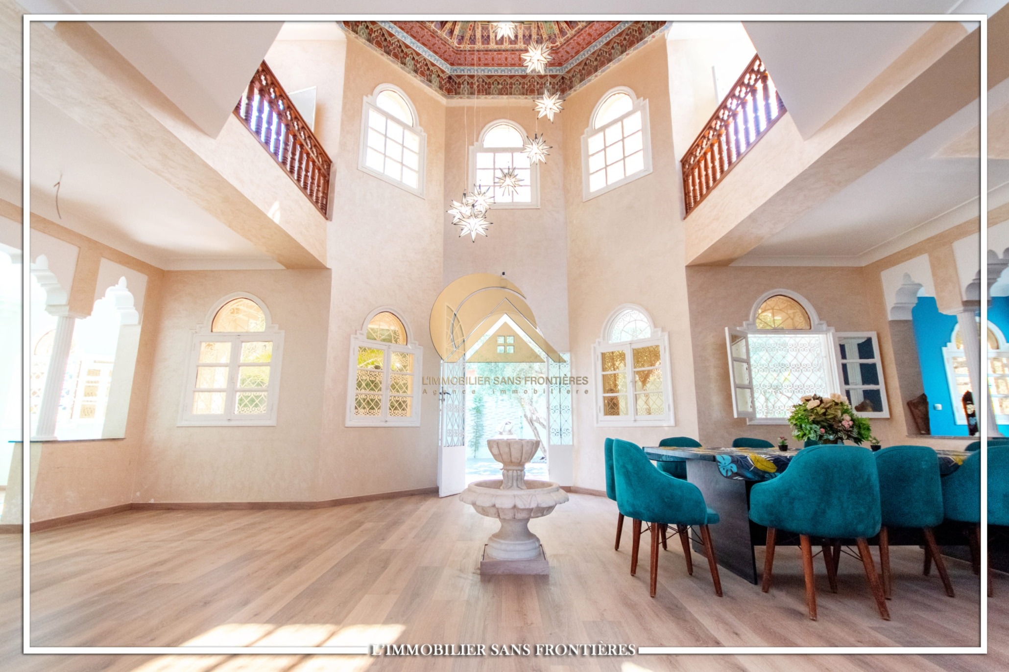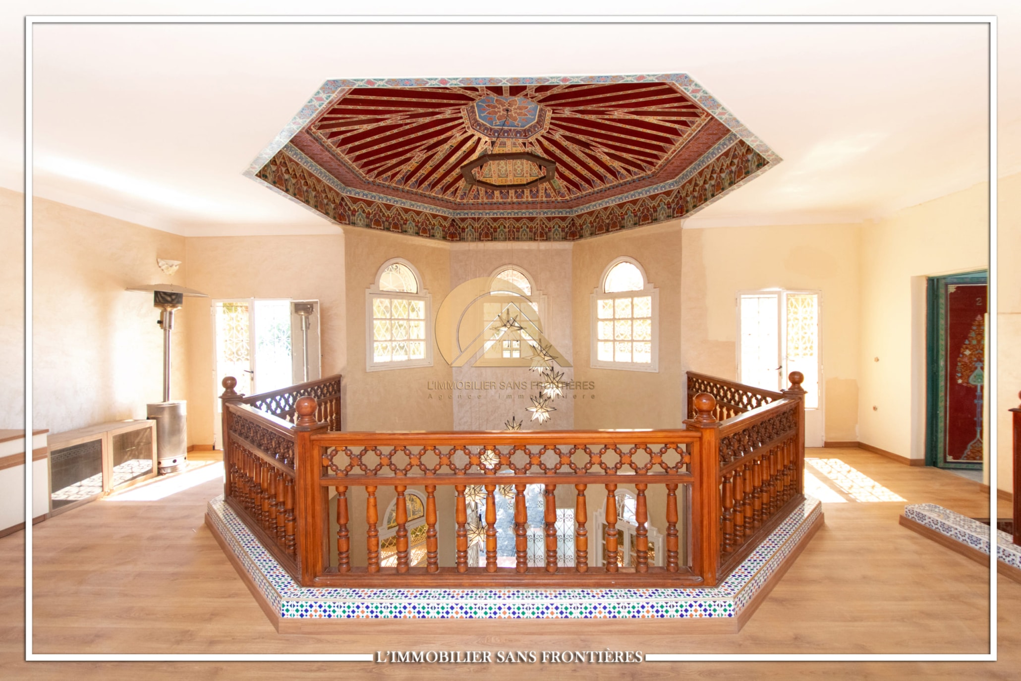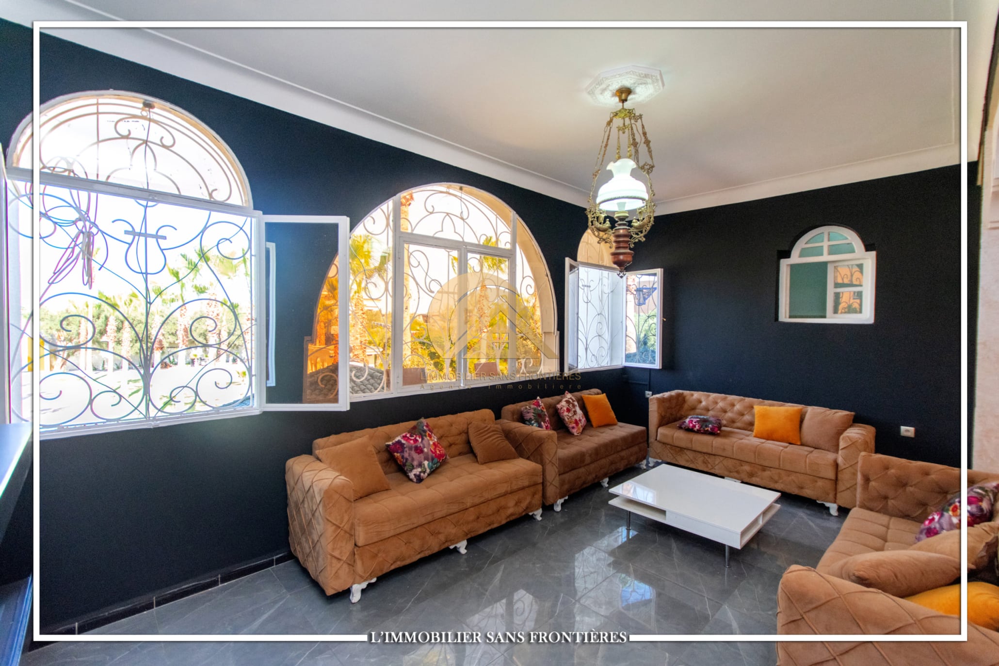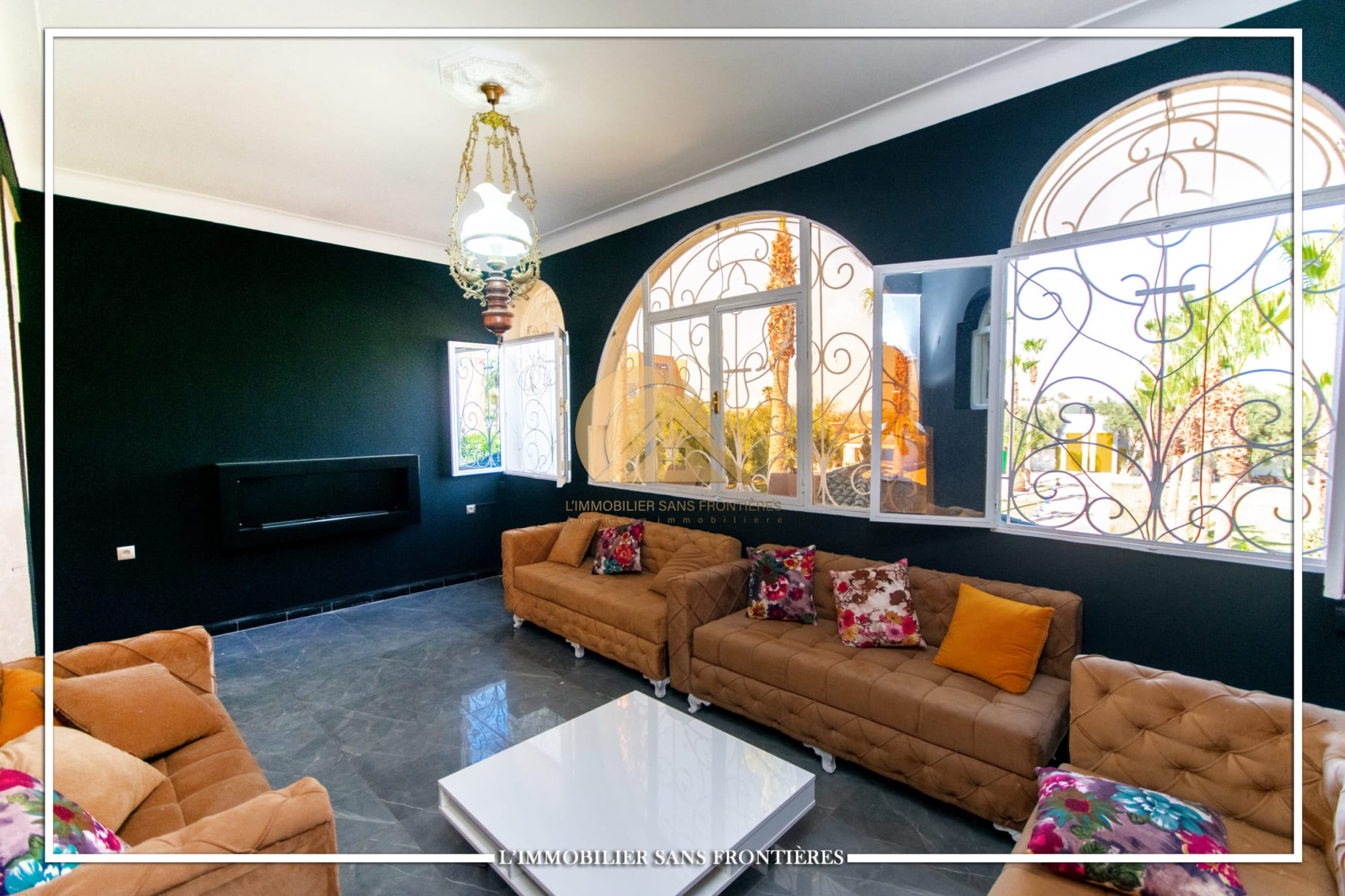2 salons marocains – European living room – Lounge – 2 chambres avec salles de bains, placards et climatisation – Equipped kitchen – Laundry area – Bathroom – Ethanol fireplace – Large windows – Terrace