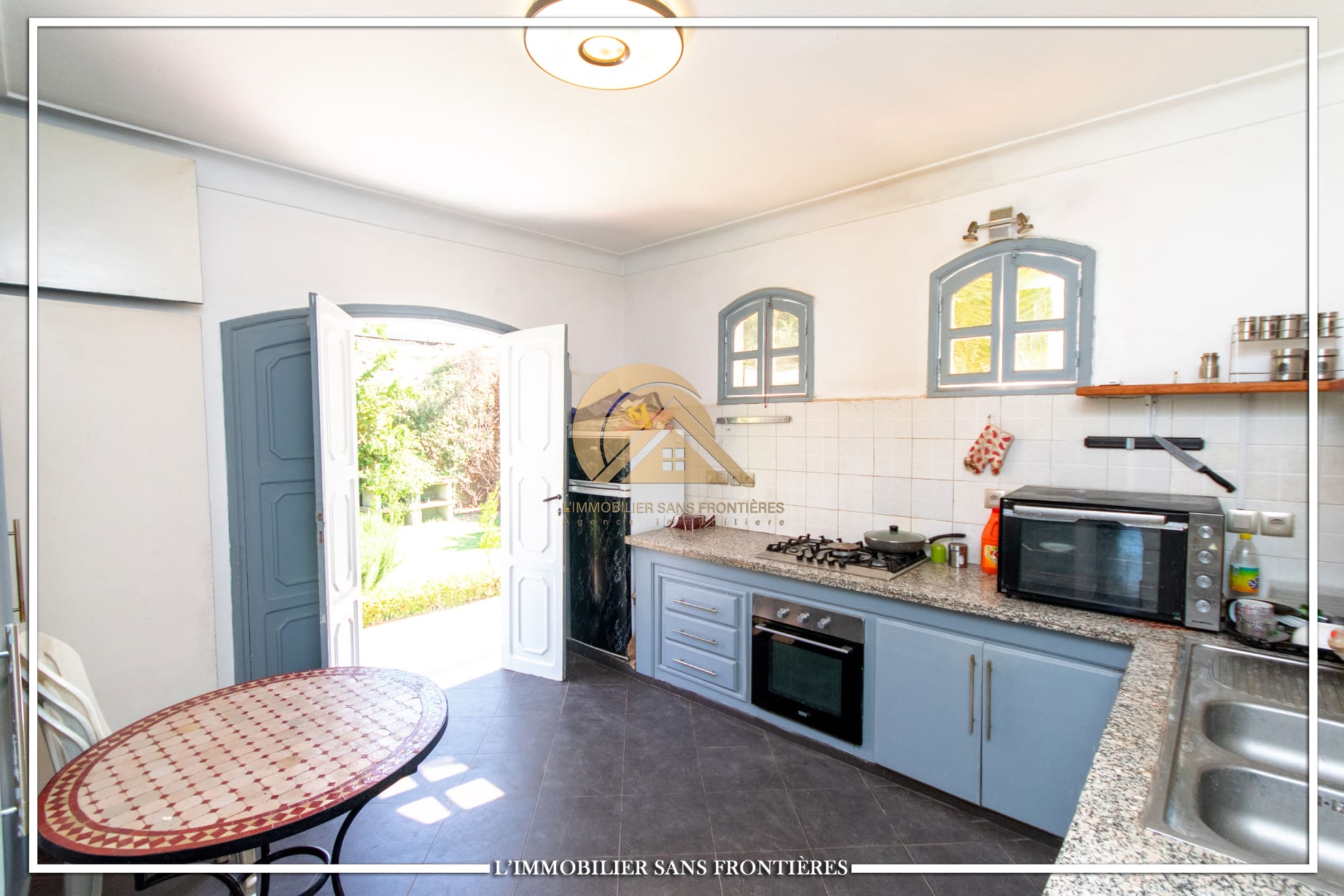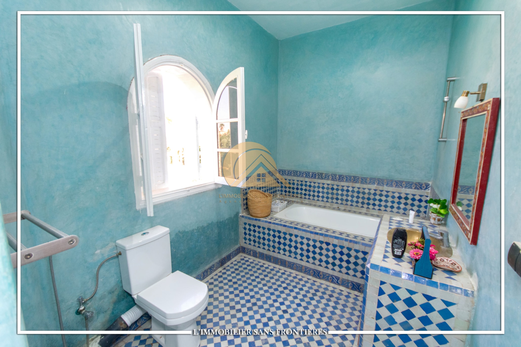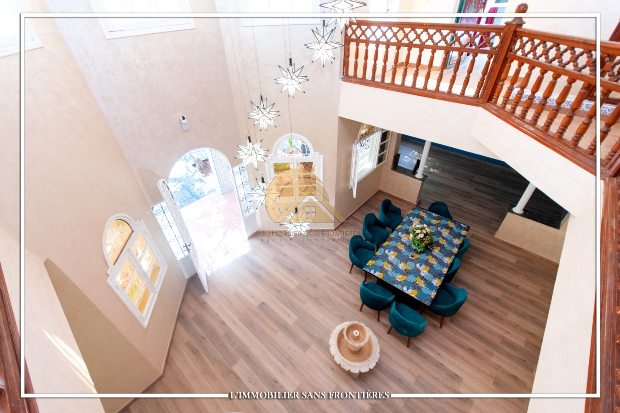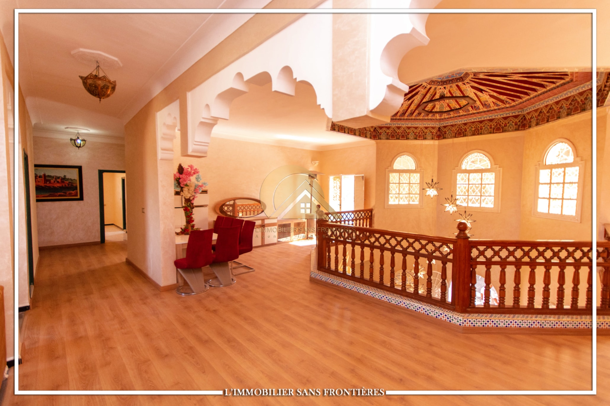 2 salons marocains – European living room – Lounge – 2 chambres avec salles de bains, placards et climatisation – Equipped kitchen – Laundry area – Bathroom – Ethanol fireplace – Large windows – Terrace