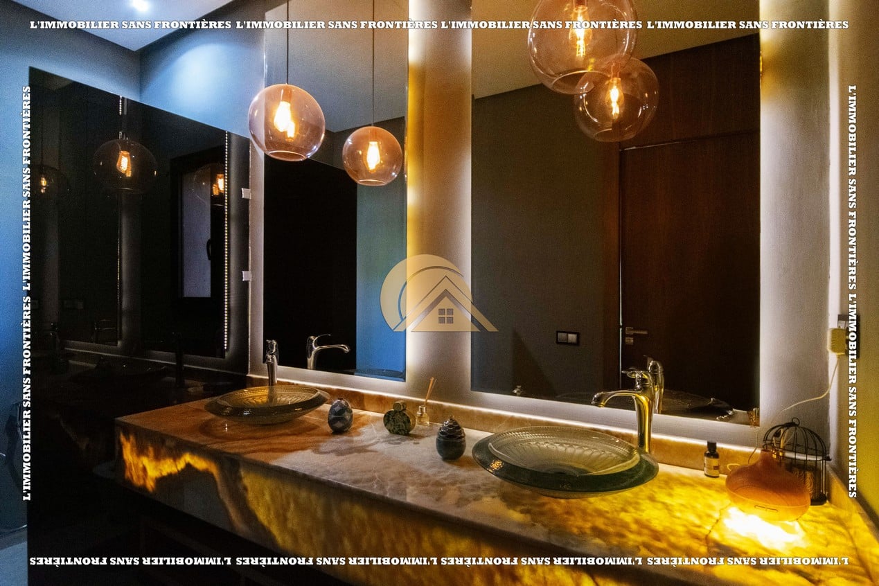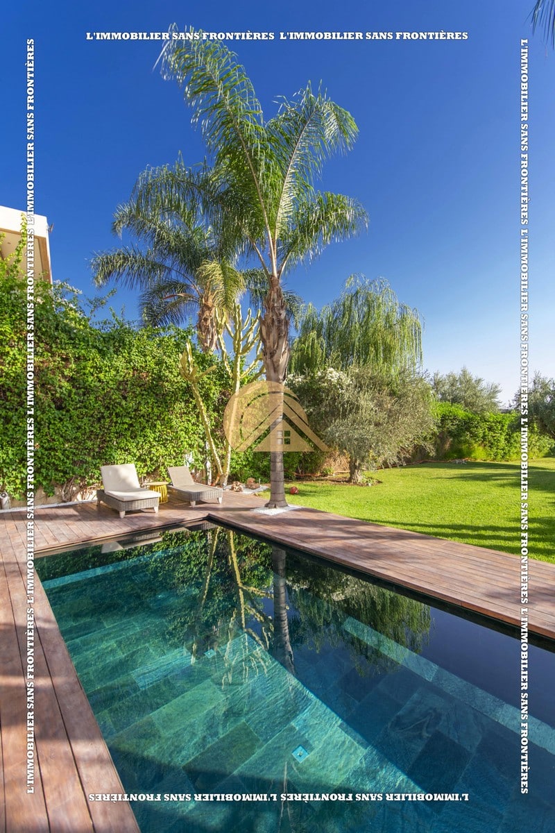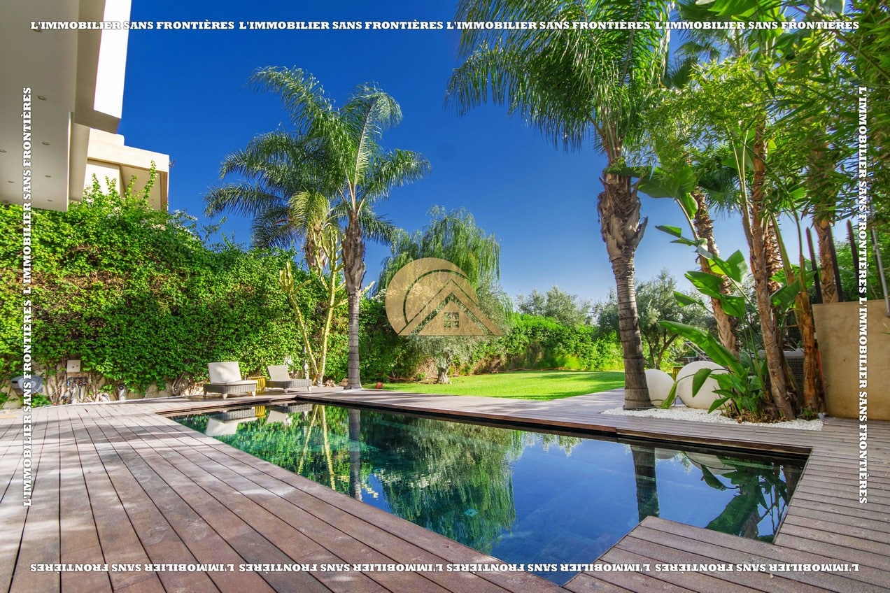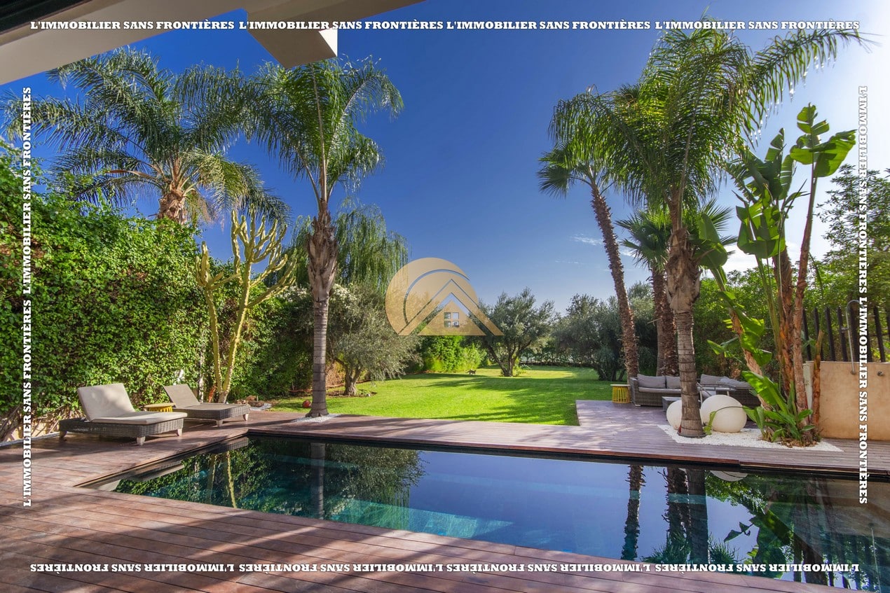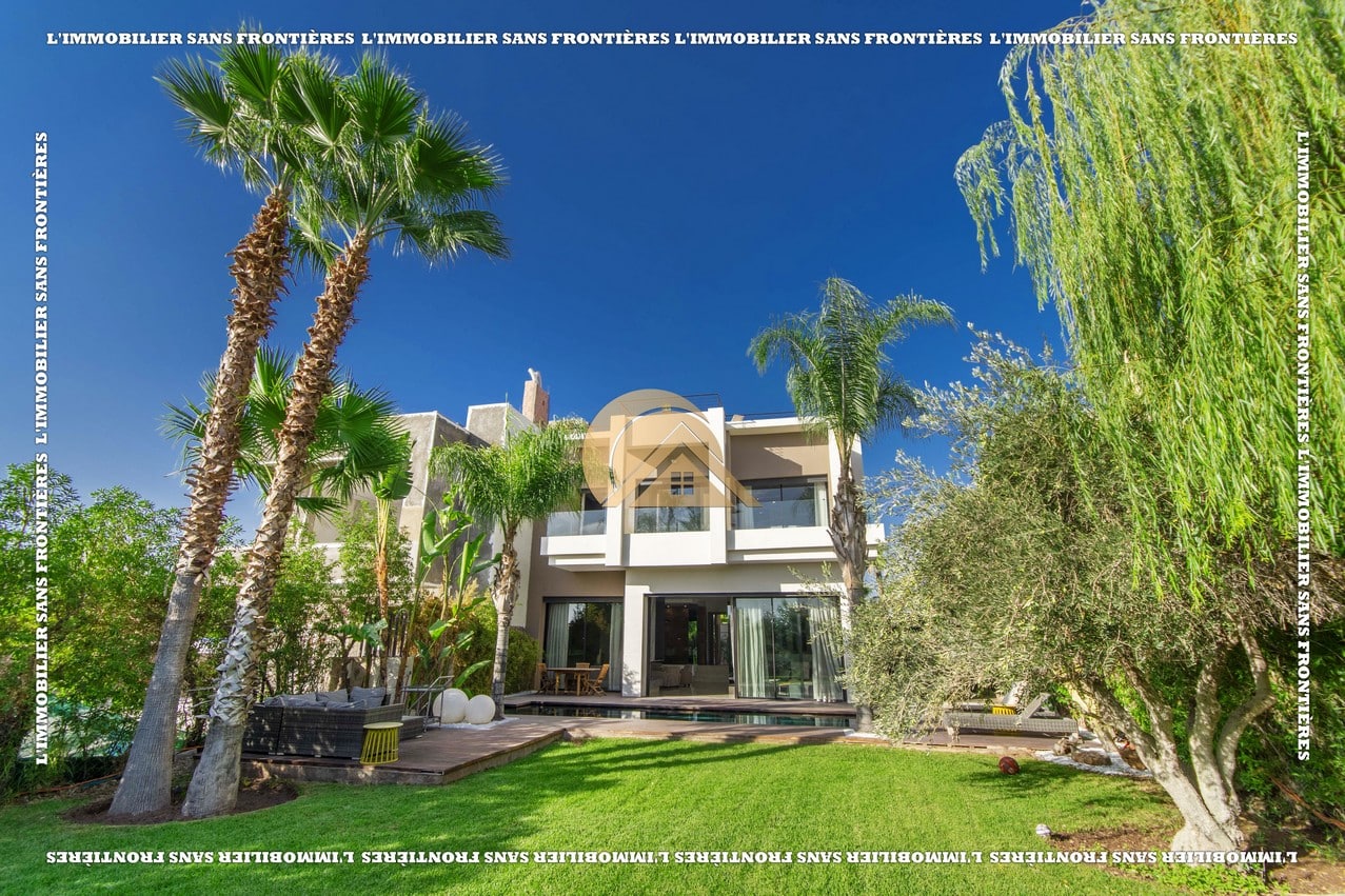 Real Estate Without Borders presents this furnished villa for rent within the Golf Argan residence, on Route de Tahanaout in Marrakech. It is described as calm, with a golf view and a contemporary layout. Set on a 1000 m² plot with 500 m² of living space, it offers generous volumes.