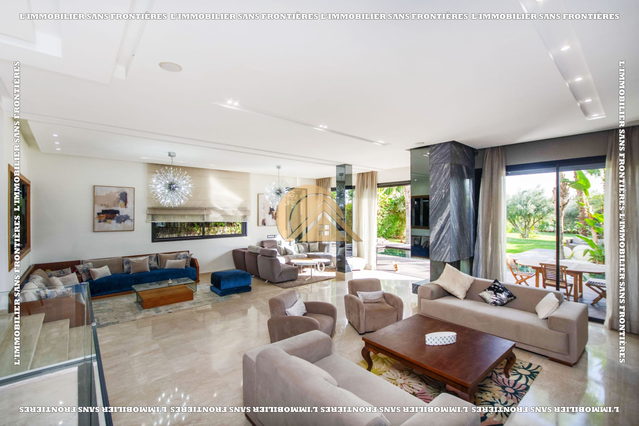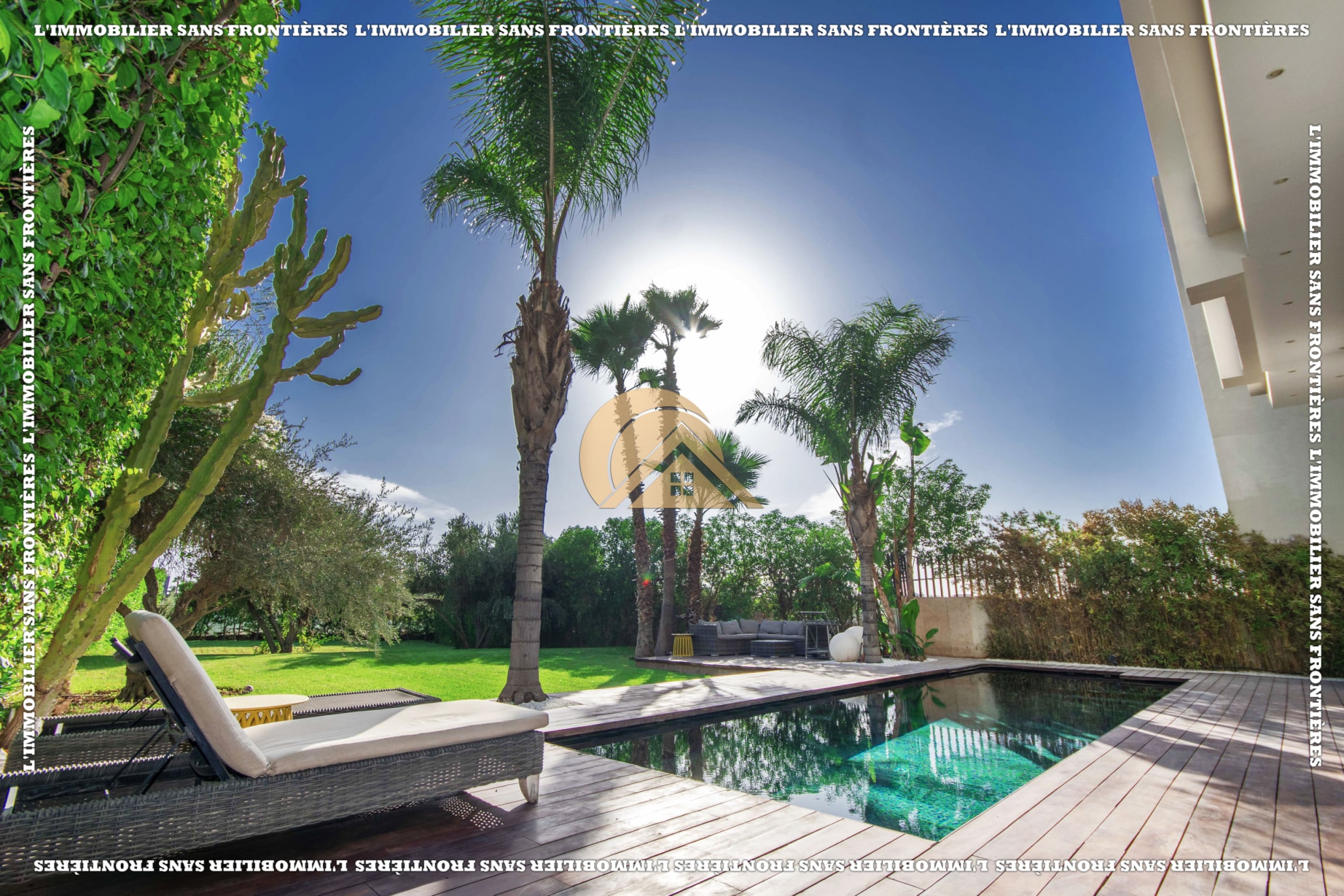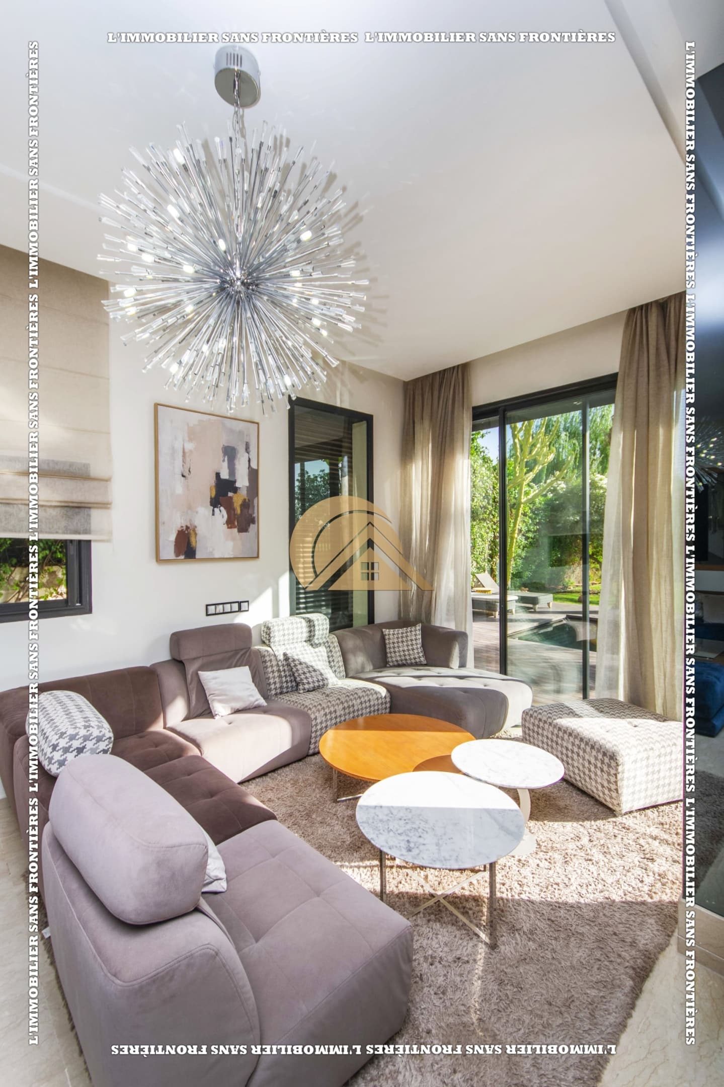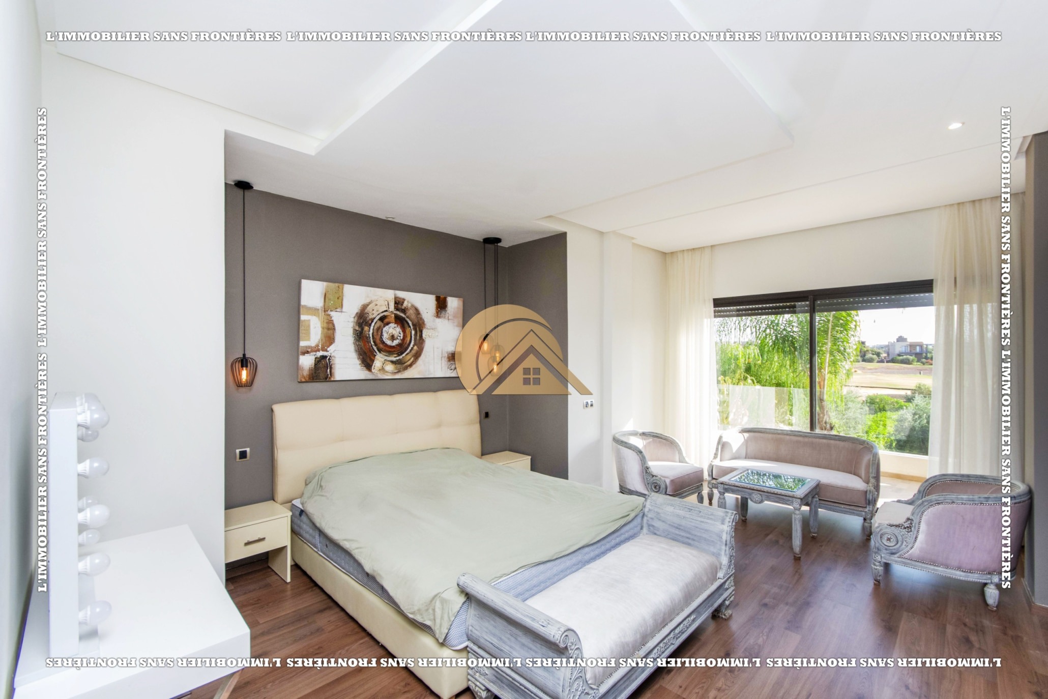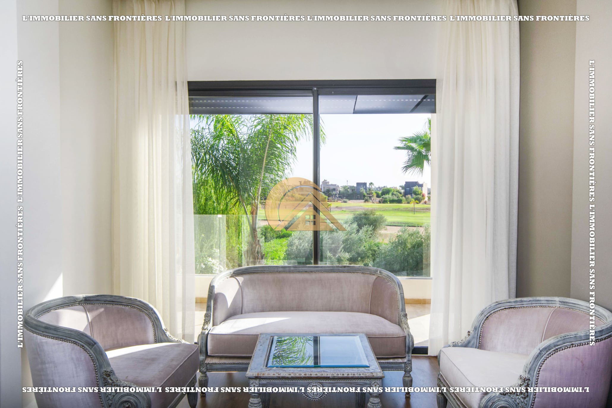 Real Estate Without Borders presents this furnished villa for rent within the Golf Argan residence, on Route de Tahanaout in Marrakech. It is described as calm, with a golf view and a contemporary layout. Set on a 1000 m² plot with 500 m² of living space, it offers generous volumes.