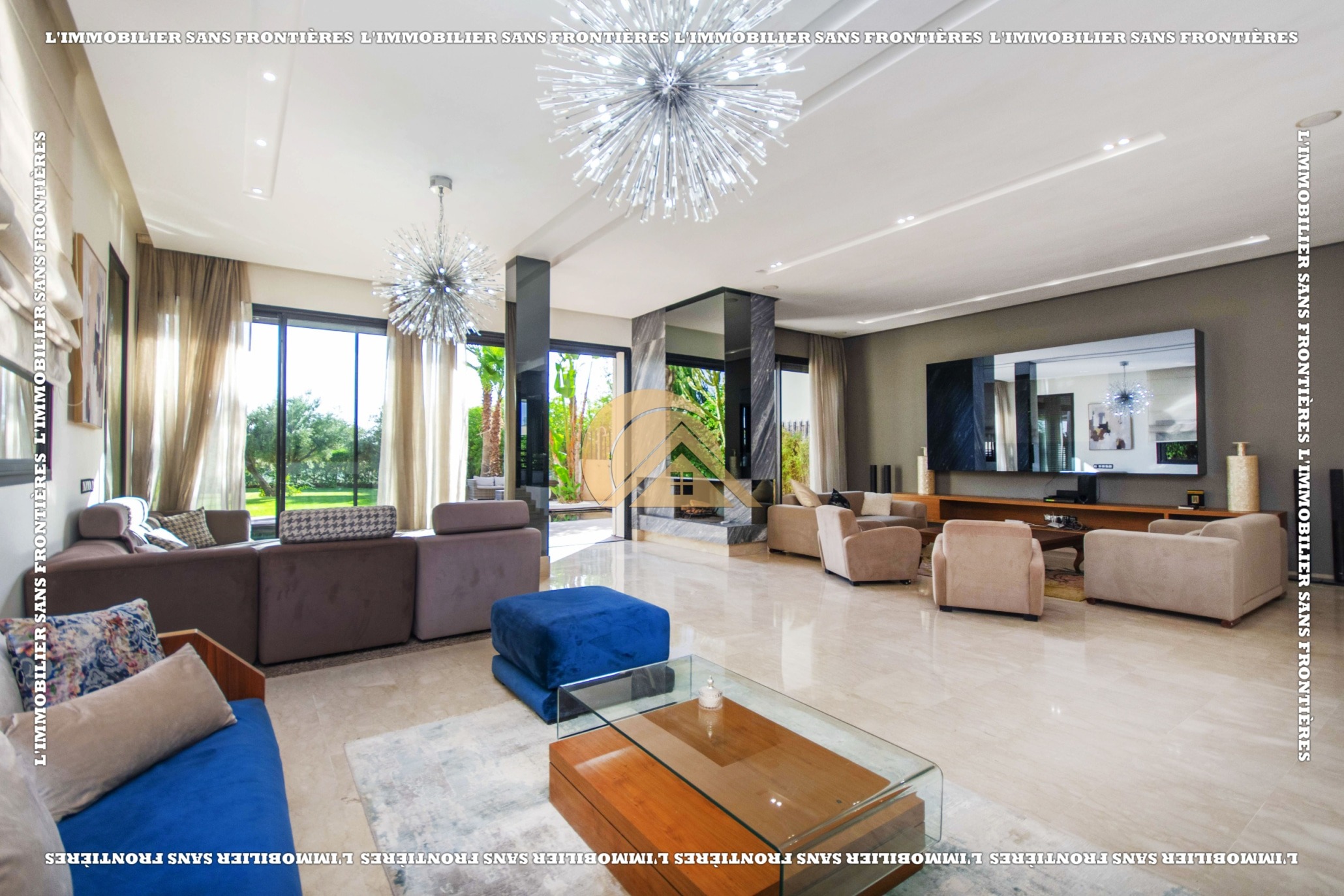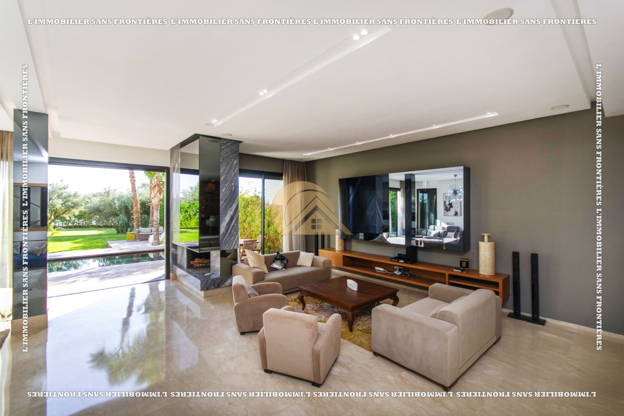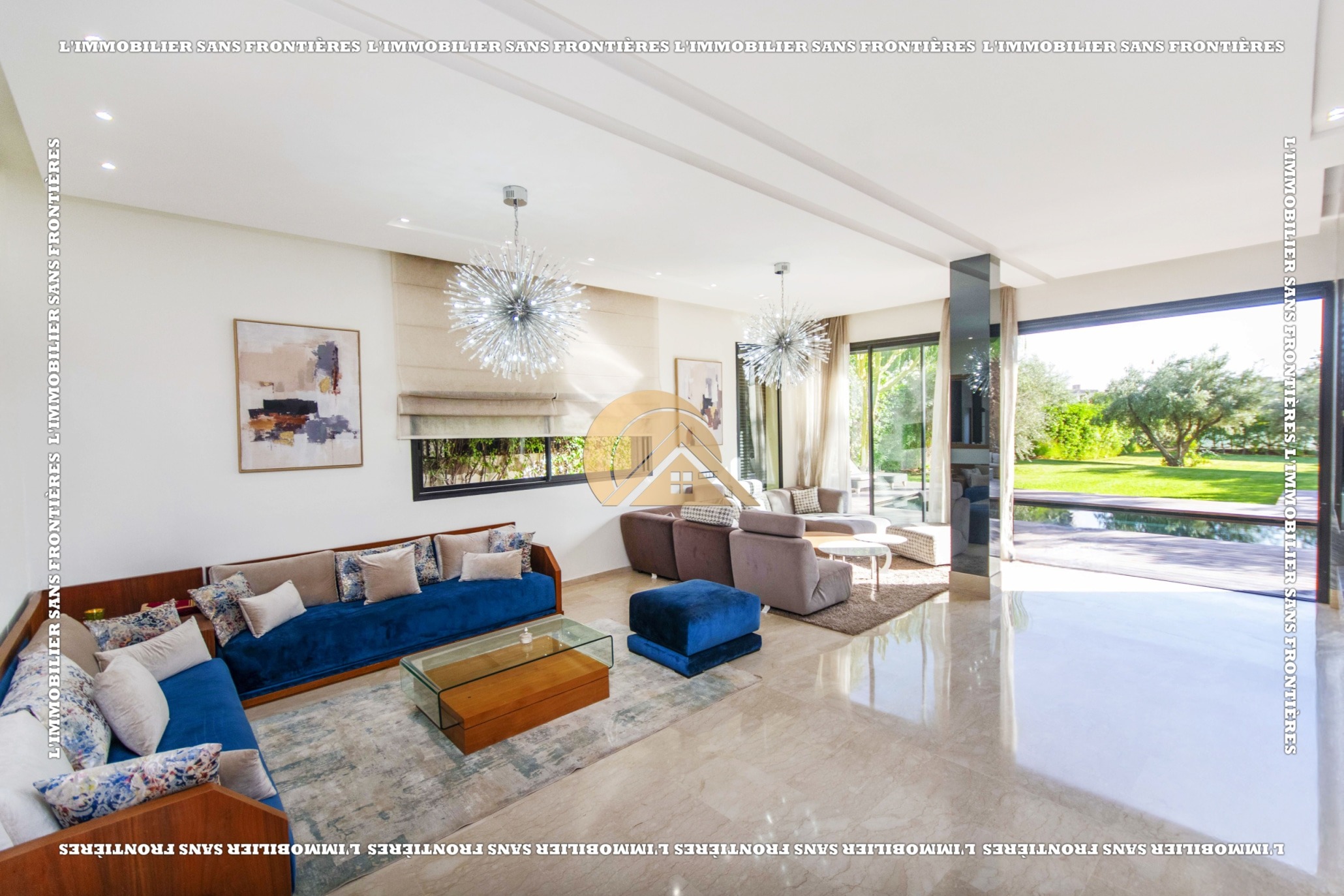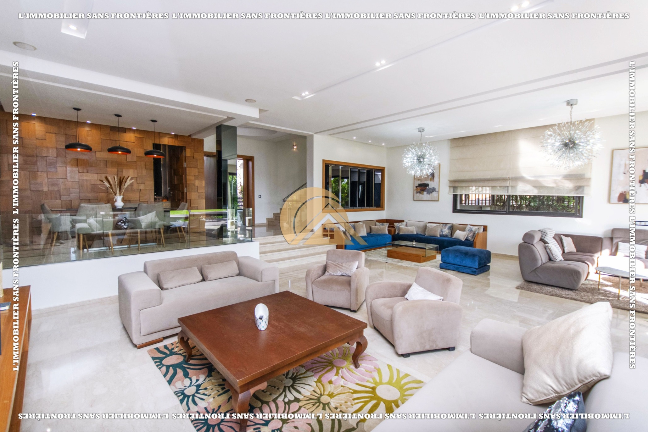 Real Estate Without Borders presents this furnished villa for rent within the Golf Argan residence, on Route de Tahanaout in Marrakech. It is described as calm, with a golf view and a contemporary layout. Set on a 1000 m² plot with 500 m² of living space, it offers generous volumes.