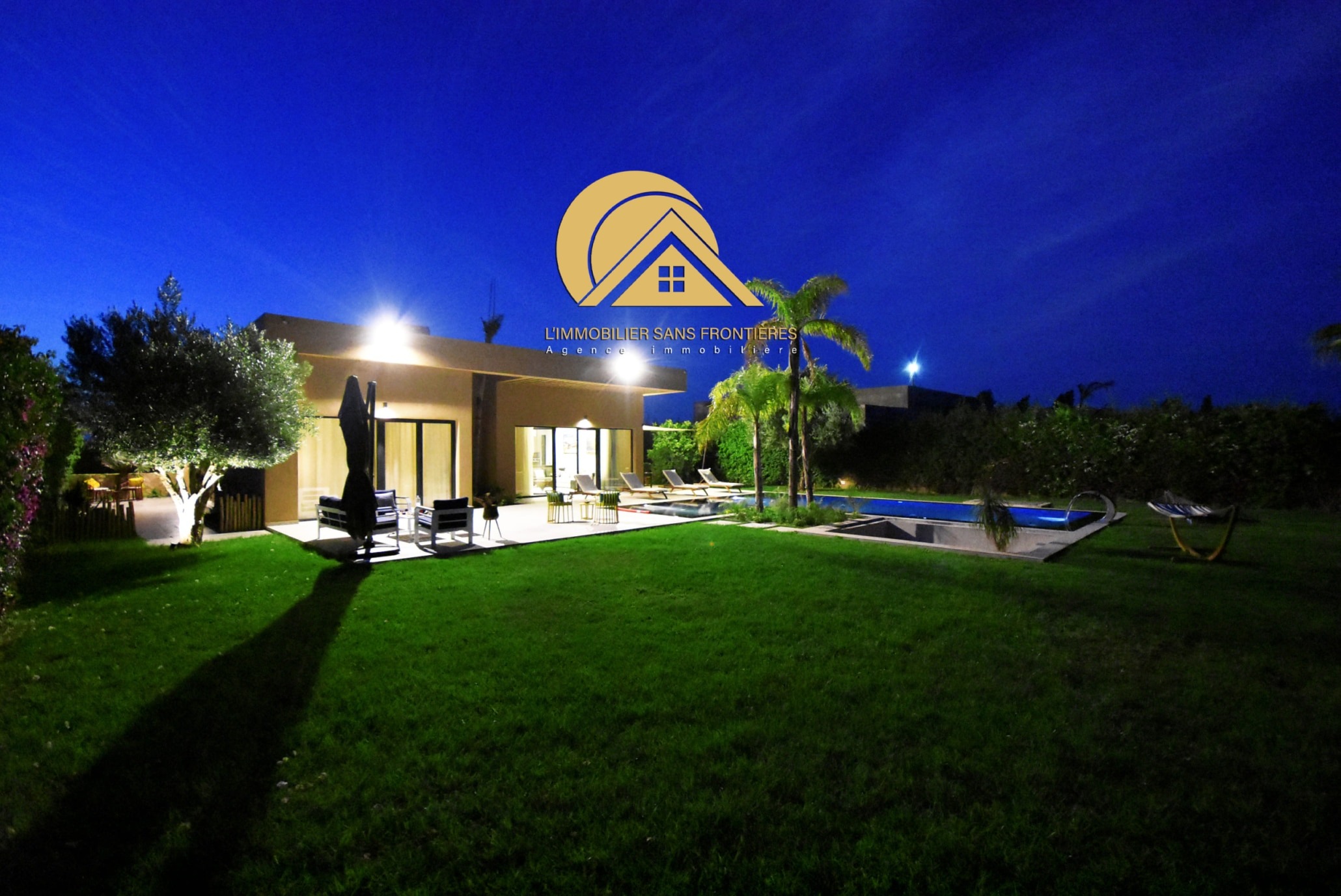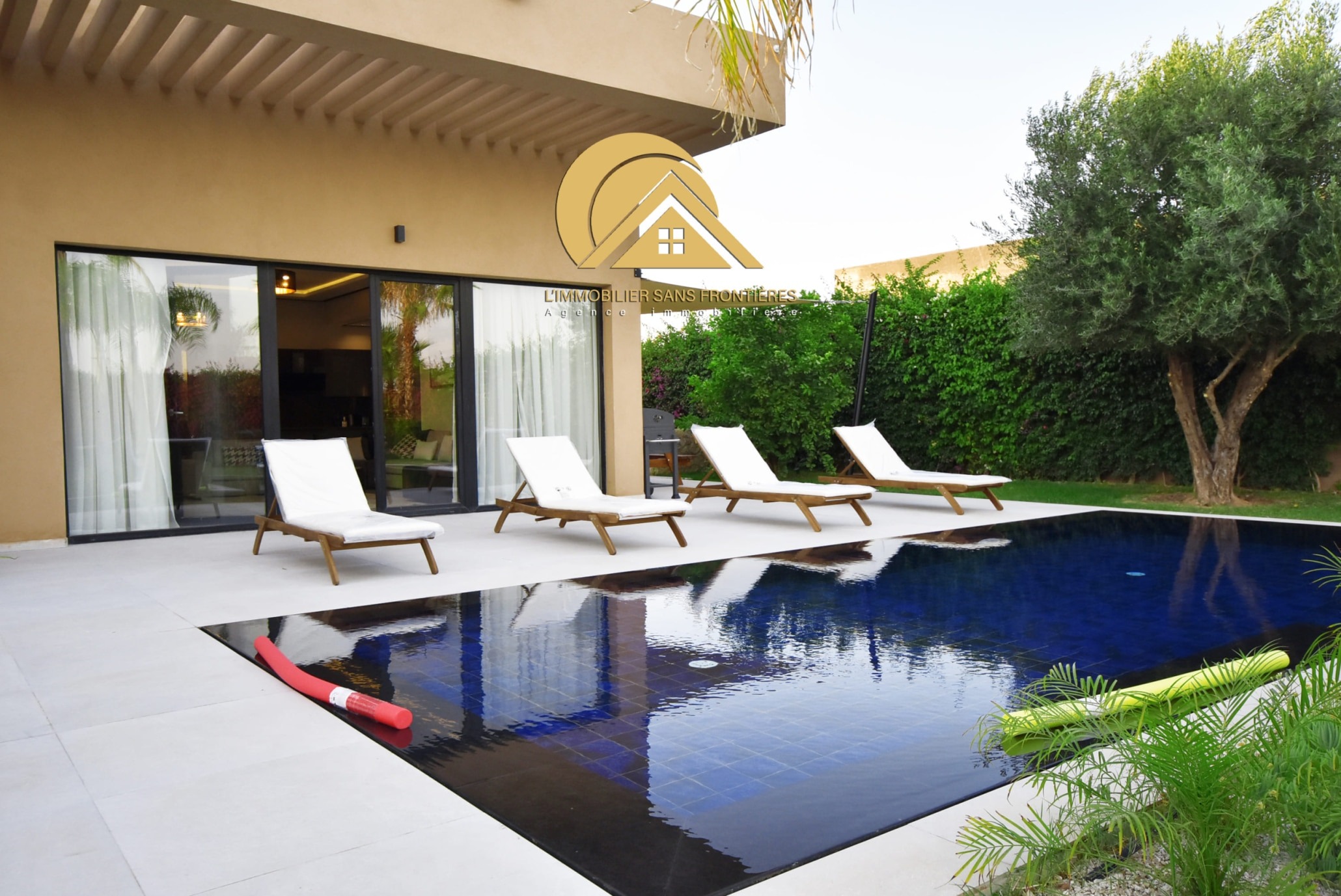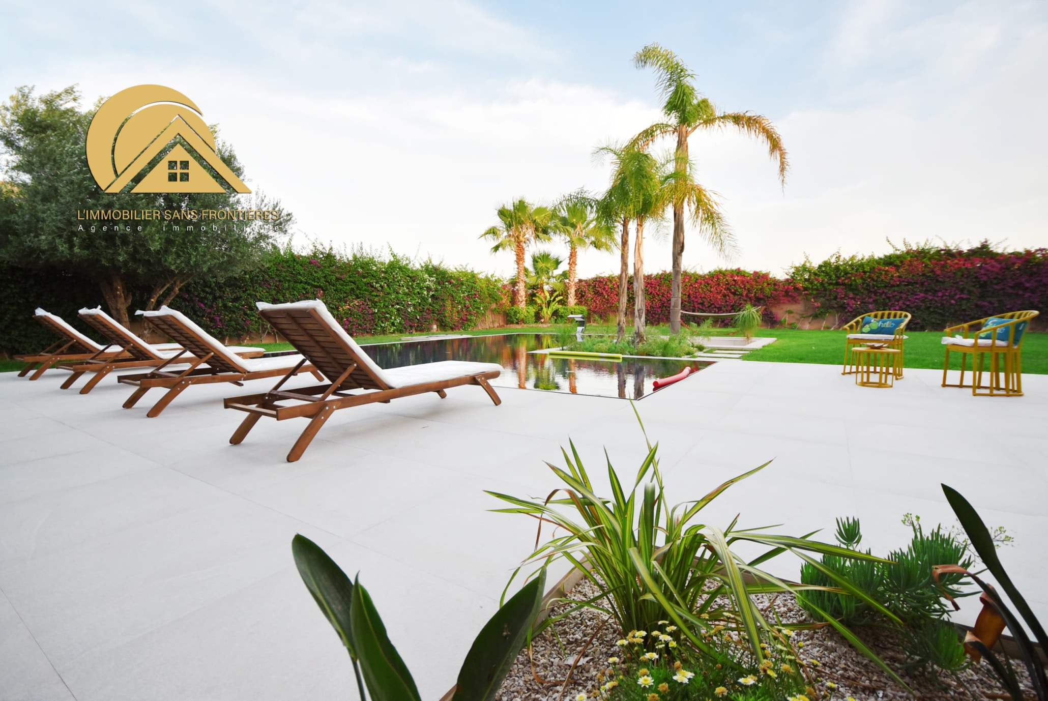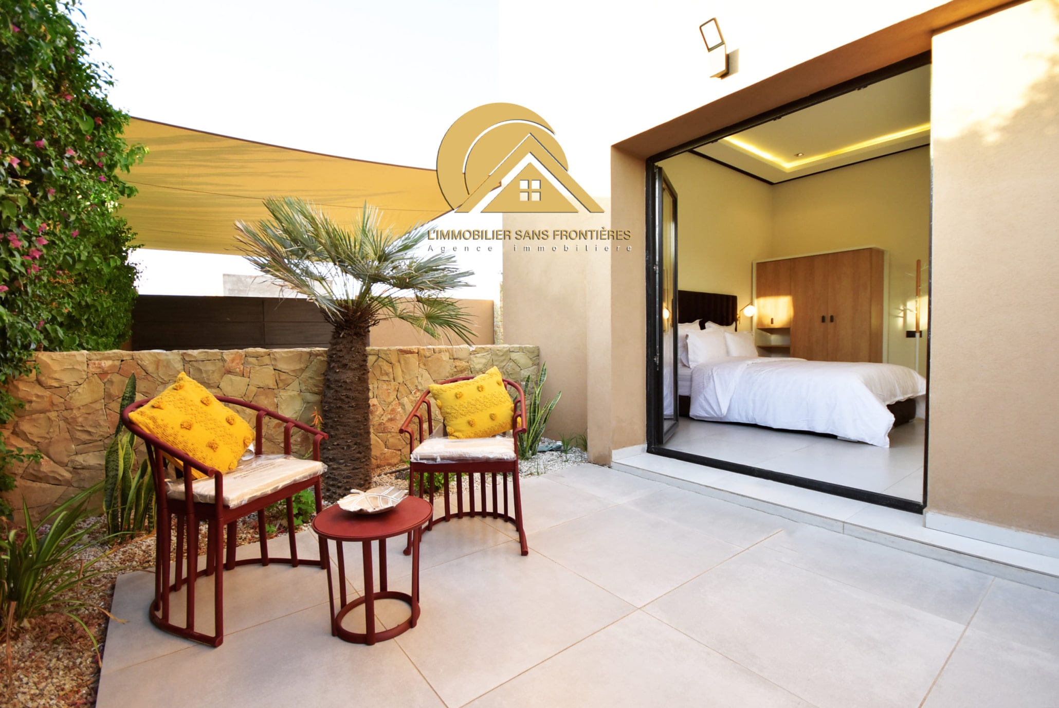 Real Estate Without Borders offers this furnished villa for rent on the Ouarzazate road, Marrakech. It is single-storey and has two facades, with a garden and a private pool. The villa is stated as available in March.