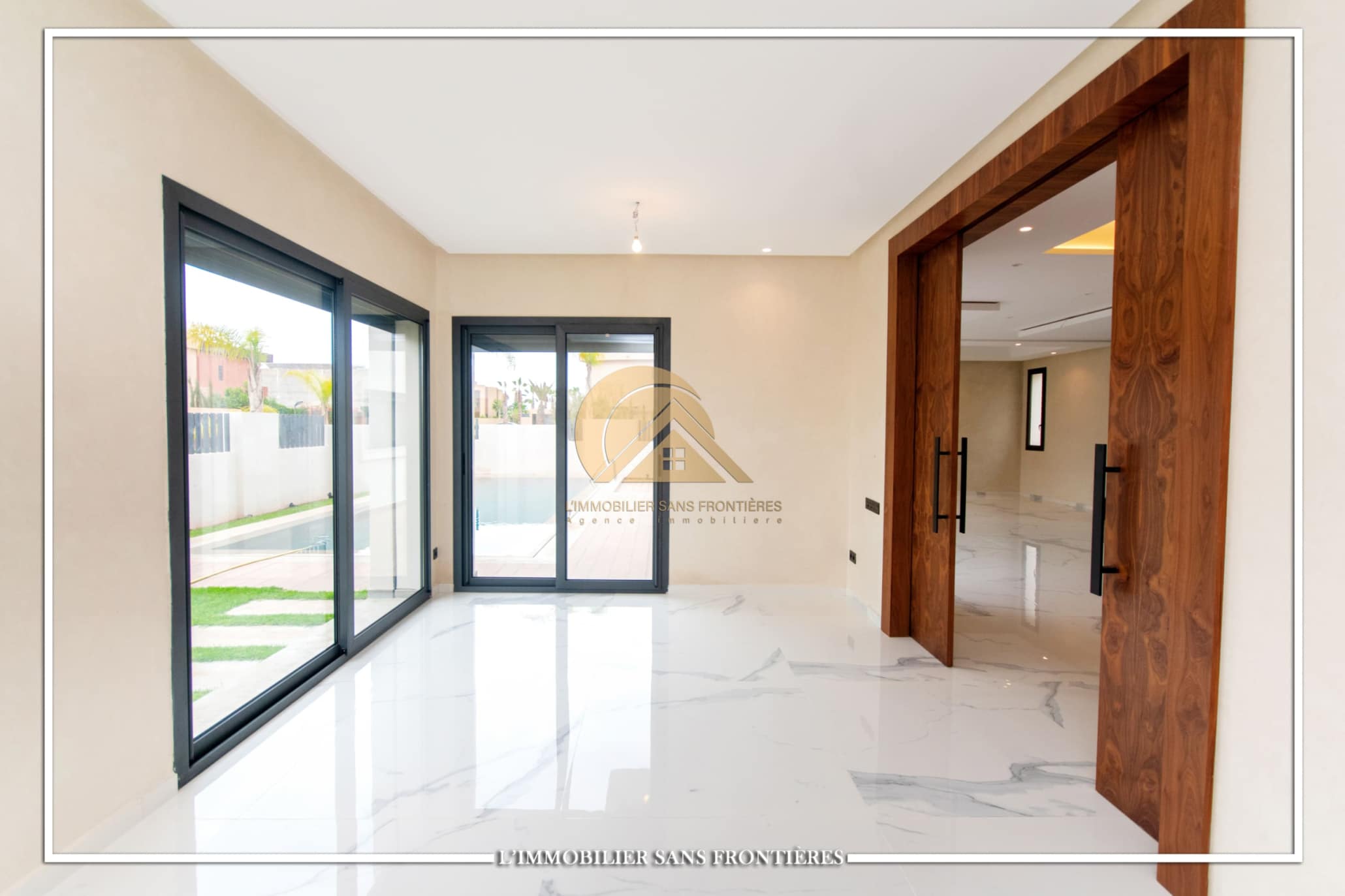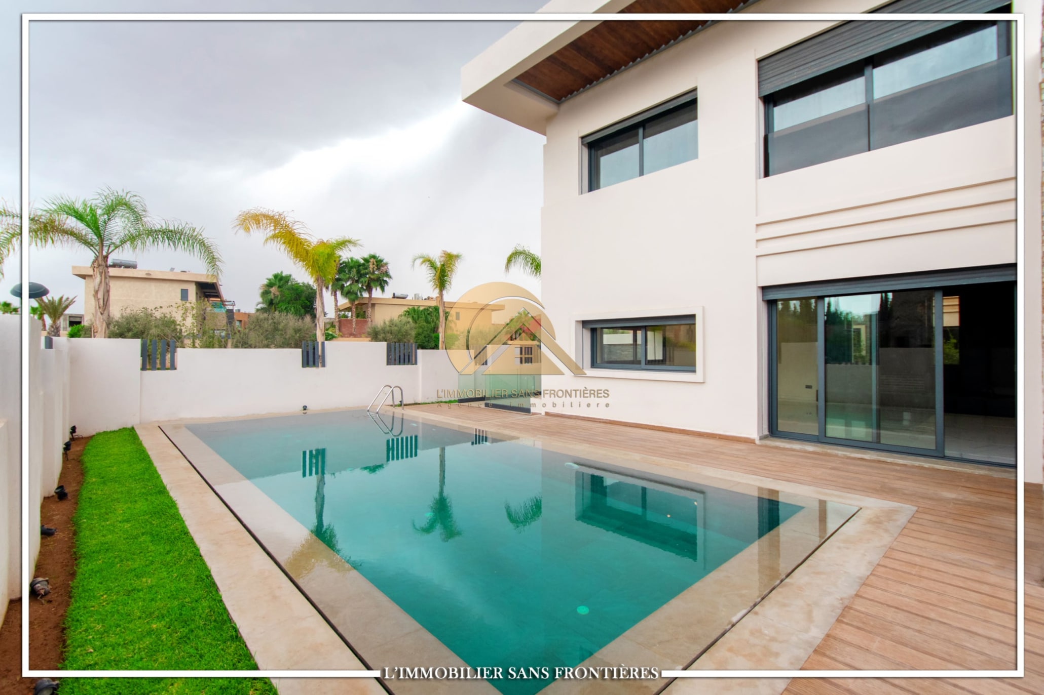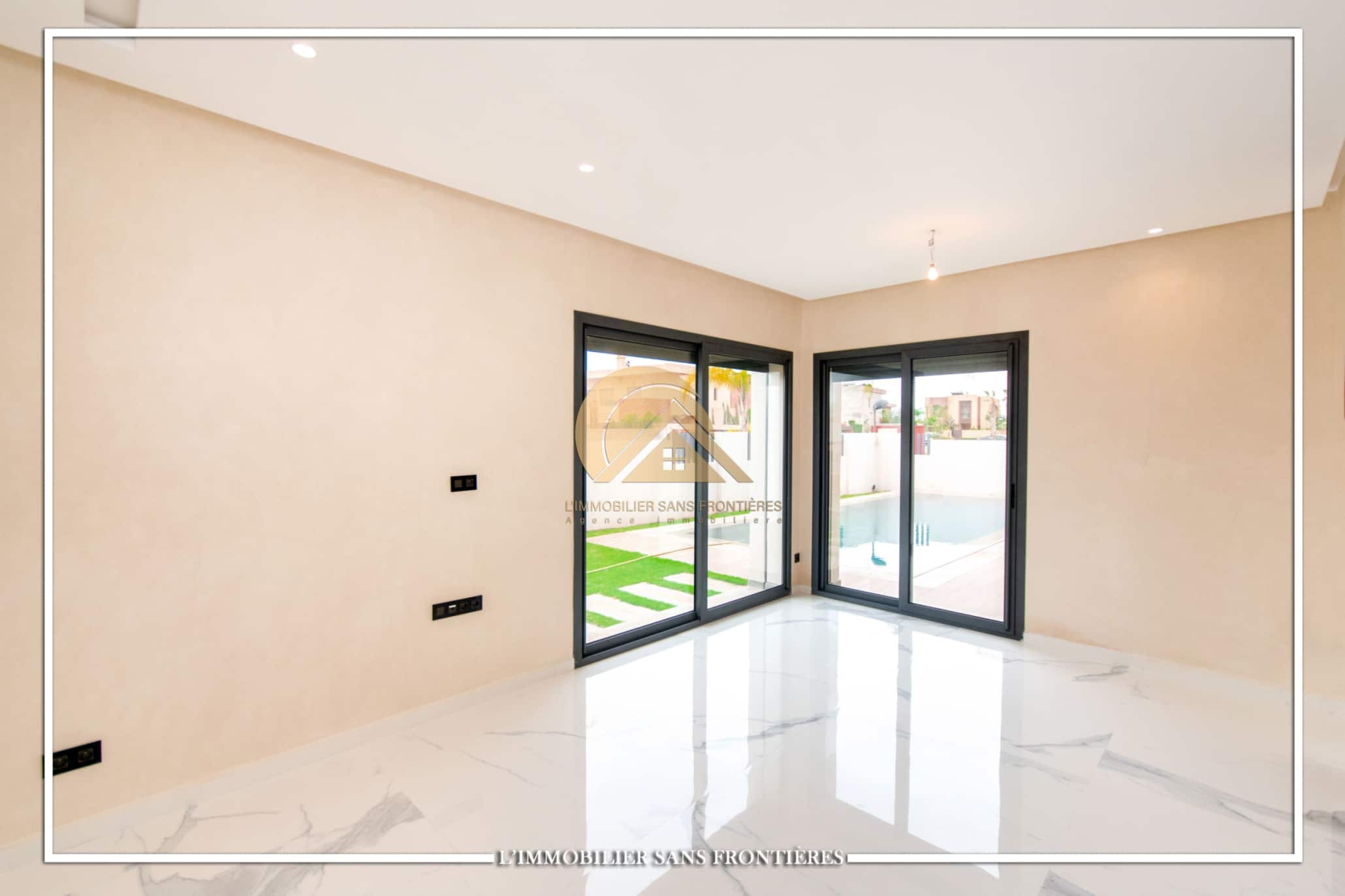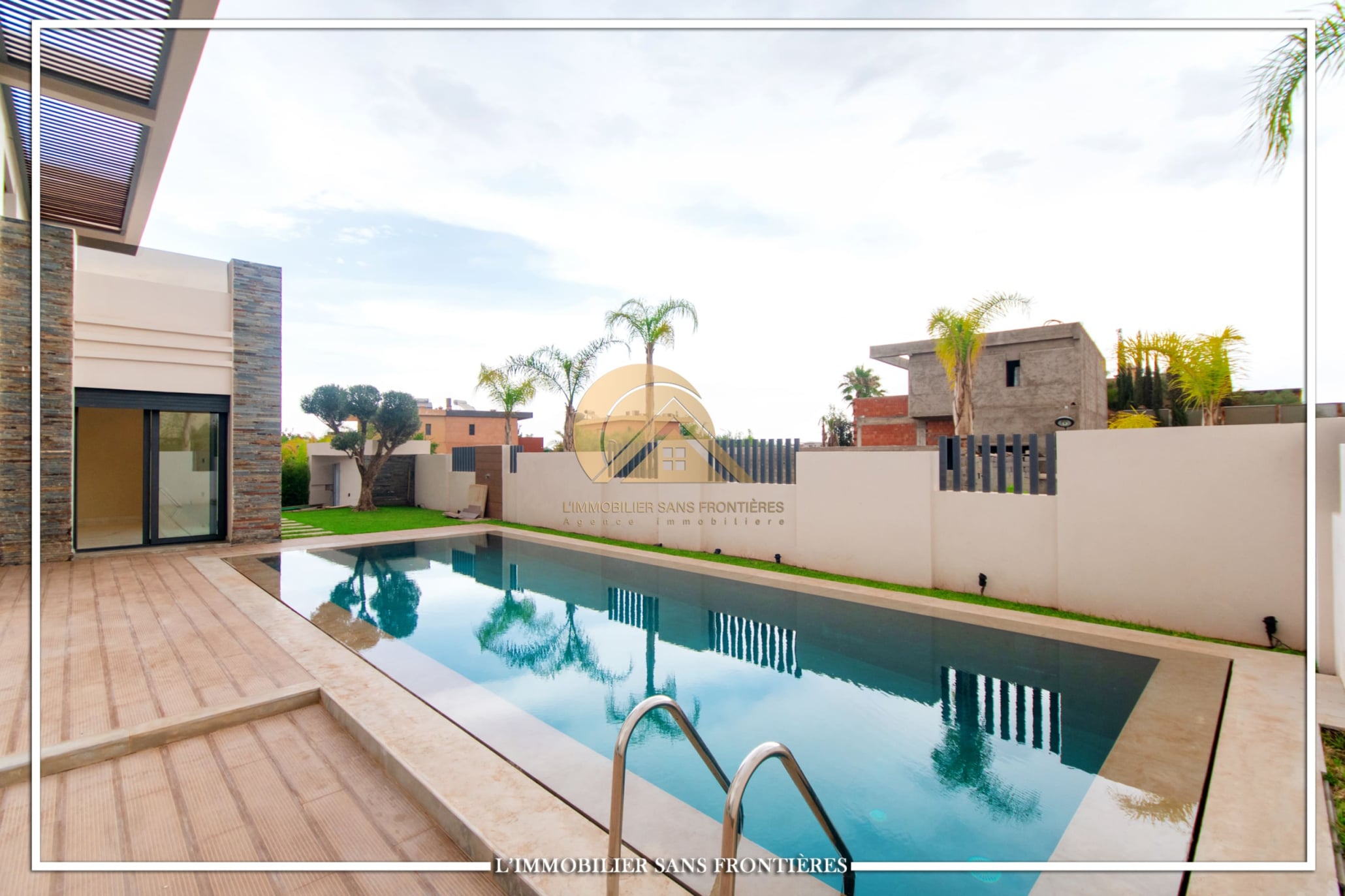 Real Estate Without Borders offers for rent this modern villa on Route d’Ourika in Marrakech, within a golf residence. Unfurnished villa on a 500 m² plot with 450 m² of living space, featuring a private pool and landscaped garden; availability indicated in August.