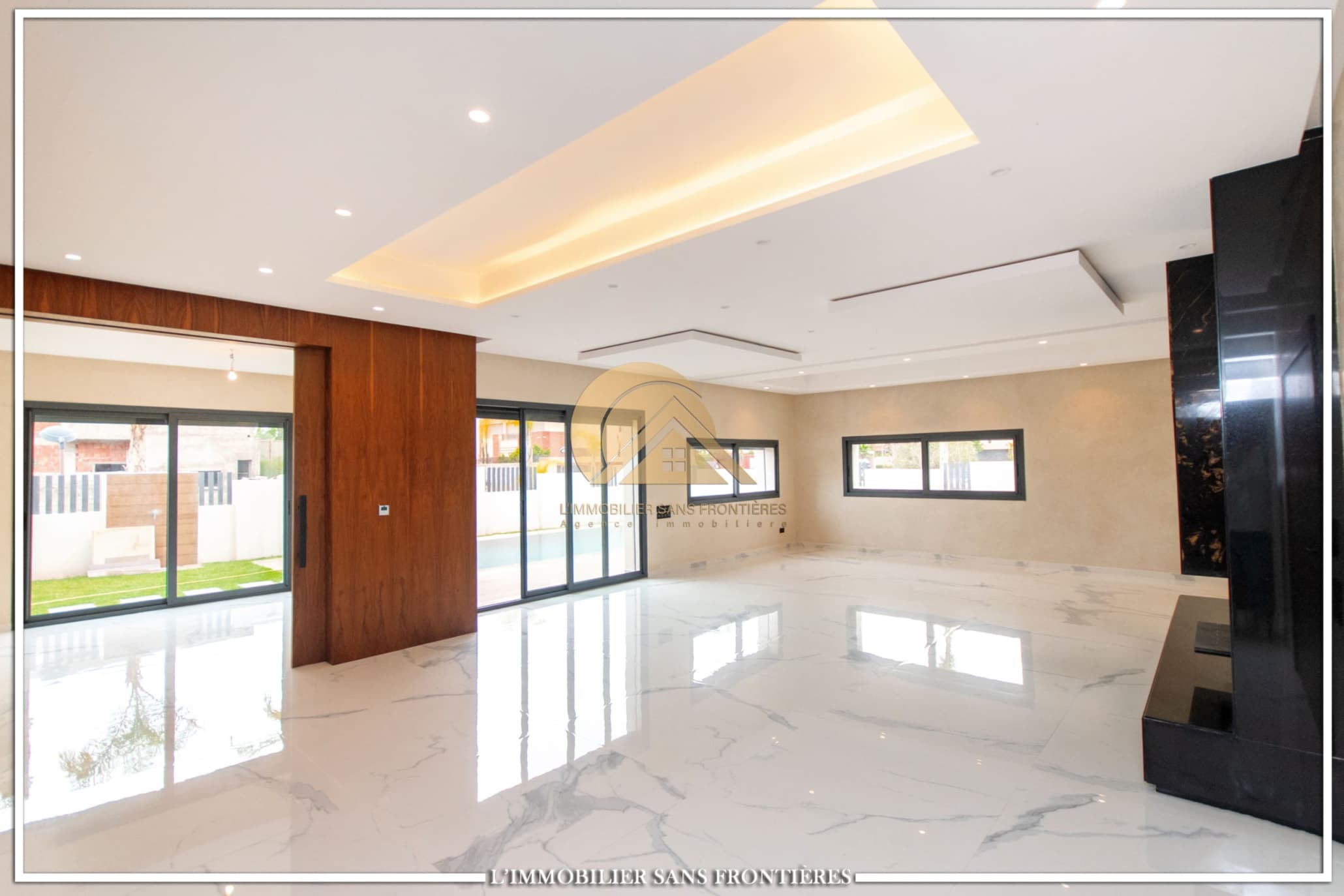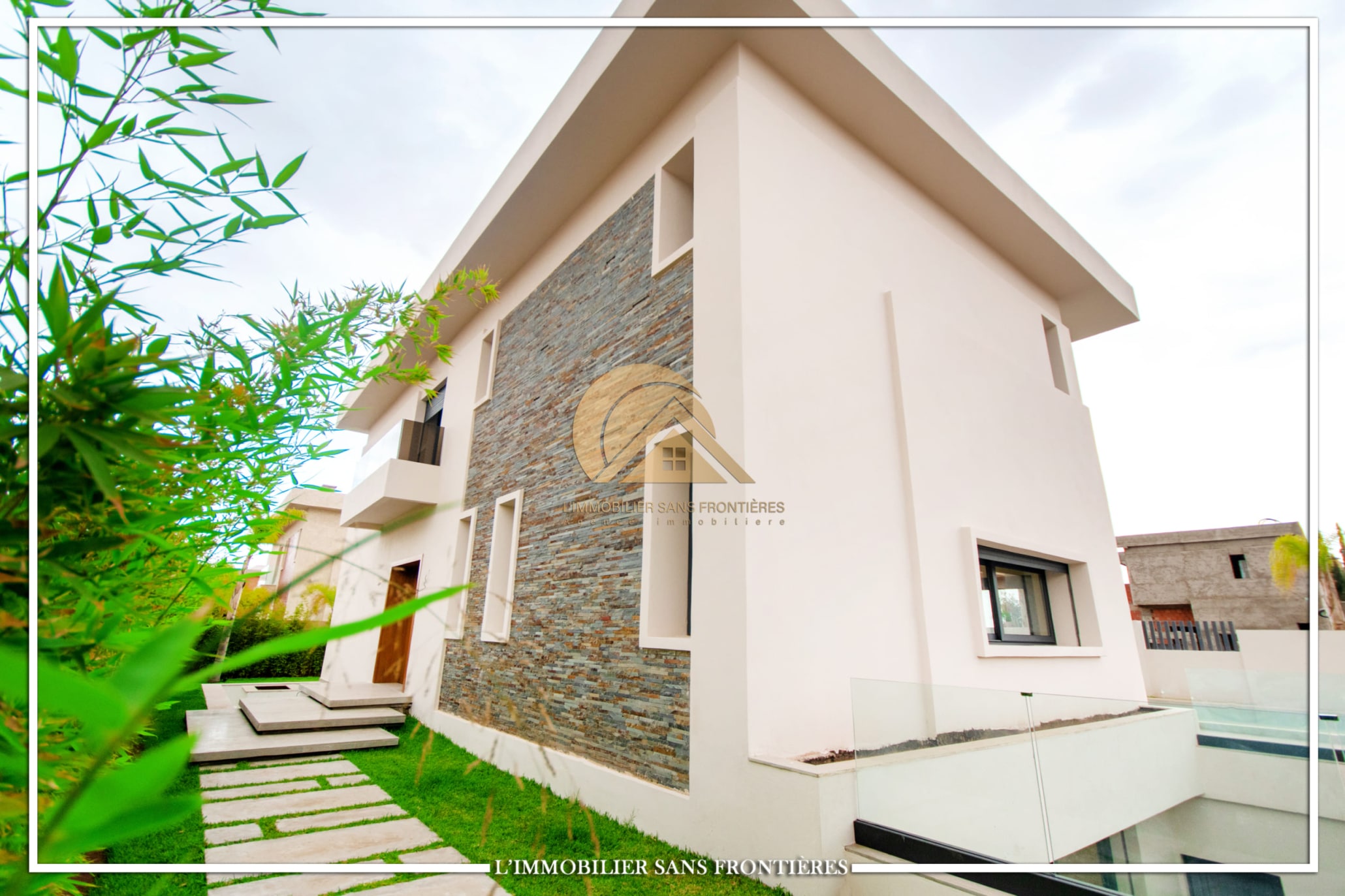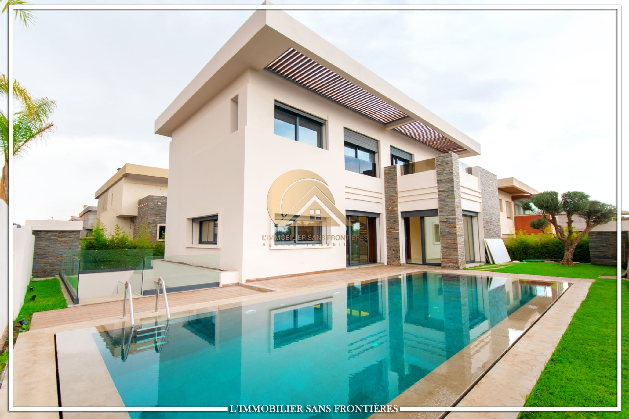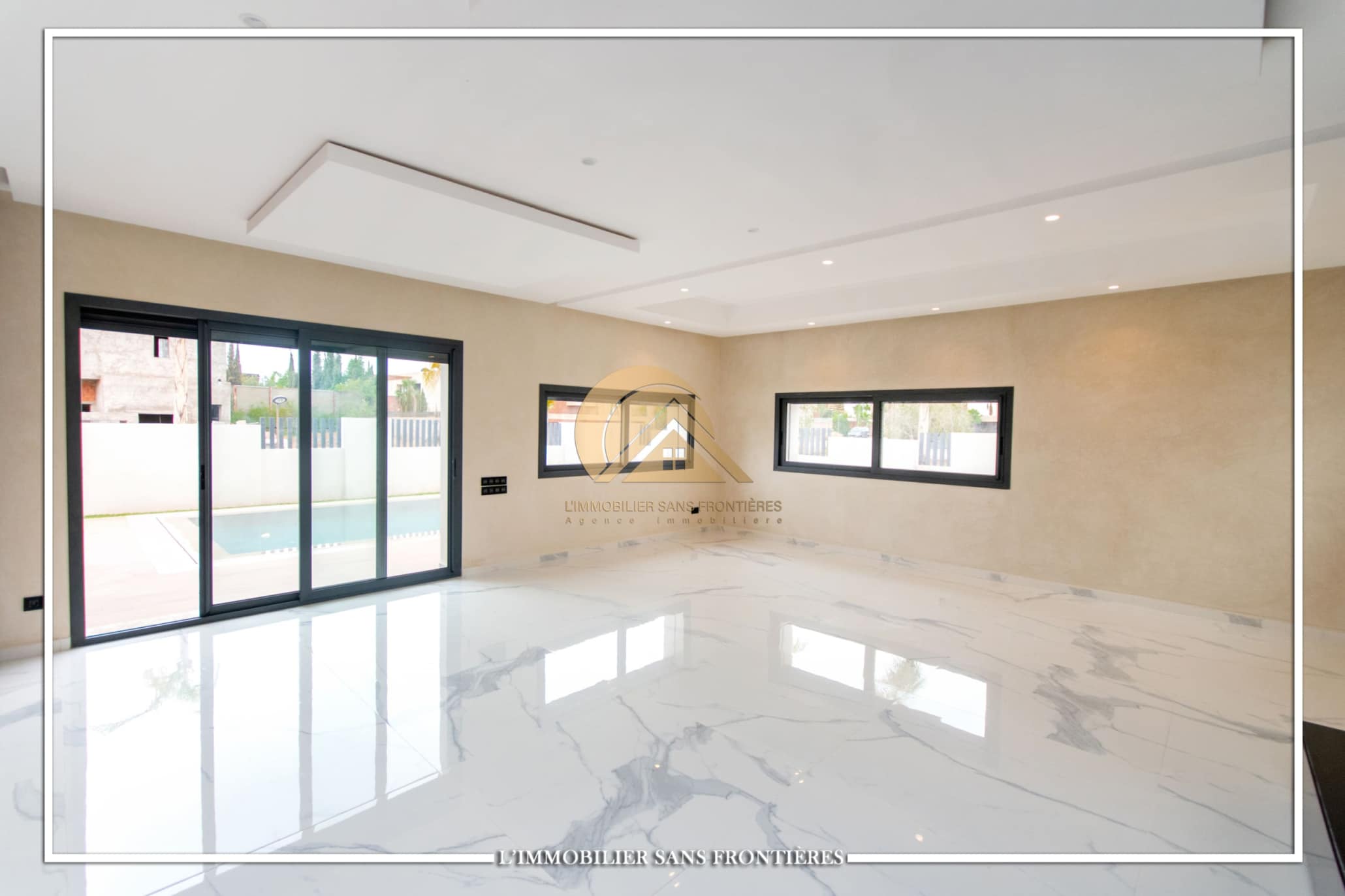 Real Estate Without Borders offers for rent this modern villa on Route d’Ourika in Marrakech, within a golf residence. Unfurnished villa on a 500 m² plot with 450 m² of living space, featuring a private pool and landscaped garden; availability indicated in August.