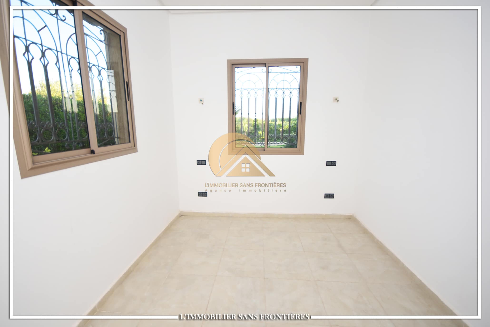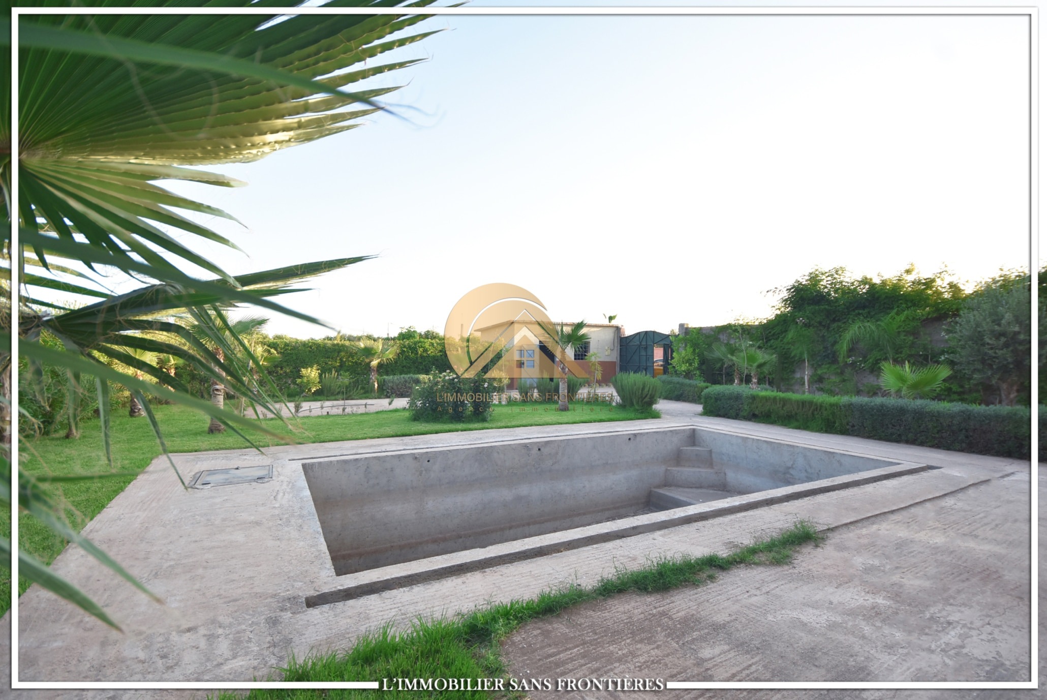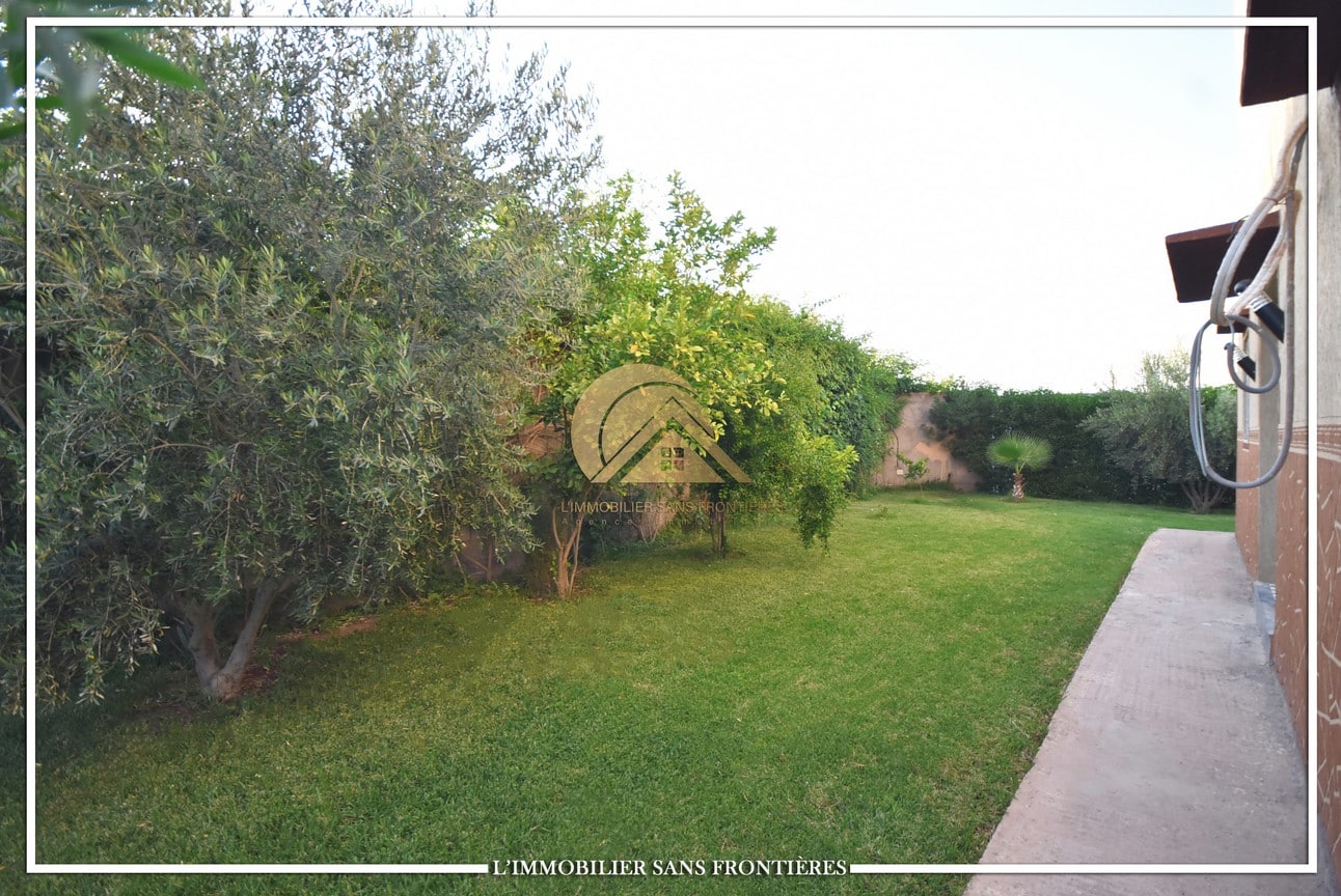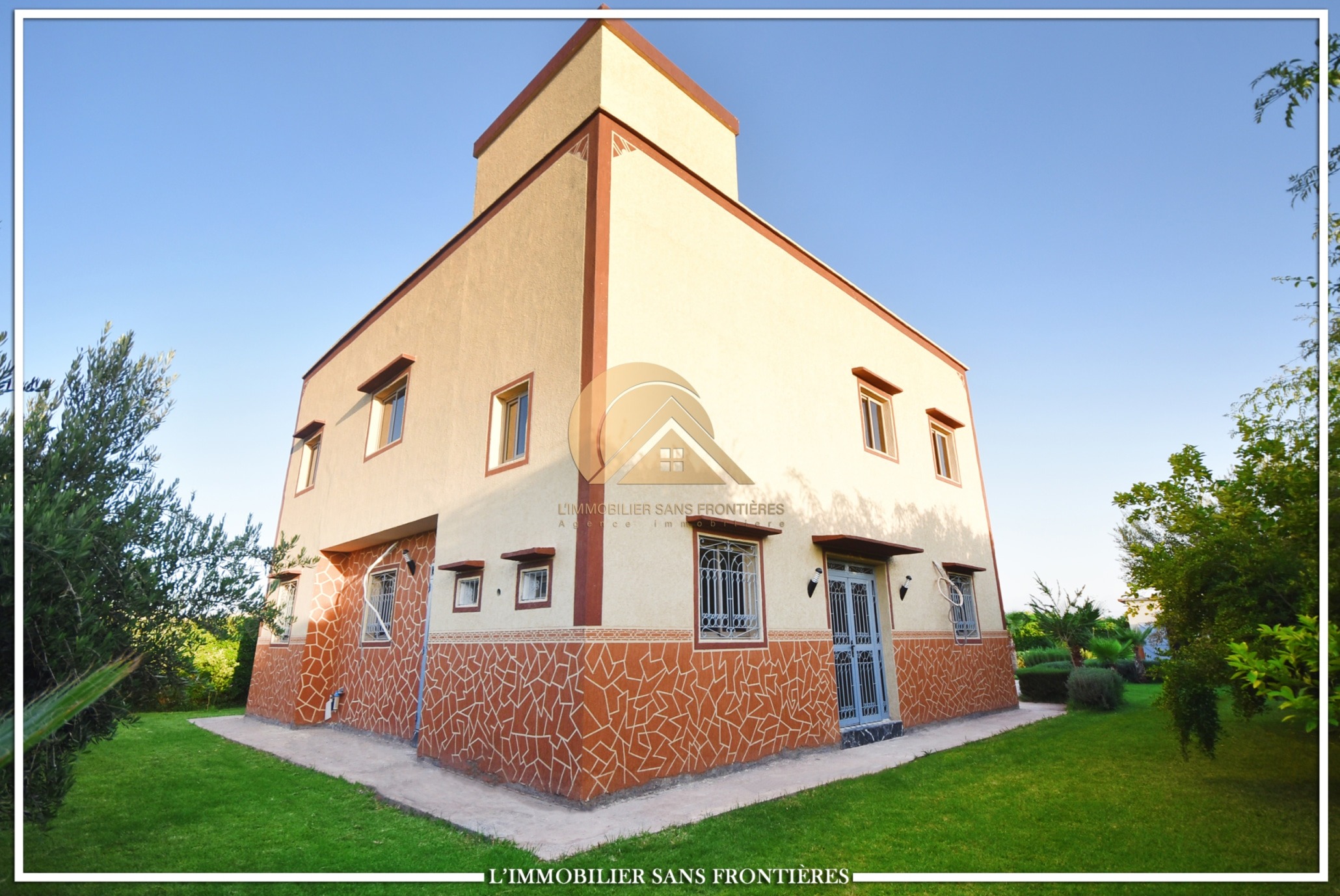 Real Estate Without Borders offers this private unfurnished villa for rent on Route de Fès at km19. The text indicates a private pool and a landscaped garden, with a layout used for special events. Unfurnished villa on 1000m² land including 160m² living area.