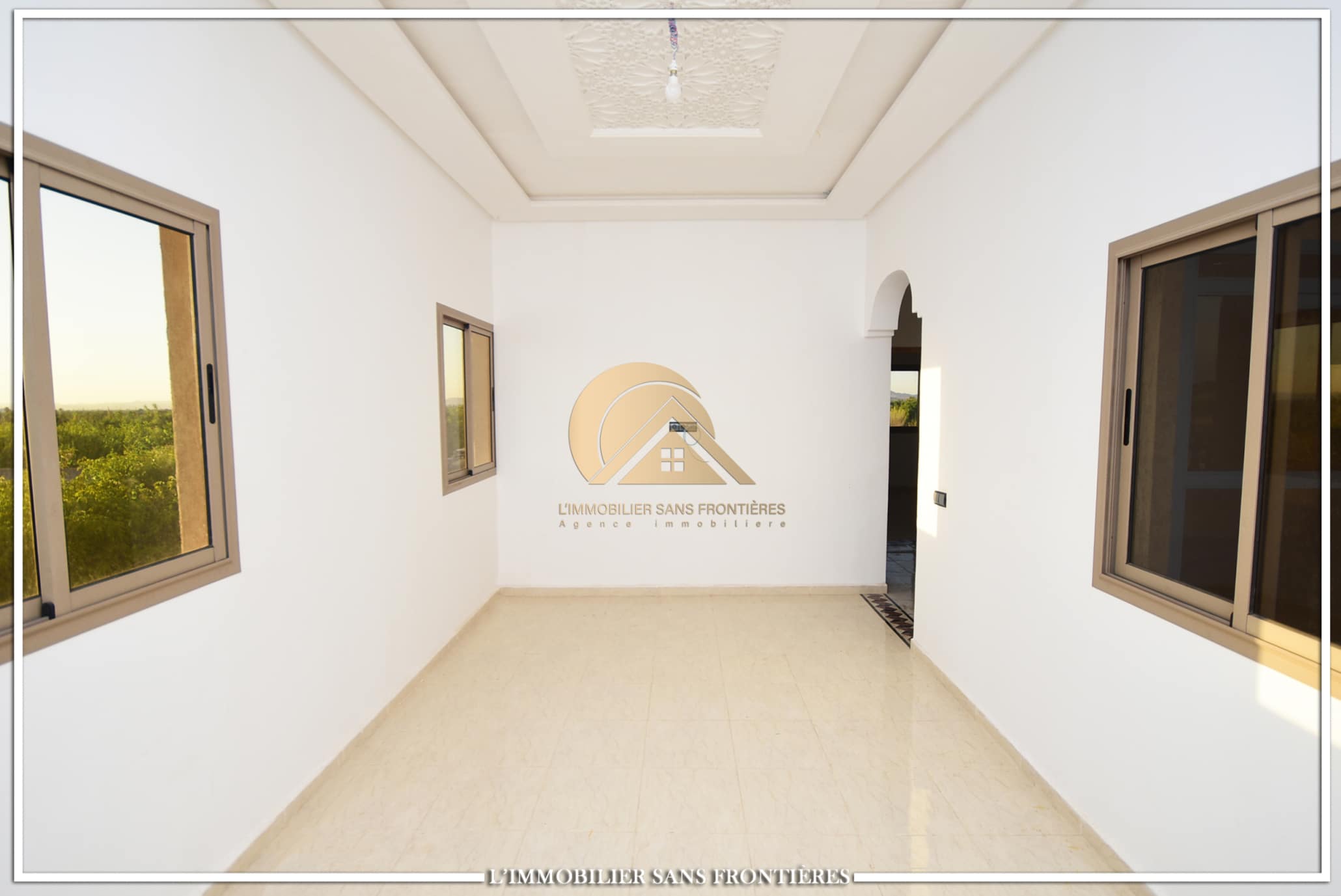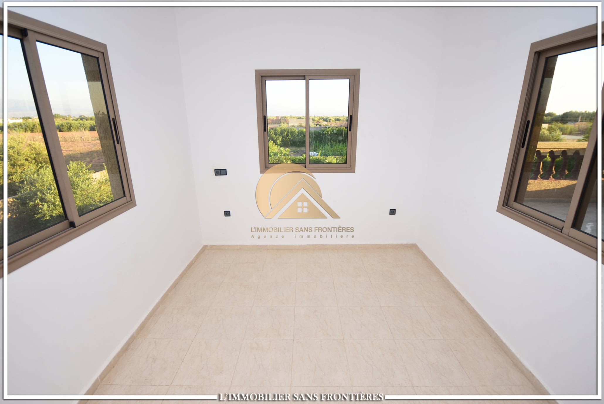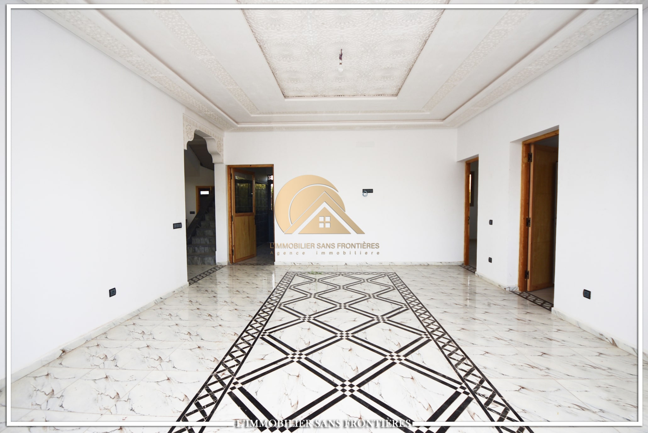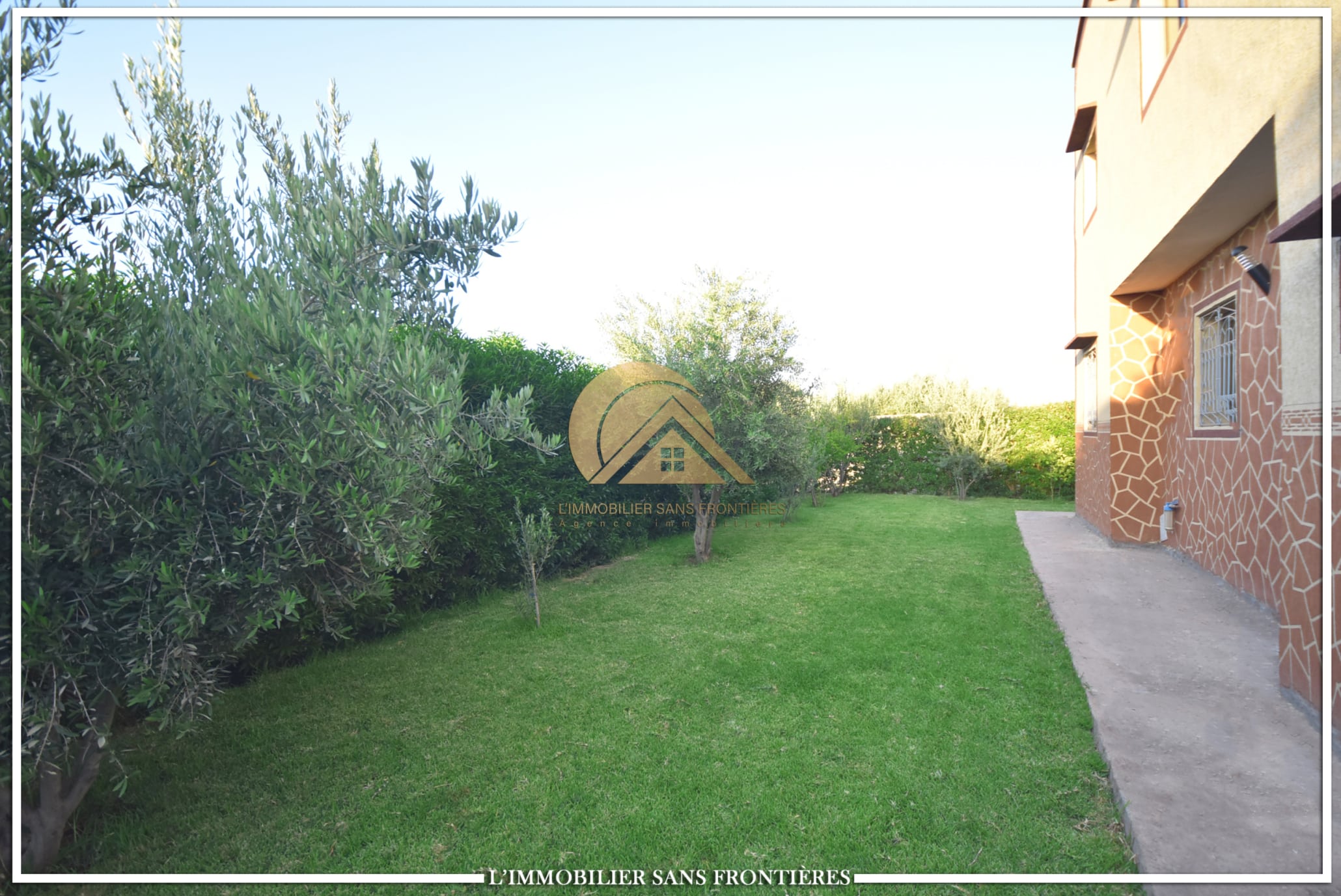 Real Estate Without Borders offers this private unfurnished villa for rent on Route de Fès at km19. The text indicates a private pool and a landscaped garden, with a layout used for special events. Unfurnished villa on 1000m² land including 160m² living area.