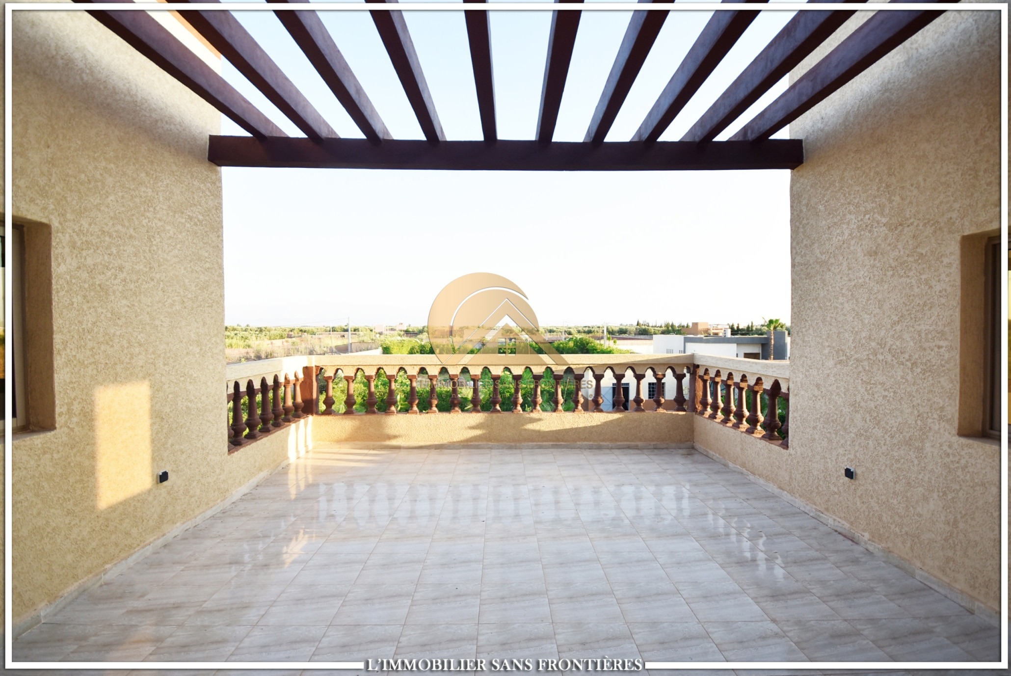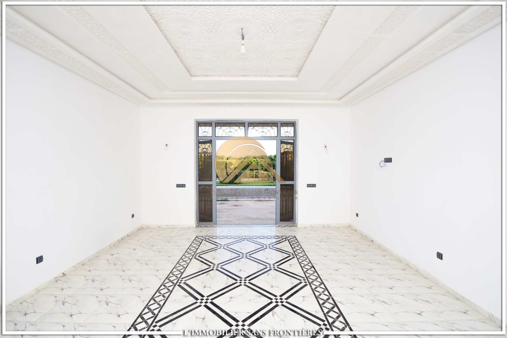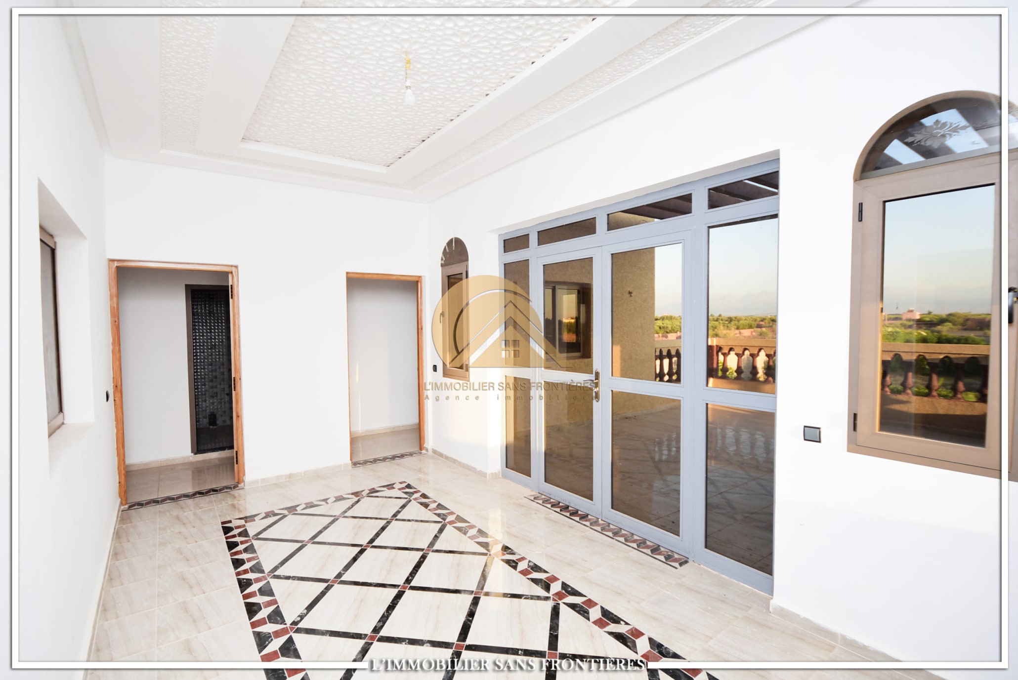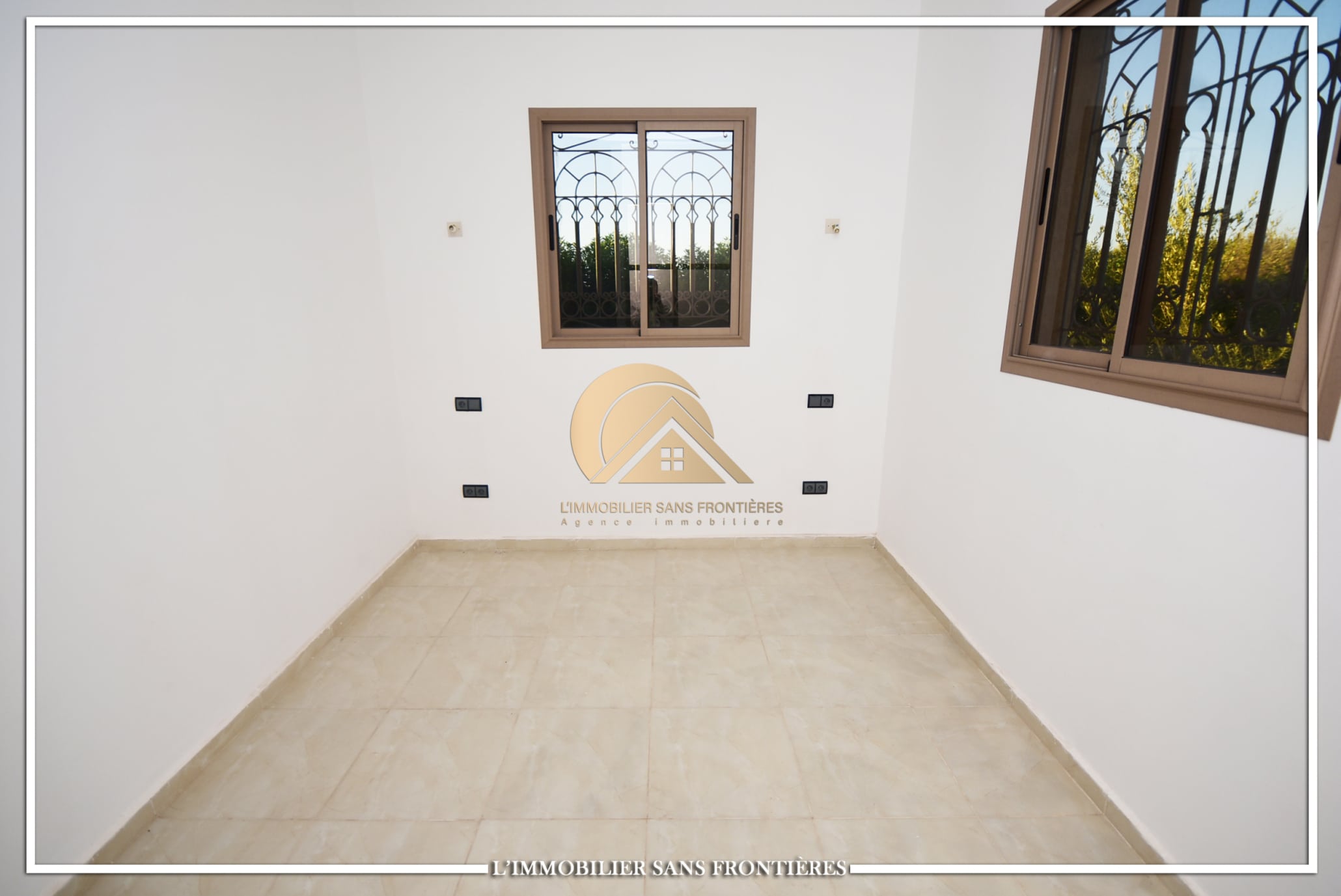 Real Estate Without Borders offers this private unfurnished villa for rent on Route de Fès at km19. The text indicates a private pool and a landscaped garden, with a layout used for special events. Unfurnished villa on 1000m² land including 160m² living area.