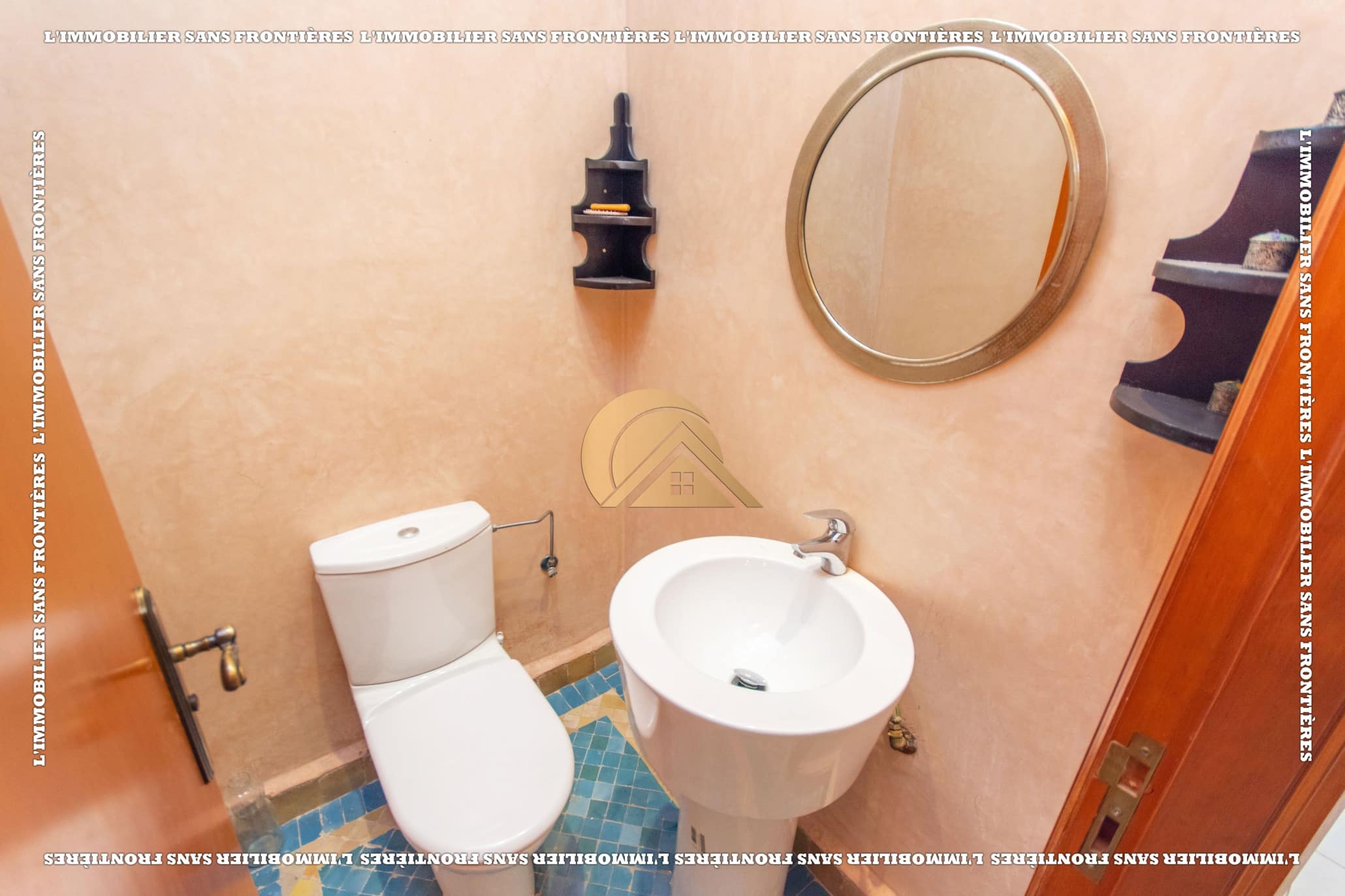 Ground floor: Moroccan living room – Bright European living room with a wood fireplace – Bay window opening onto the terrace – Guest toilet – Equipped kitchen – Laundry room – Staff room with bathroom