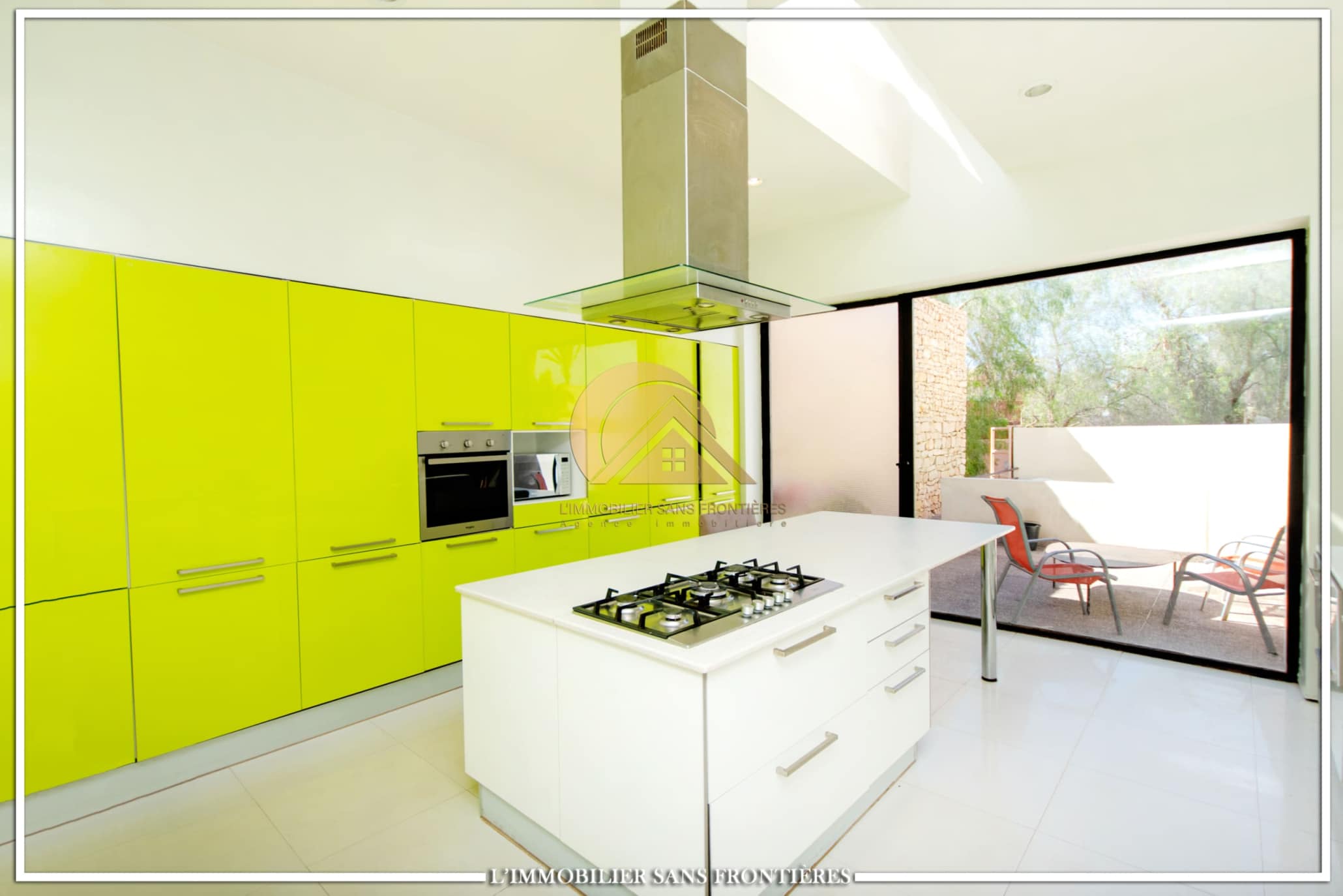 Double living rooms – Dining room for 12 – Suspended fireplace with floor-level hearth – 6 suites with bathrooms – Reading room – Library with panoramic Atlas view – Outdoor dining for 12 facing the pool – Large well-equipped kitchen – Relaxation kiosk overlooking the orchard and the pool – Home cinema room – Hammam – Separate staff annexes