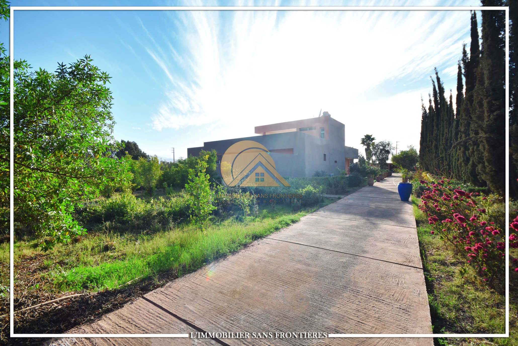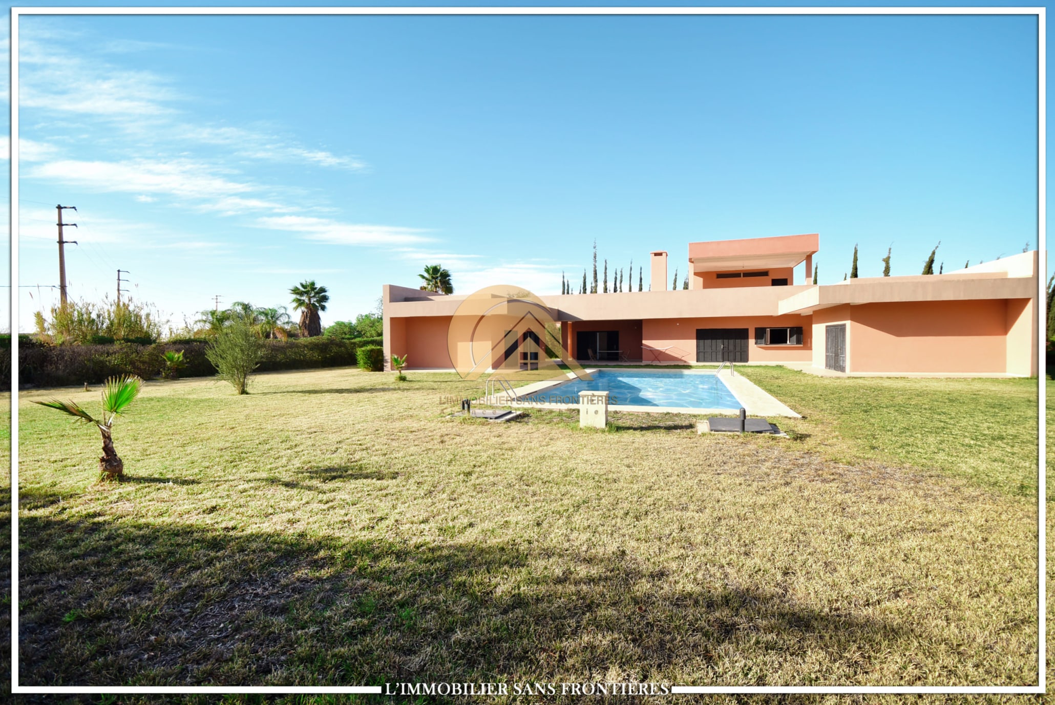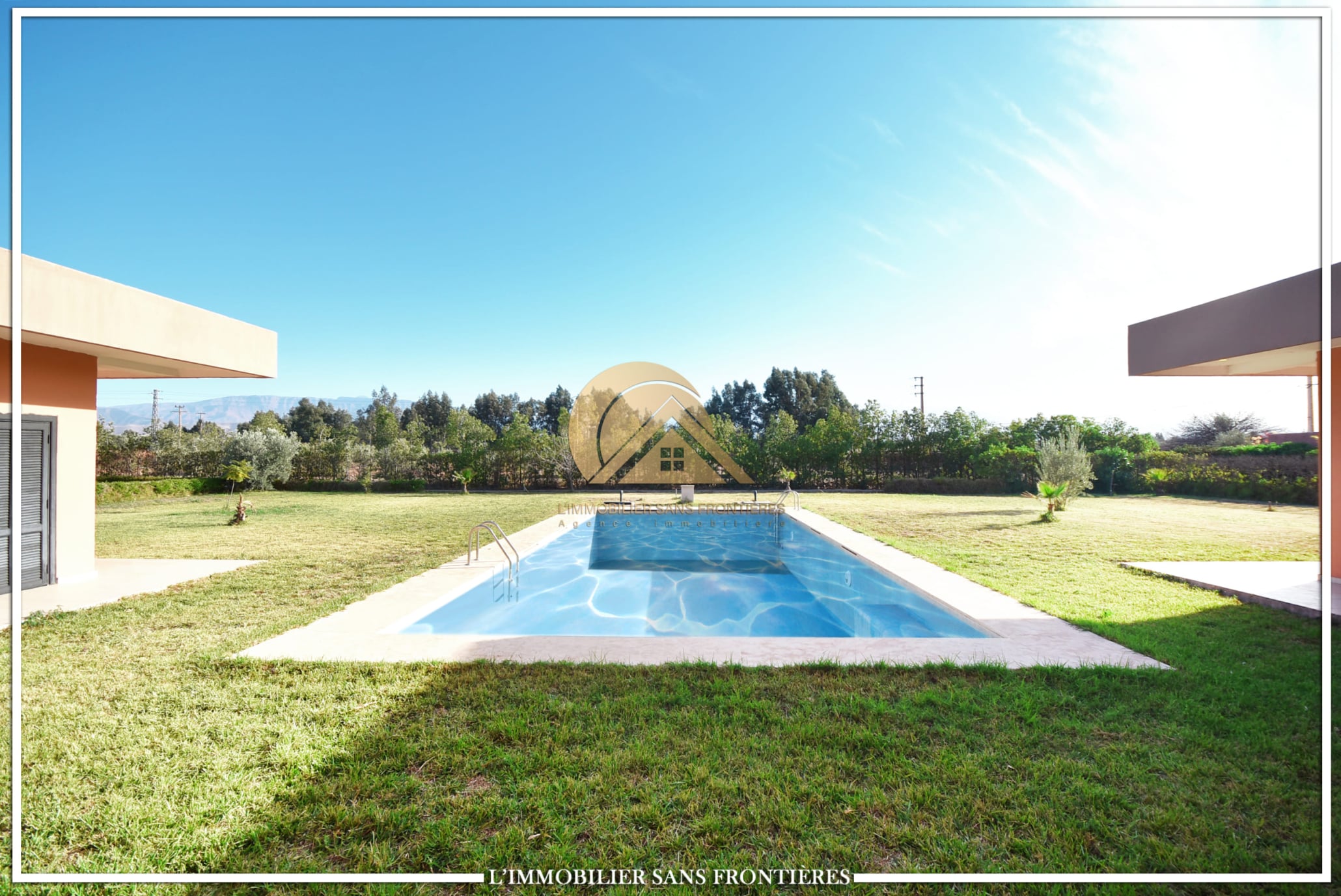 Real Estate Without Borders offers this unfurnished villa for sale on Sidi Abdellah Ghiat, Route Ourika km 21, Marrakech. The text mentions a single-level villa with a private pool and a landscaped private garden.