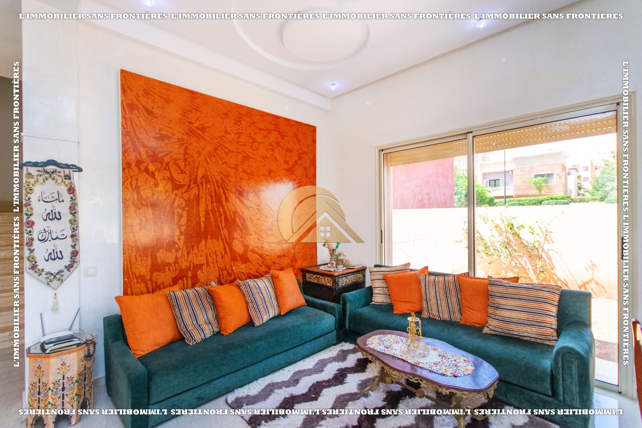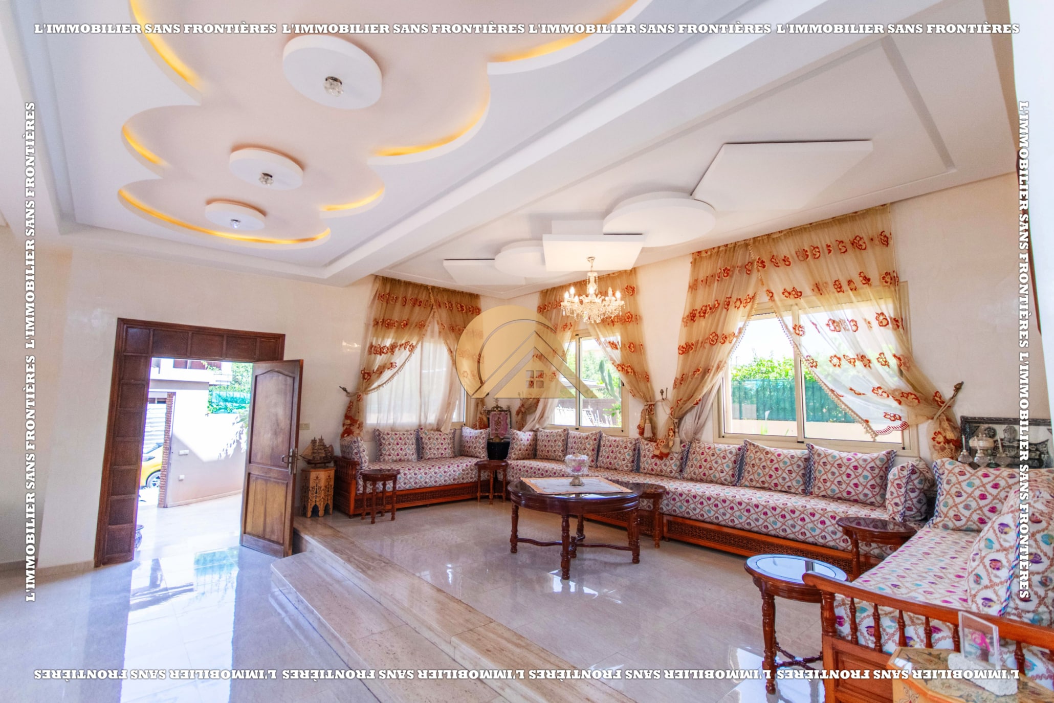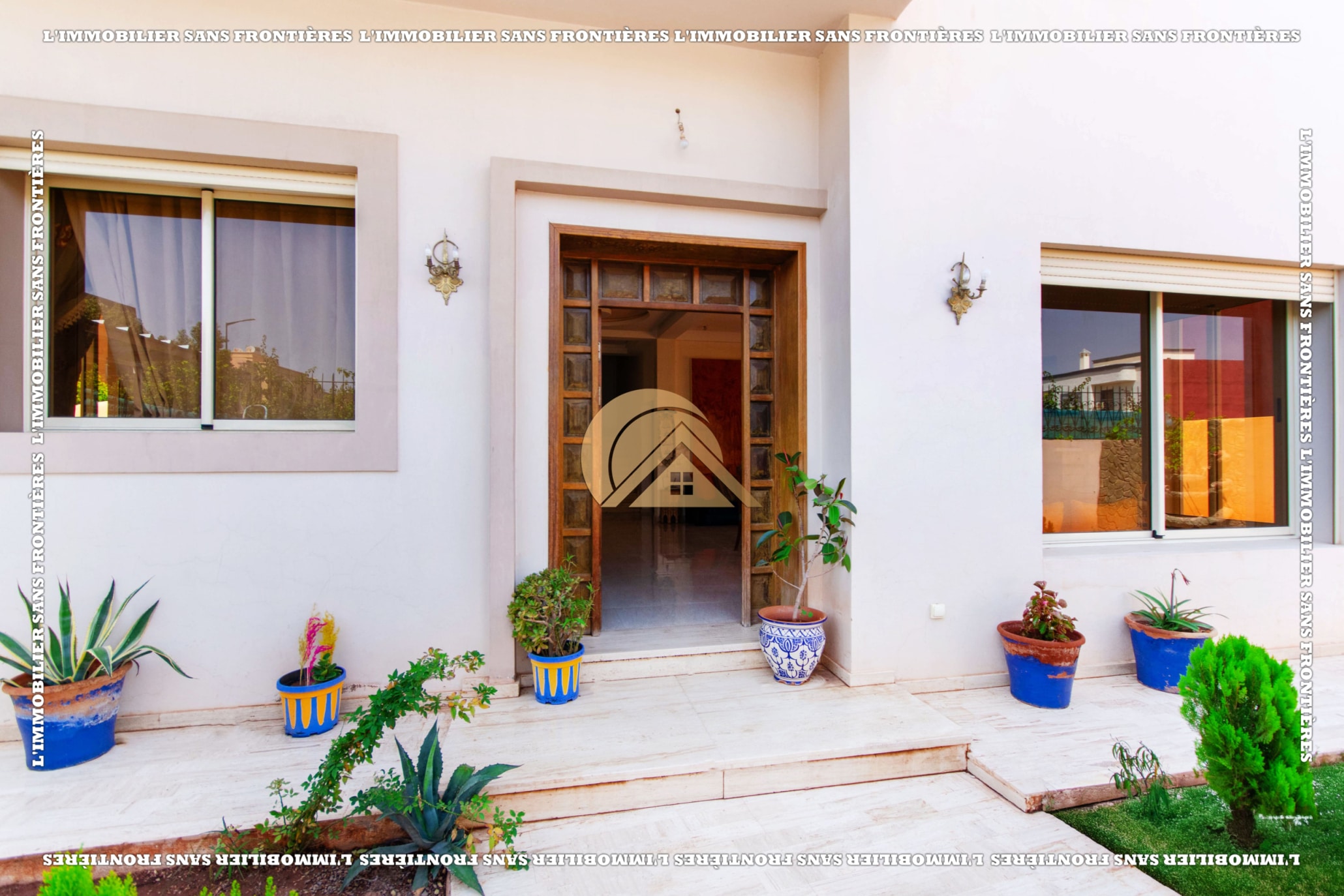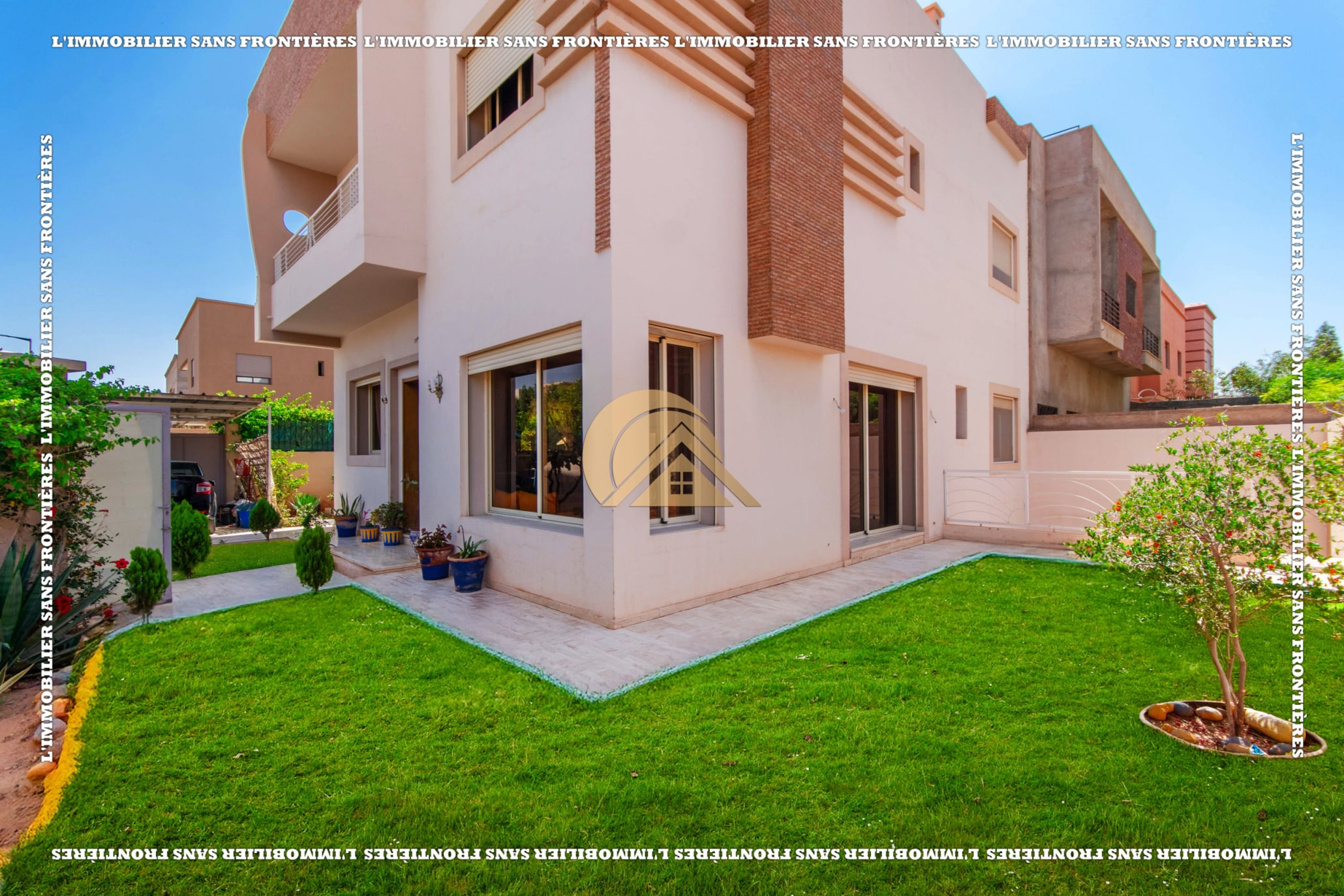 Real Estate Without Borders offers this villa for sale in Les Portes de Marrakech, in a setting described as peaceful, sunny and residential. 351 m² land and 320 m² living, with a private garden and garage.