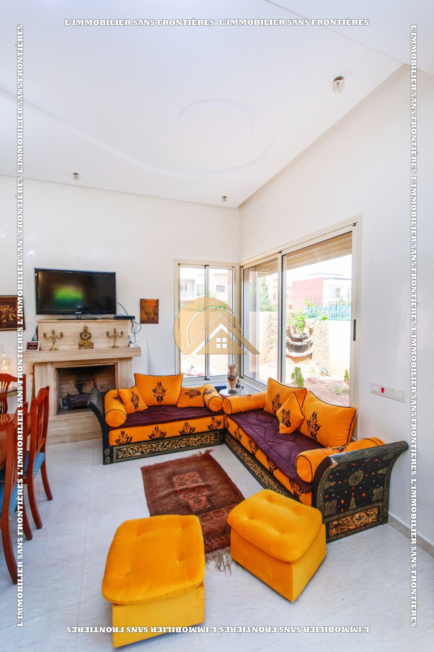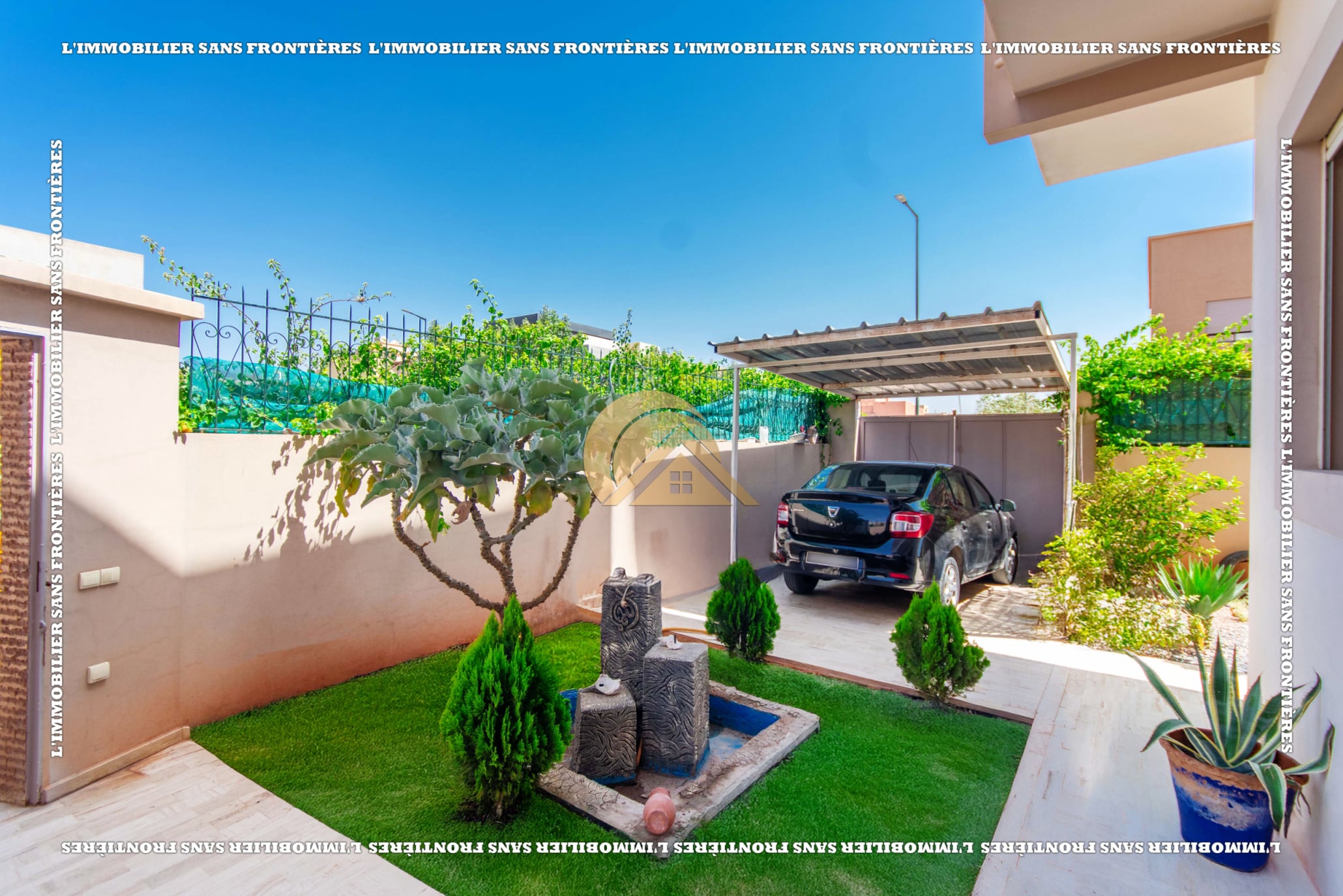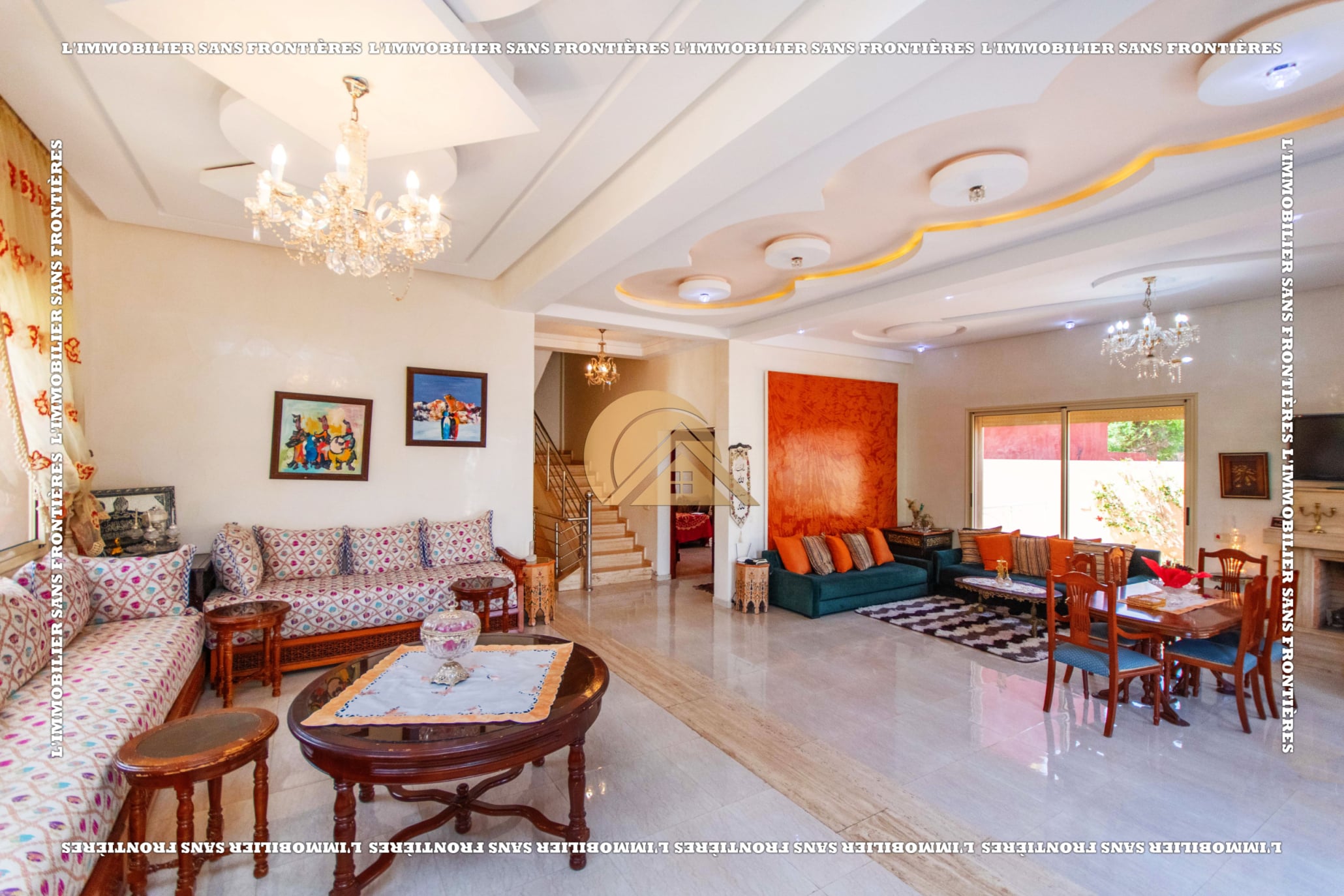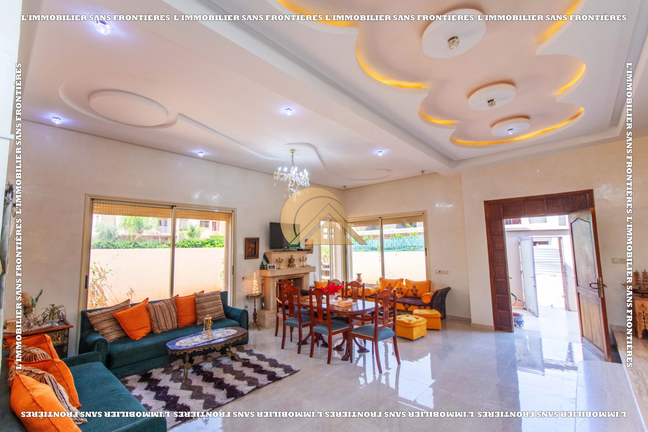 Real Estate Without Borders offers this villa for sale in Les Portes de Marrakech, in a setting described as peaceful, sunny and residential. 351 m² land and 320 m² living, with a private garden and garage.