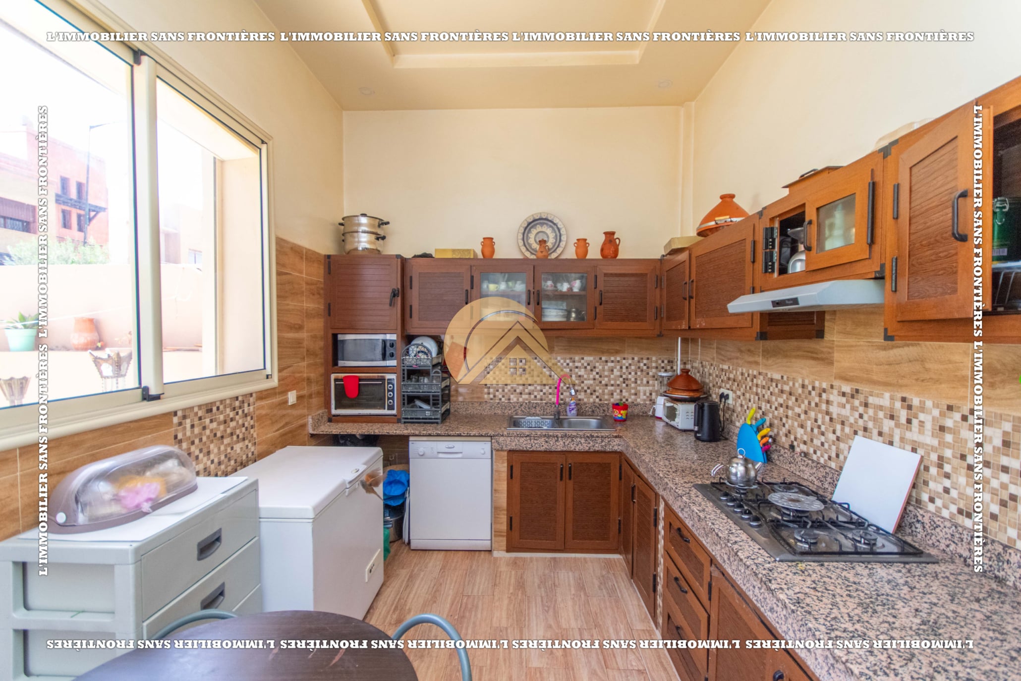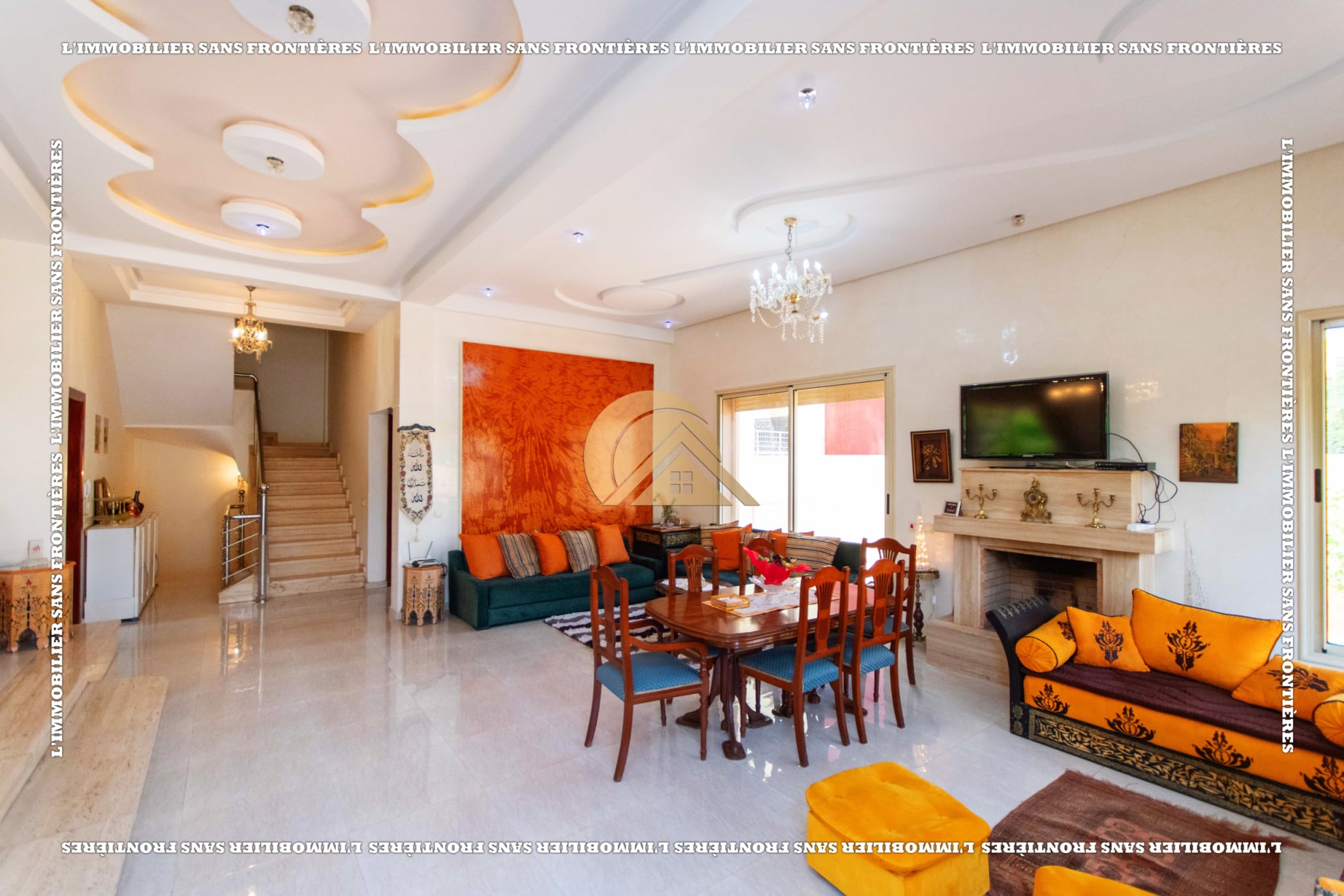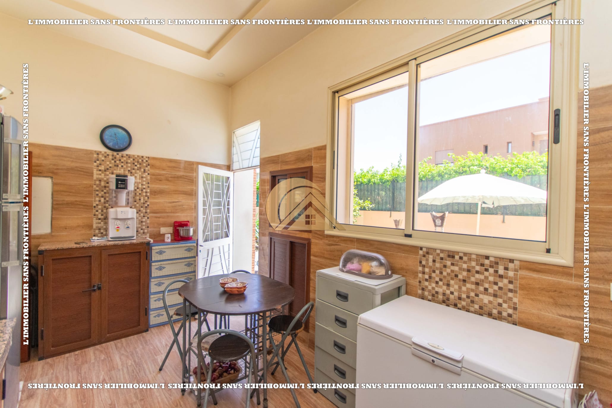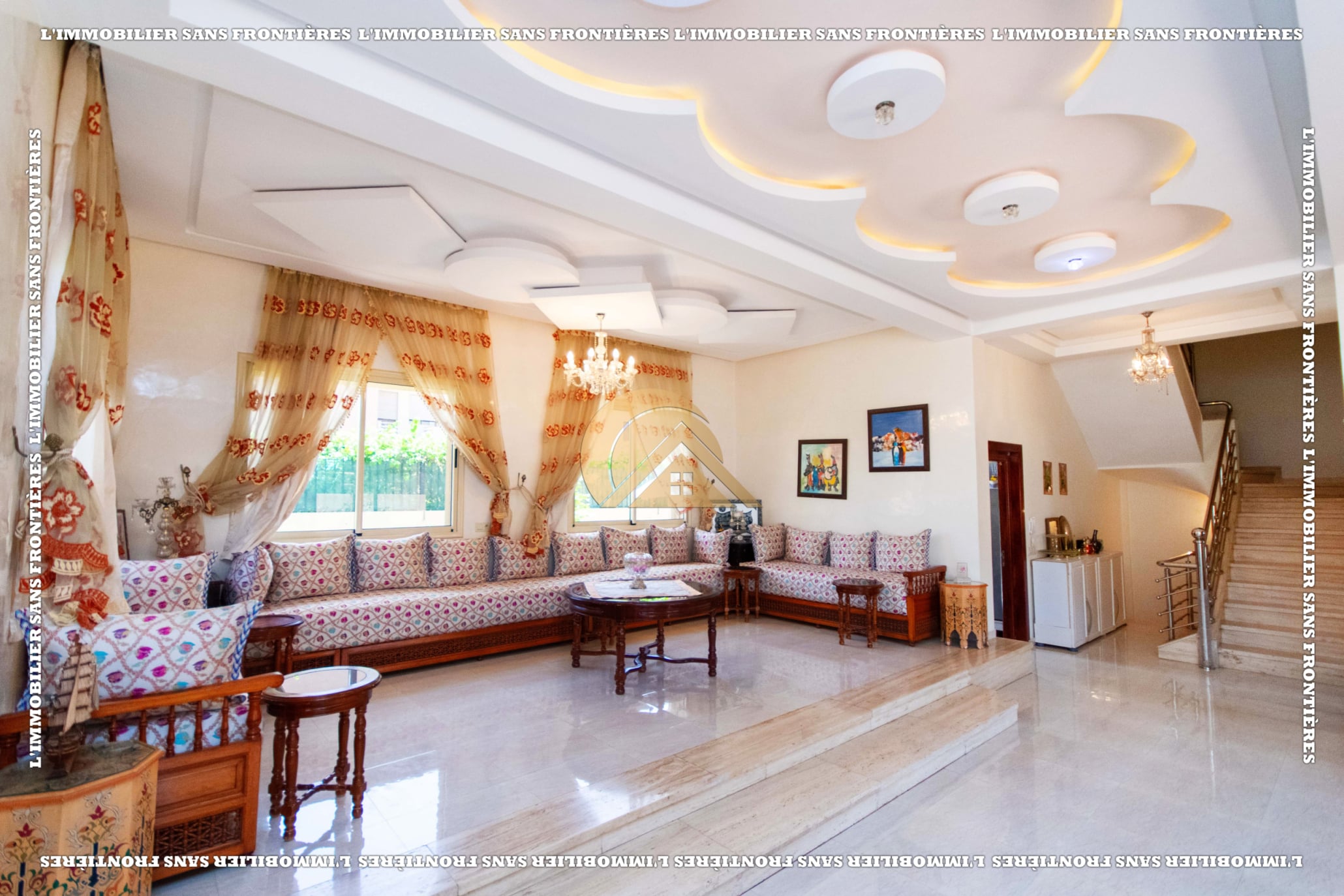 Real Estate Without Borders offers this villa for sale in Les Portes de Marrakech, in a setting described as peaceful, sunny and residential. 351 m² land and 320 m² living, with a private garden and garage.