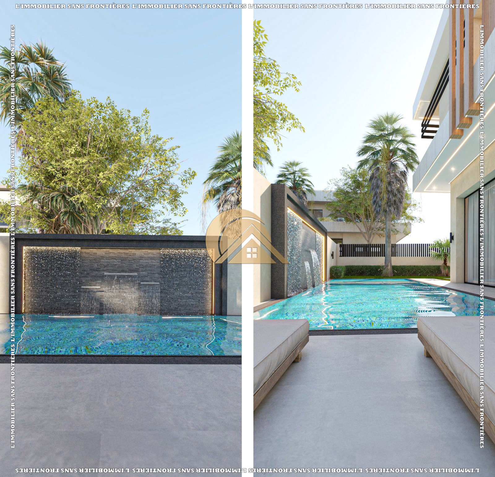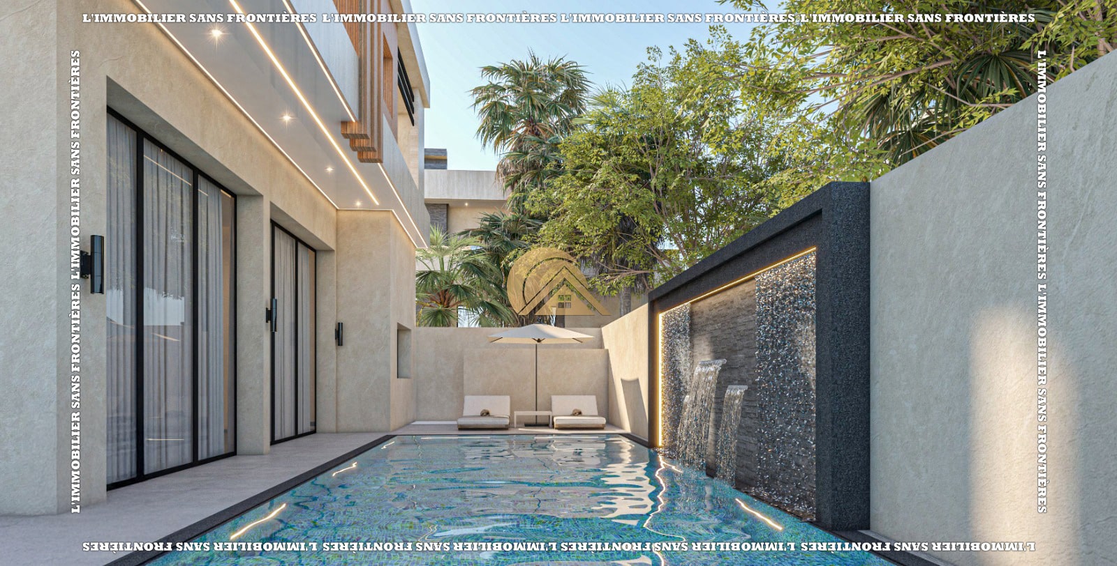 Ground floor: Living room with large bay windows and direct view of the pool – Living area – Guest toilet – Equipped kitchen – Master suite with bathroom and wardrobes