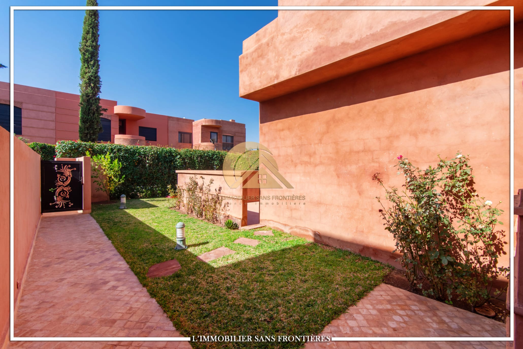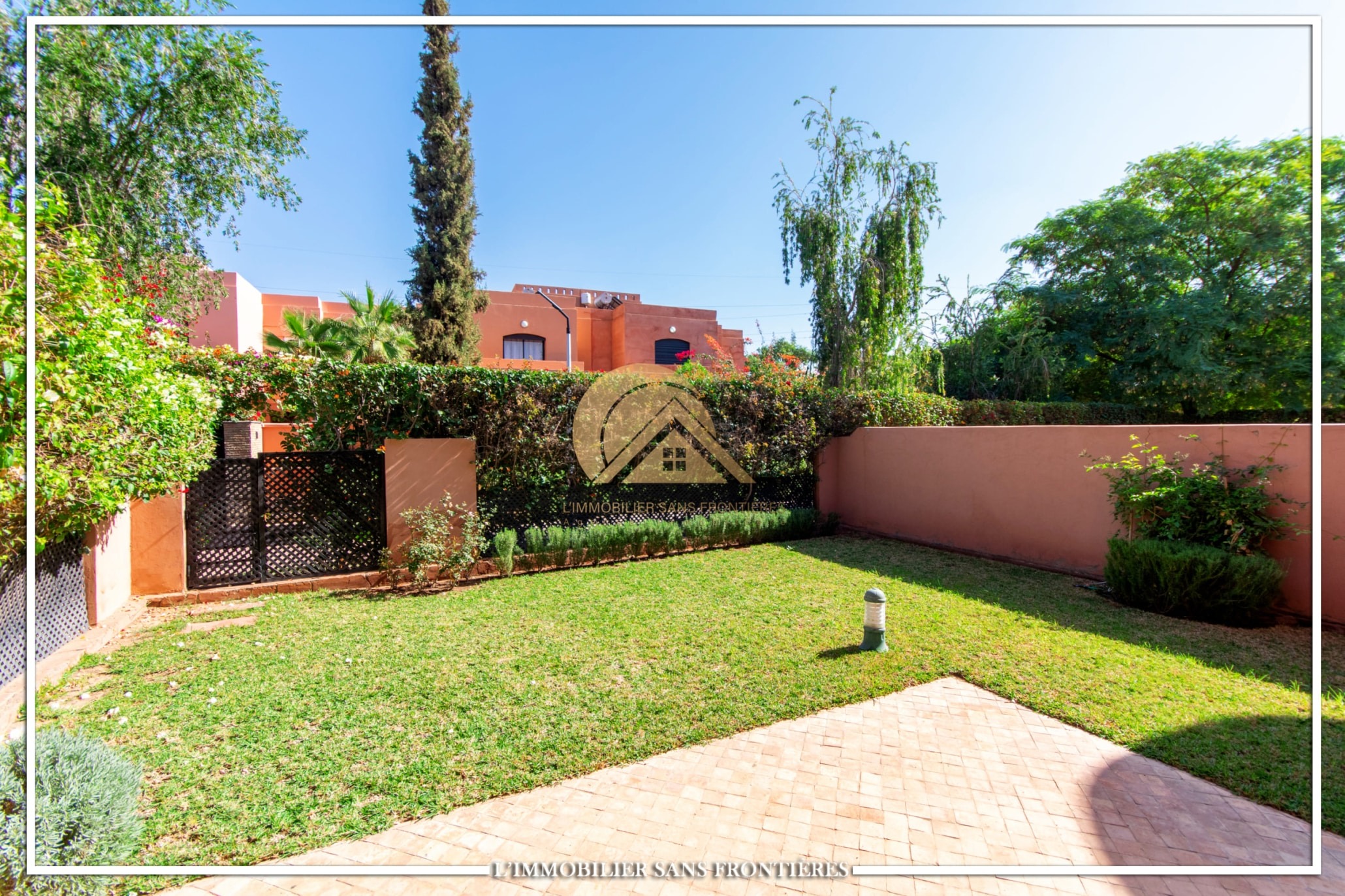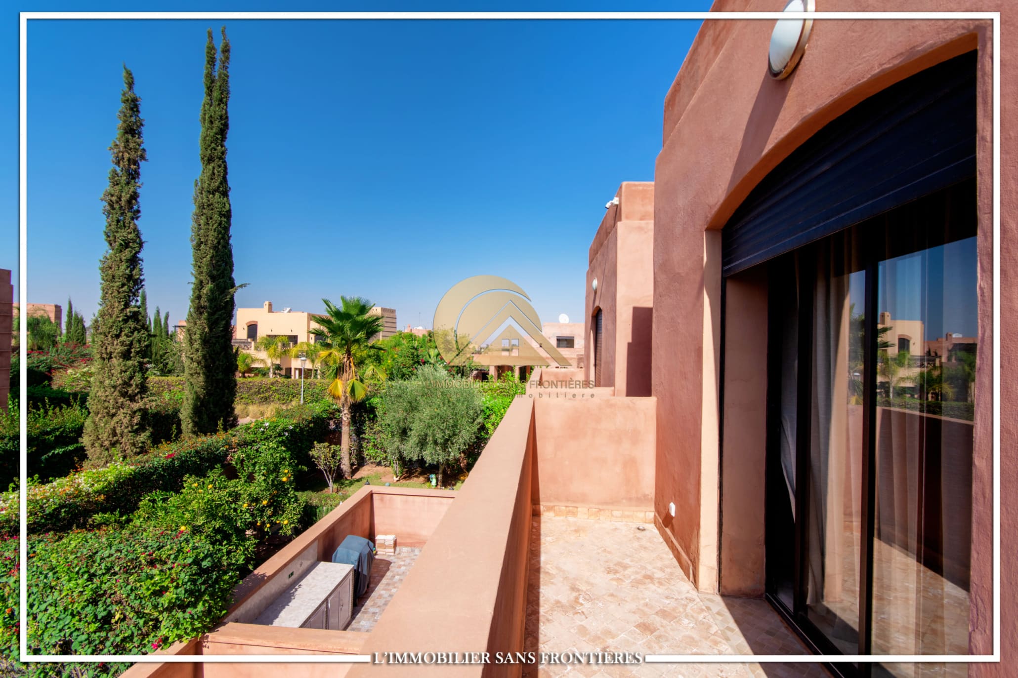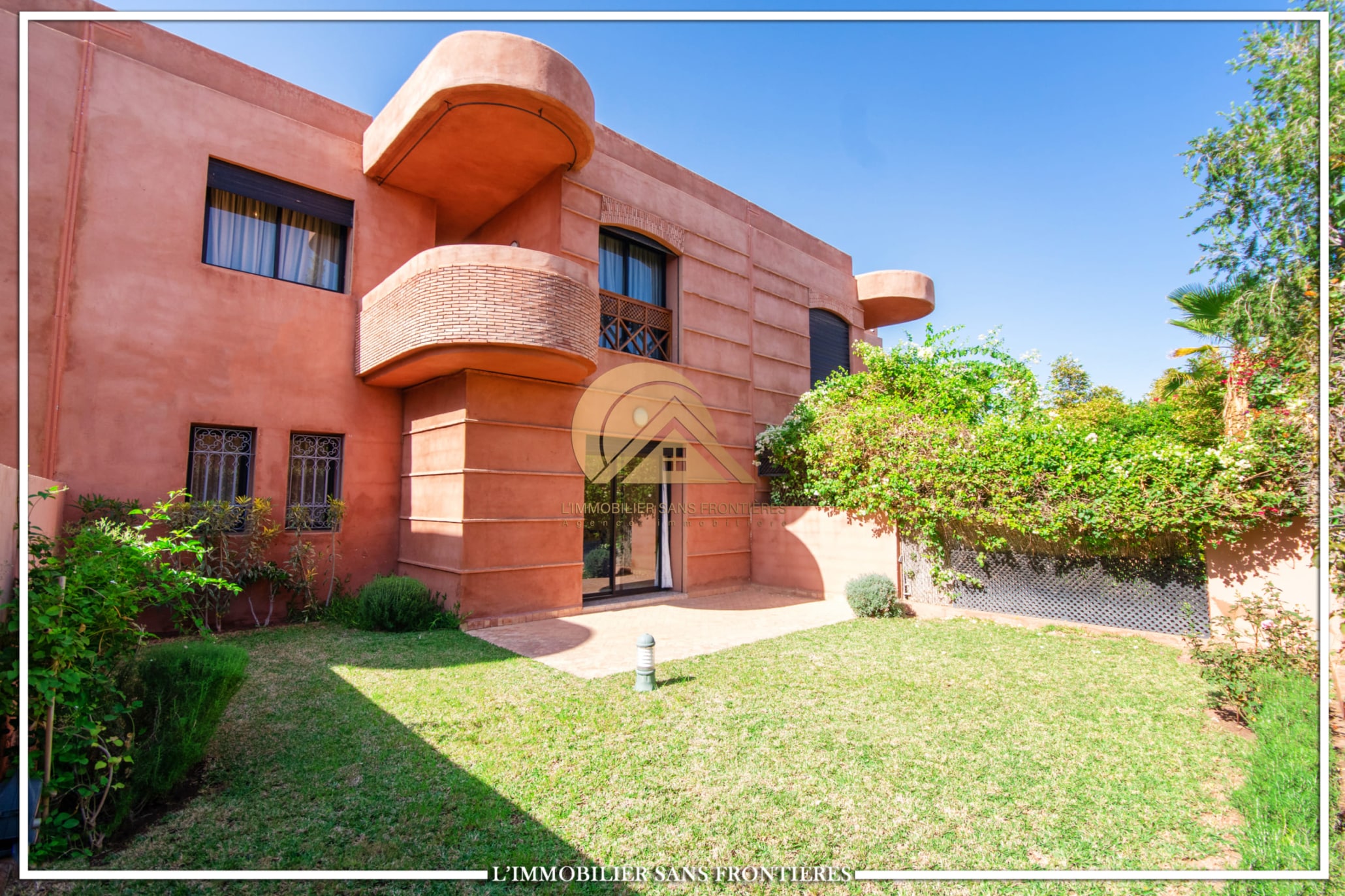 Real Estate Without Borders offers this furnished villa for rent on Route de Fes, Marrakech, located in a residence. The listing mentions a communal garden, a communal pool and a private garden. The land area is 268 m² with 200 m² of living space, and the villa benefits from complete privacy with no overlooking neighbors.