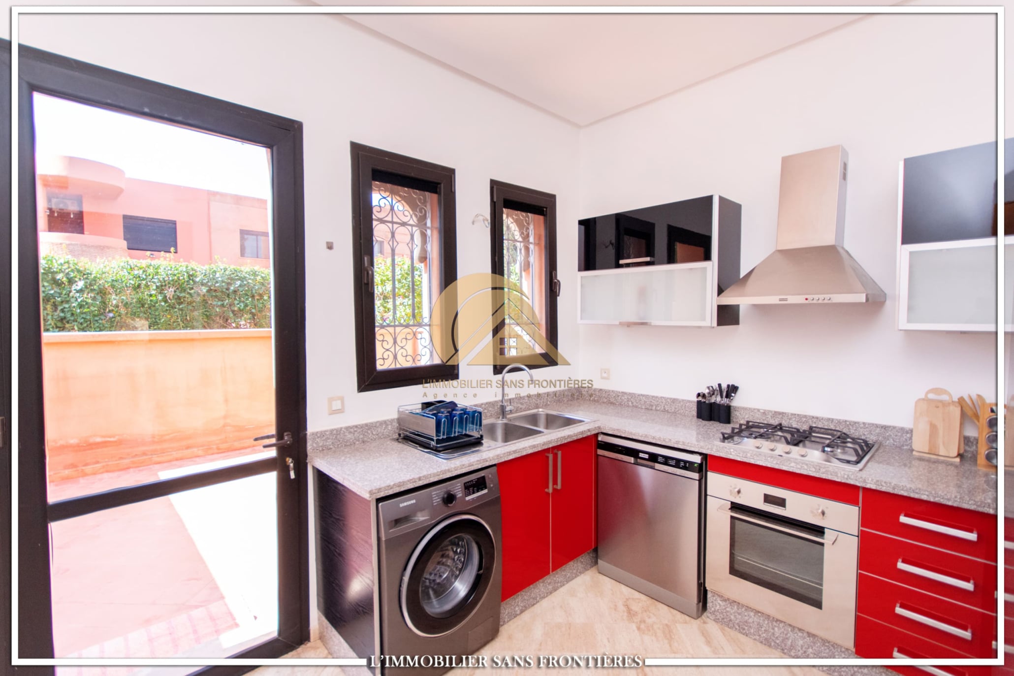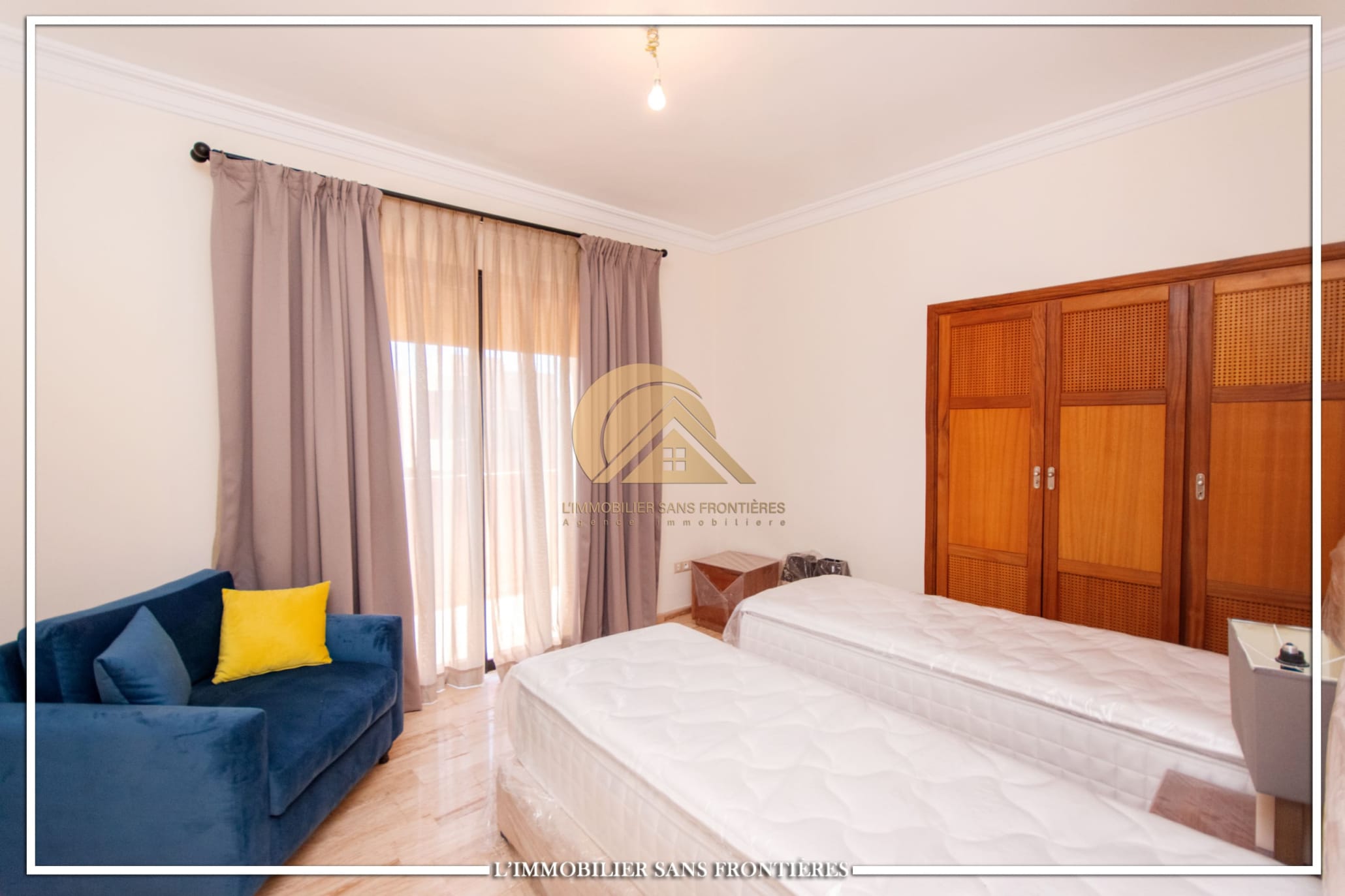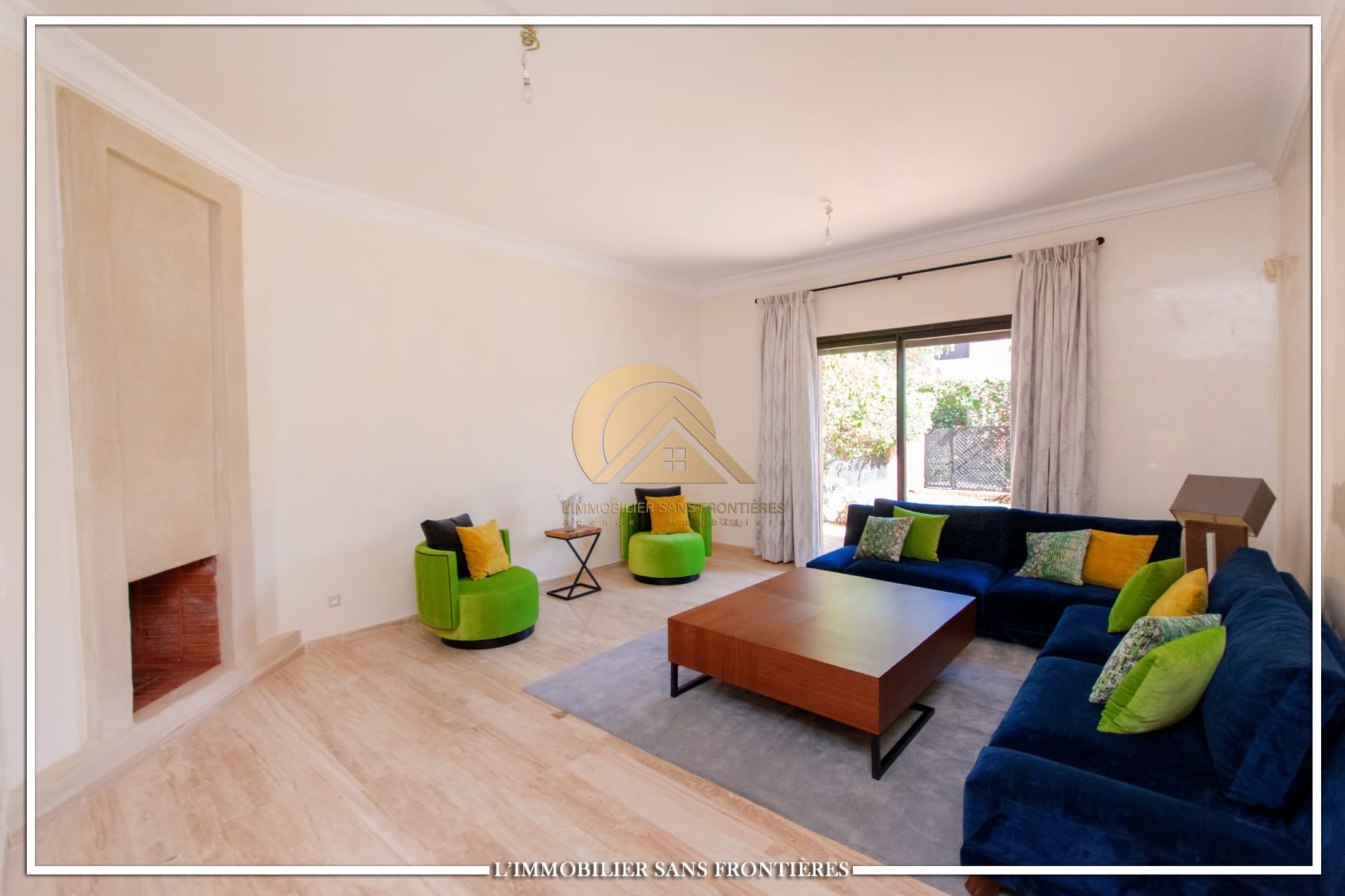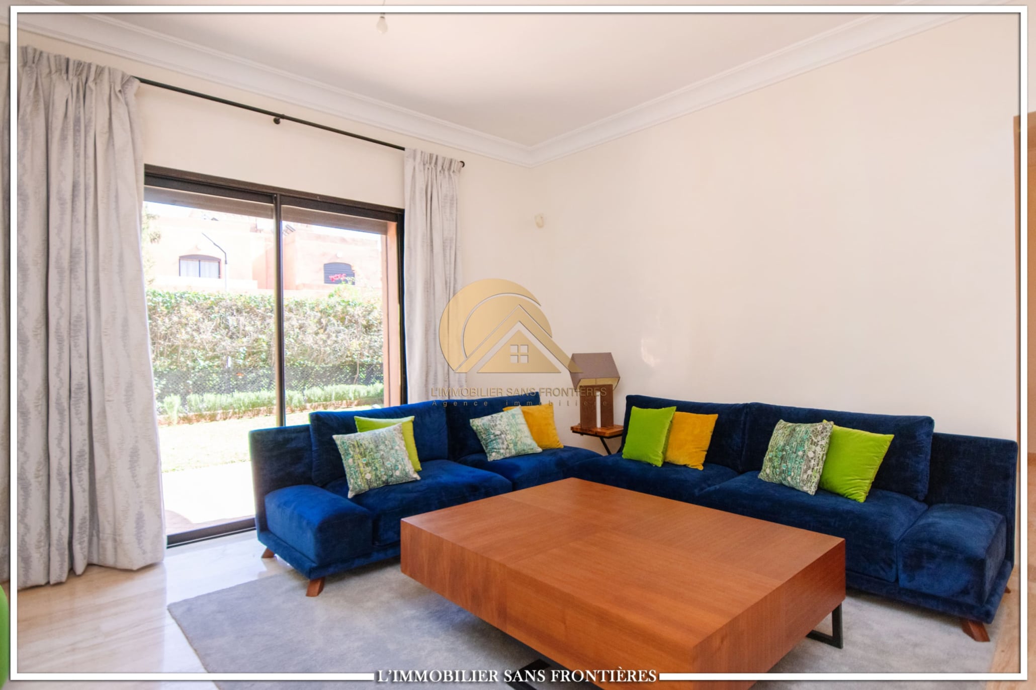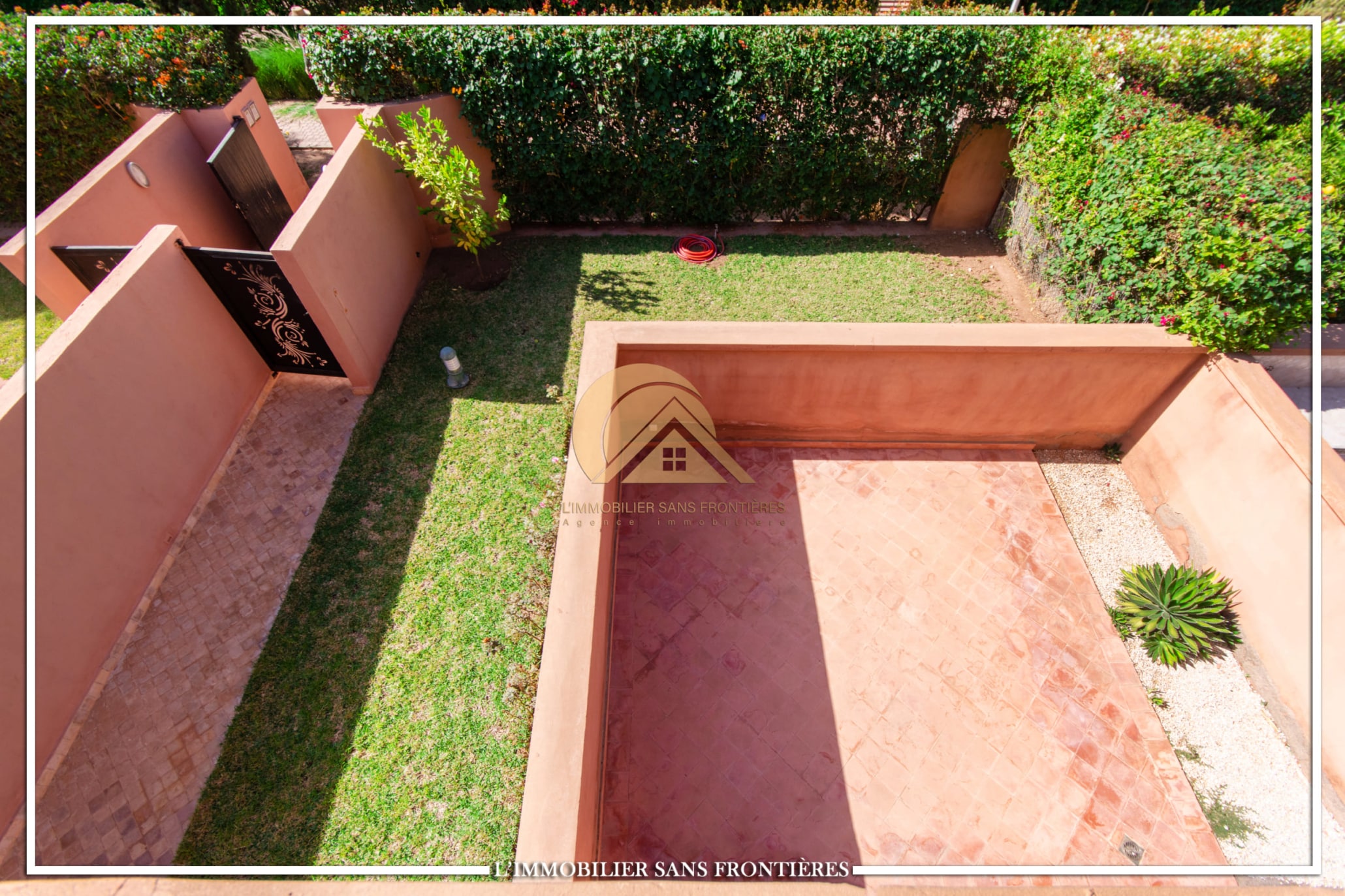 Real Estate Without Borders offers this furnished villa for rent on Route de Fes, Marrakech, located in a residence. The listing mentions a communal garden, a communal pool and a private garden. The land area is 268 m² with 200 m² of living space, and the villa benefits from complete privacy with no overlooking neighbors.