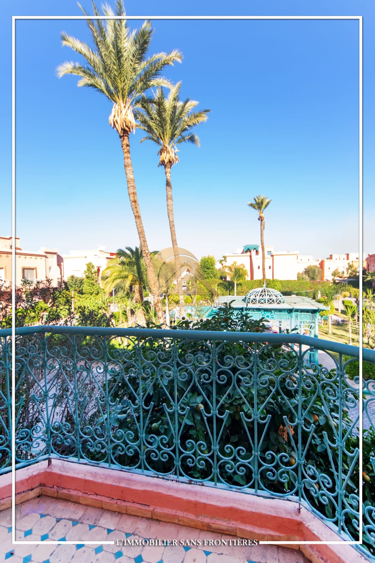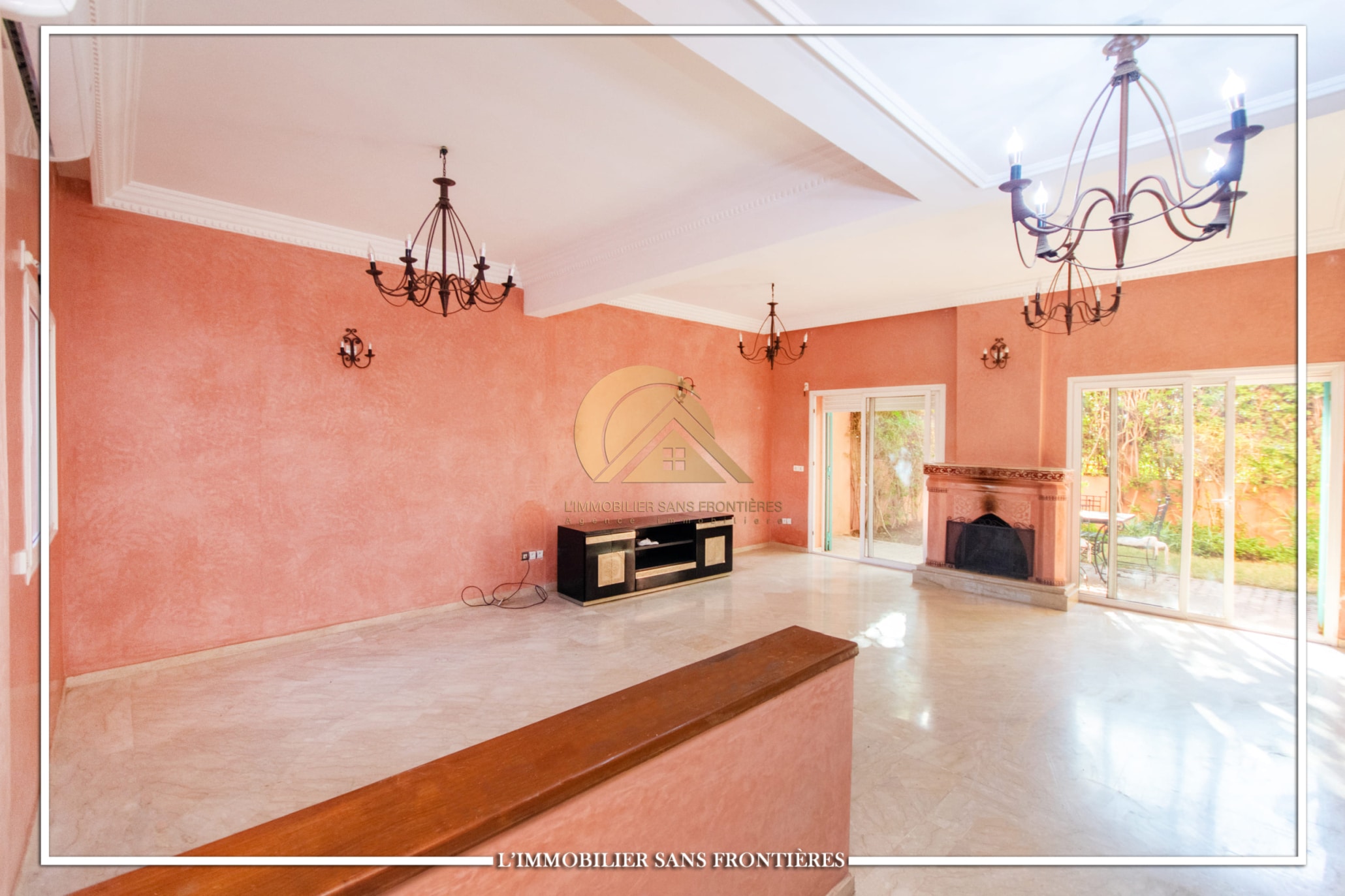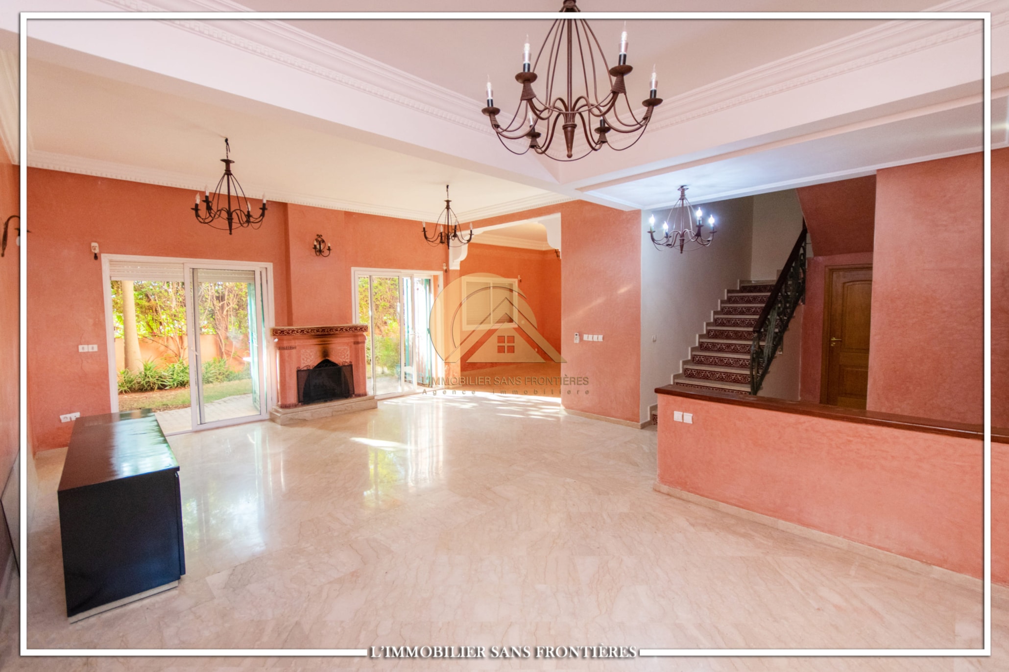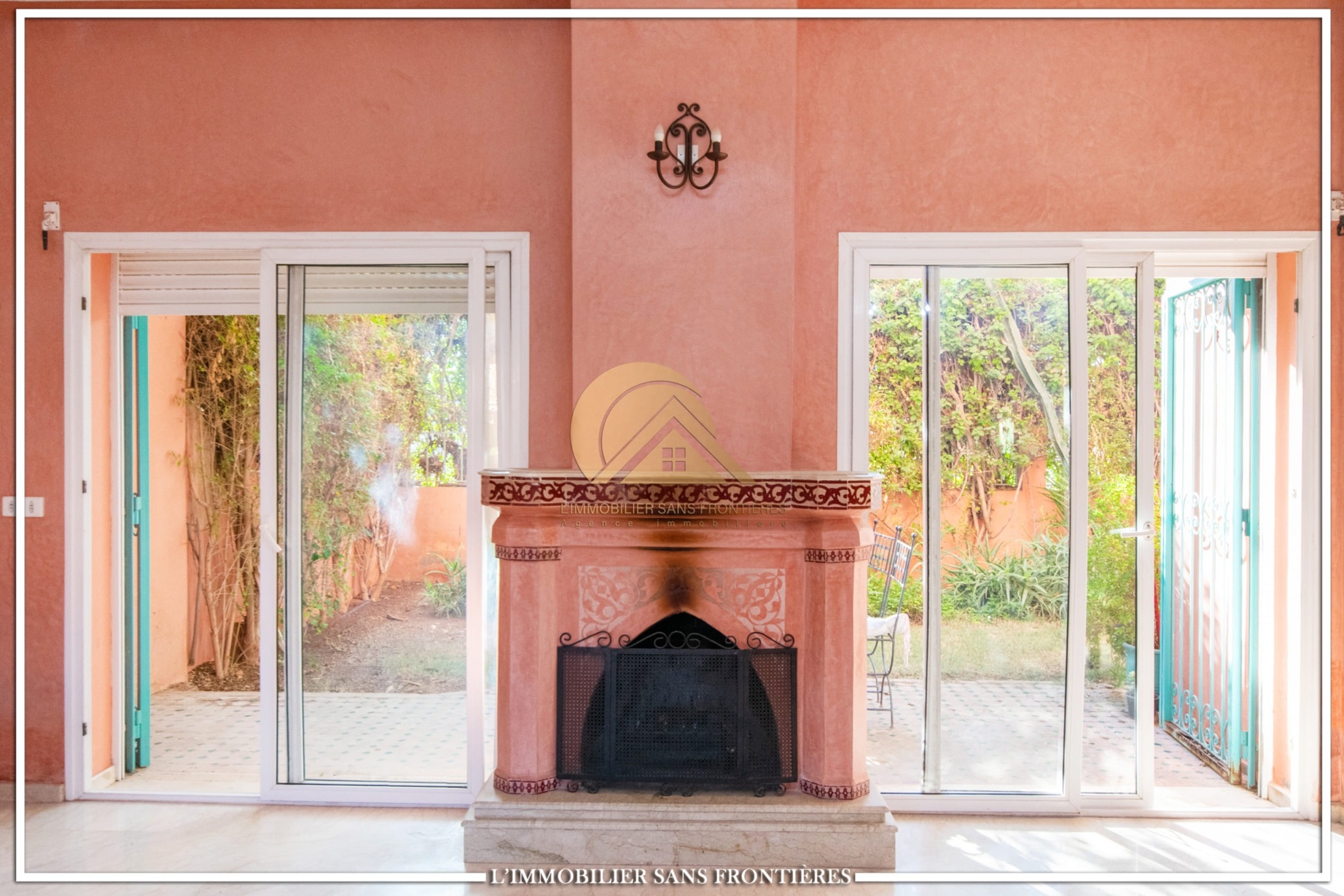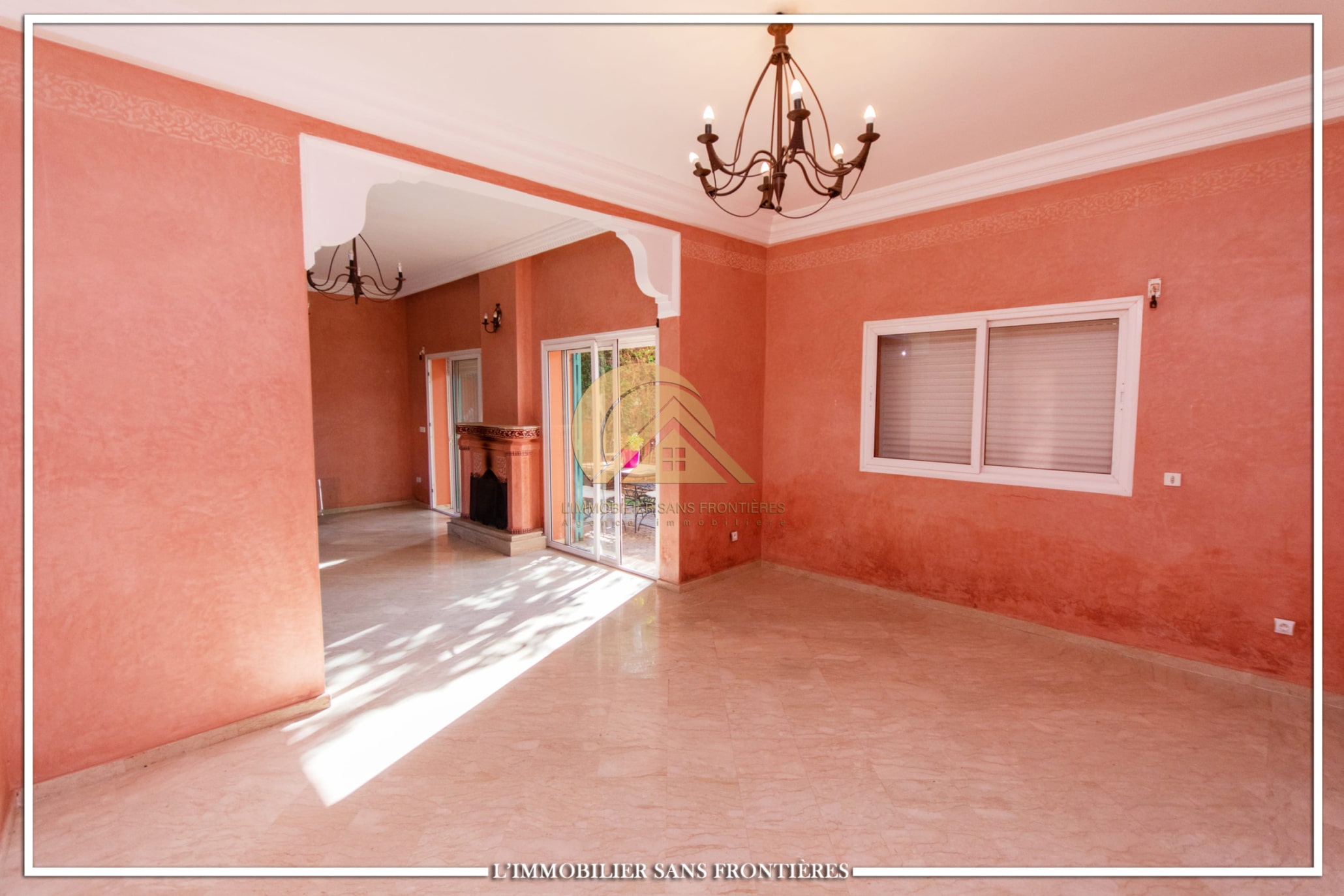 Ground floor: Moroccan living room – European living room – terrace – sitting area – fitted kitchen – fireplace / First floor: 3 bedrooms with wardrobes and balcony – external bathroom – master suite with dressing – bathroom and balcony