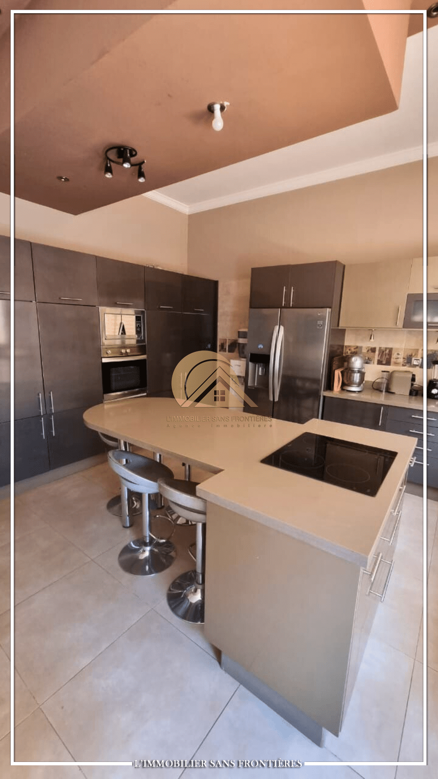 Real Estate Without Borders offers this fully furnished villa for rent in Targa, Marrakech. A private pool and equipment such as solar panels and an electric garage. The stated area is 260 m², with a layout across ground floor, first floor and an upper terrace.